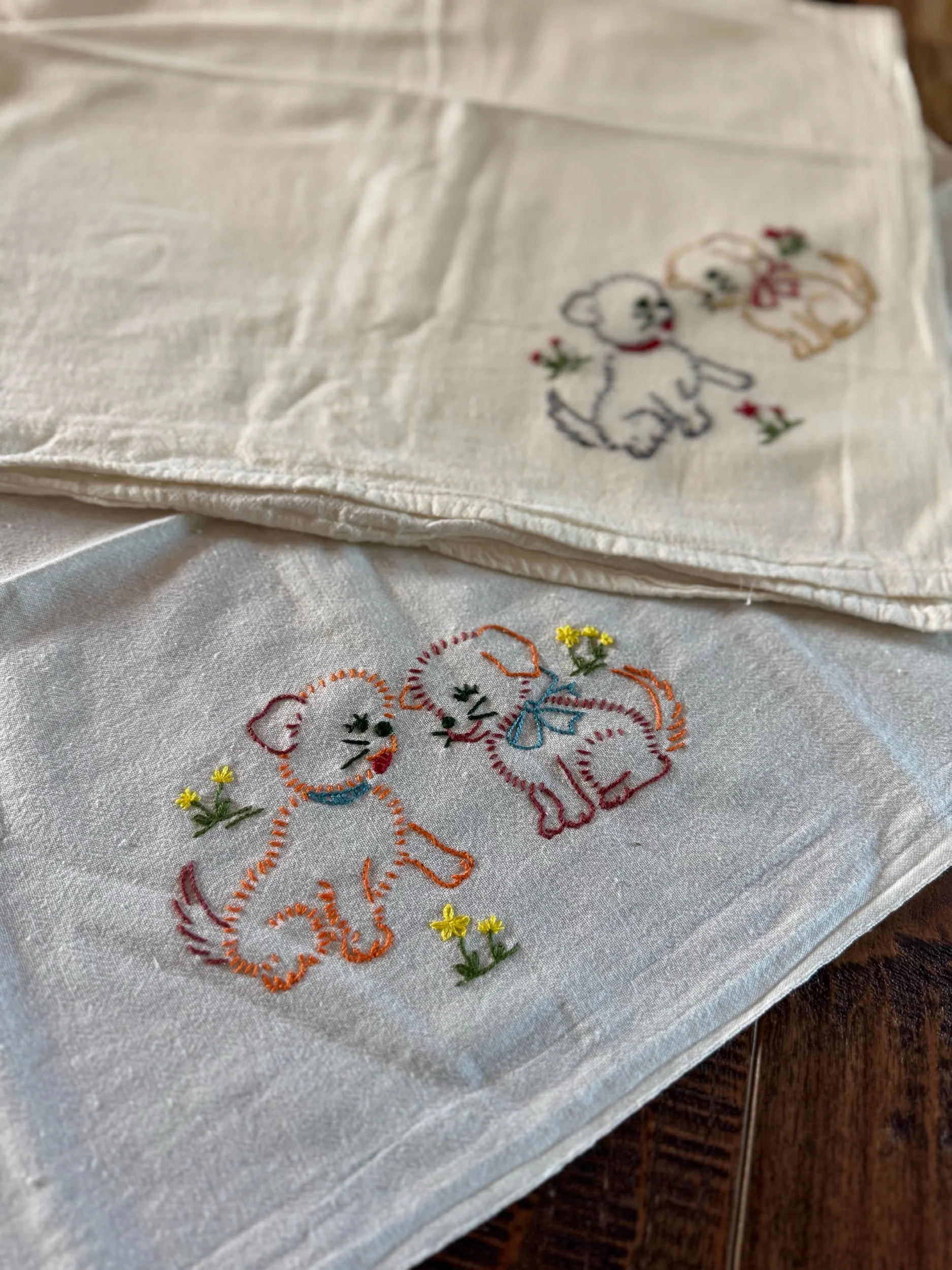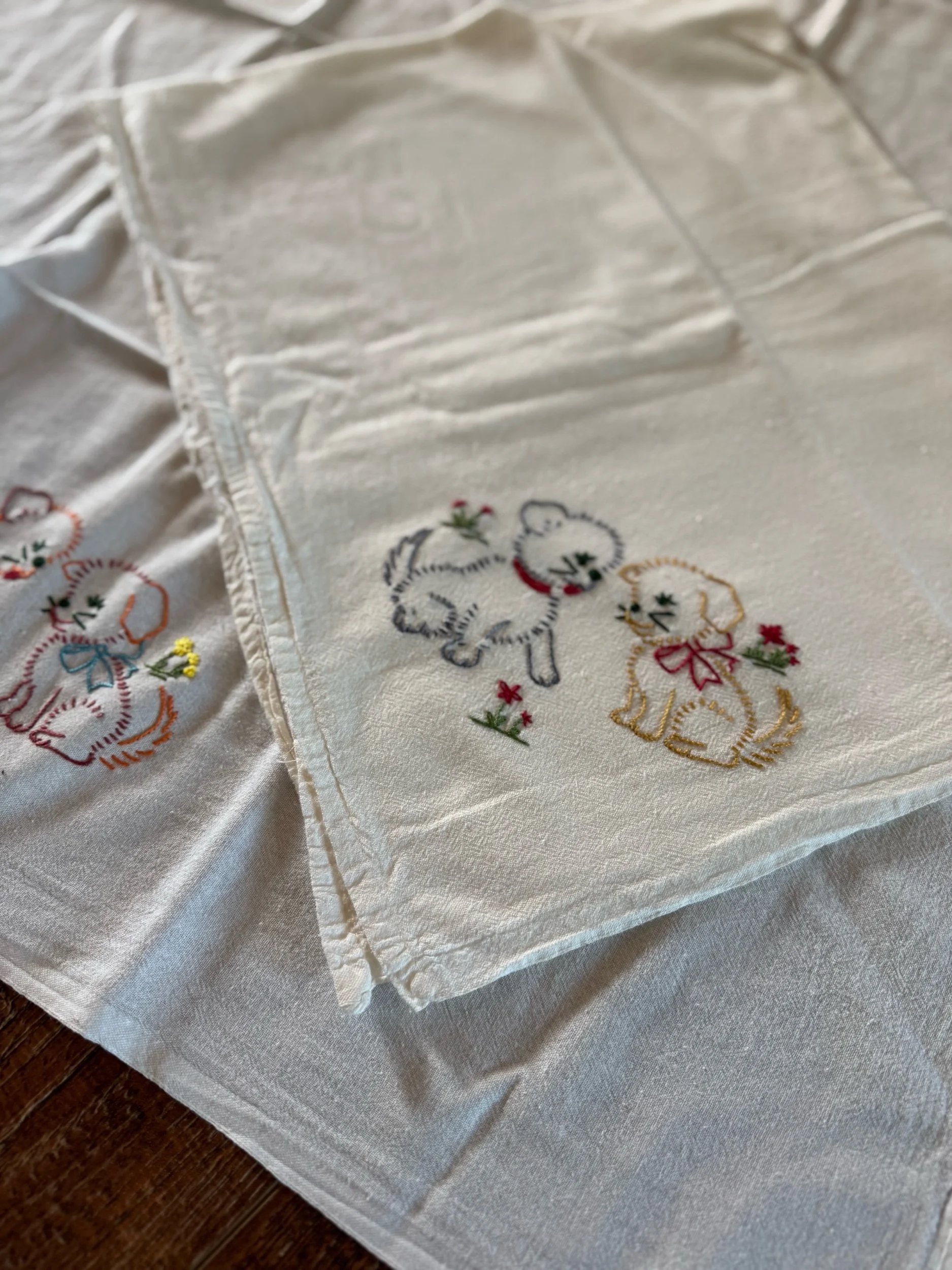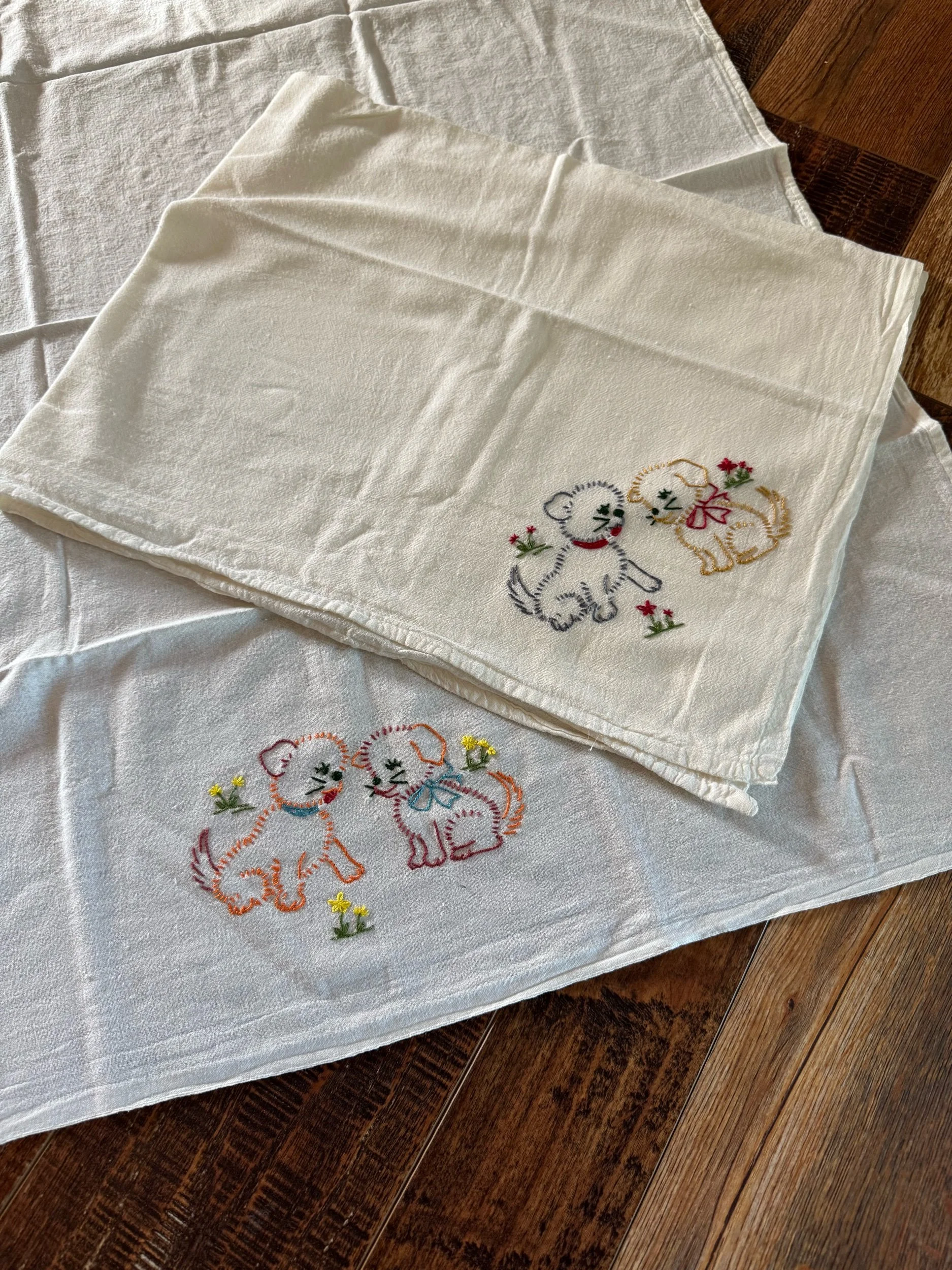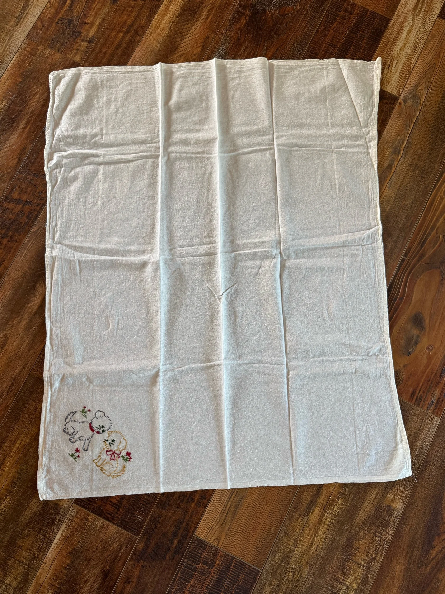 He is so cute, and a great size! He is 16” while sitting, 13” wide including arms. When you lay the bunny flat, it is 26” long. There is a feed sack muslin ribbon that finises off the design, tied in a bow around the bunny’s neck. I found no flaws on the bunny. He is in excellent shape, and is homemade out of a “The hubbards” brand feed sack.