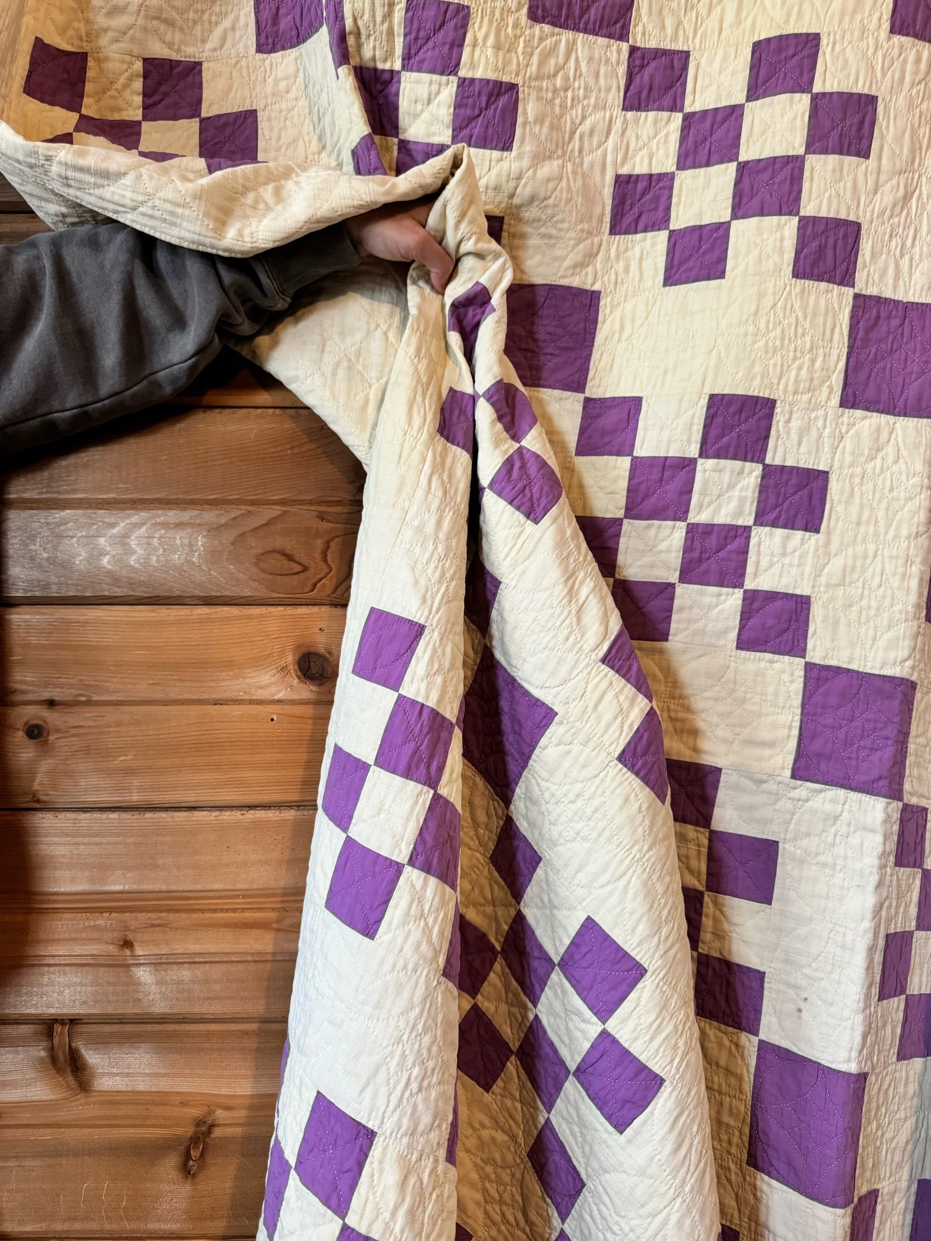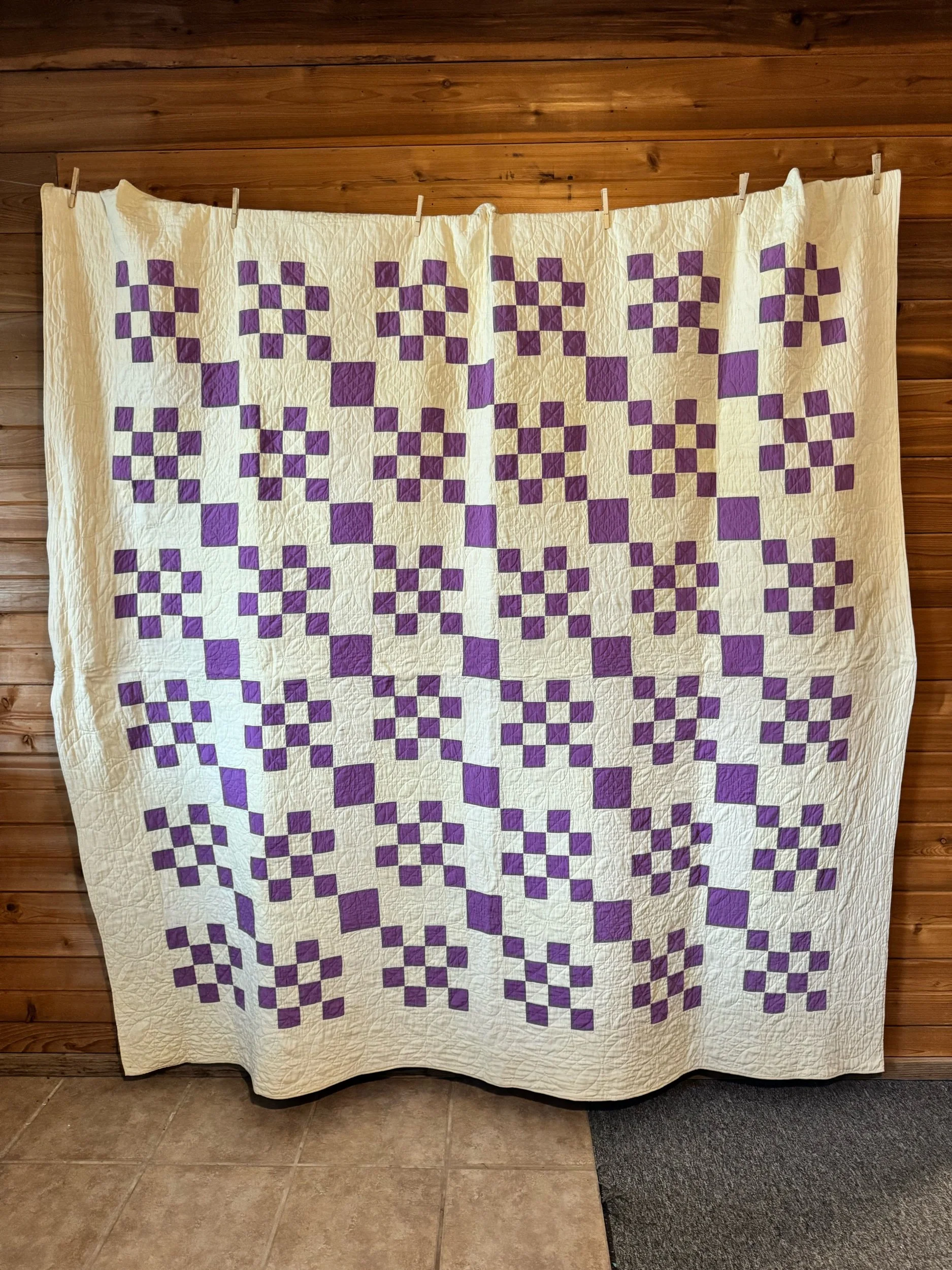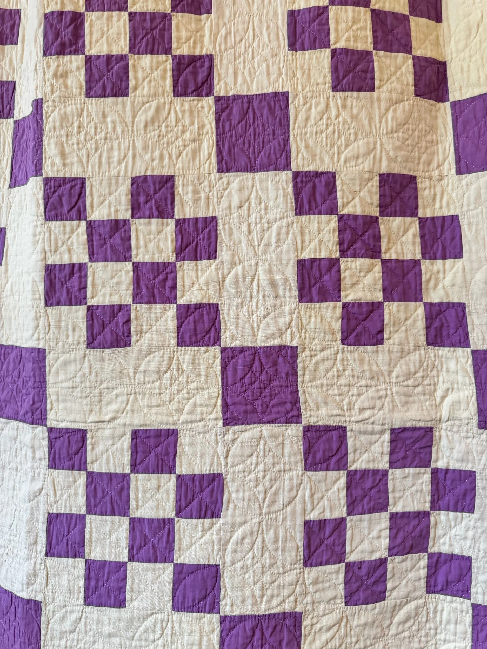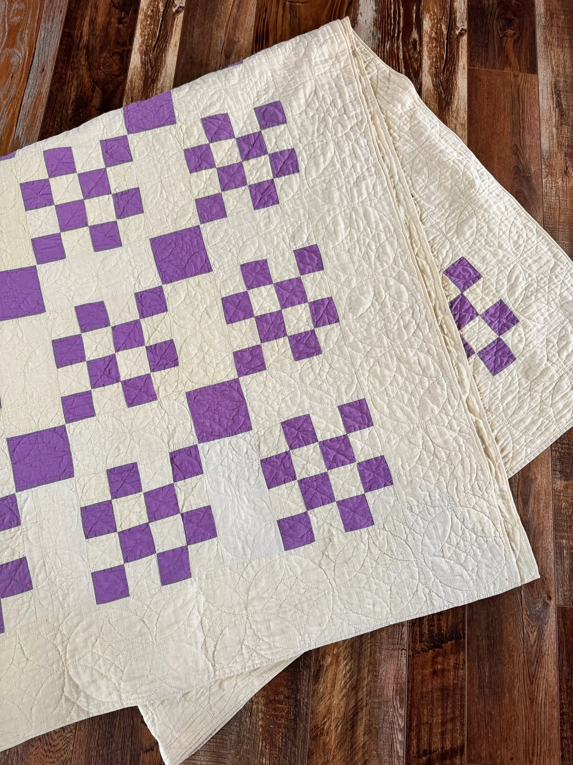 Details: This is what we would call a medium weight quilt. This is all cotton in a variety of cotton prints, mainly in blue and green shades. There is a solid deep-aqua throughout the 9 patch blocks, that keeps the design together. The top and bottom edge have printed borders. The binding is solid green for the most part, with one area that is tan and navy blue. The binding changes in the color with the back fabric there is nearest, the back is a patchwork of its own. The green side is applied seperaretly. The squares in the 9 patch blocks are 2” and the blocks overall are 6”. There are no holes, seam pops, or tears. We are a few very faint stains, photographed for reference. This quilt has been carefully washed and air dried. Please view all pictures before buying.