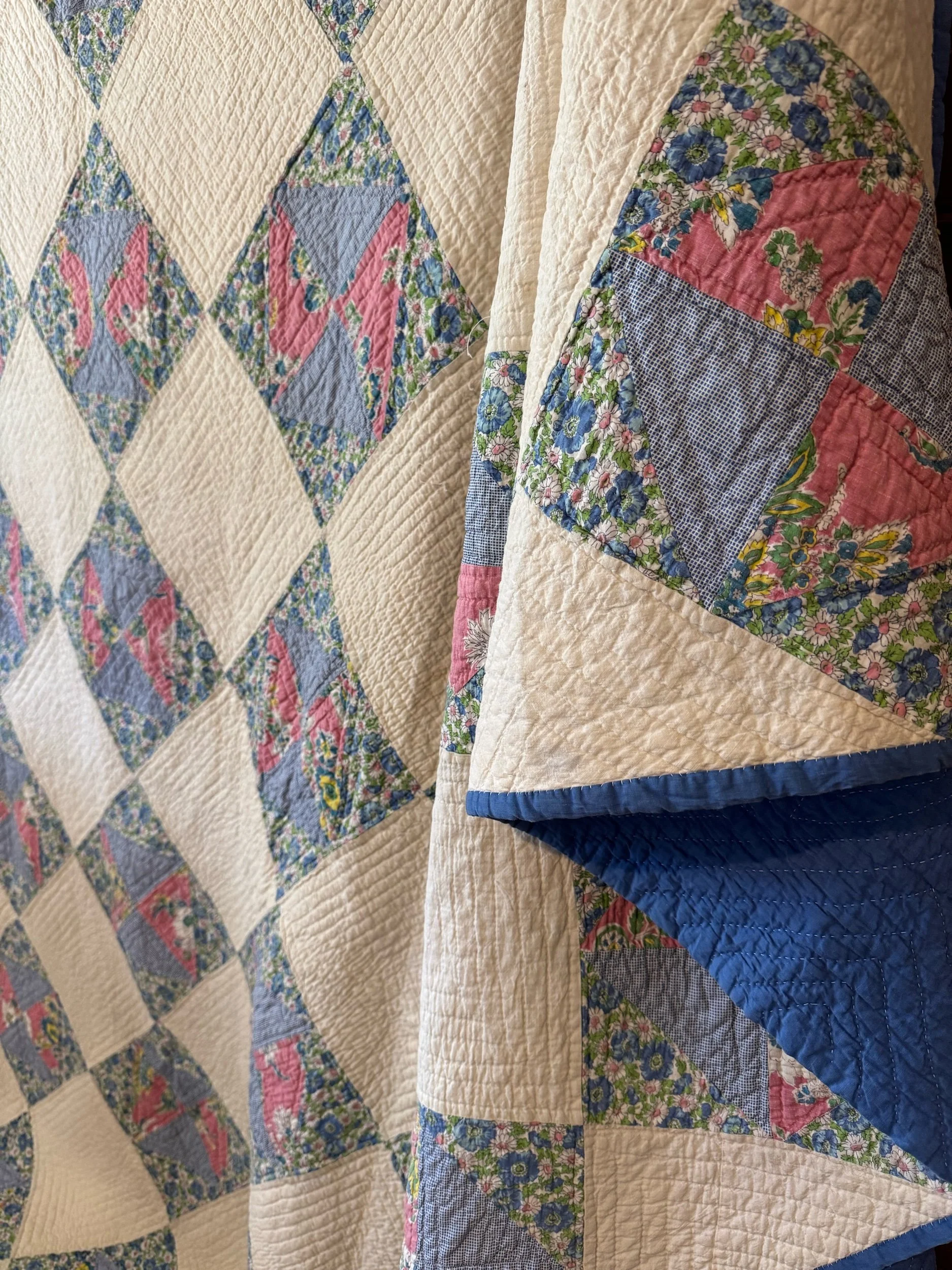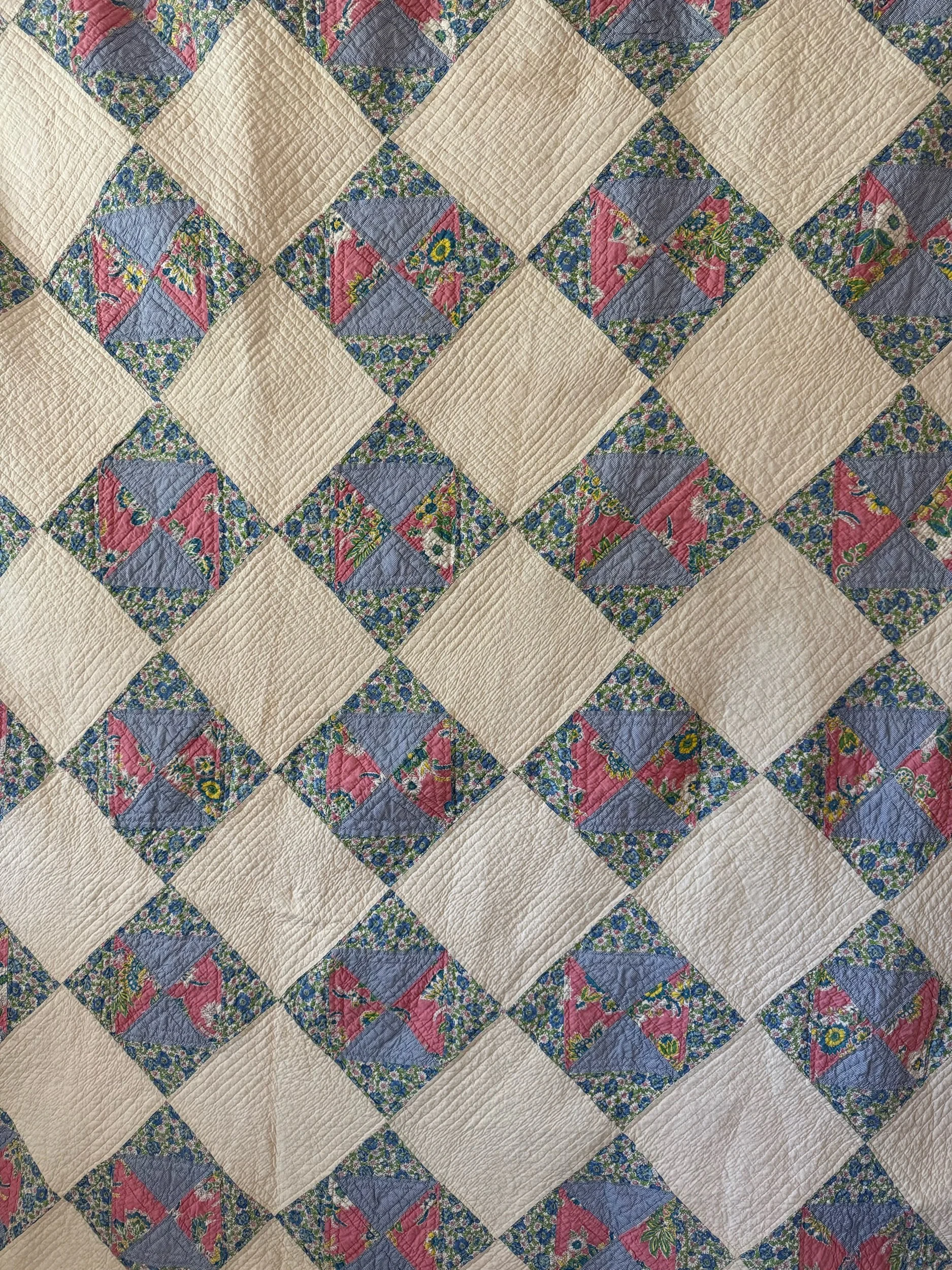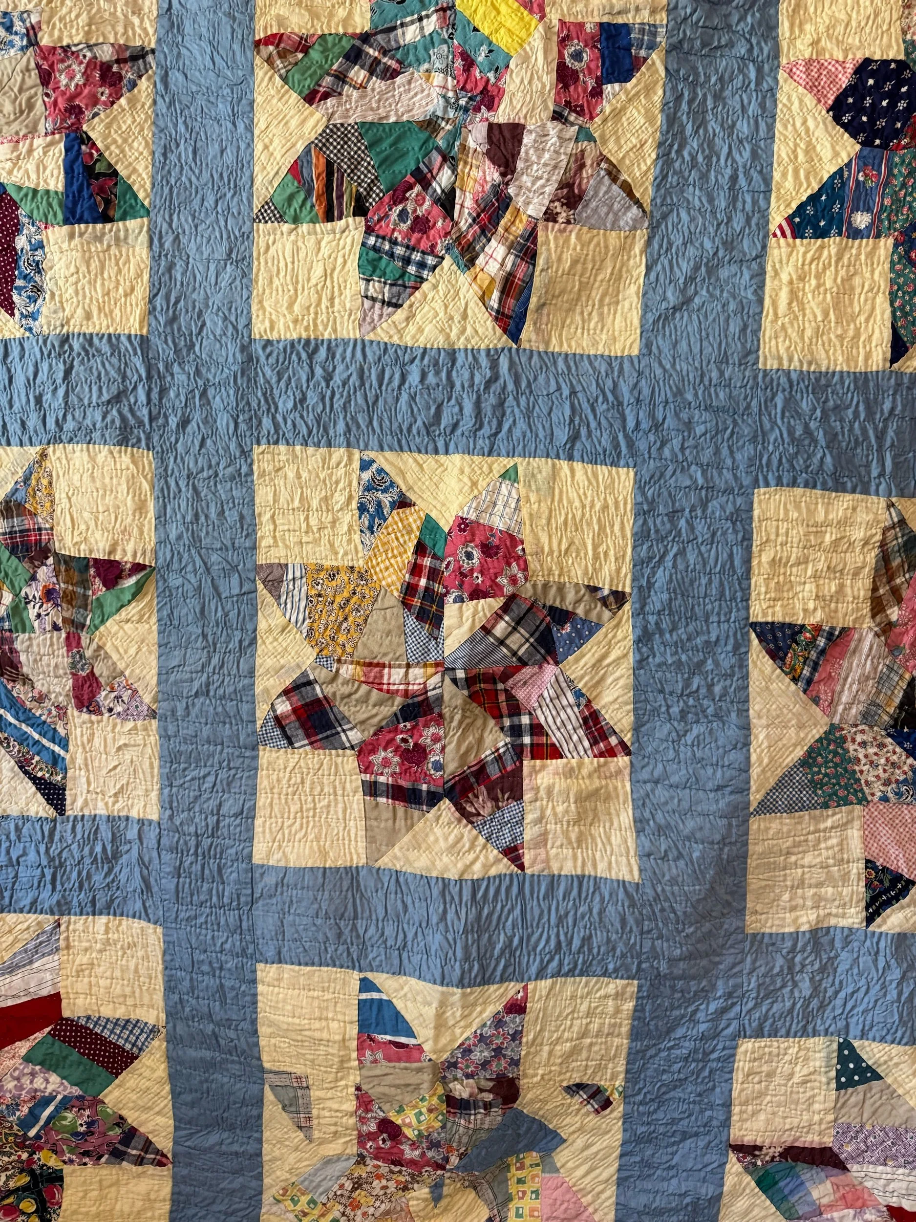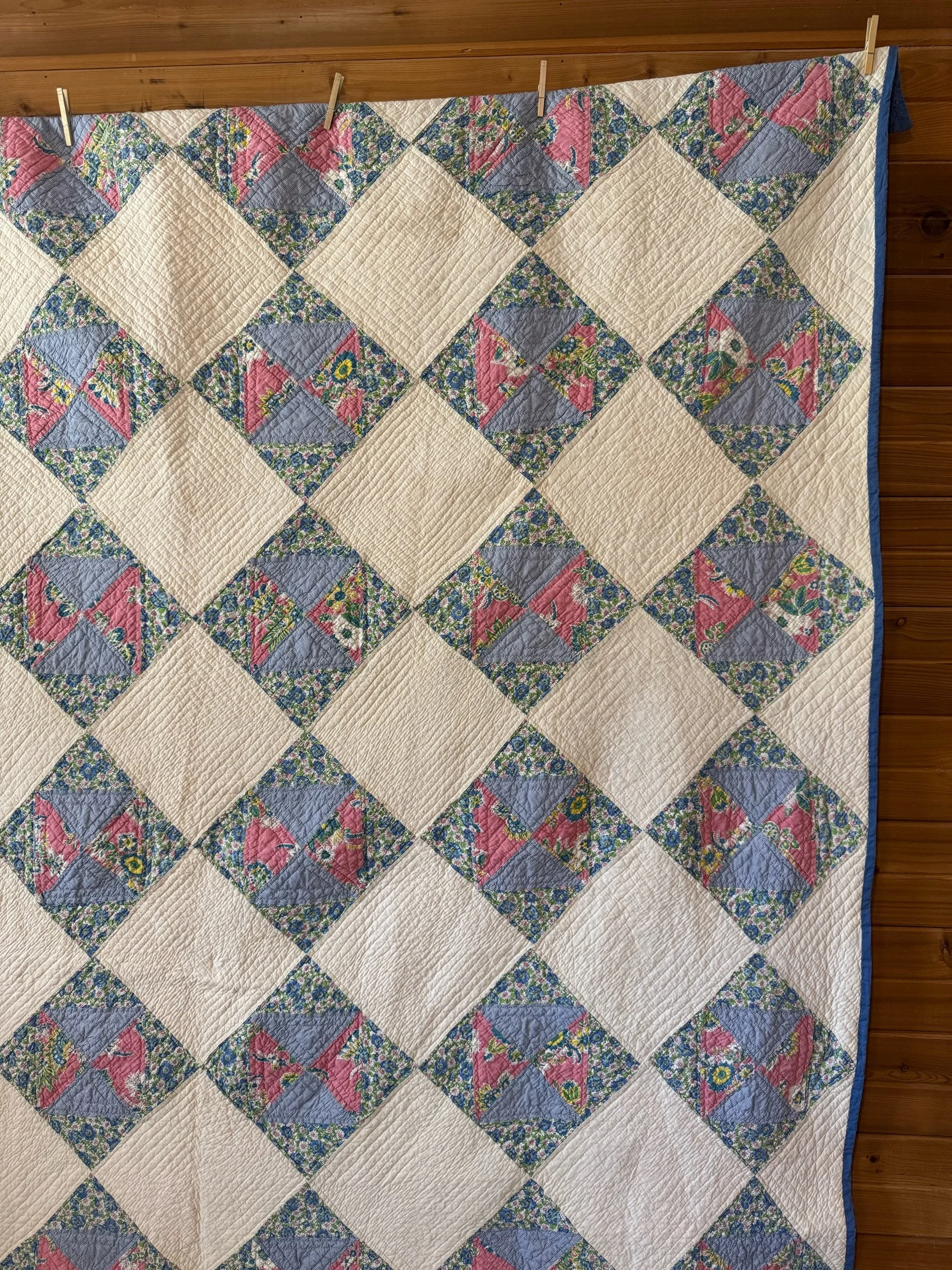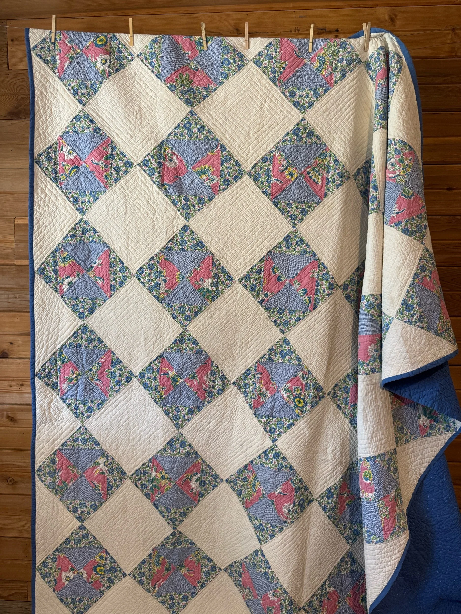 Details: This is what we would call a light weight quilt. There is no batting inside the quilt. All of the blocks are set on point. The blocks measure approximately 13” point to point. The sashing between each block is a light cream color. The binding is solid blue, brought around the back to the front; hand applied. The same blue fabric has been used for the backing. The quilt is all cotton. This quilt is confirmed flour sack and feed sack materials. We found no holes, tears or seam pops. The only thing we found that could be considered a flaw, but not really, is original speckling and spotting from the flour sacks. This quilt has been carefully washed and air dried. Please view all pictures before buying.