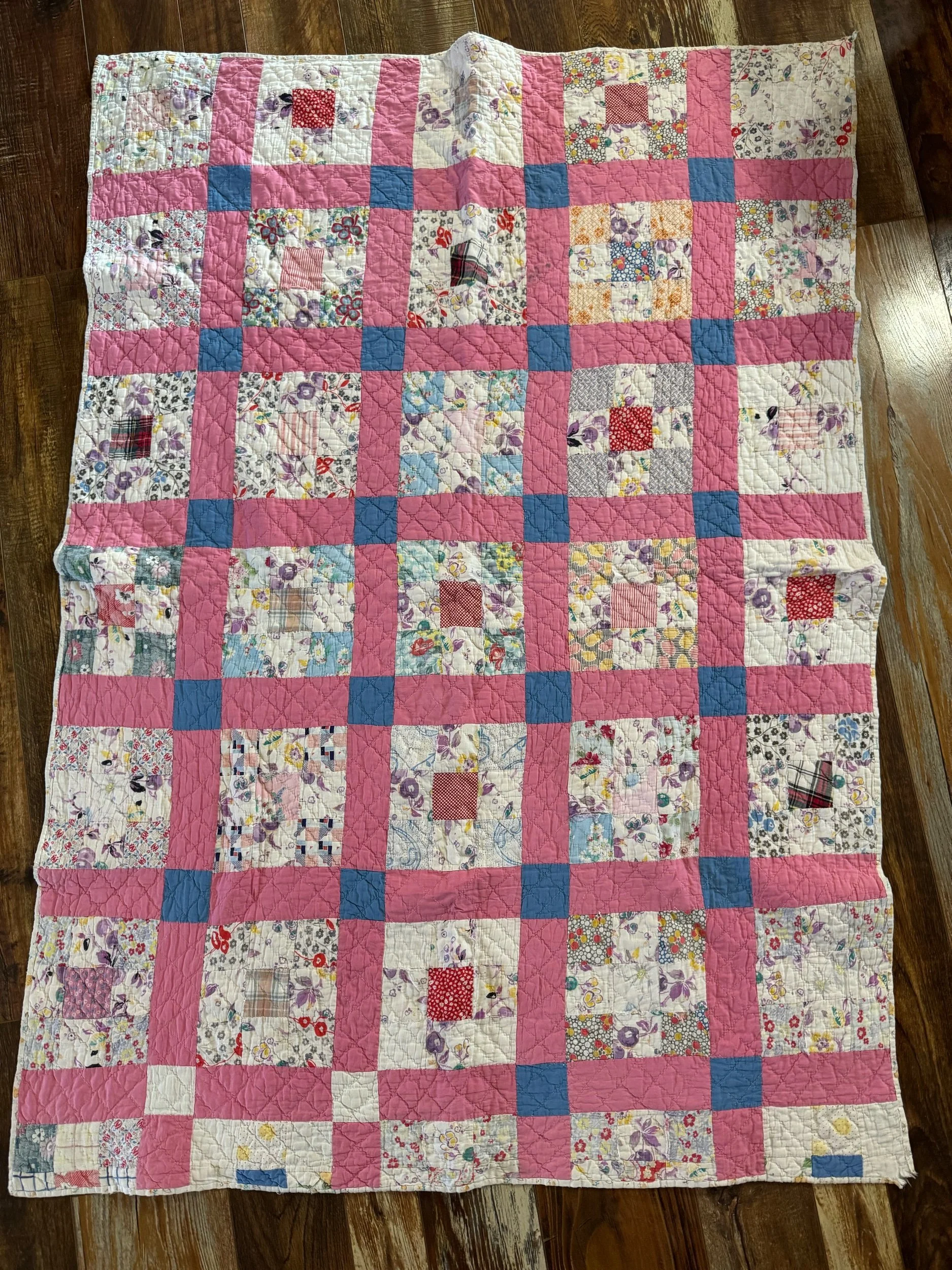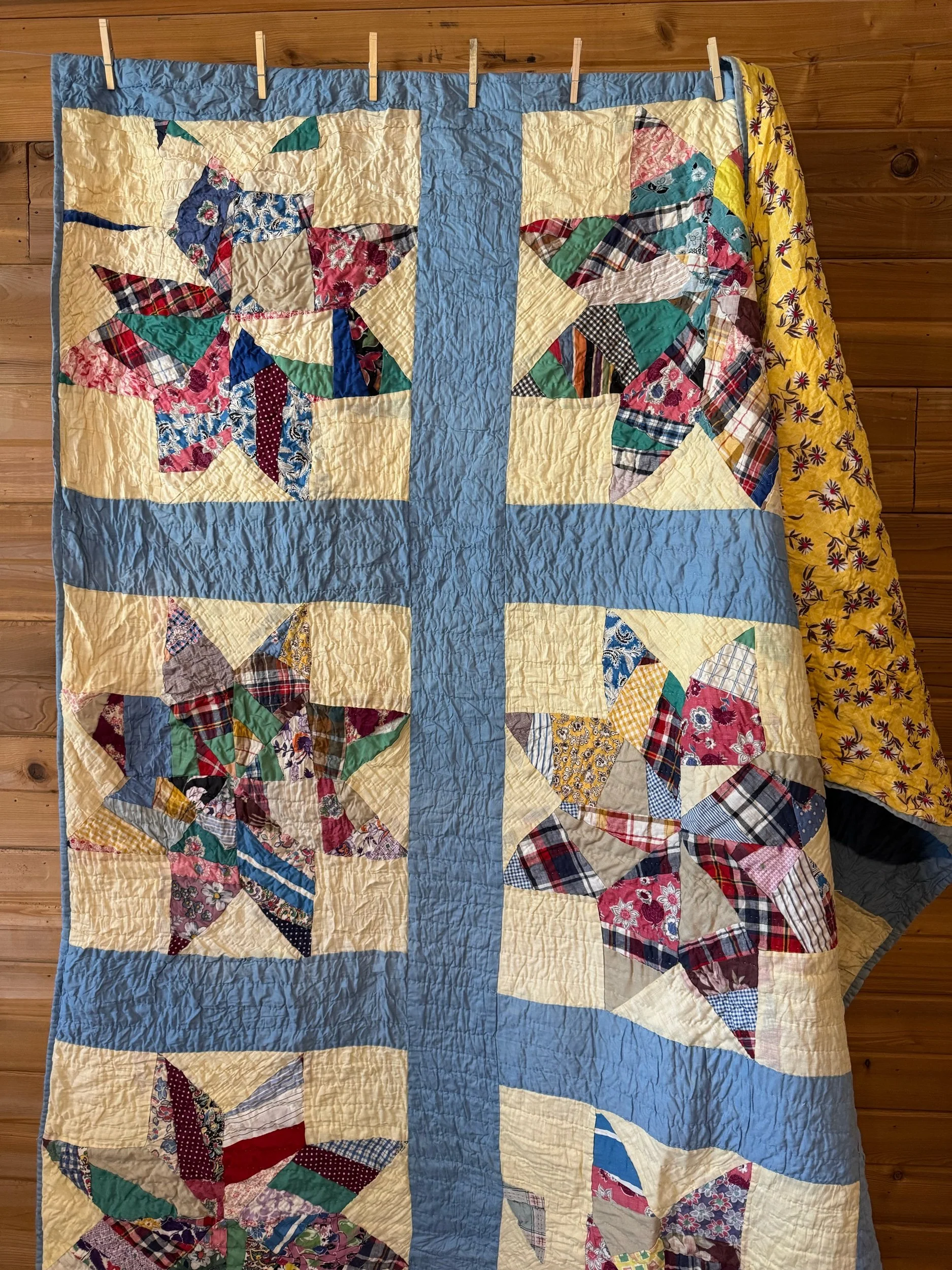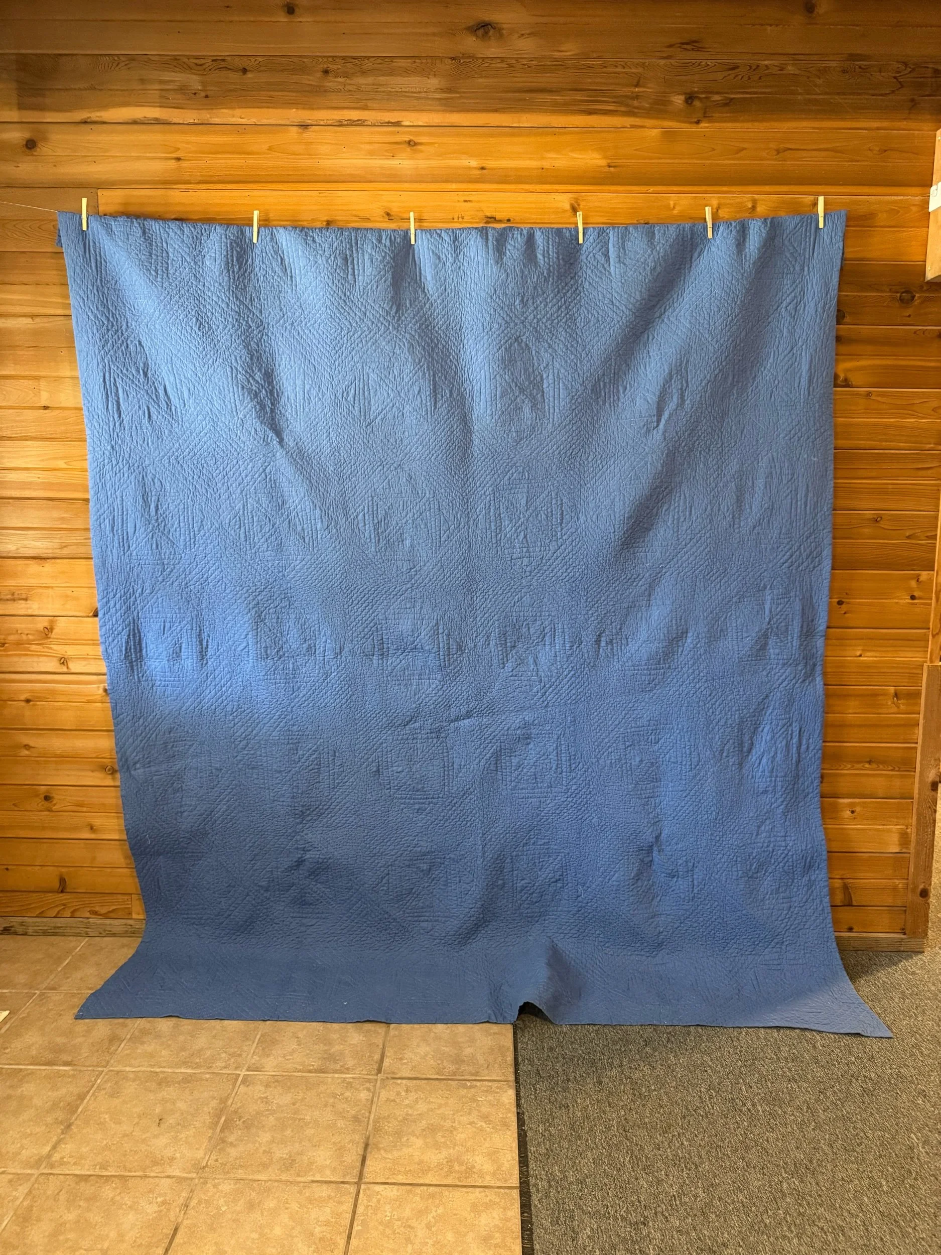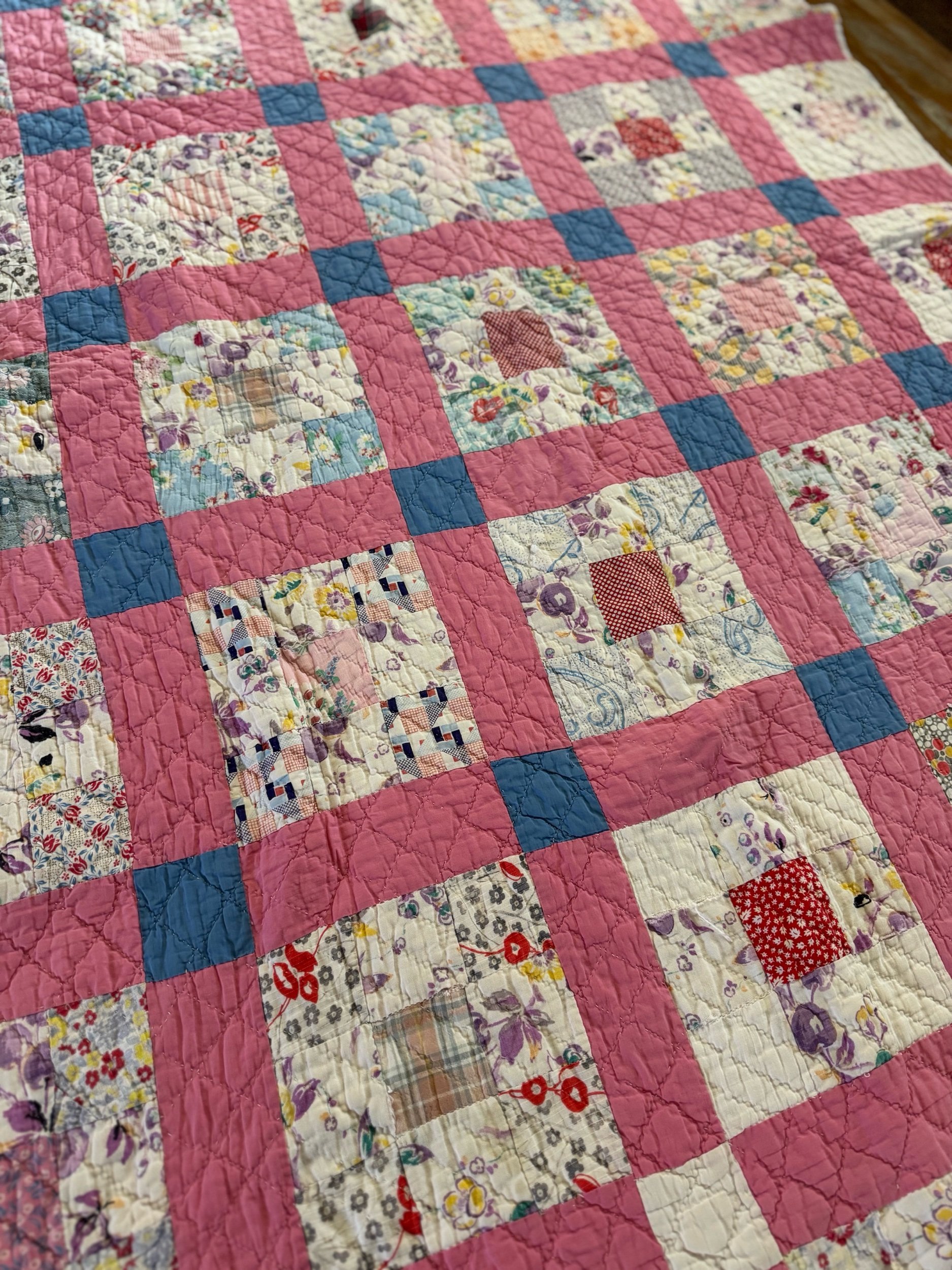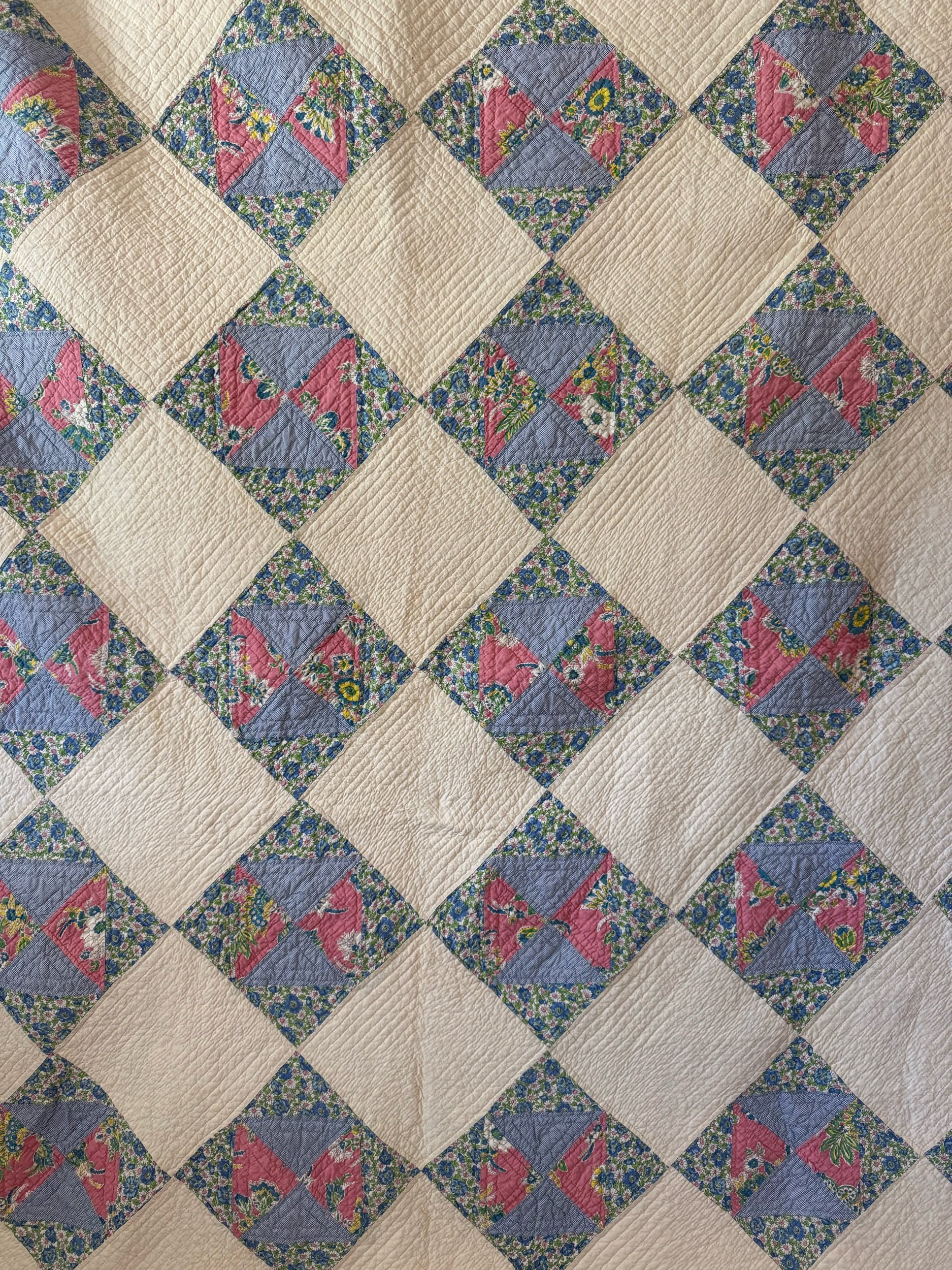 Details: This is what we would call a light weight quilt. There is no batting inside the quilt. All of the blocks are set on point. The blocks measure approximately 13” point to point. The sashing between each block is a light cream color. The binding is solid blue, brought around the back to the front; hand applied. The same blue fabric has been used for the backing. The quilt is all cotton. This quilt is confirmed flour sack and feed sack materials. We found no holes, tears or seam pops. The only thing we found that could be considered a flaw, but not really, is original speckling and spotting from the flour sacks. This quilt has been carefully washed and air dried. Please view all pictures before buying.