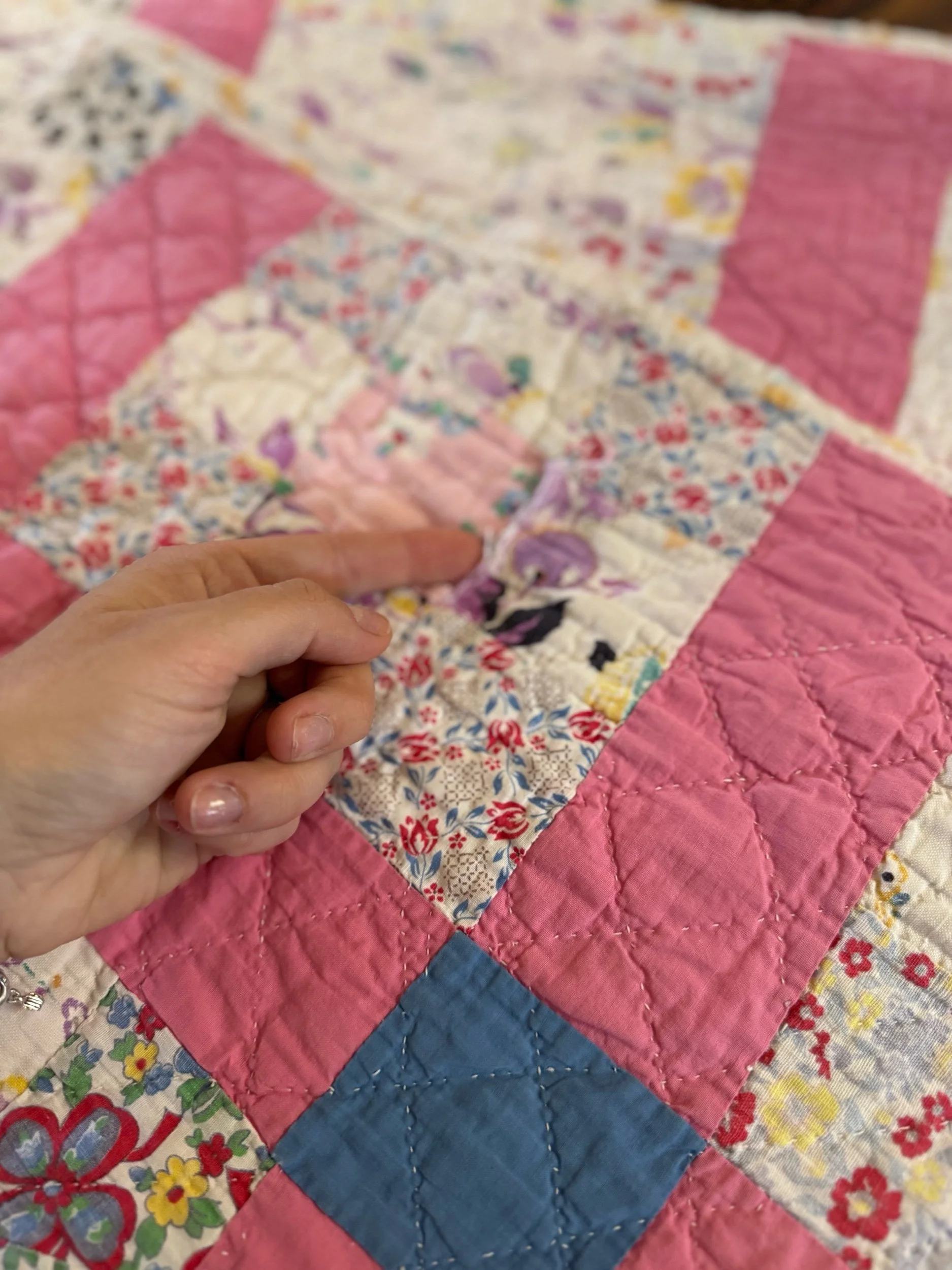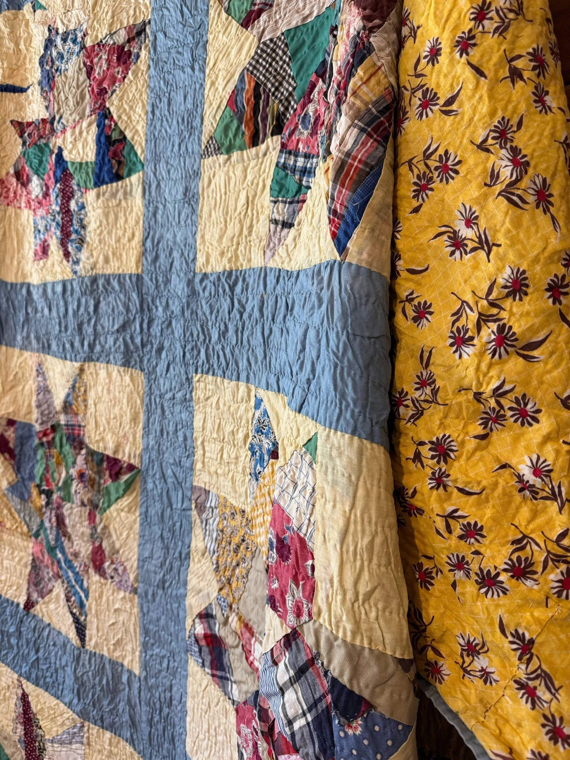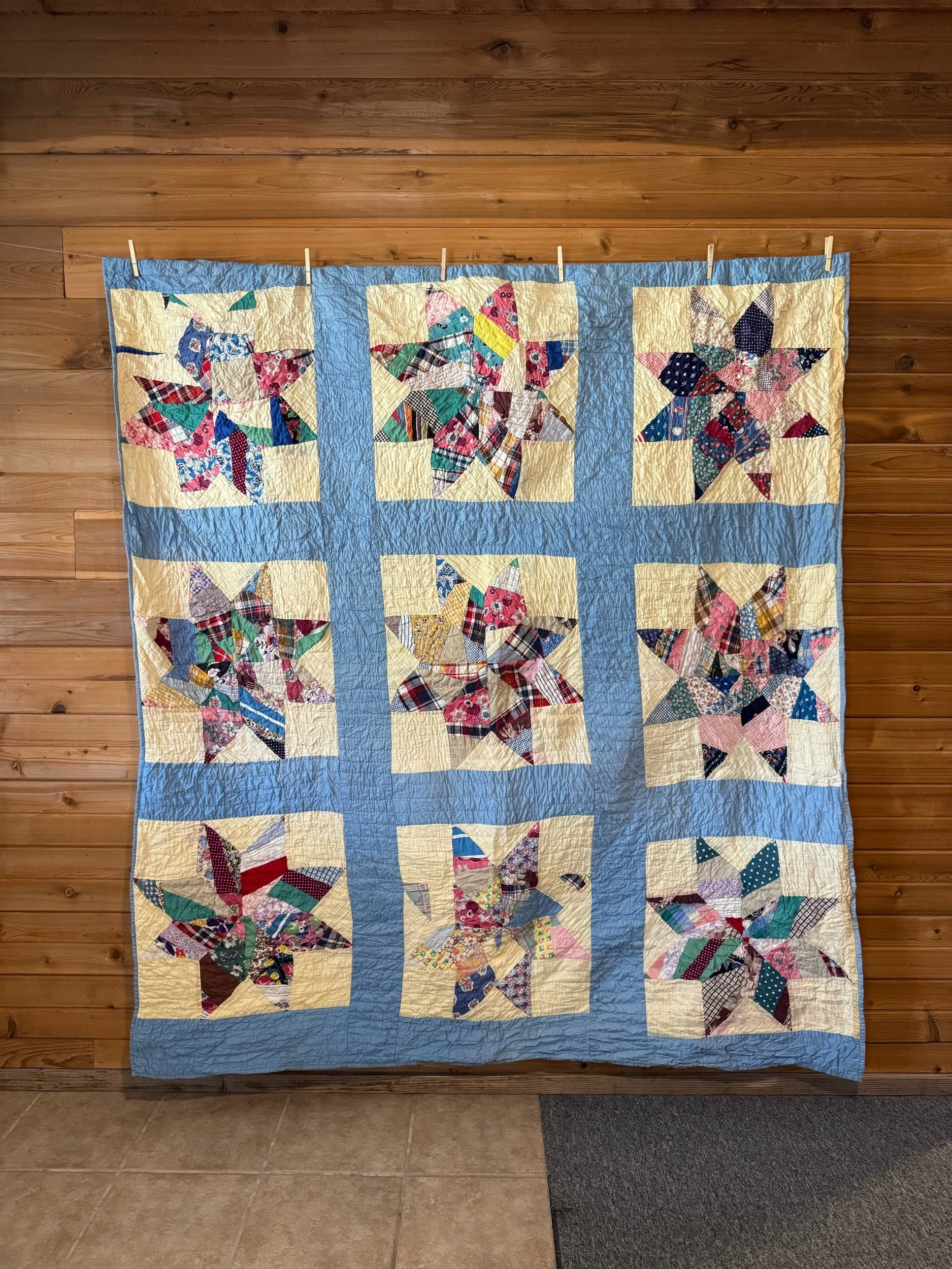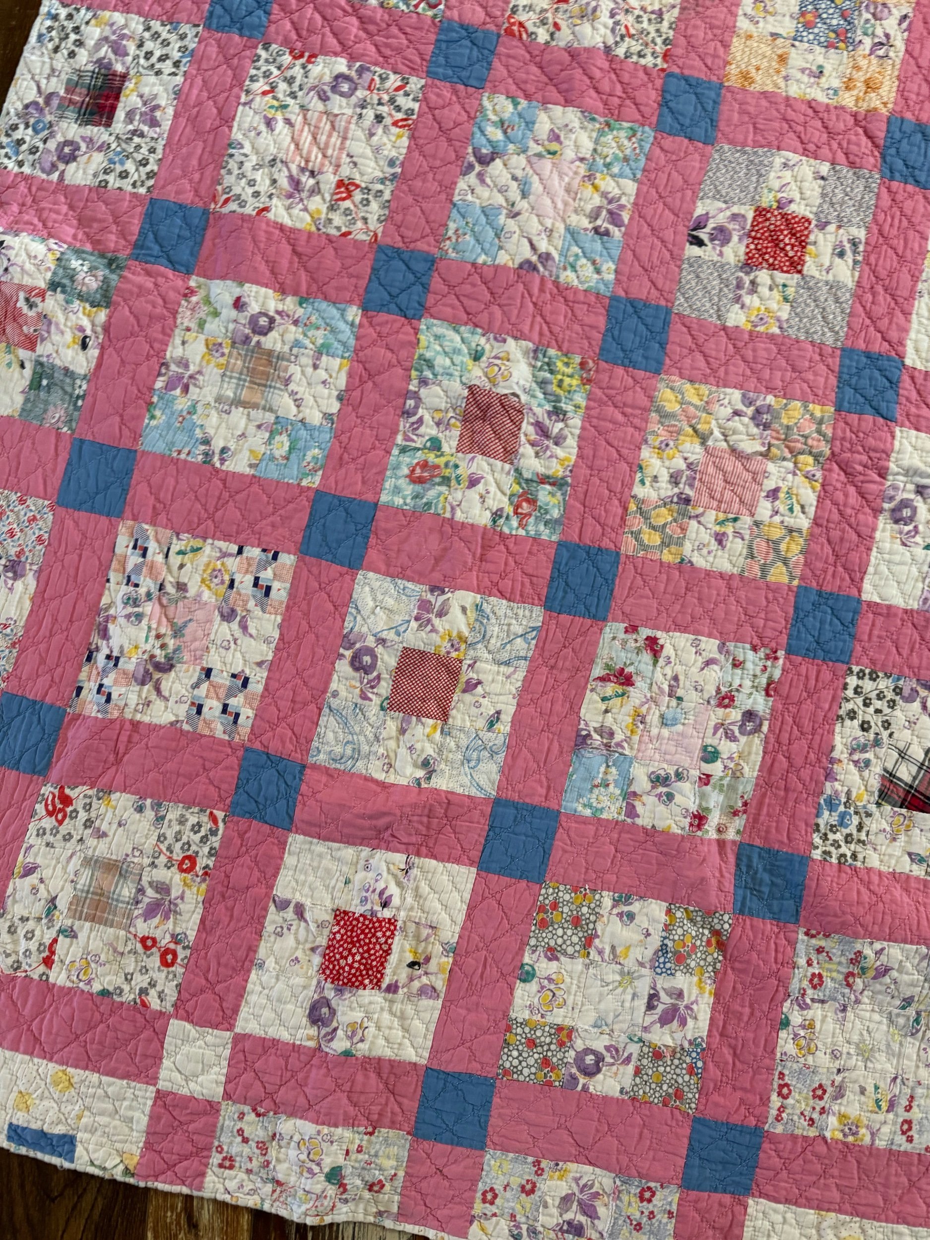Details: This is what we would call a light weight quilt. There is no batting inside the quilt. All of the blocks are set on point. The blocks measure approximately 13” point to point. The sashing between each block is a light cream color. The binding is solid blue, brought around the back to the front; hand applied. The same blue fabric has been used for the backing. The quilt is all cotton. This quilt is confirmed flour sack and feed sack materials. We found no holes, tears or seam pops. The only thing we found that could be considered a flaw, but not really, is original speckling and spotting from the flour sacks. This quilt has been carefully washed and air dried. Please view all pictures before buying.