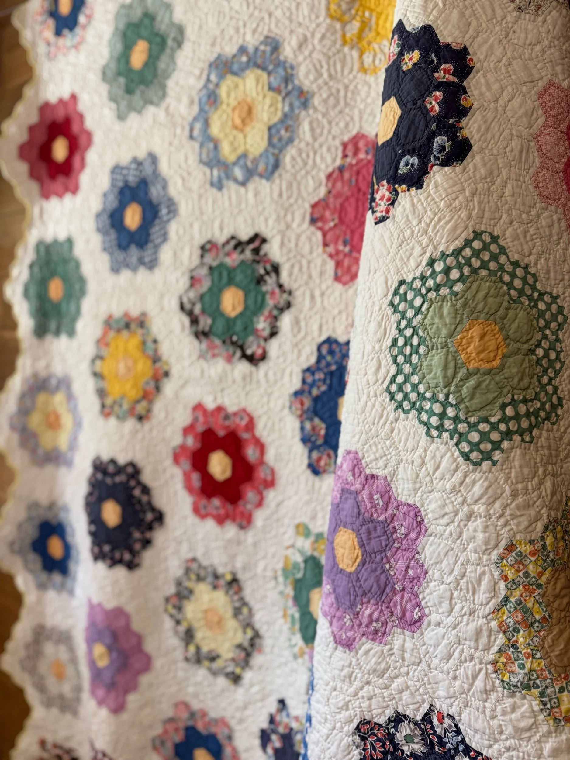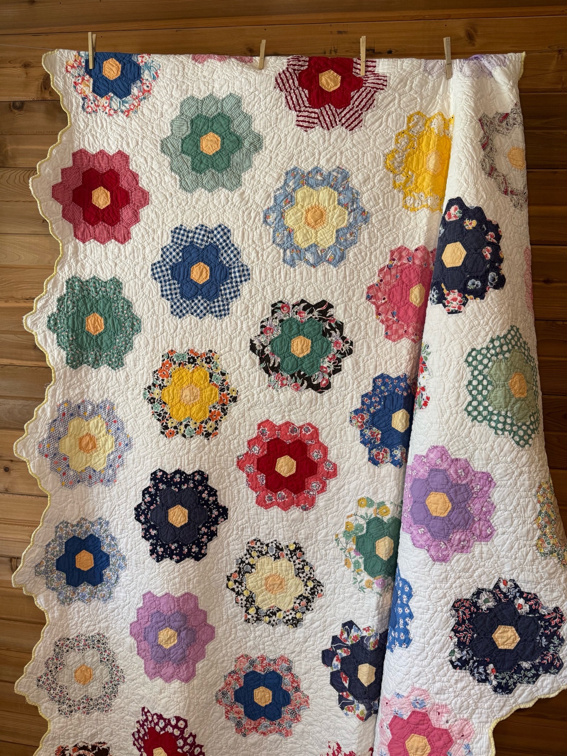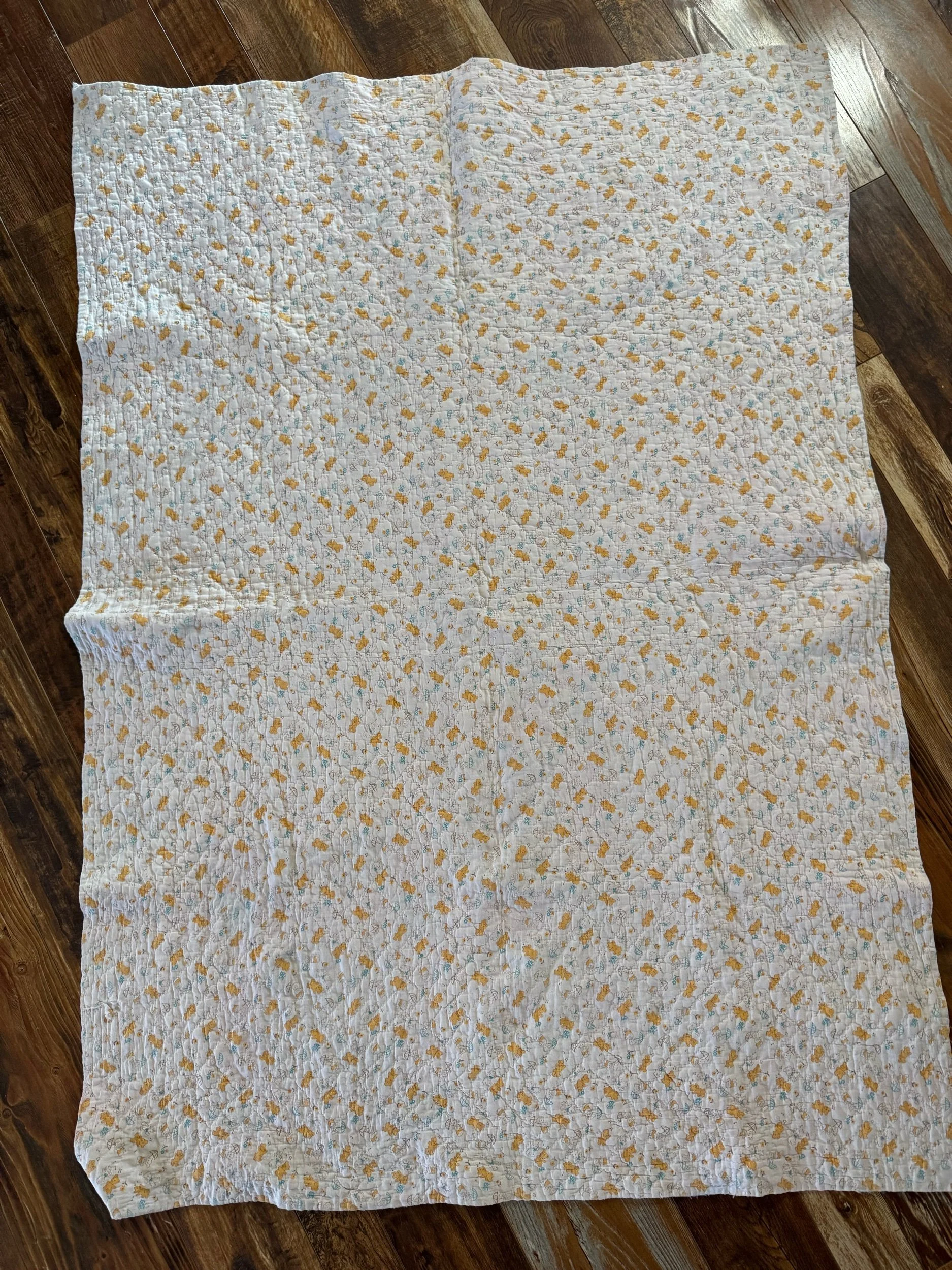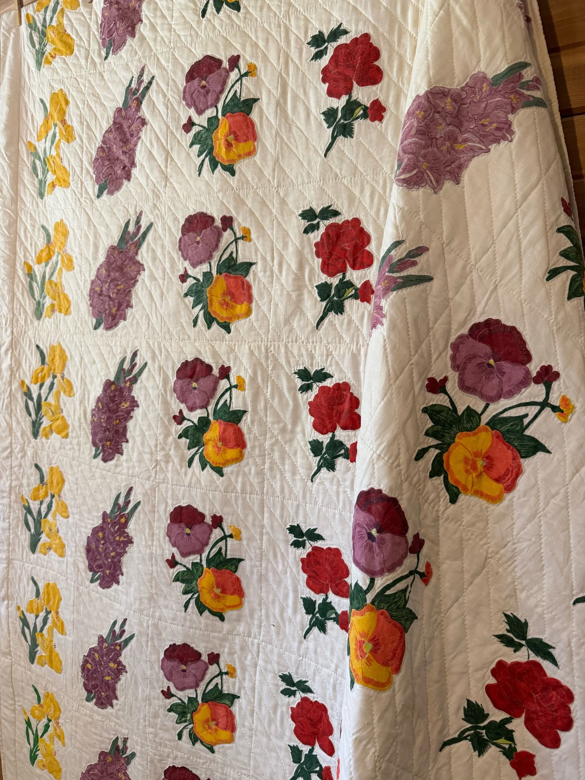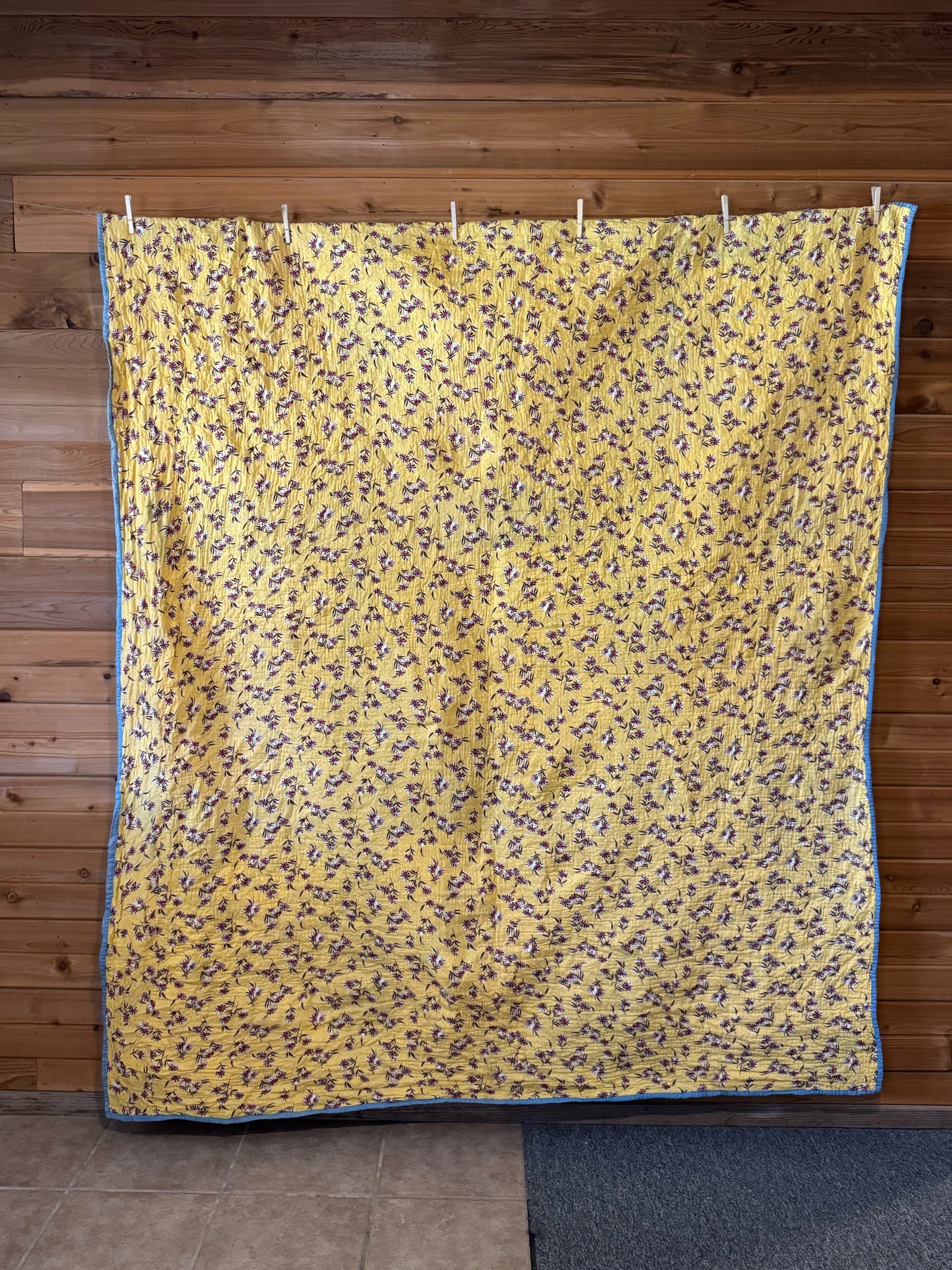 Details: This is what we would call a light weight quilt. There is no batting inside the quilt. All of the blocks are set on point. The blocks measure approximately 13” point to point. The sashing between each block is a light cream color. The binding is solid blue, brought around the back to the front; hand applied. The same blue fabric has been used for the backing. The quilt is all cotton. This quilt is confirmed flour sack and feed sack materials. We found no holes, tears or seam pops. The only thing we found that could be considered a flaw, but not really, is original speckling and spotting from the flour sacks. This quilt has been carefully washed and air dried. Please view all pictures before buying.