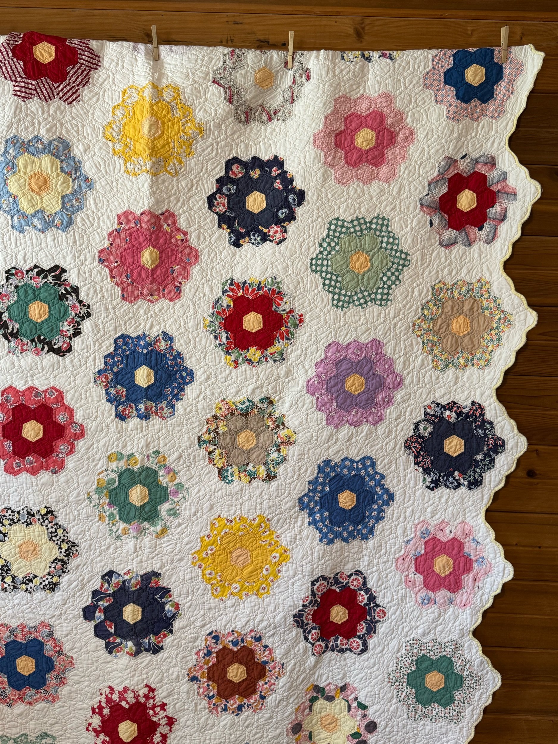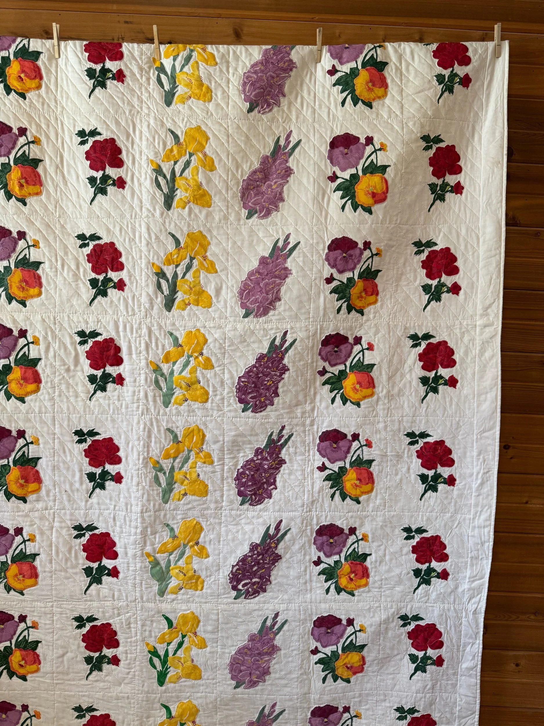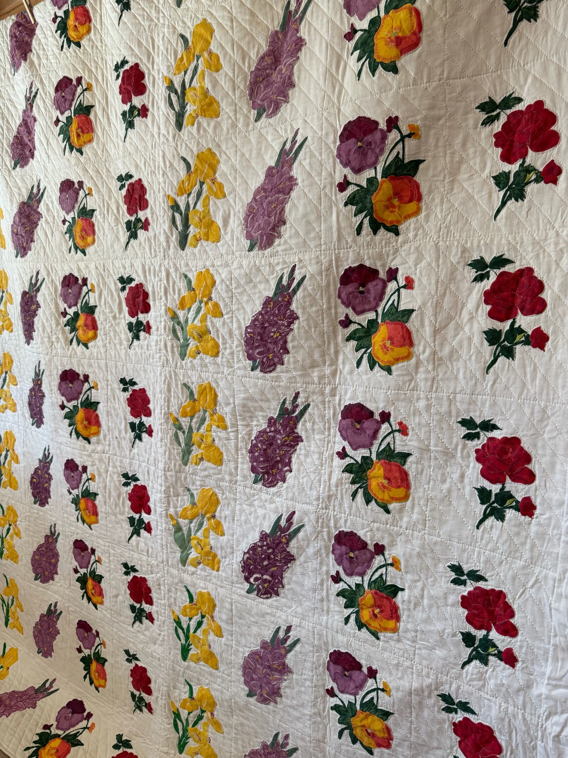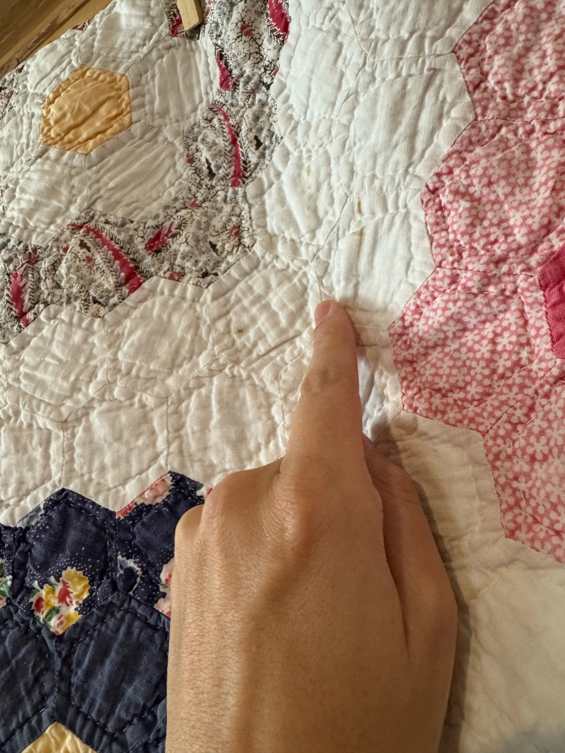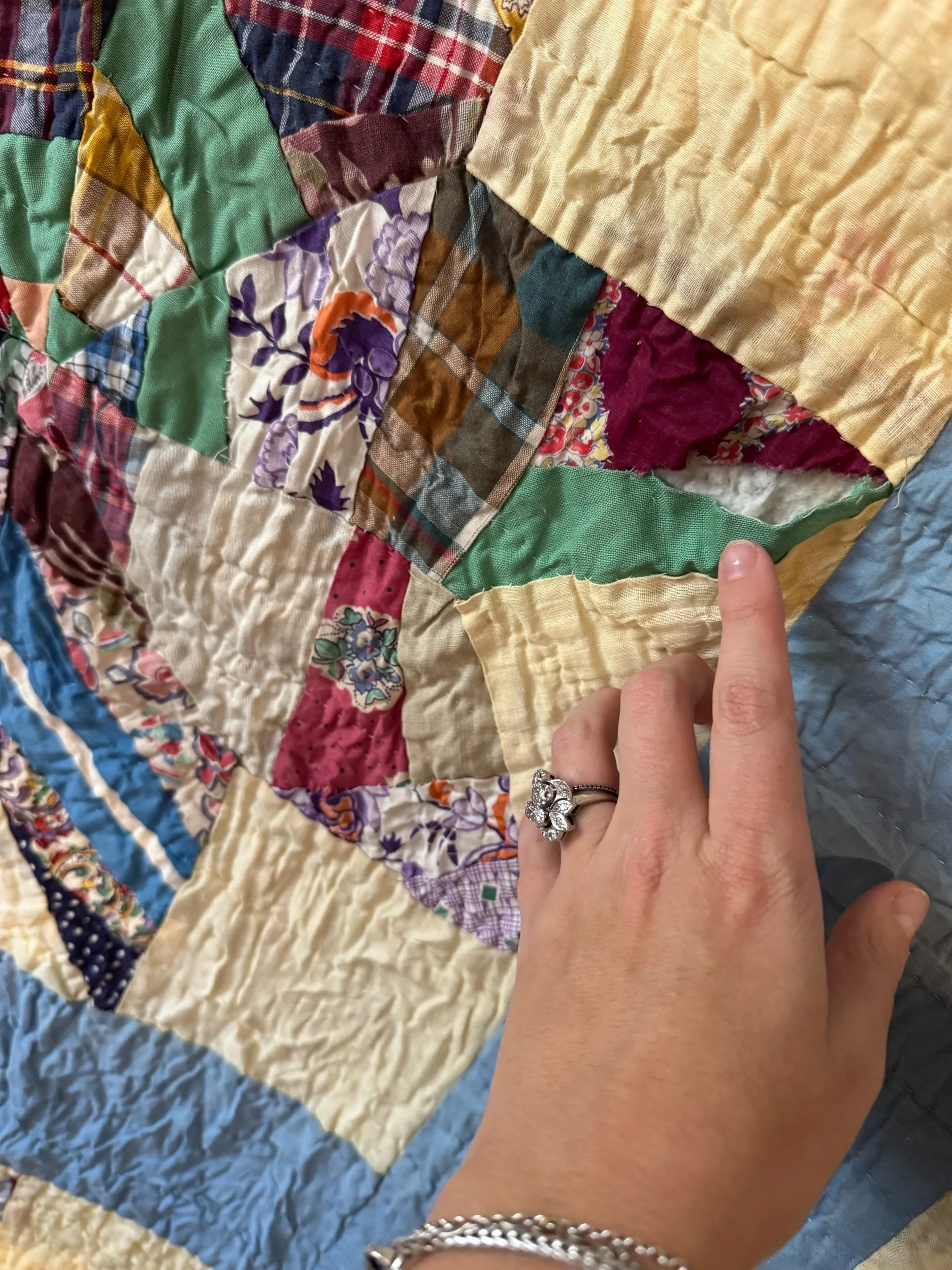 Details: This is what we would call a light weight quilt. There is no batting inside the quilt. All of the blocks are set on point. The blocks measure approximately 13” point to point. The sashing between each block is a light cream color. The binding is solid blue, brought around the back to the front; hand applied. The same blue fabric has been used for the backing. The quilt is all cotton. This quilt is confirmed flour sack and feed sack materials. We found no holes, tears or seam pops. The only thing we found that could be considered a flaw, but not really, is original speckling and spotting from the flour sacks. This quilt has been carefully washed and air dried. Please view all pictures before buying.