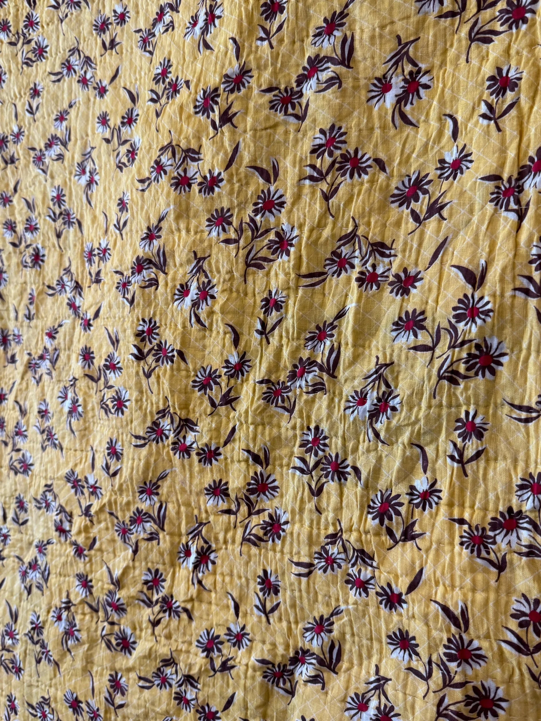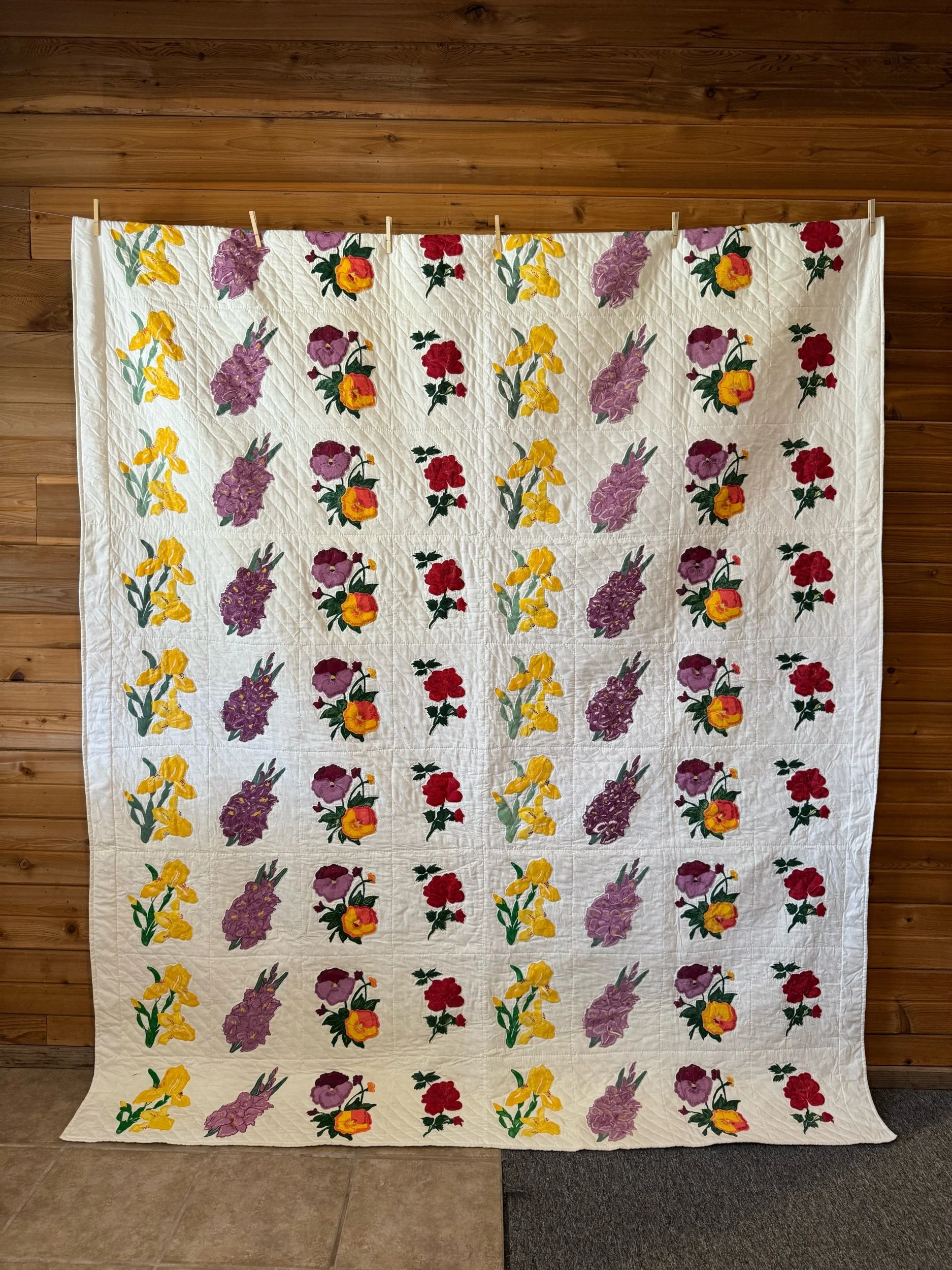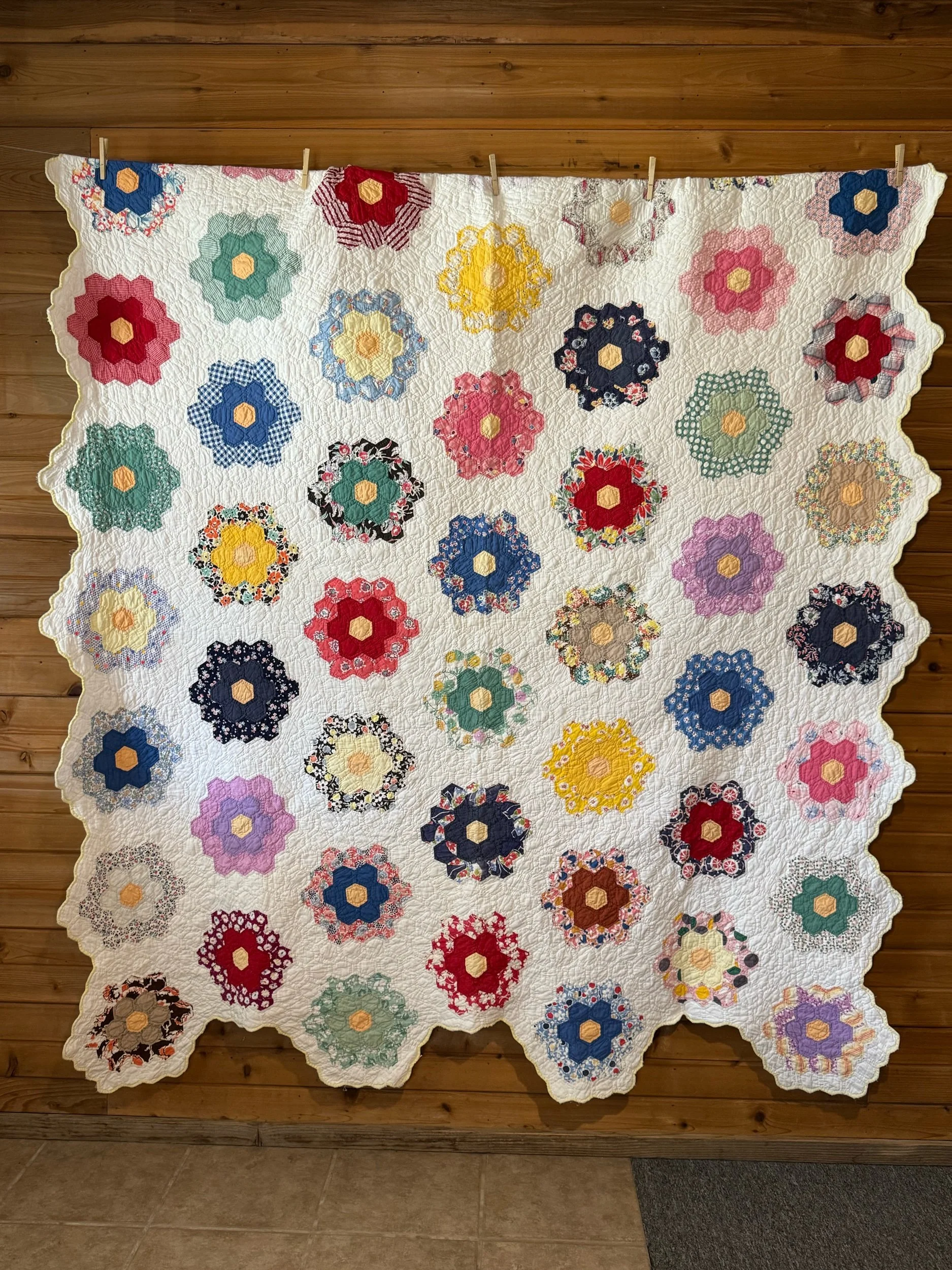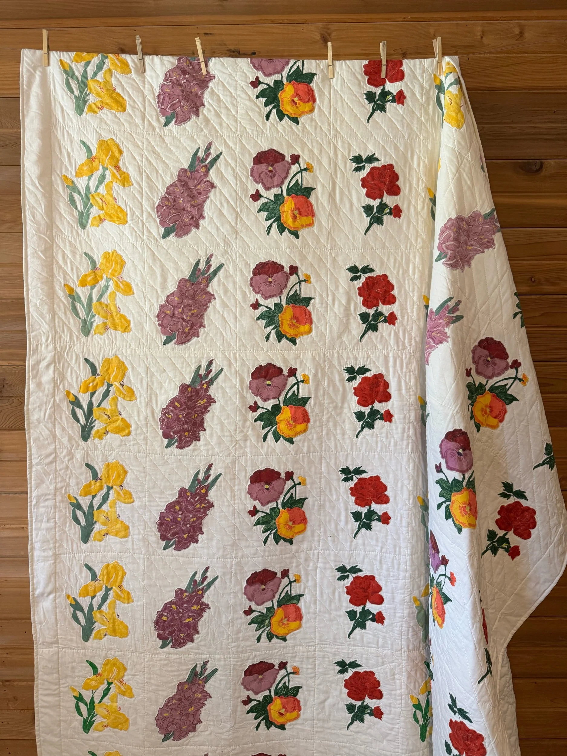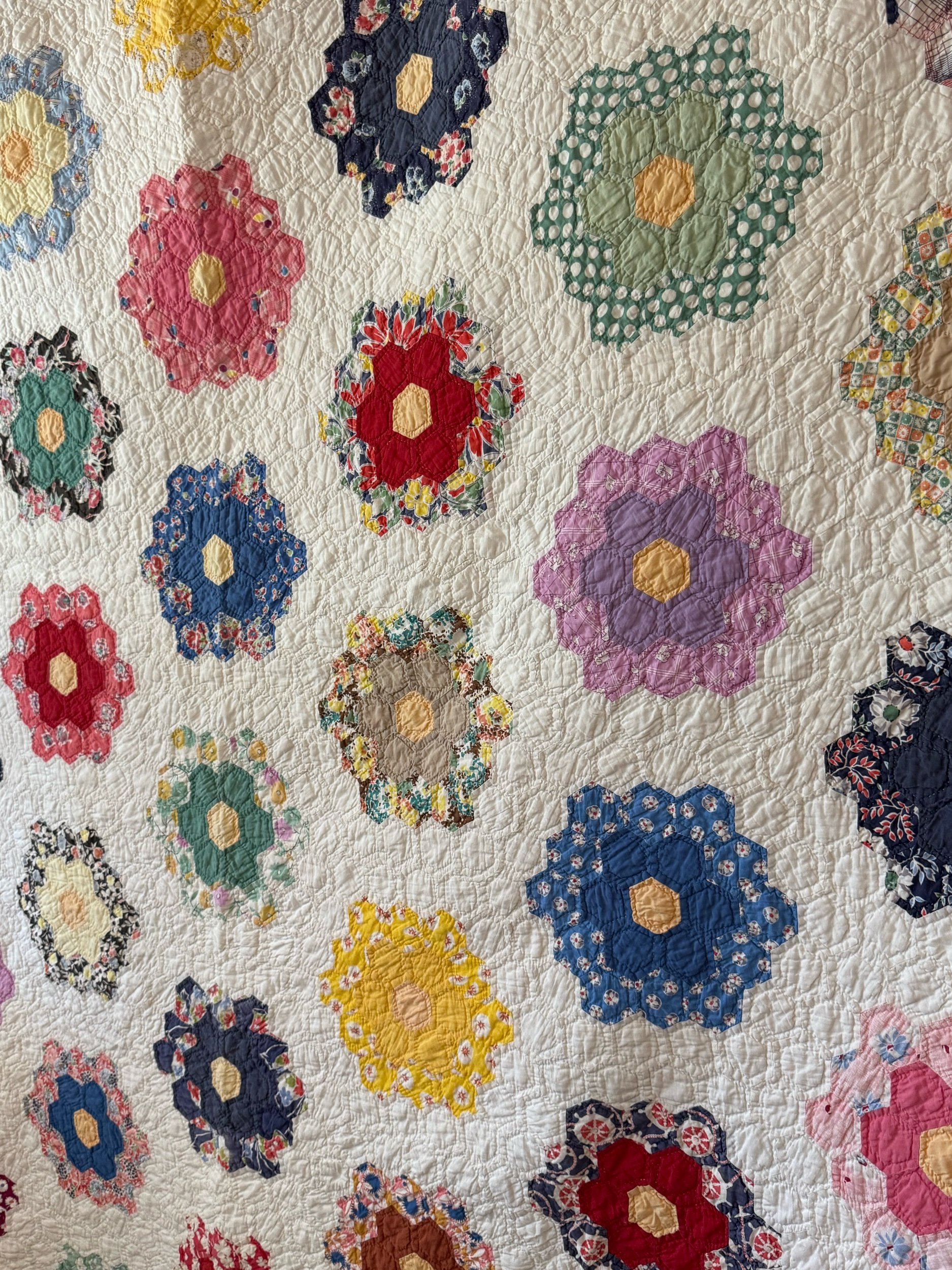 Details: This is what we would call a light weight quilt. There is no batting inside the quilt. All of the blocks are set on point. The blocks measure approximately 13” point to point. The sashing between each block is a light cream color. The binding is solid blue, brought around the back to the front; hand applied. The same blue fabric has been used for the backing. The quilt is all cotton. This quilt is confirmed flour sack and feed sack materials. We found no holes, tears or seam pops. The only thing we found that could be considered a flaw, but not really, is original speckling and spotting from the flour sacks. This quilt has been carefully washed and air dried. Please view all pictures before buying.