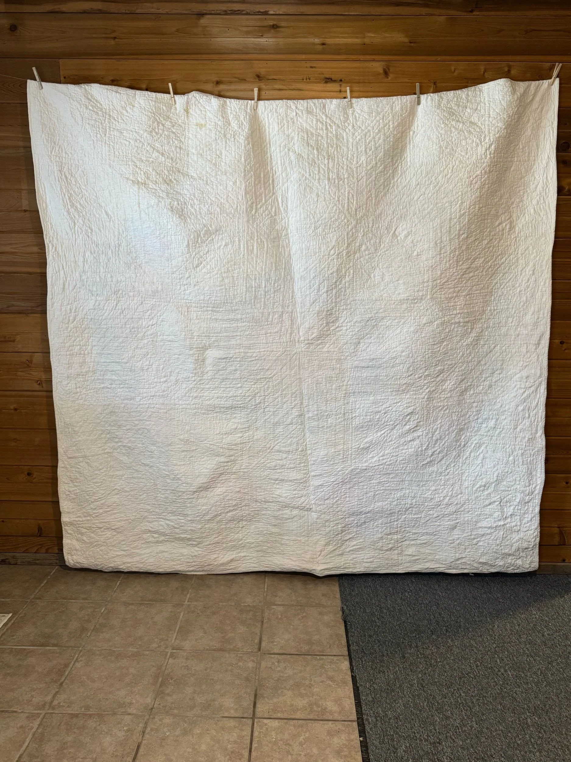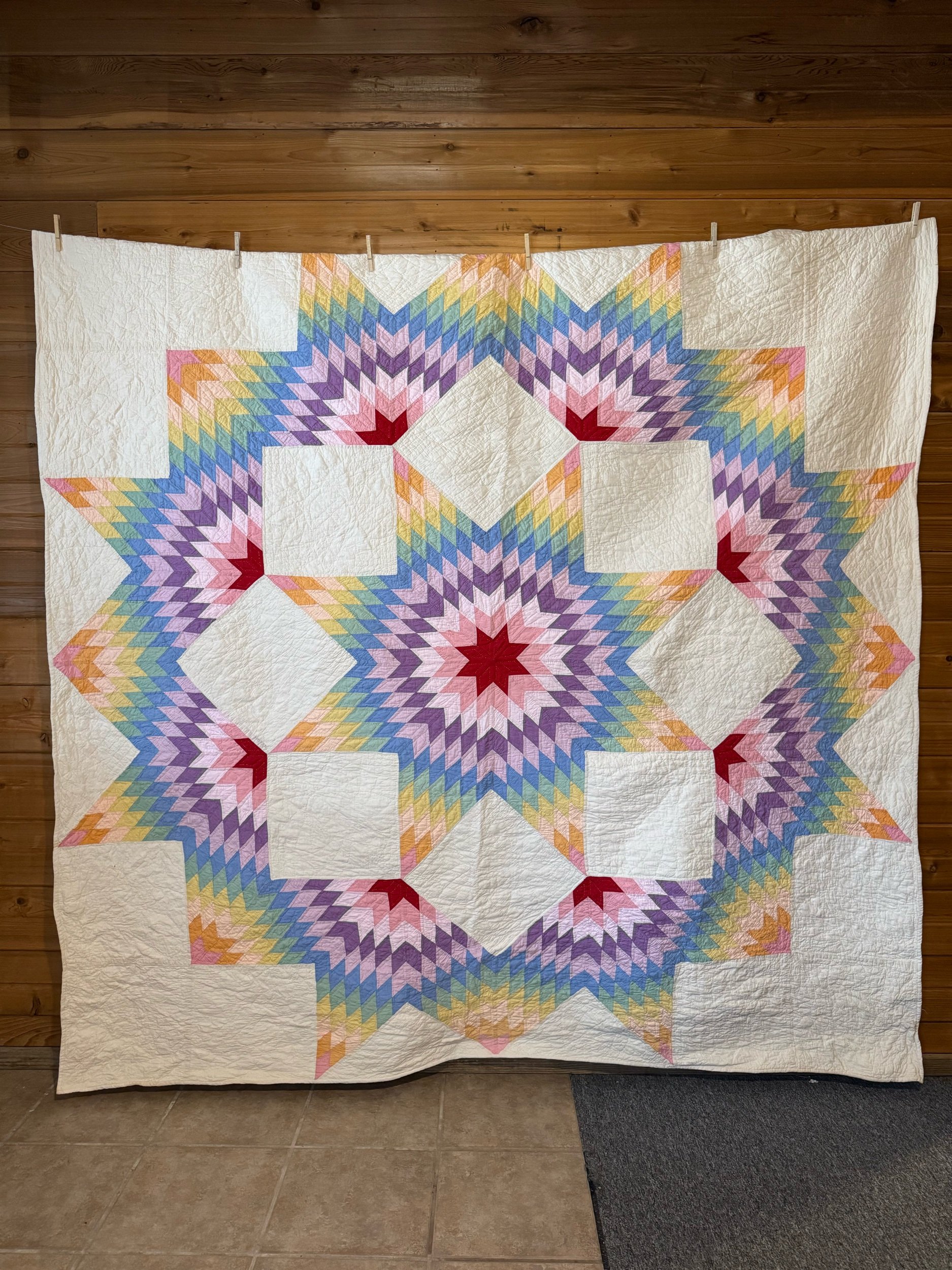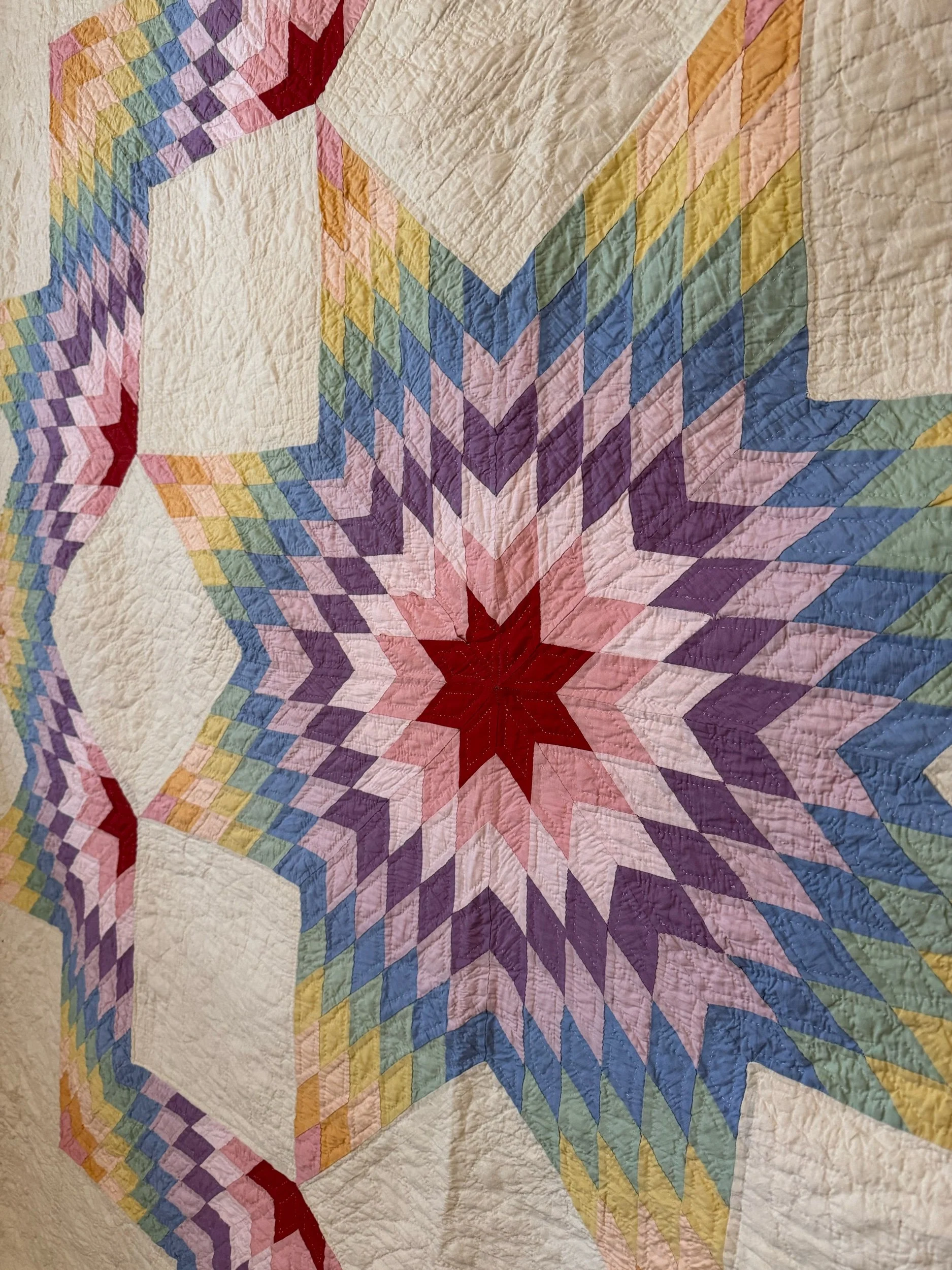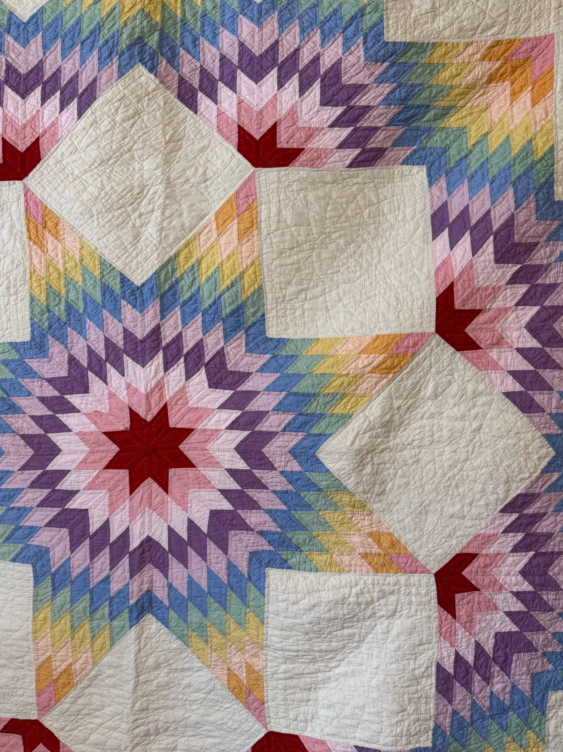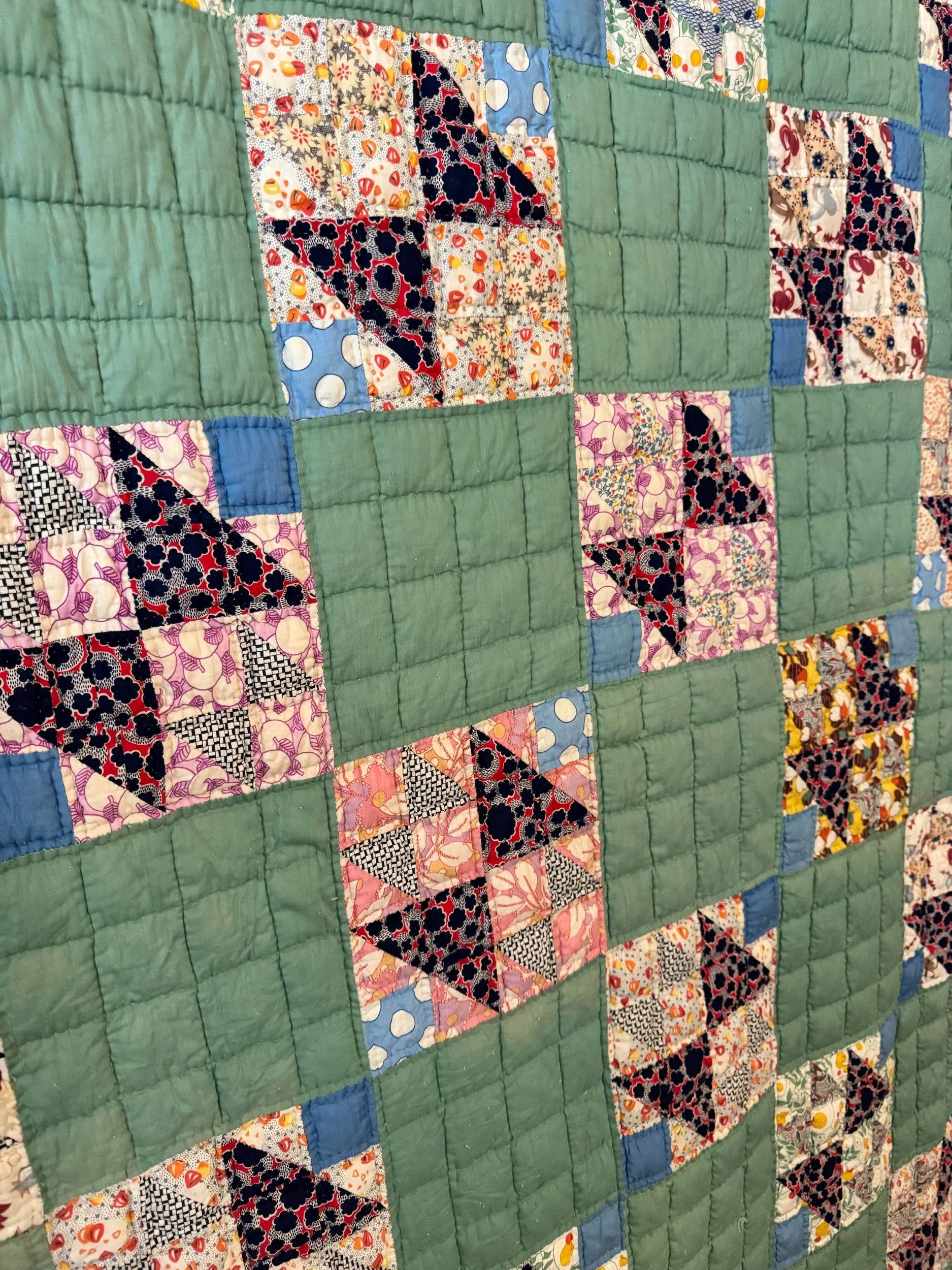 Details: This is what we would call a light weight quilt. There is no batting shift on the inside of the quilt. The quilt is all cotton in gorgeous, solid colors. The diamonds measure 1.5” across. The fabric used is a soft white for the background and matching soft-white back fabric, The back still has advertising from the flower sacks. No found flaws to note, other than a tiny seam pop photographed for reference. This quilt has been carefully washed and air dried. Please view all pictures before buying.