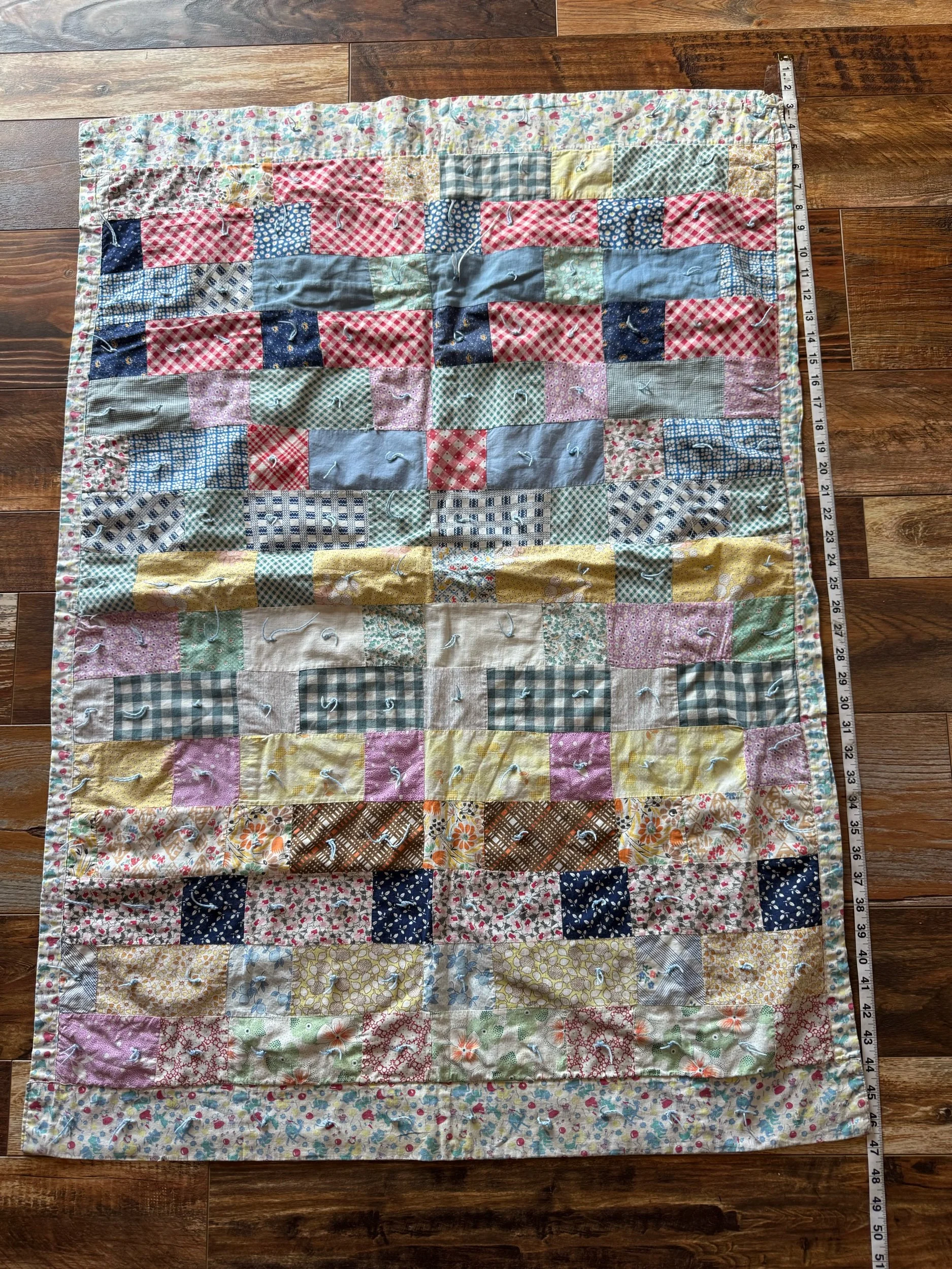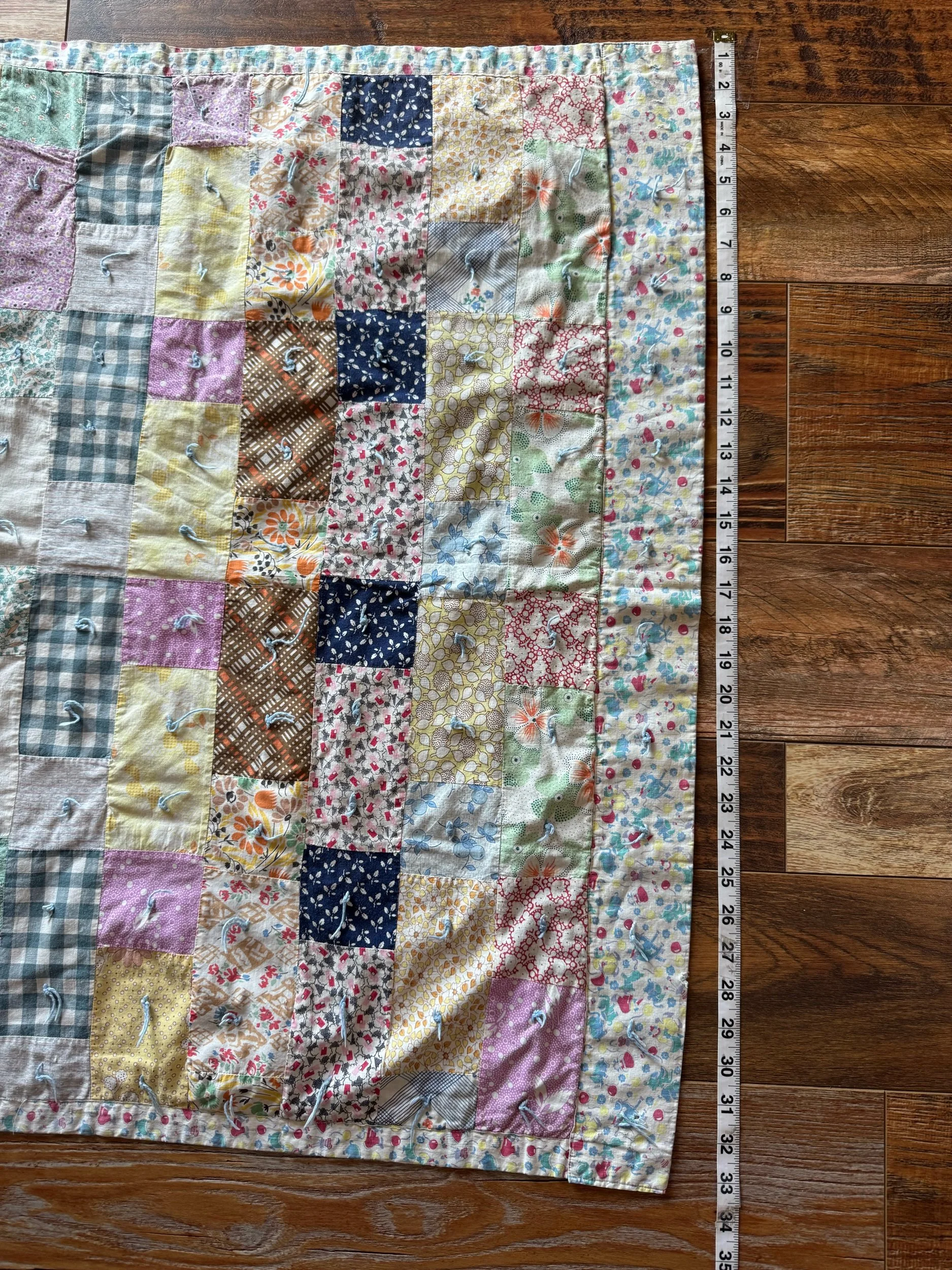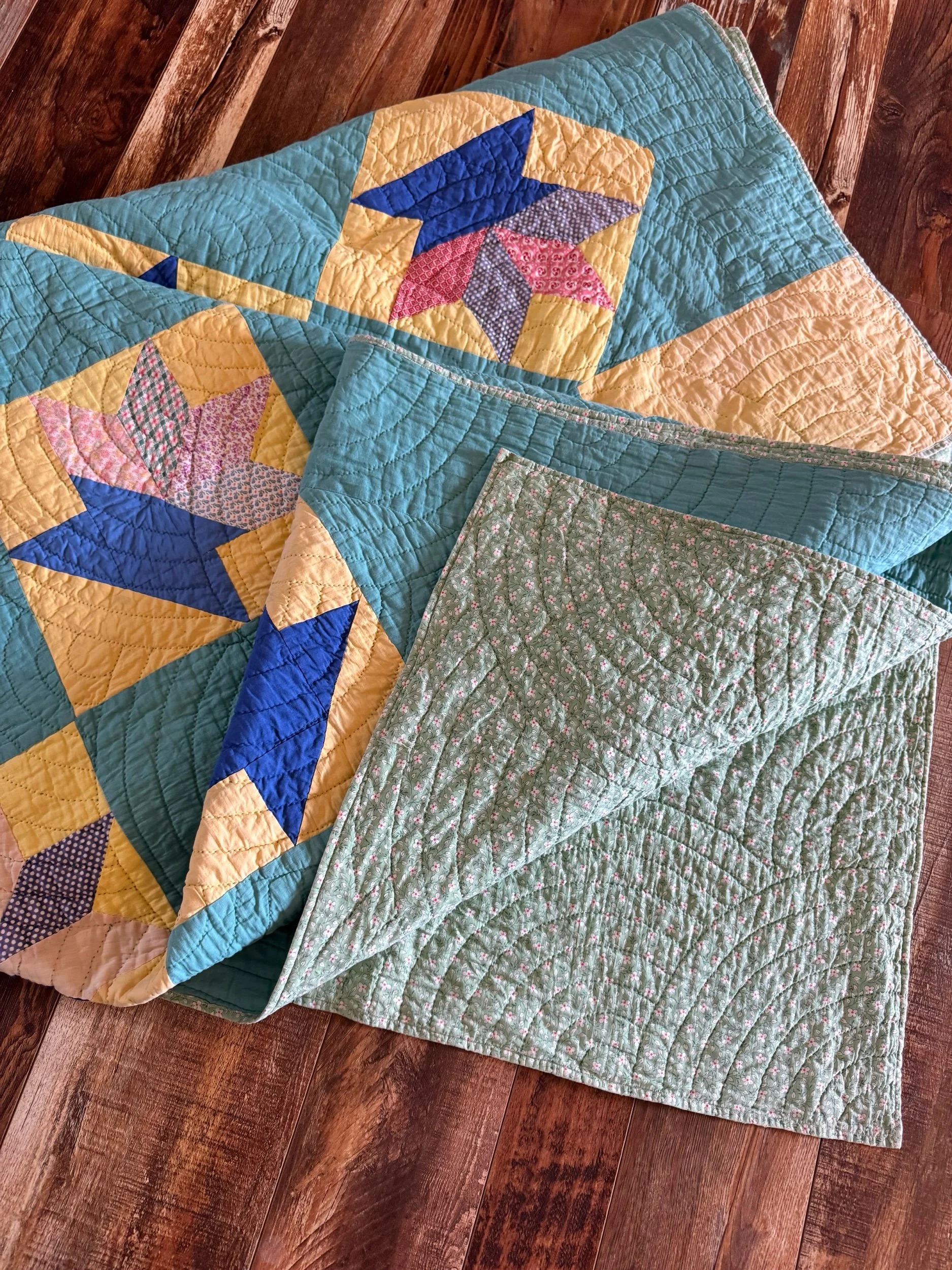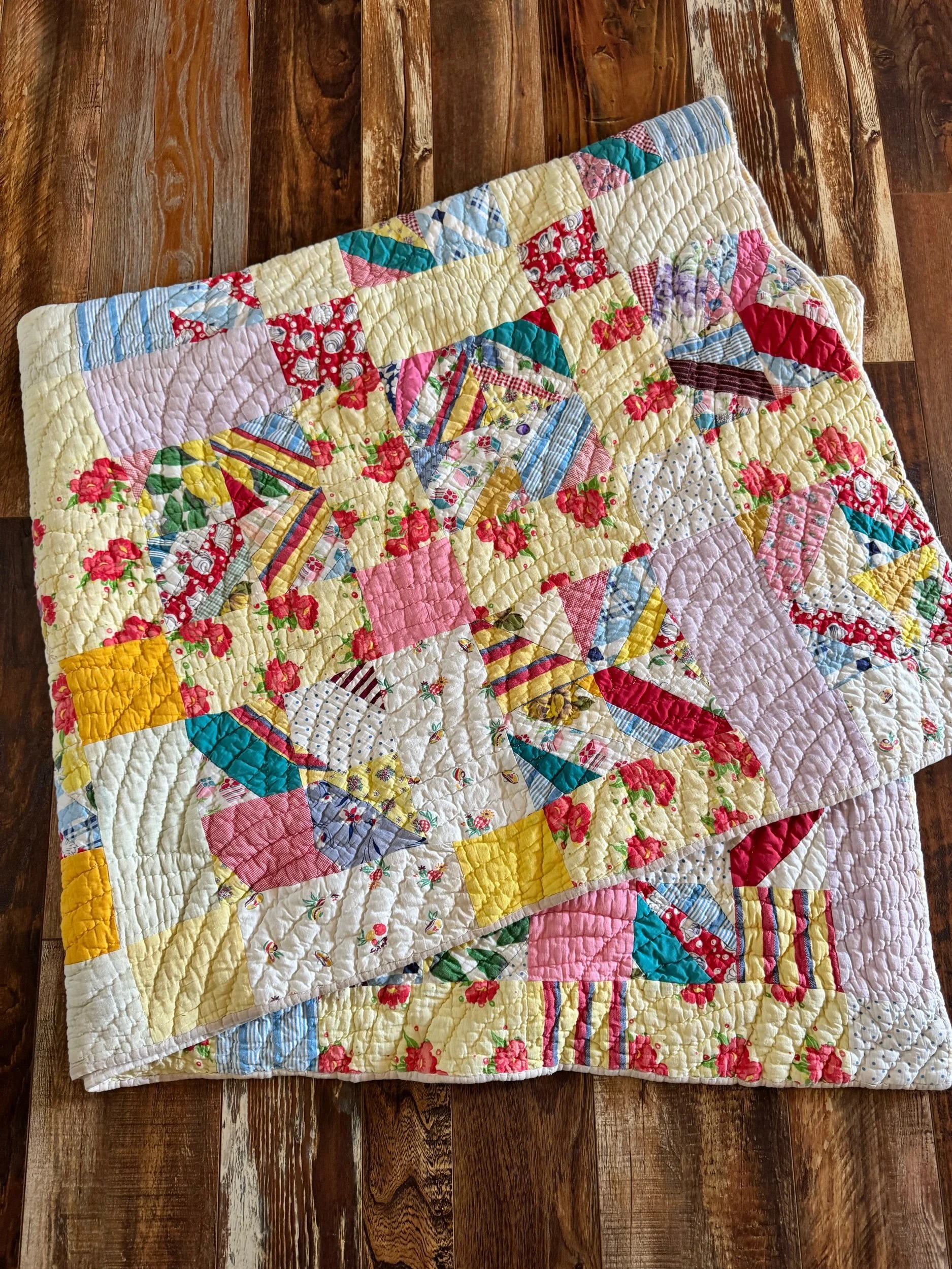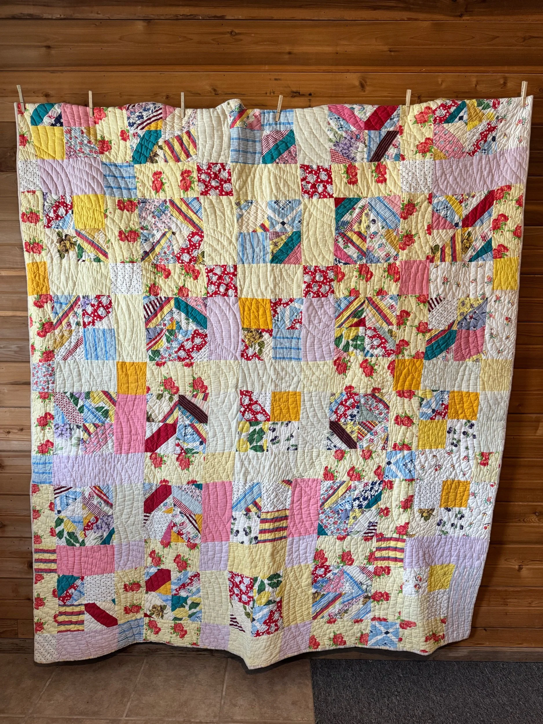 Details: This is what we would call a medium weight quilt. There is no batting shift or lumps in the quilt. The scrappy blocks are made of awesome florals from flour sacks and lots of yellow! The back fabric is a soft, flannel yellow and tan stripe. It is amazing! The binding is back to front, hand applied. There are no holes or seam pops. We also found no stains. On the back, there is one quarter sixed mended tear, back side only. This quilt has been carefully washed and air dried. Please view all pictures before buying.