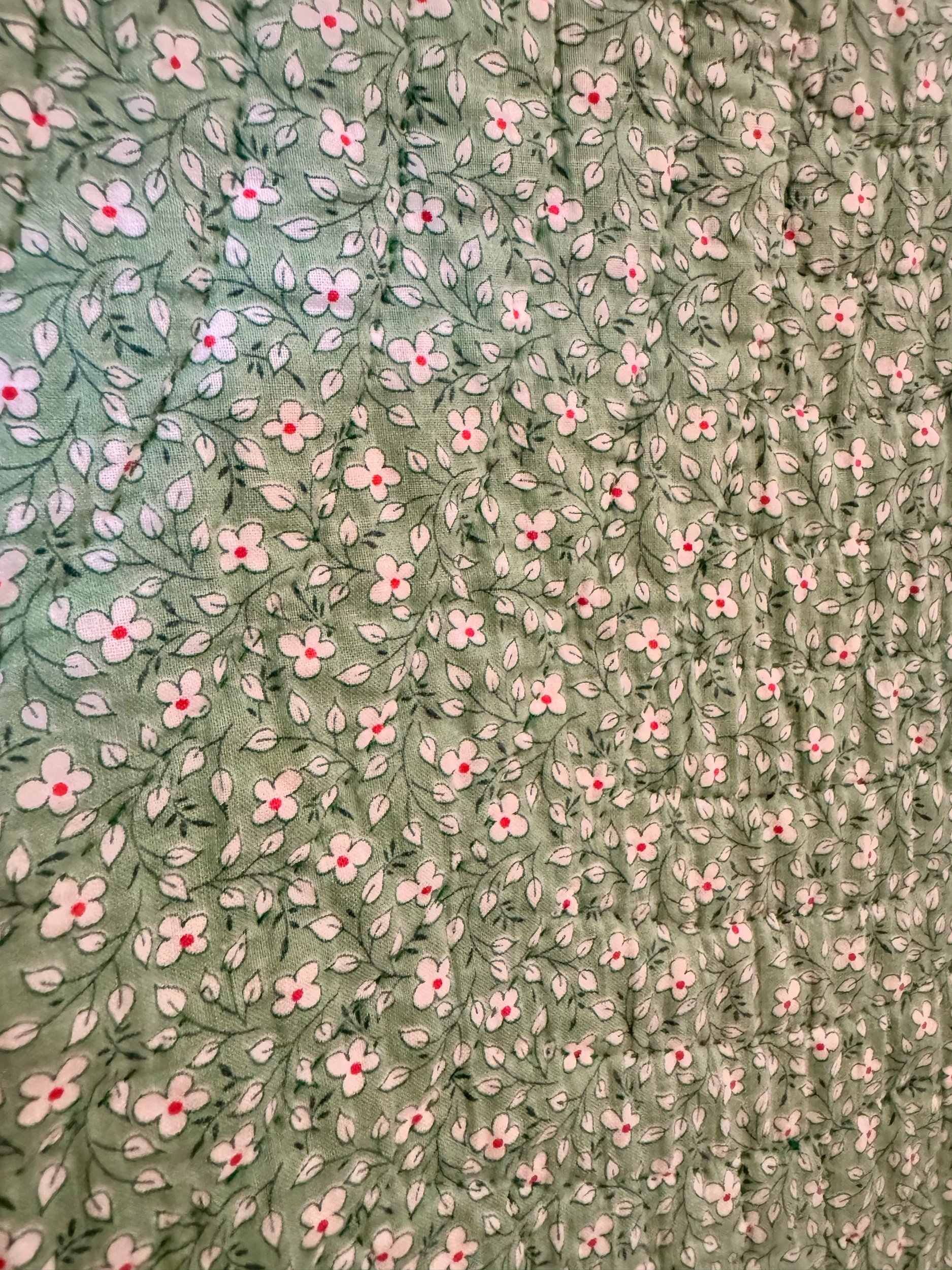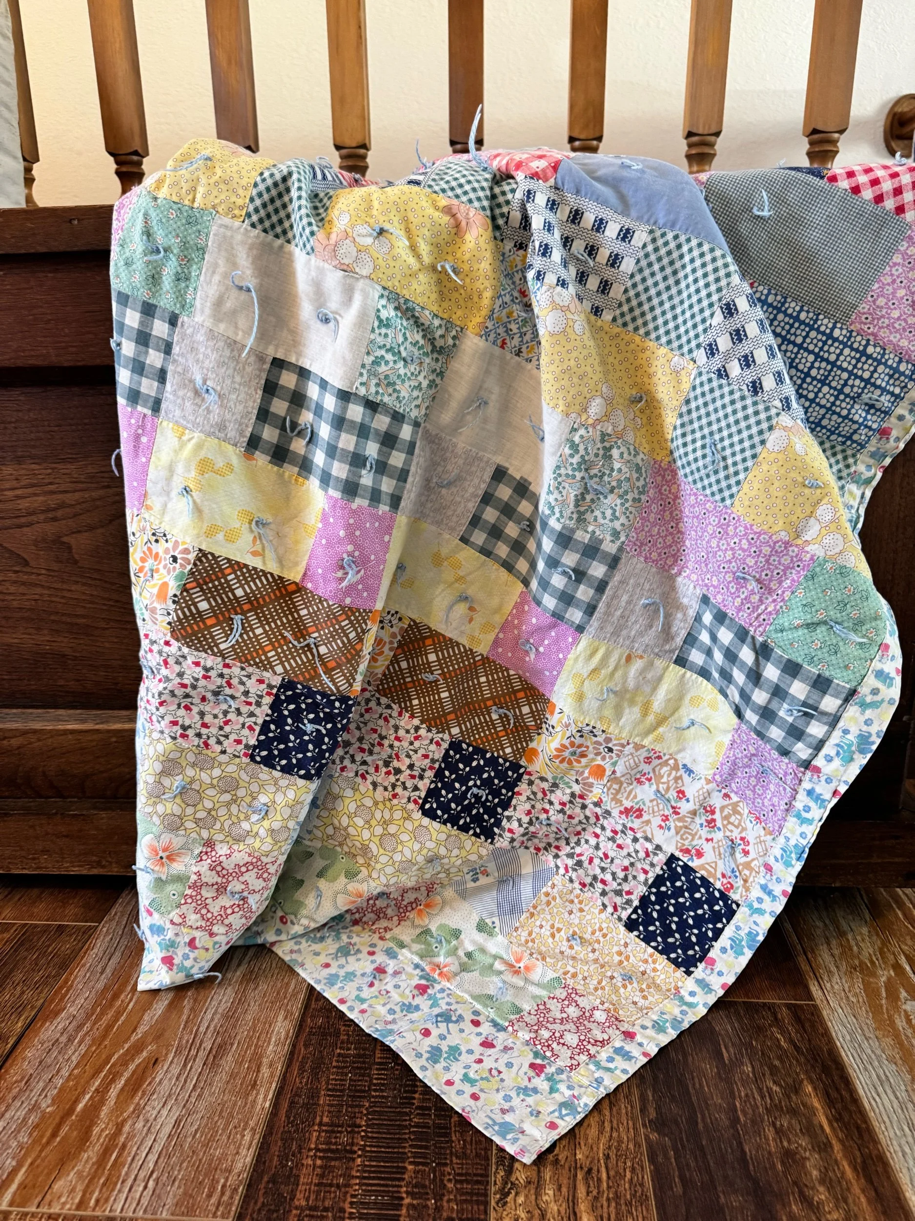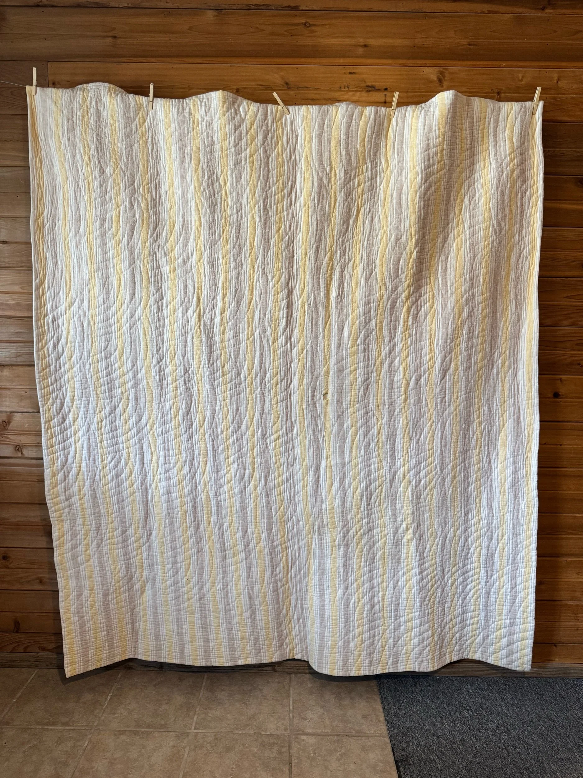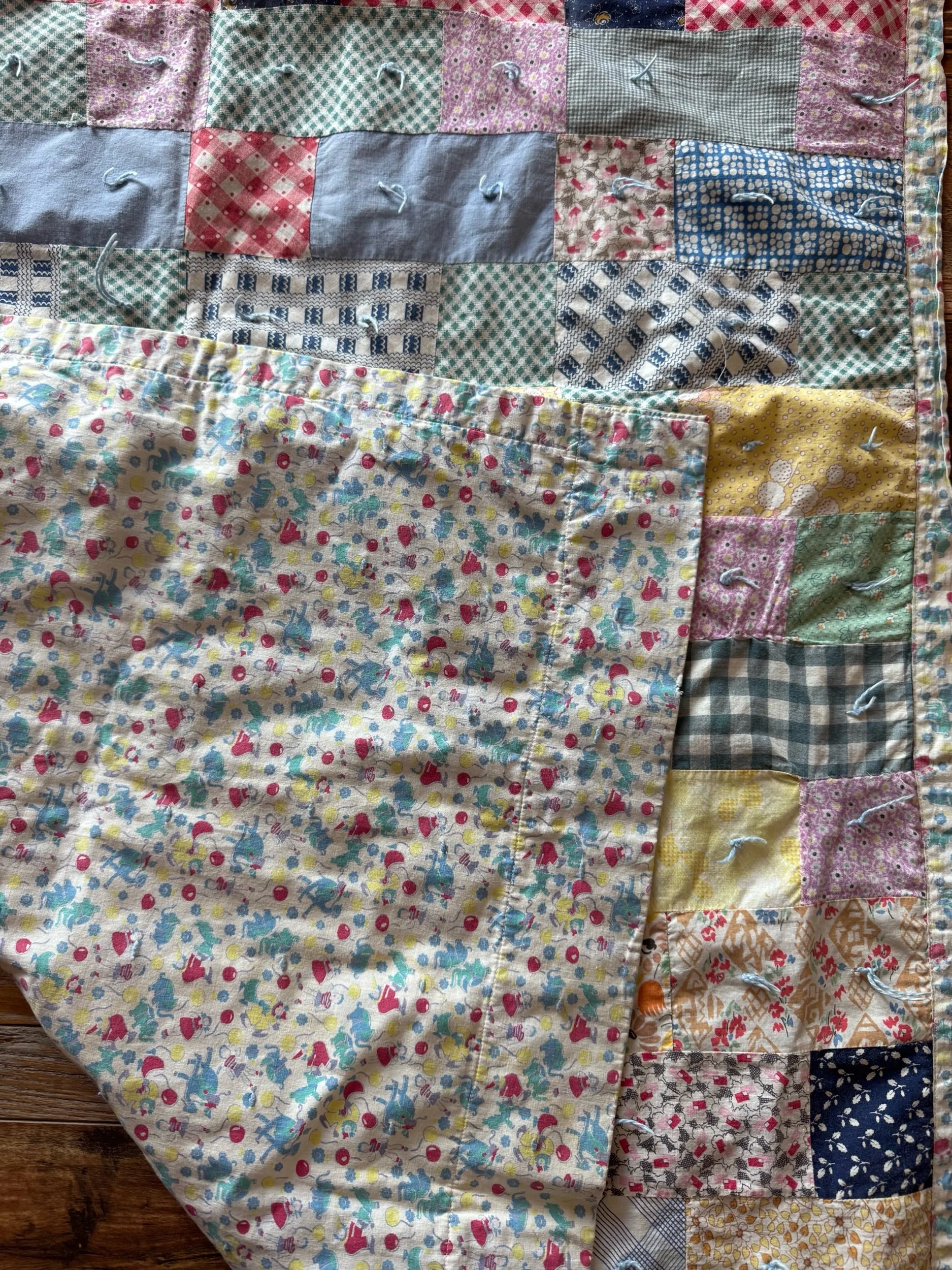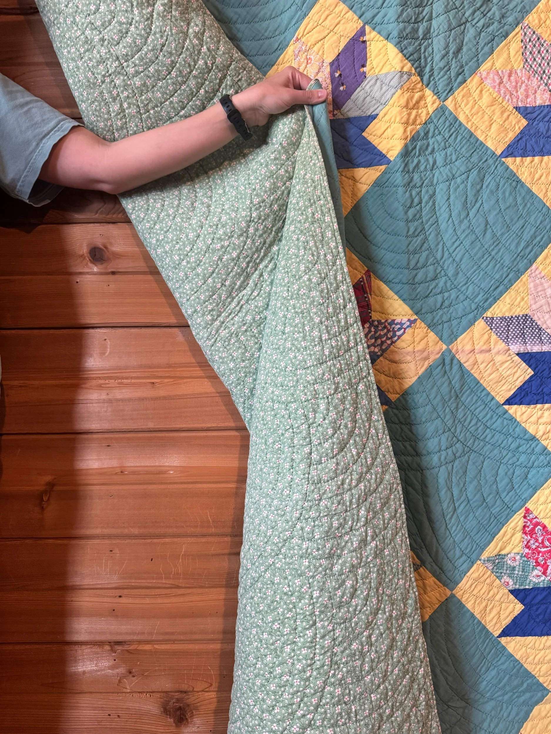 Details: This is what we would call a medium weight quilt. There is no batting shift or lumps in the quilt. The scrappy blocks are made of awesome florals from flour sacks and lots of yellow! The back fabric is a soft, flannel yellow and tan stripe. It is amazing! The binding is back to front, hand applied. There are no holes or seam pops. We also found no stains. On the back, there is one quarter sixed mended tear, back side only. This quilt has been carefully washed and air dried. Please view all pictures before buying.
