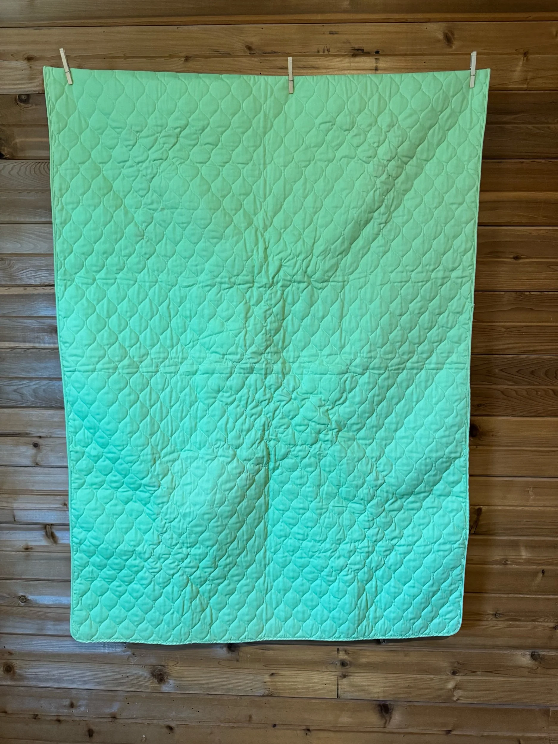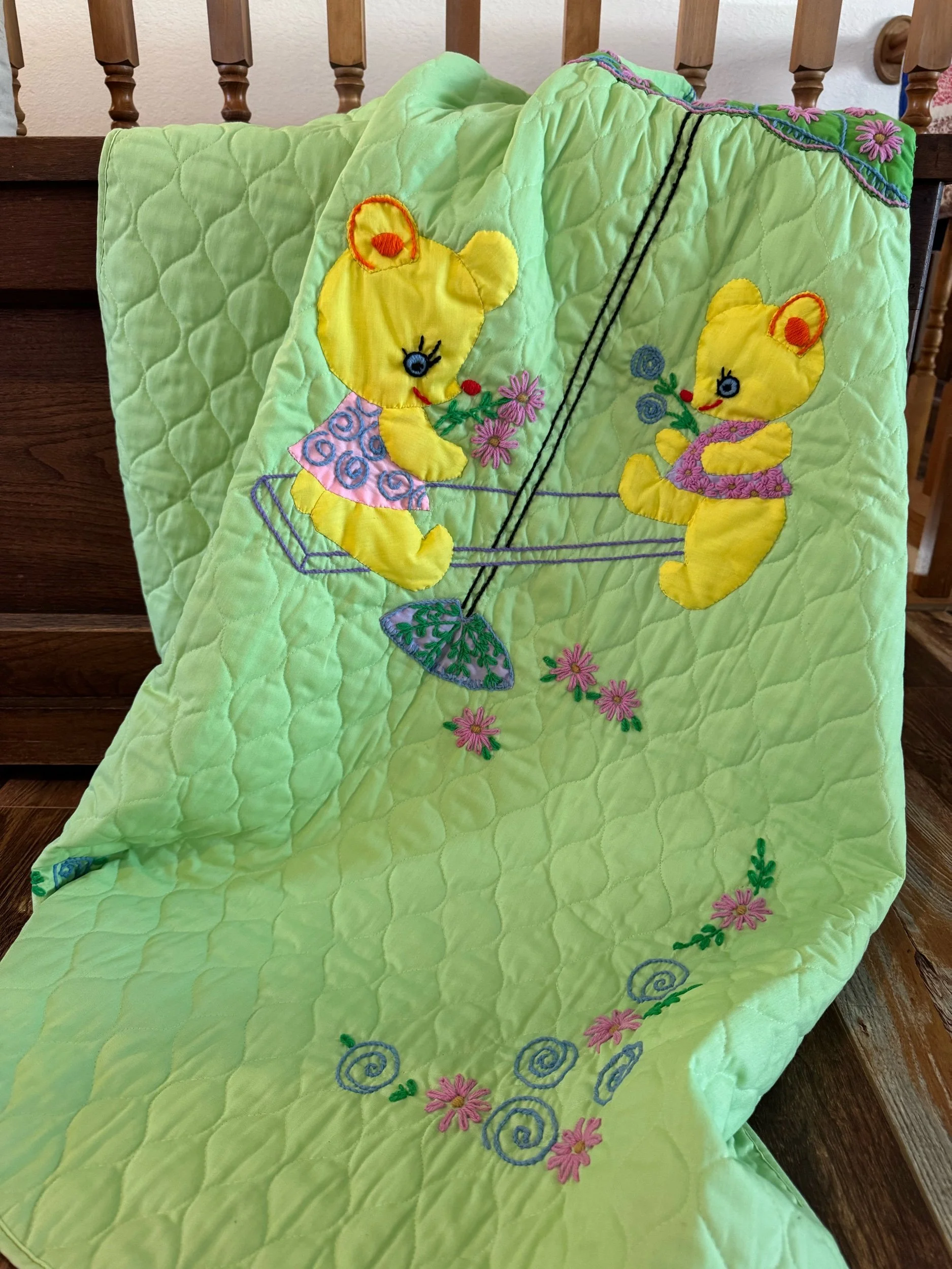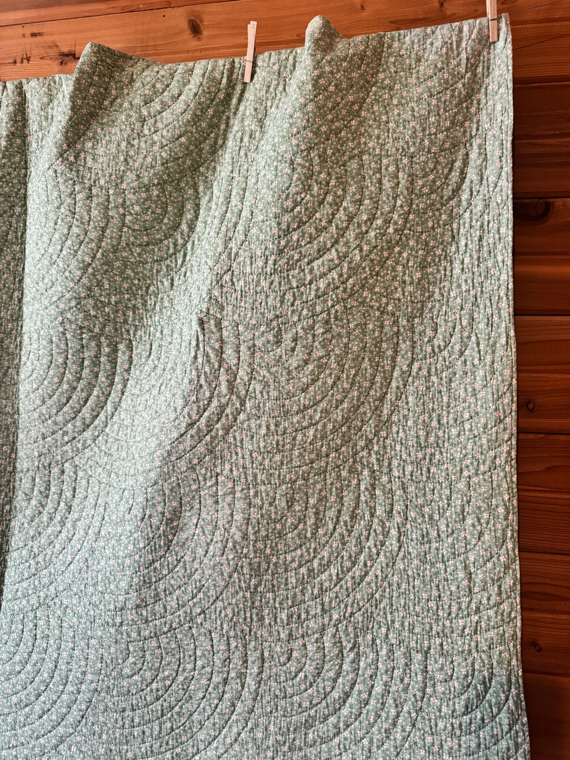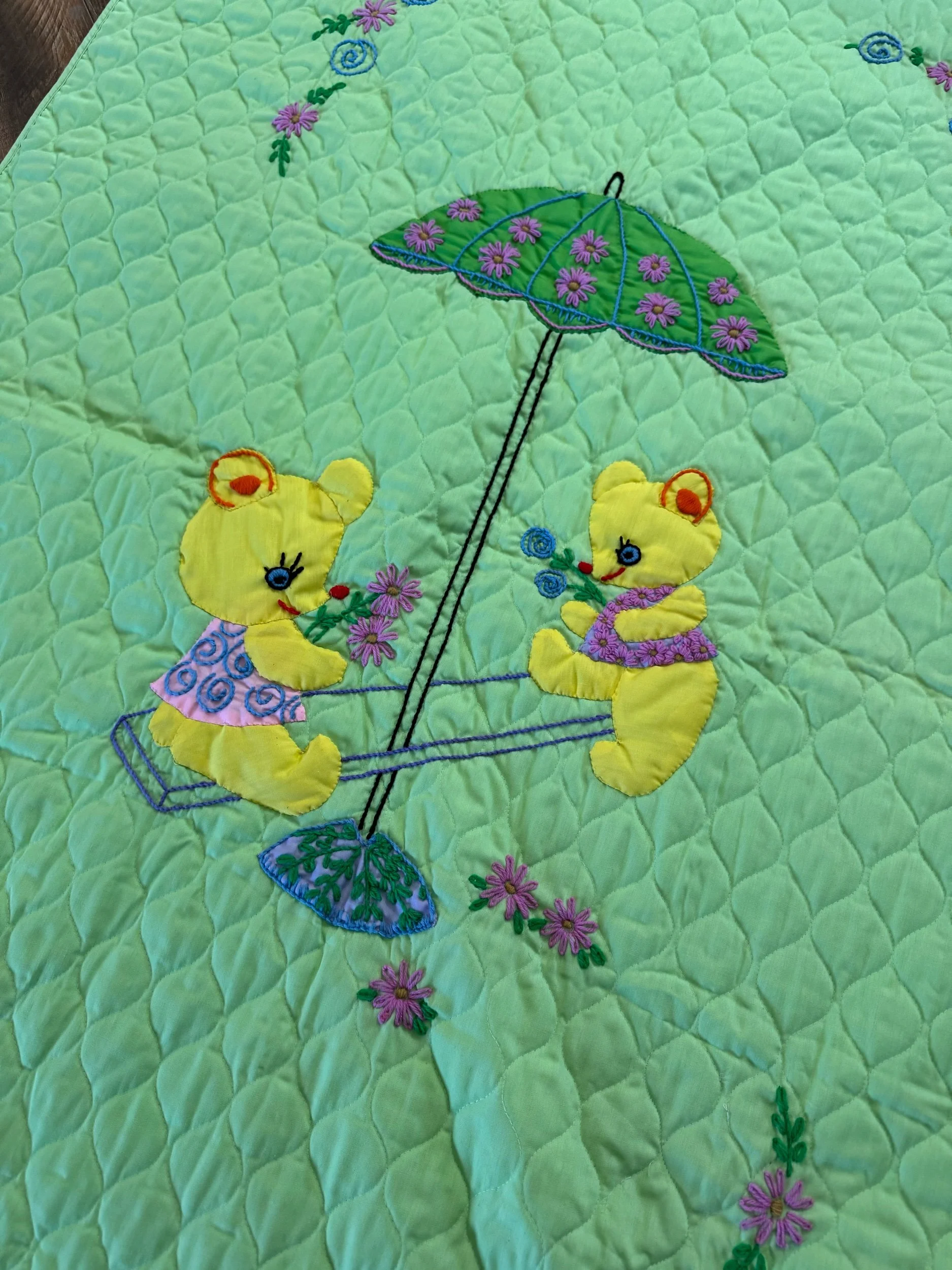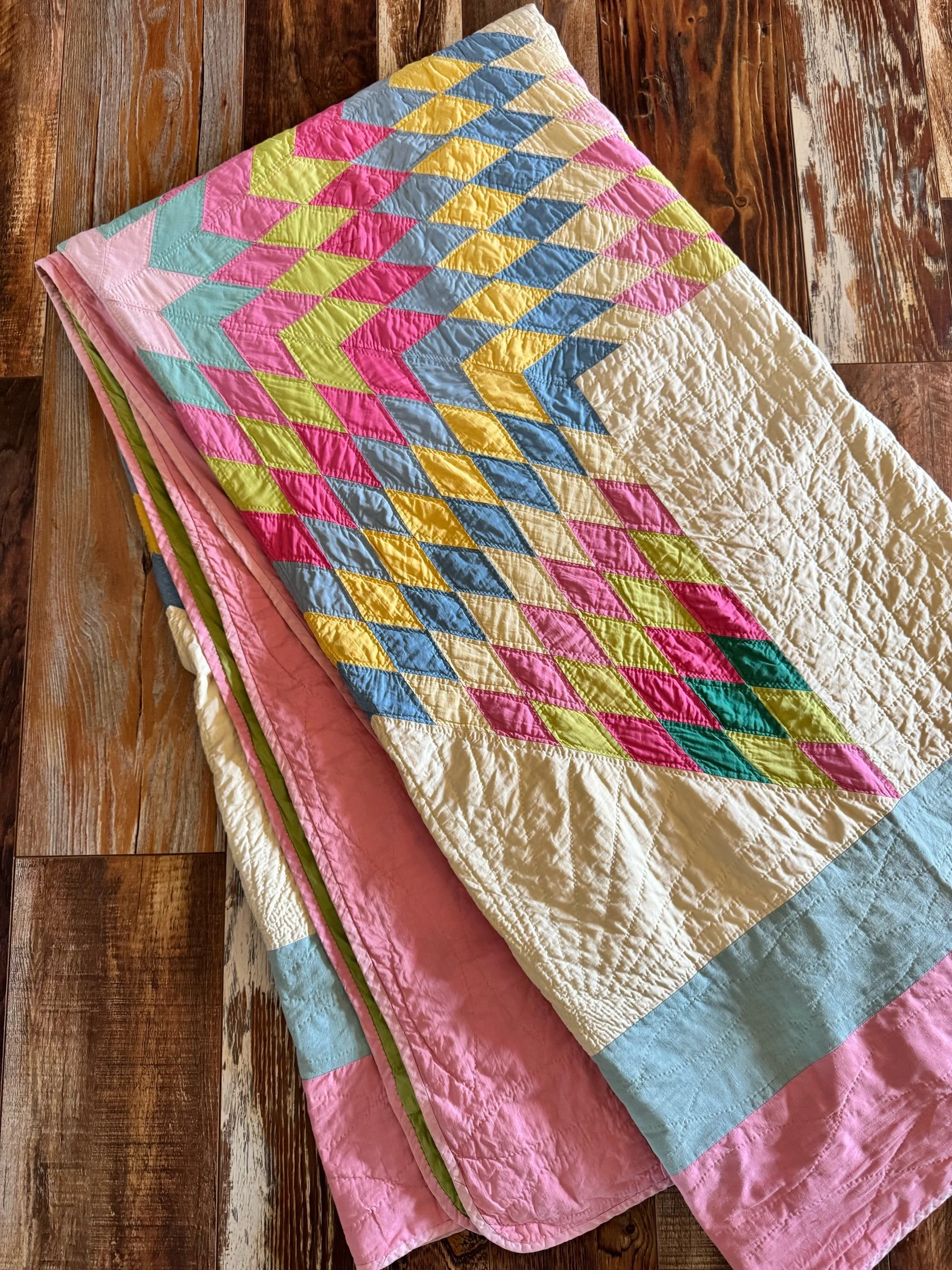 Details: This is what we would call a medium weight quilt. There is no batting shift or lumps in the quilt. The scrappy blocks are made of awesome florals from flour sacks and lots of yellow! The back fabric is a soft, flannel yellow and tan stripe. It is amazing! The binding is back to front, hand applied. There are no holes or seam pops. We also found no stains. On the back, there is one quarter sixed mended tear, back side only. This quilt has been carefully washed and air dried. Please view all pictures before buying.