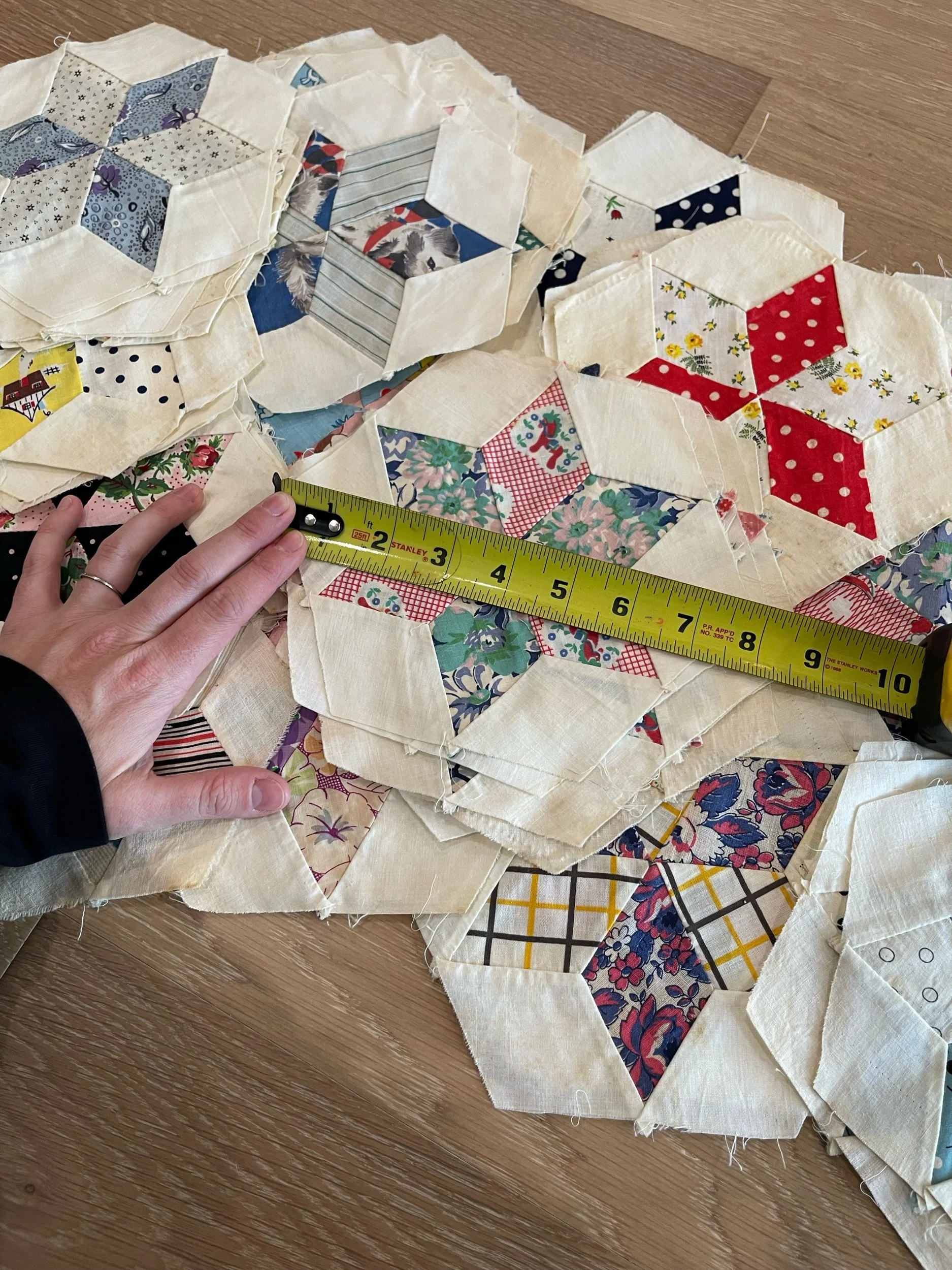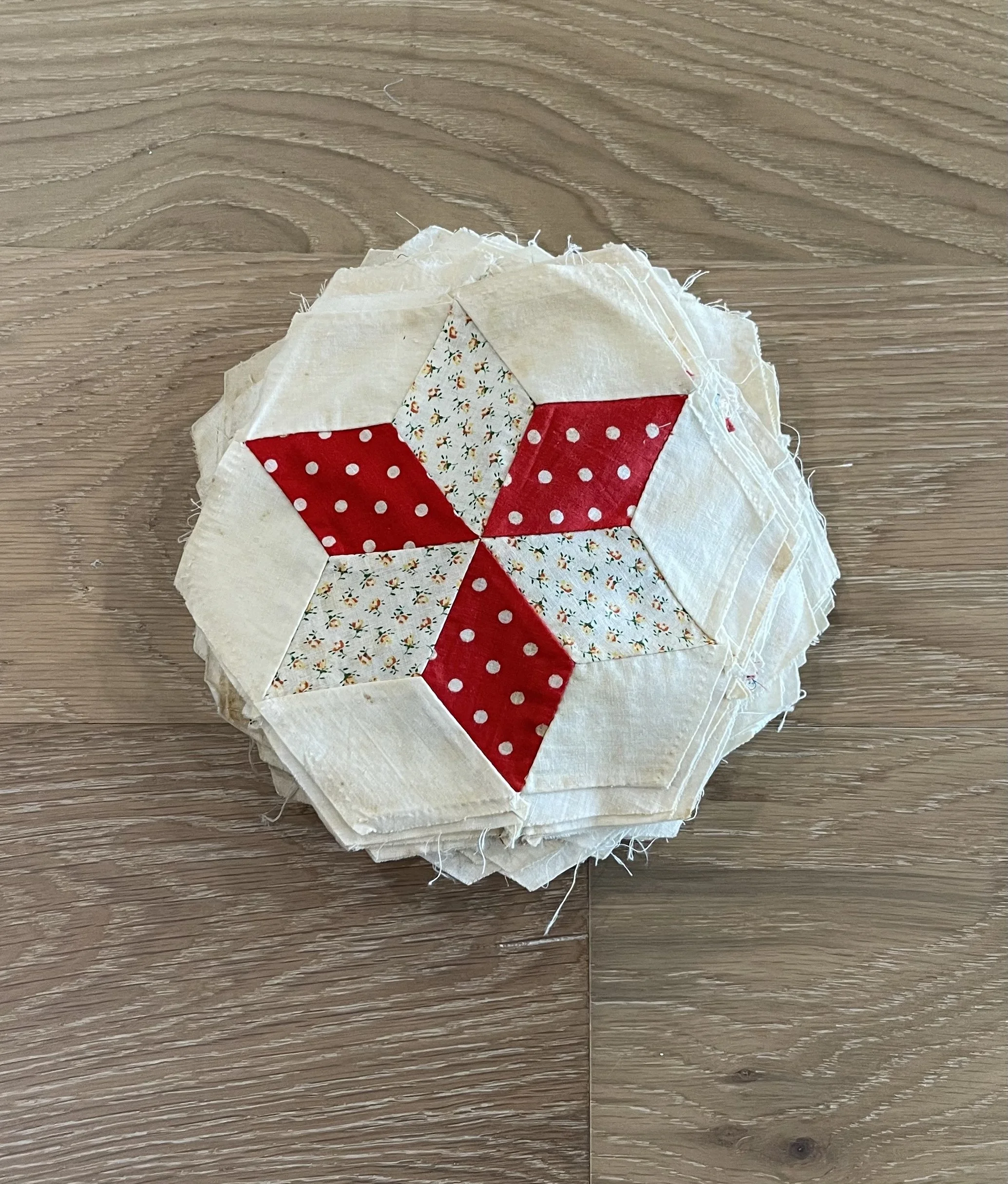 This quilt blocks measure approximately 7” wide. This is a wonderful set of 55 vintage quilt blocks. They are all uniform pattern, the Star, in a variety of prints and colors, with off white backgrounds. The fabrics are all cotton muslin. The blocks are all hand pieced. A few of the blocks have small spots, but they are unwashed and untreated. We did not find any holes, tears, or seam separations! They are in excellent condition. They would make the cutest mug rugs, a full quilt, or whatever craft/idea you have in mind!