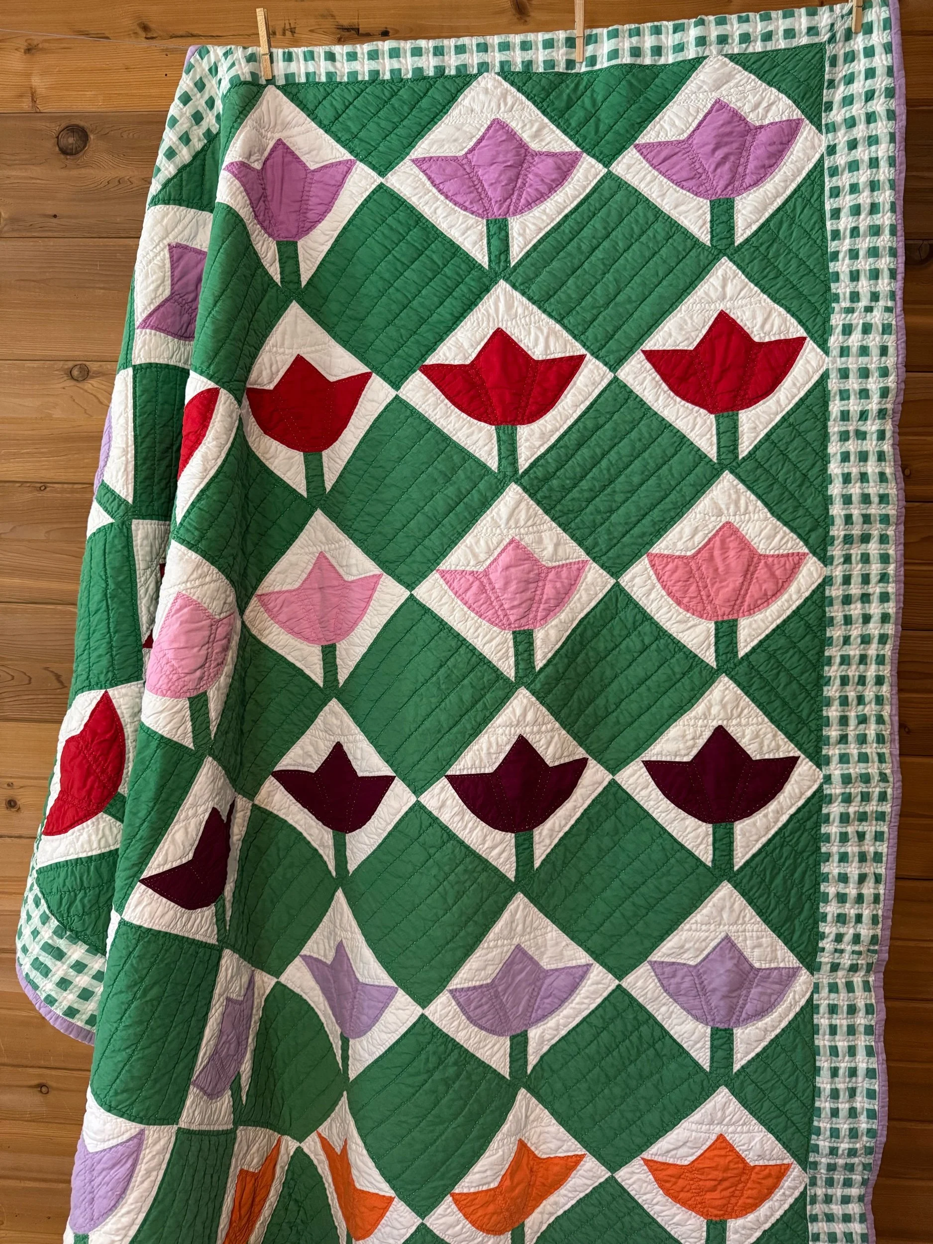 Details: This is what we would call a lightweight quilt. There is no batting shift inside the quilt. This quilt has wonderful craftsmanship to the even, petite quilting stitches to the hand embroidered names. It is circa 1940. Some of the beautiful names are Estes, Cora, Nanny, Lula & Grace. The blocks are 9.5” wide. The background of the quilt blocks are a soft back. The sashing blocks are peach. There is also a peach and light sage alternating sawtooth double border on two sides, matching frame on the top and bottom. This quilt is in awesome shape. There are no seam pops, holes, tears, or stains. This quilt has been carefully washed and air dried. Please view all pictures before buying.