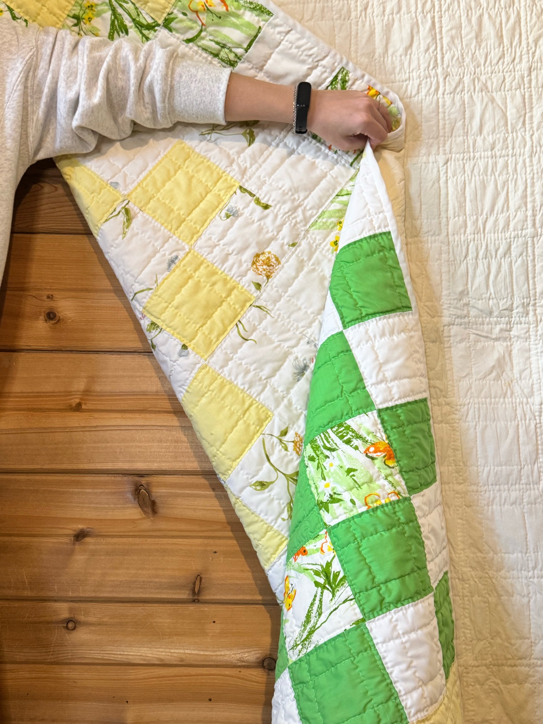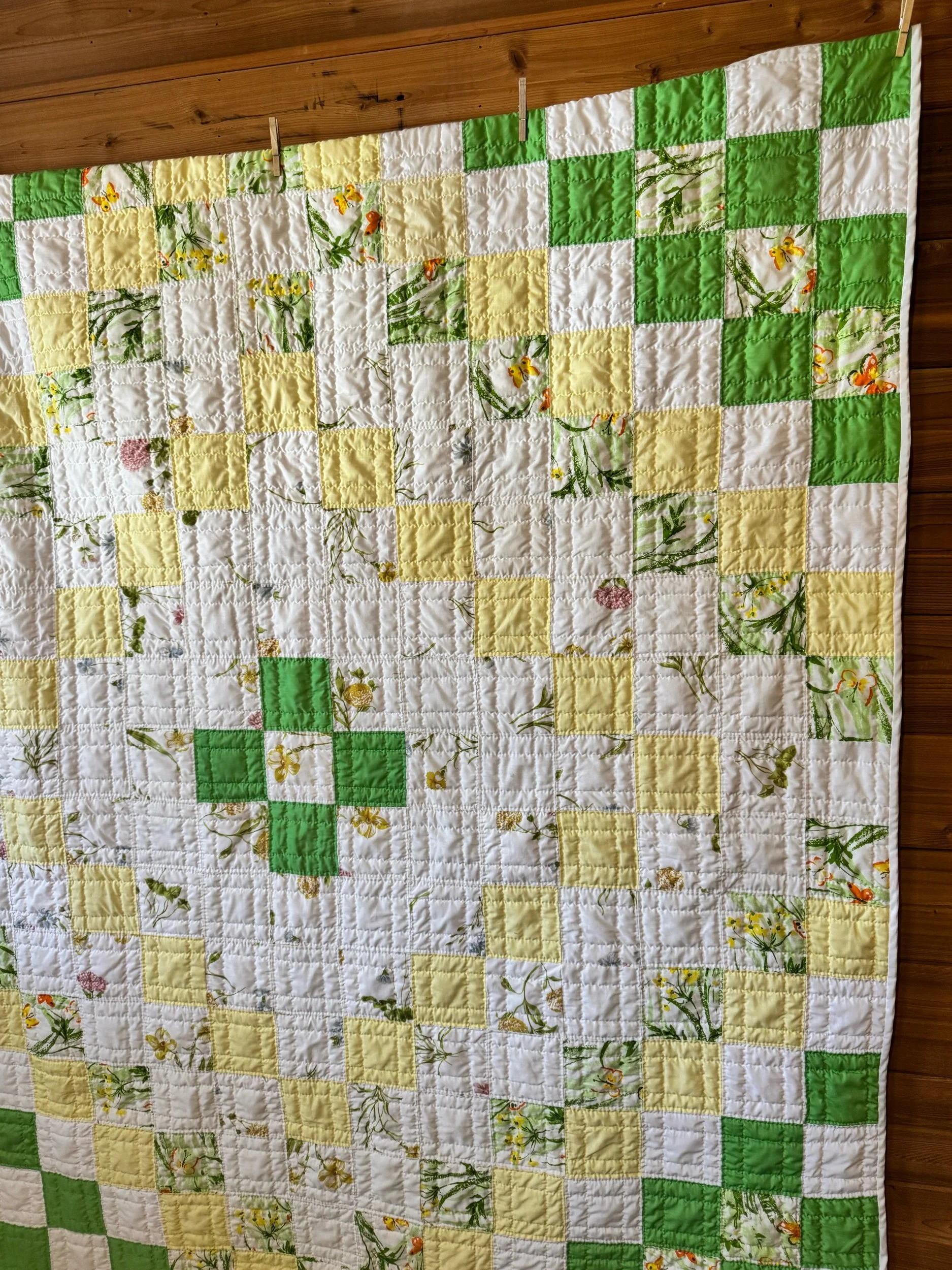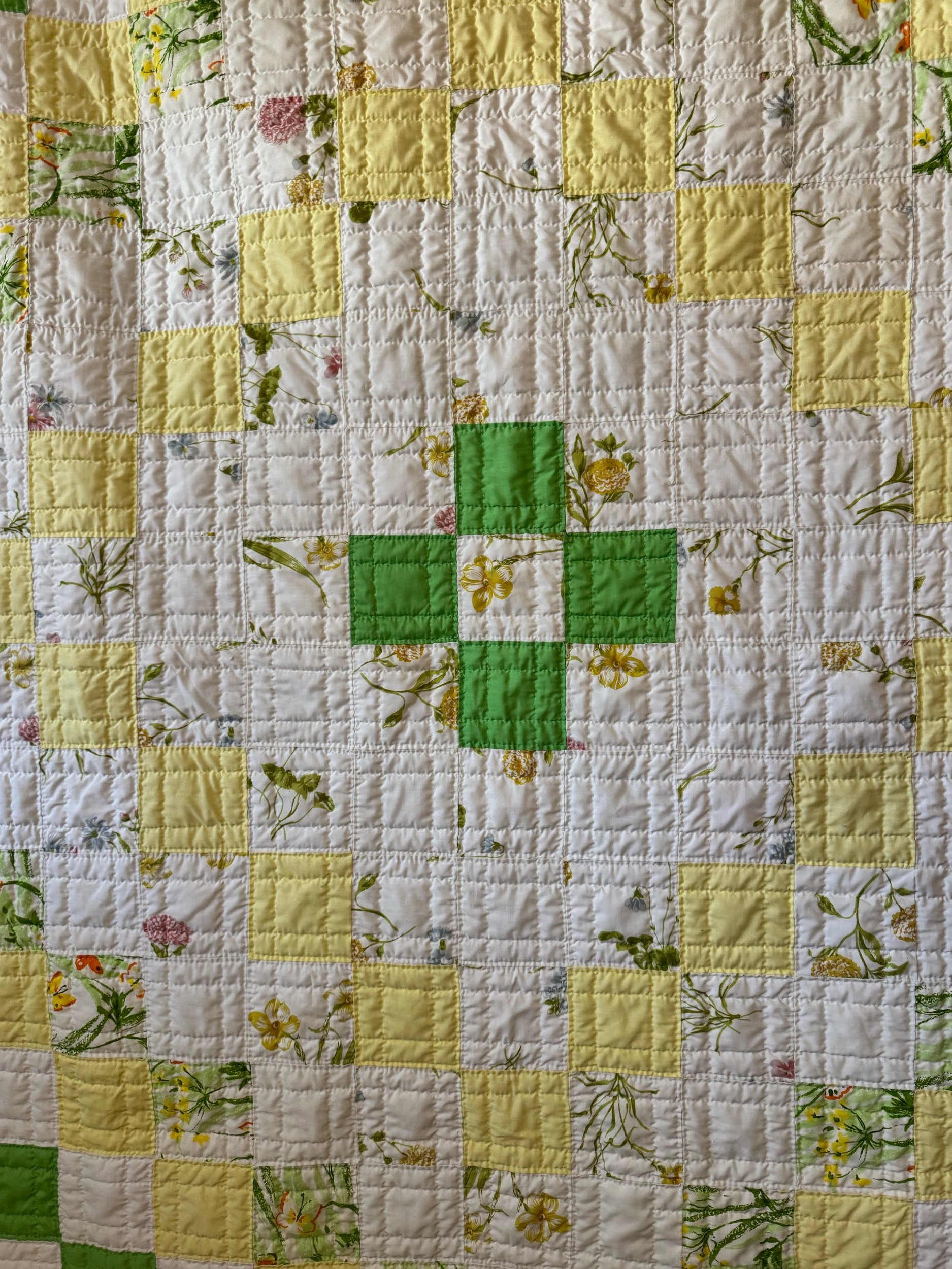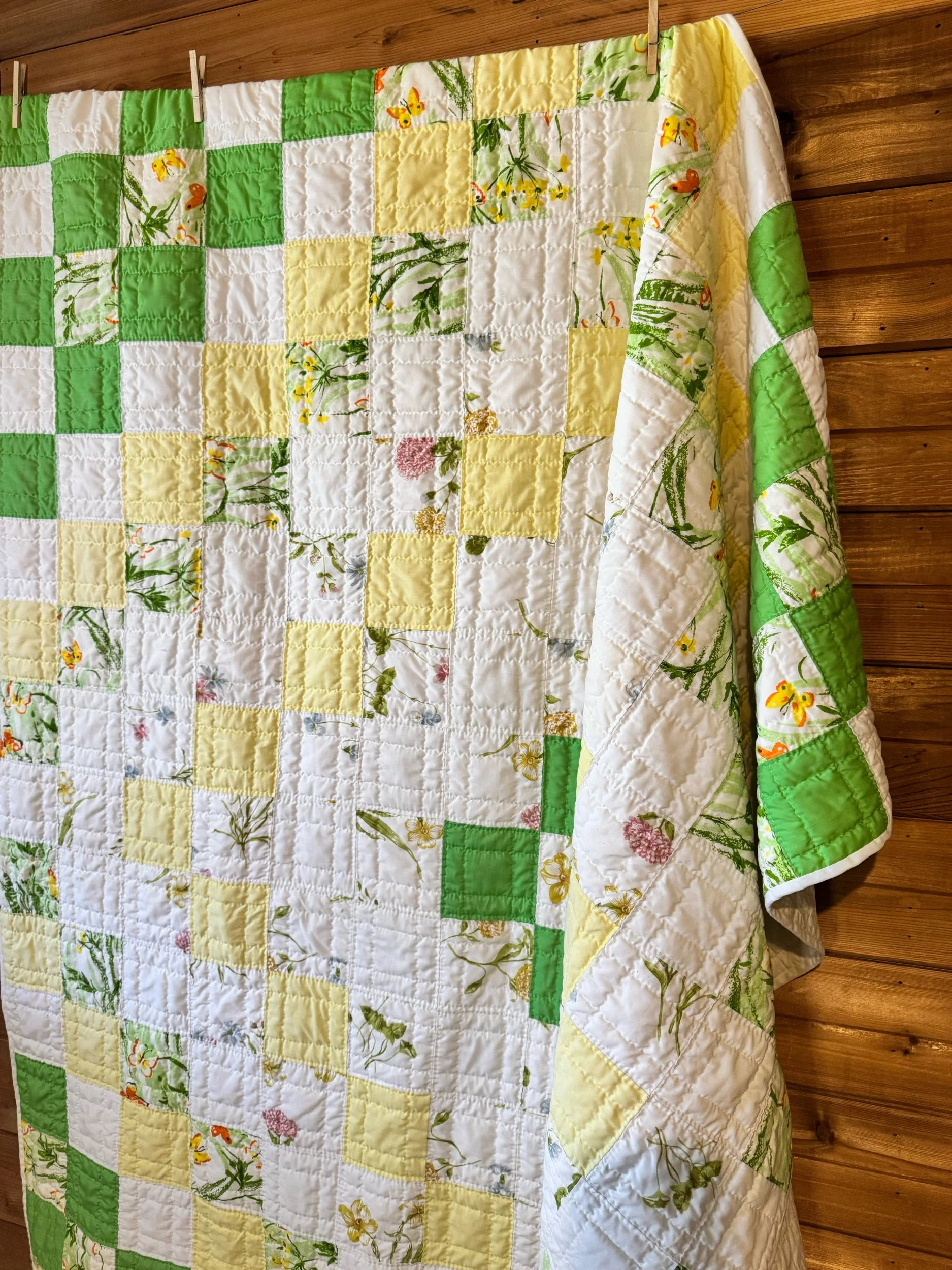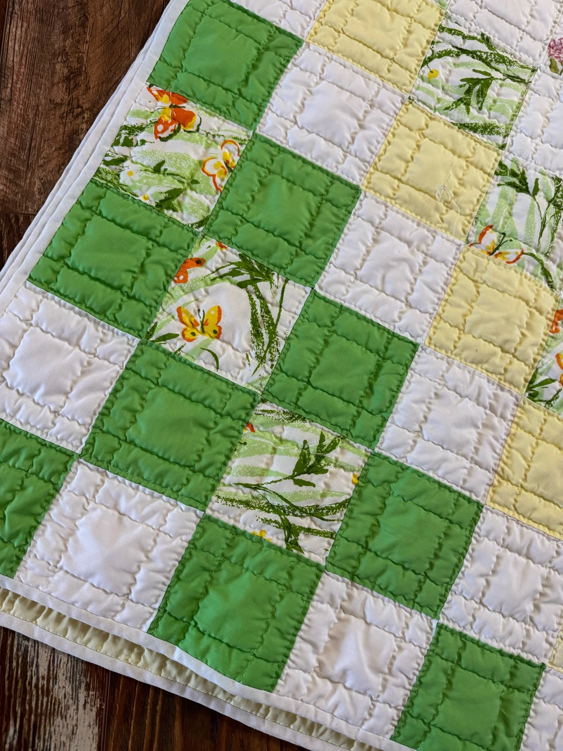 Details: This is what we would call a lightweight quilt. There is no batting shift inside the quilt. The simple patch blocks measure 4”. They are set in a diamond design. This is a quilt made of poly-cottons and cotton. The back feels like an old flat sheet, very pale yellow. The front has bright-green, pale yellow, and white. It has some spring florals mixed in, with the cutest butterflies. This quilt is so soft! No found flaws on this awesome vintage quilt. We also see no piling. This quilt has been carefully washed and air dried. Please view all pictures before buying.