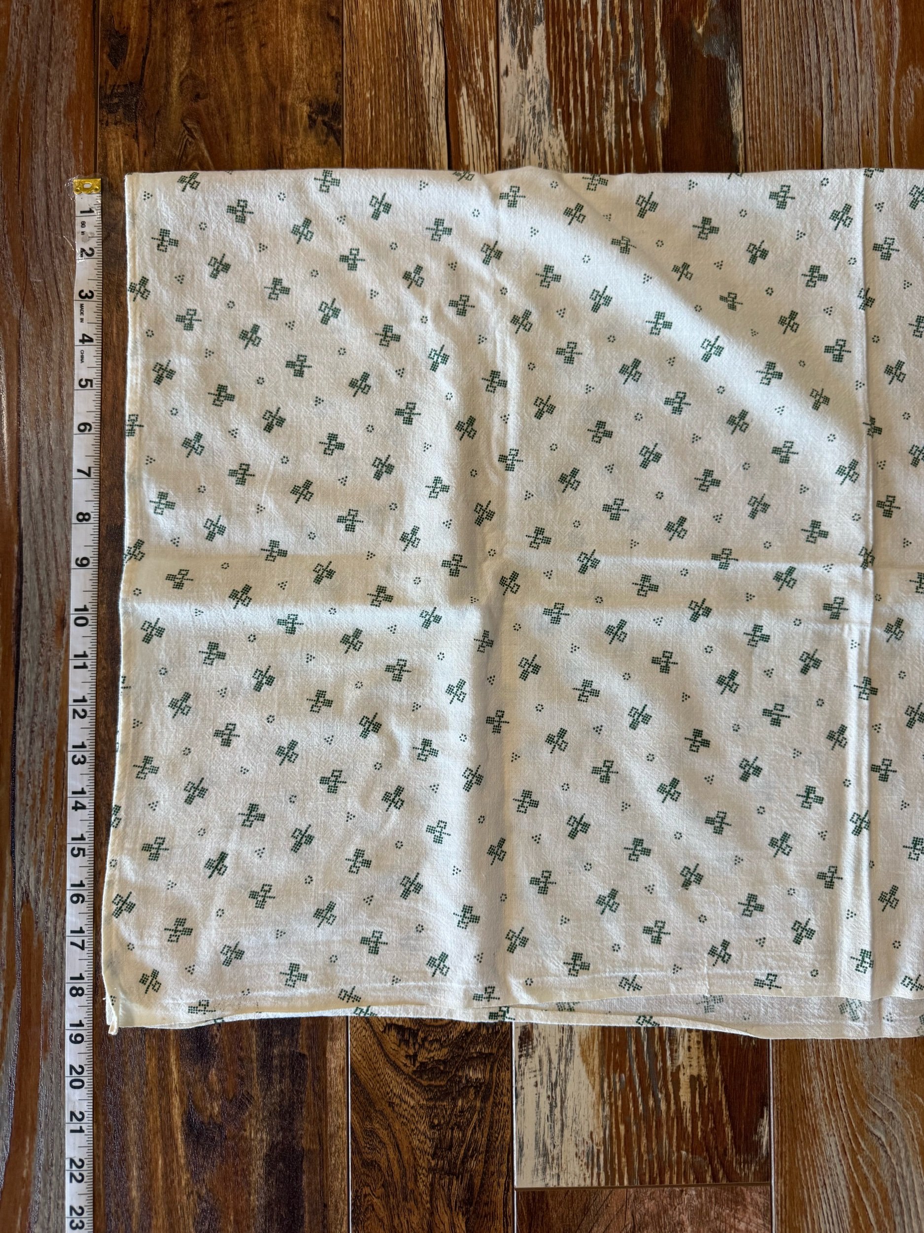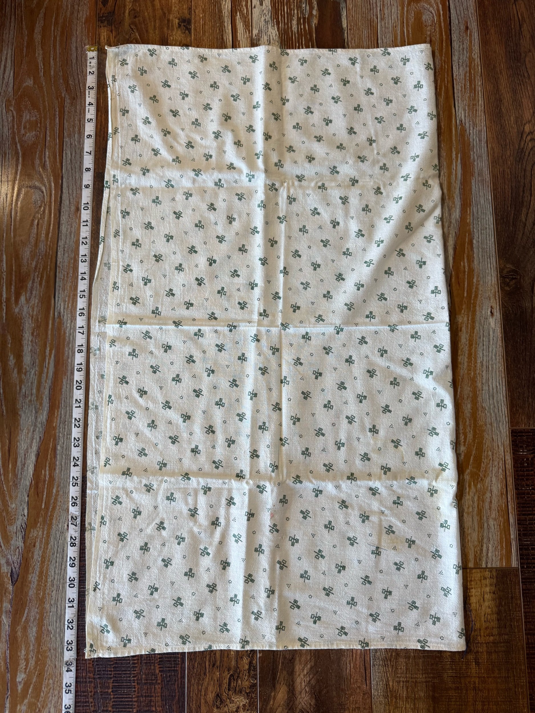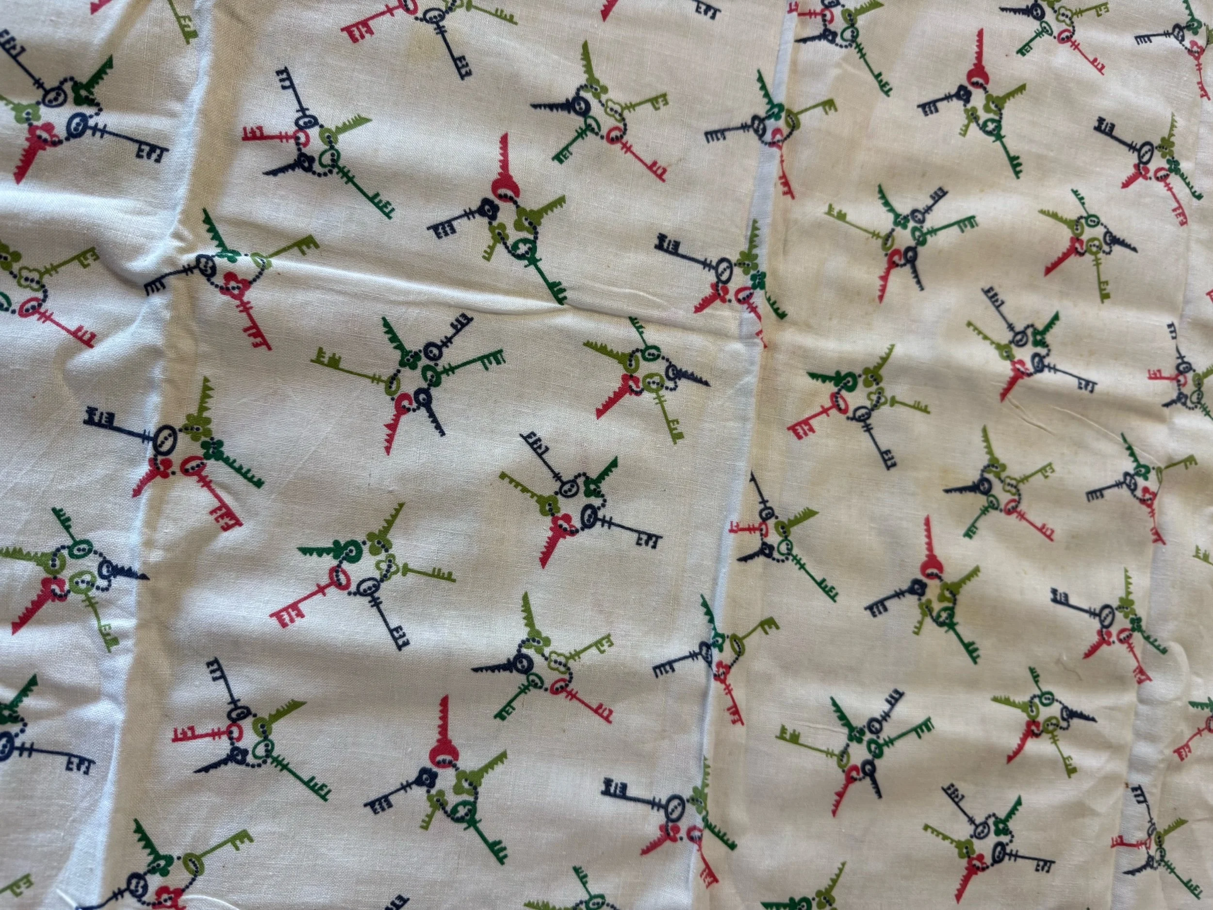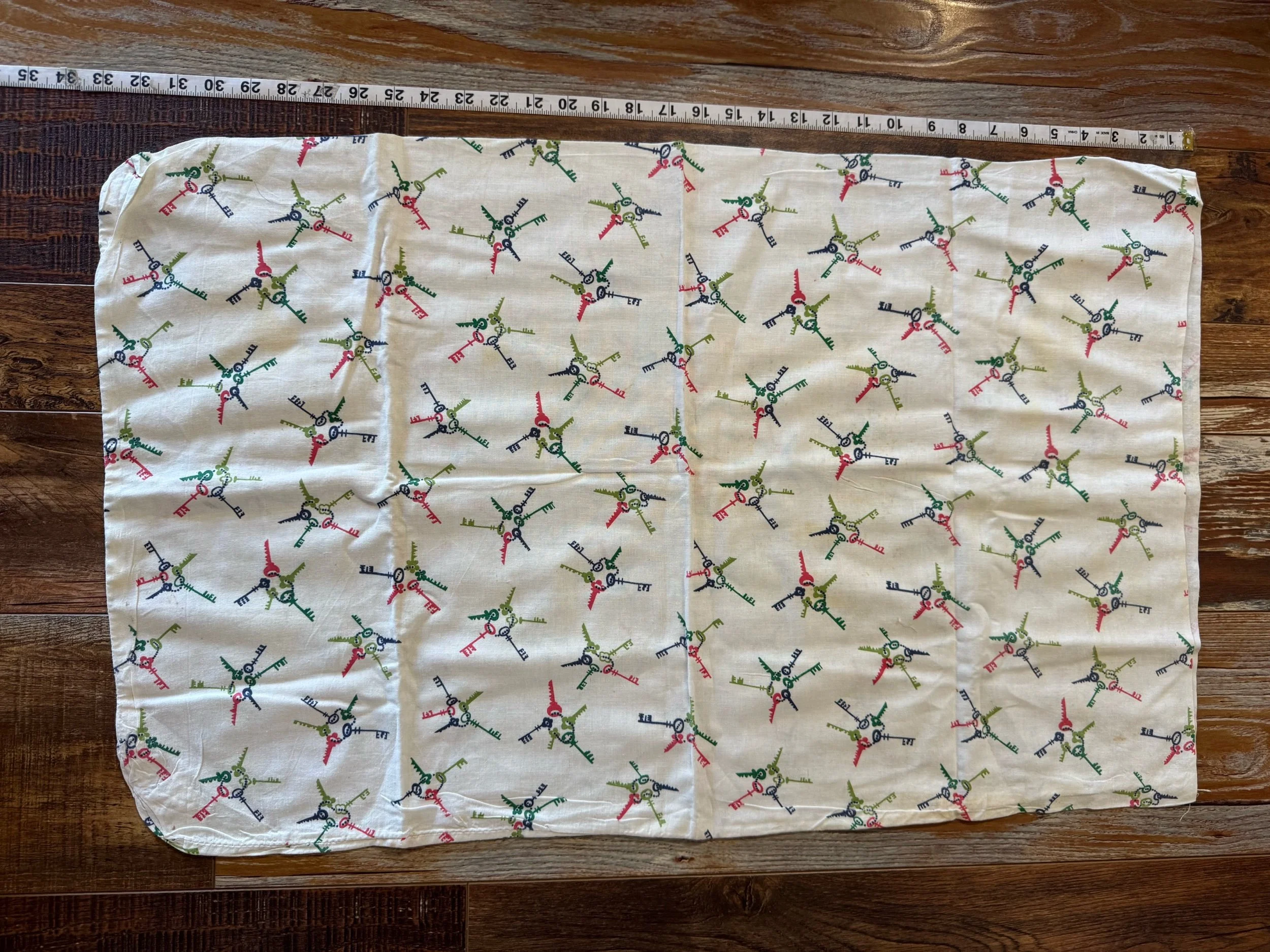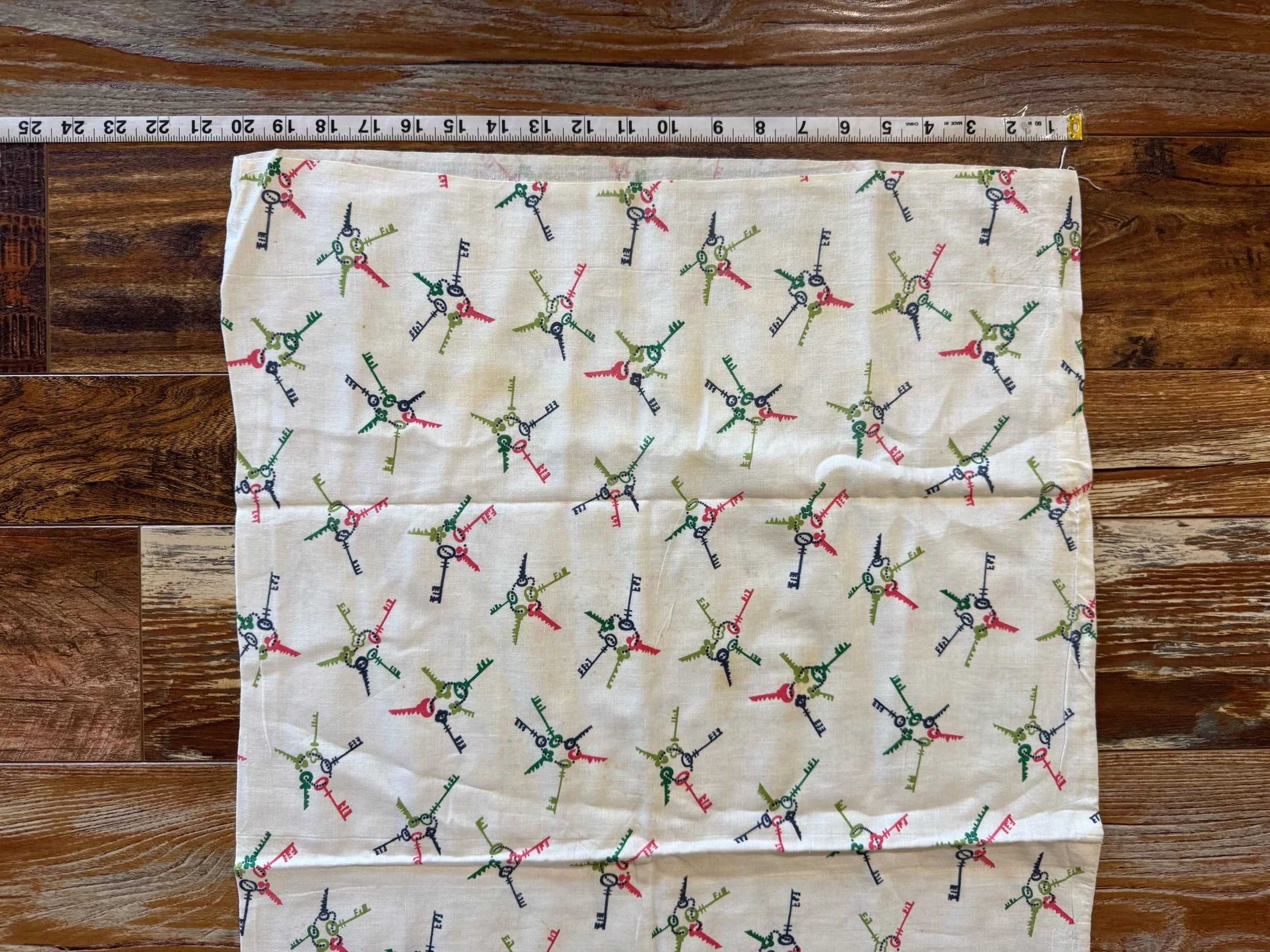 These cotton flour sack measures 20” X 32”. It is great size. This sack is still intact. We love the very unique key ring print on off white ground. This sack is cotton. Overall this sack is in great condition! Wear as expected for a vintage flour sack. This sack has not been washed or spot treated. Please see all pictures before purchasing. Photos are a part of the description/listing.