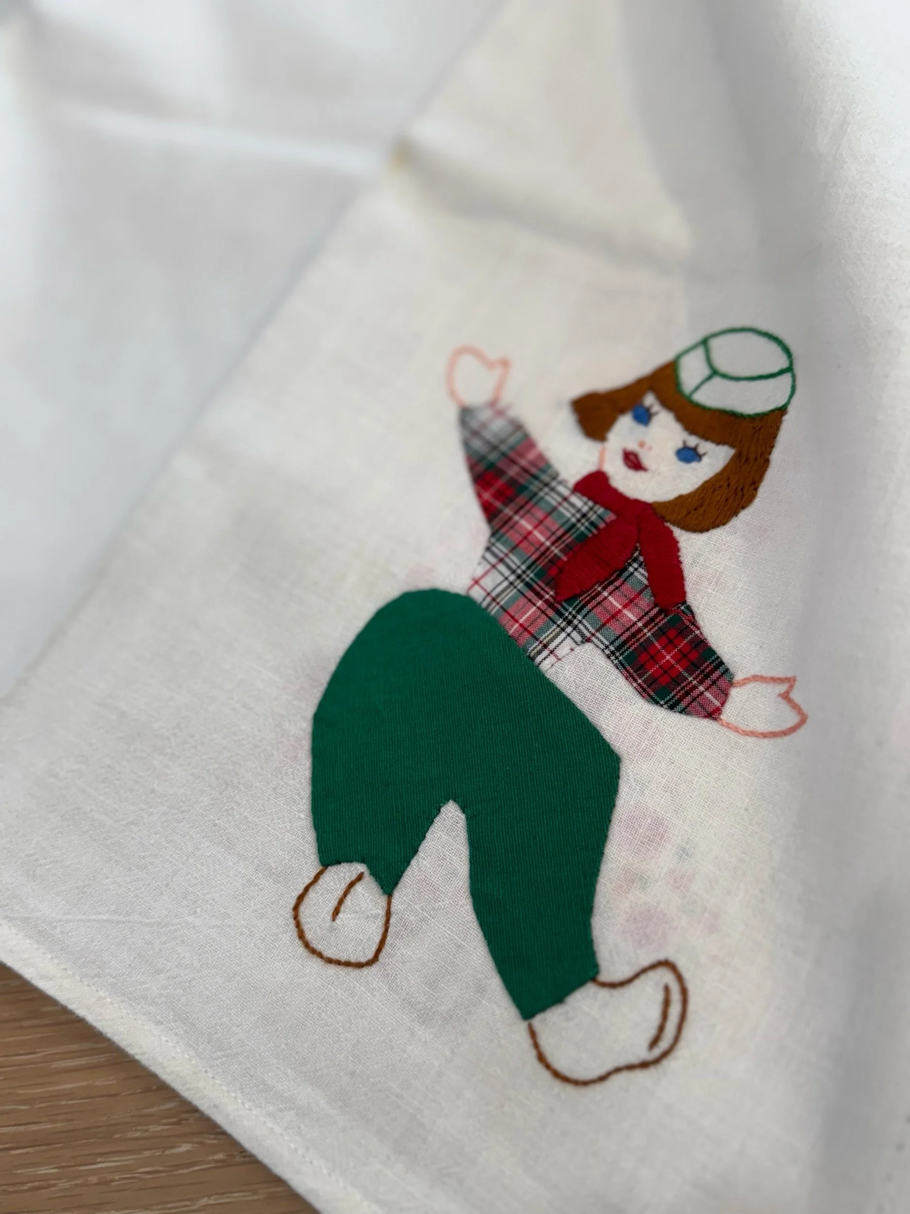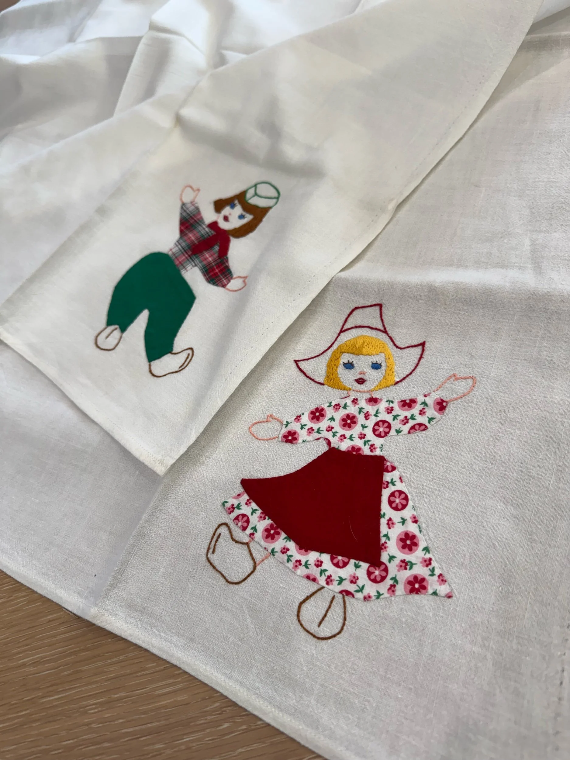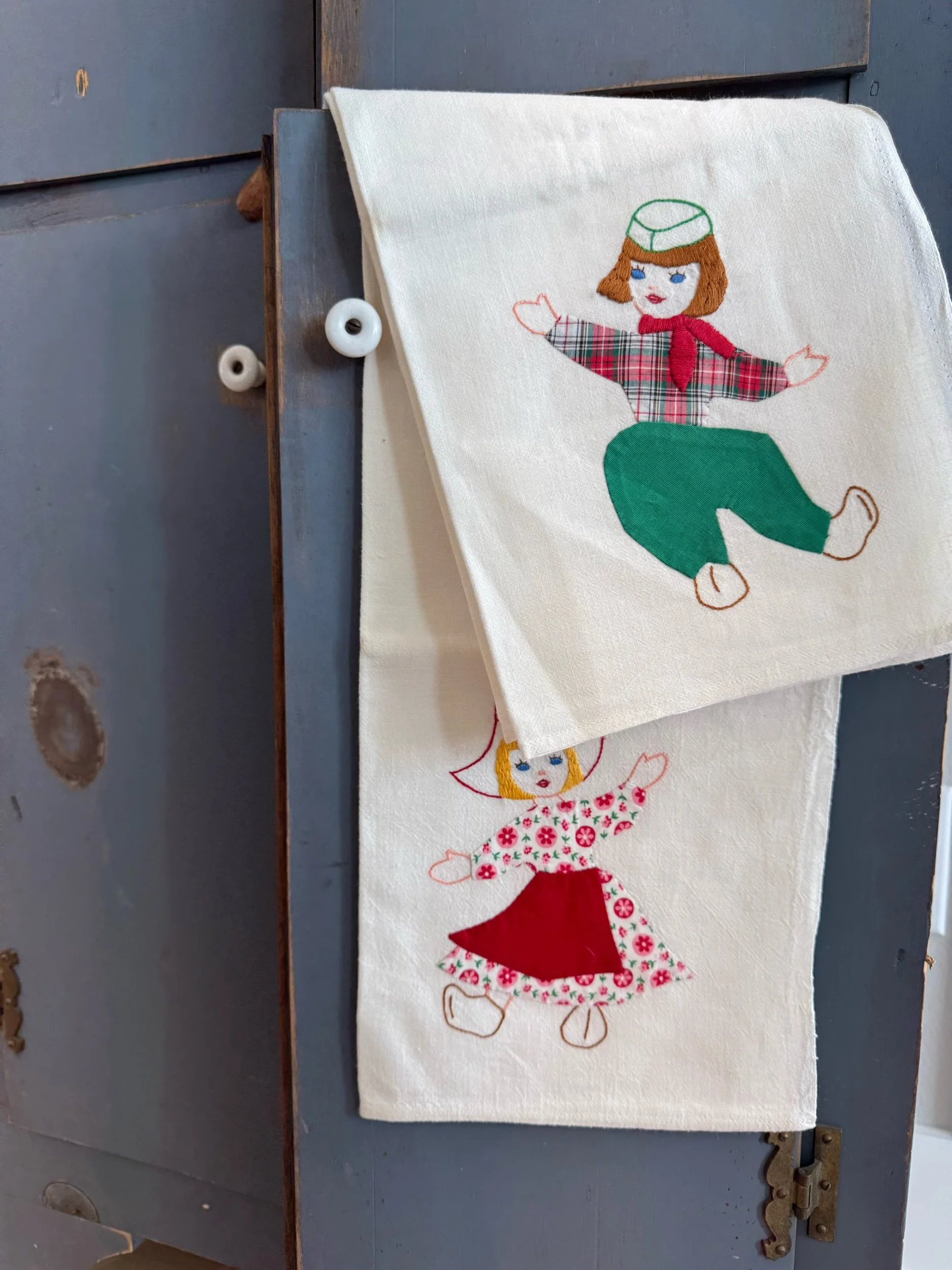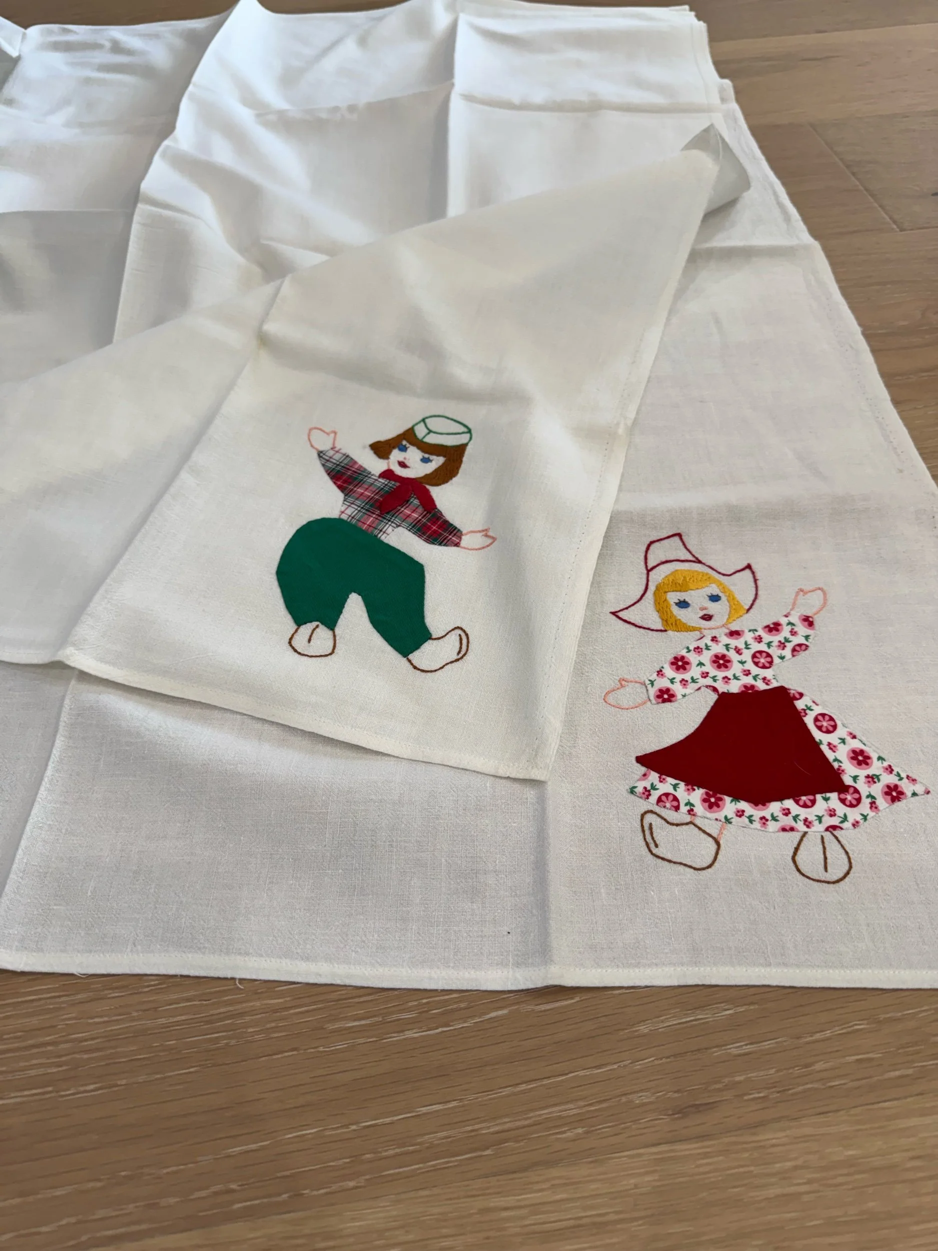 Vintage “Little Dutch Couple" Tea Towels - Qty 2. These tea towels each measure 35 x 34. Each character is in the bottom right corner. The boy towel is in great condition, with the girl towel also being in good condition, with only one little cluster of specs. See photos for reference. We would still consider the set to be in great, vintage condition. They could be used as is, or in a project!