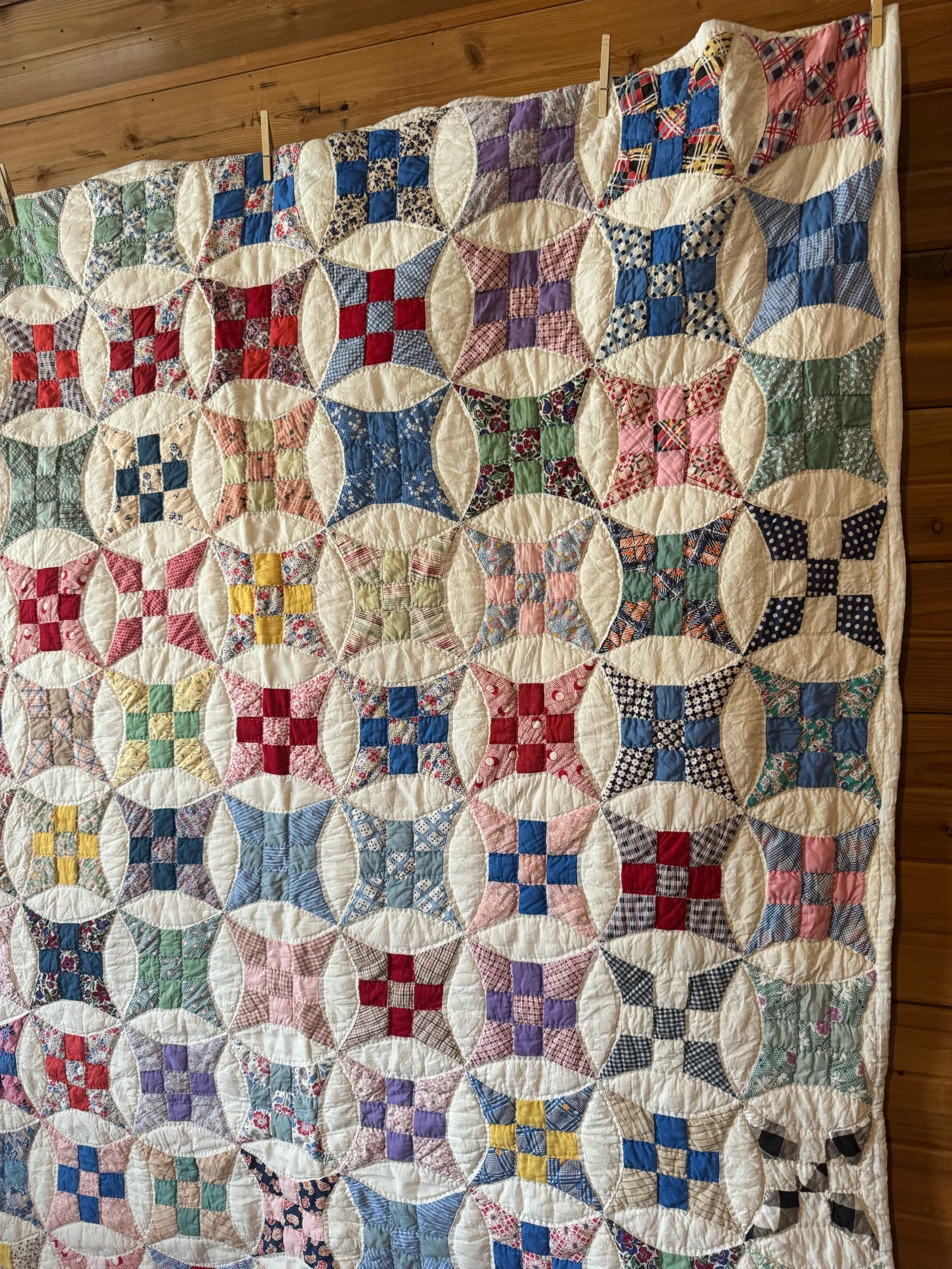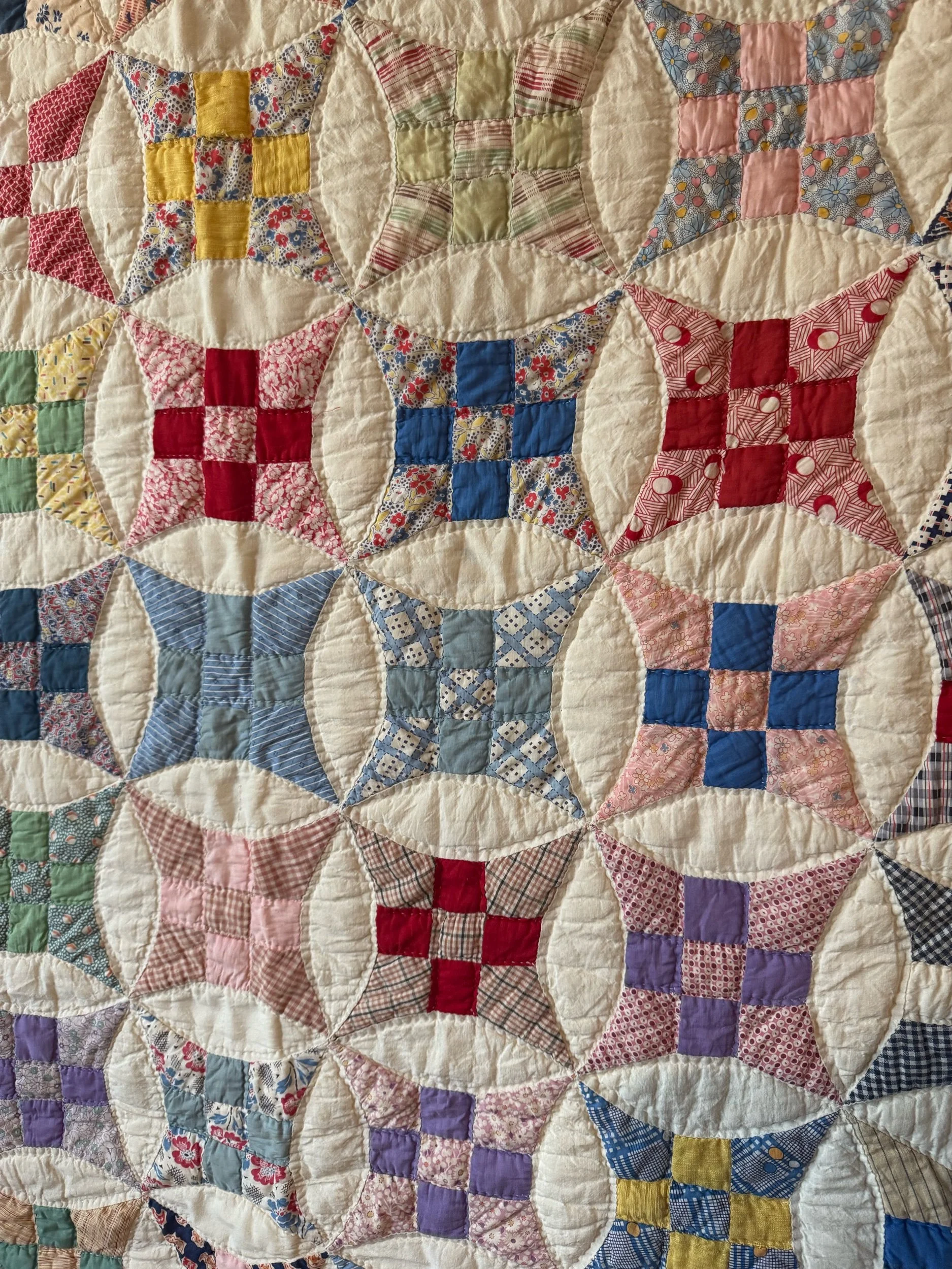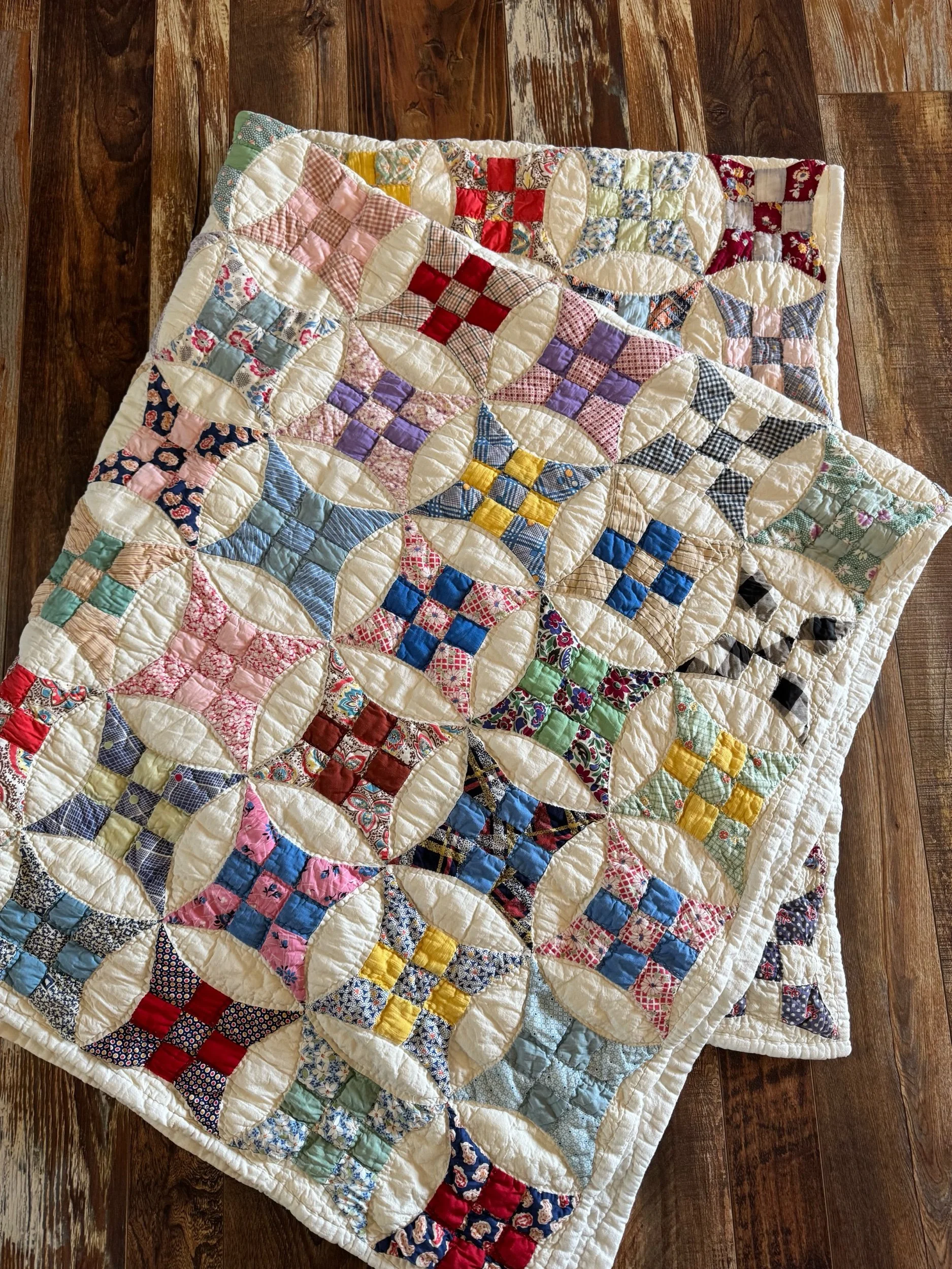 Details: This is what we would call a light to medium weight quilt. There are 120 total stretch 9 blocks. The blocks are a small-scale, the squares are 1.5” and circle diameter is only 8.5”. The background is soft-white, with matching back fabric. The binding is back to front, hand applied. The blocks are made of a wide variety of cotton solids and prints. There are no holes or seam pops. We also found no stains. There is one block with two pieces with petite-shatters. Photographed for reference. This quilt has been carefully washed and air dried. Please view all pictures before buying.
