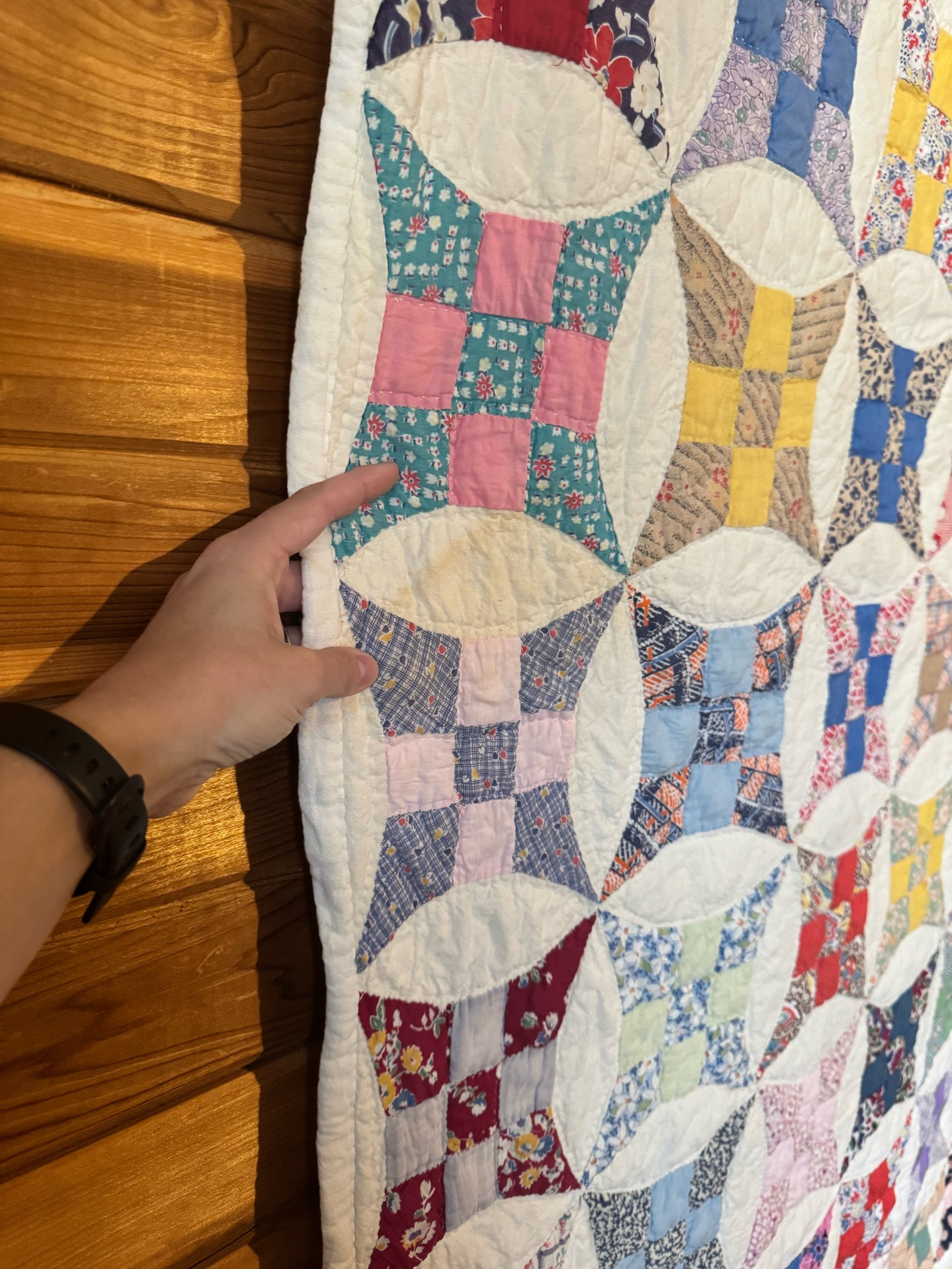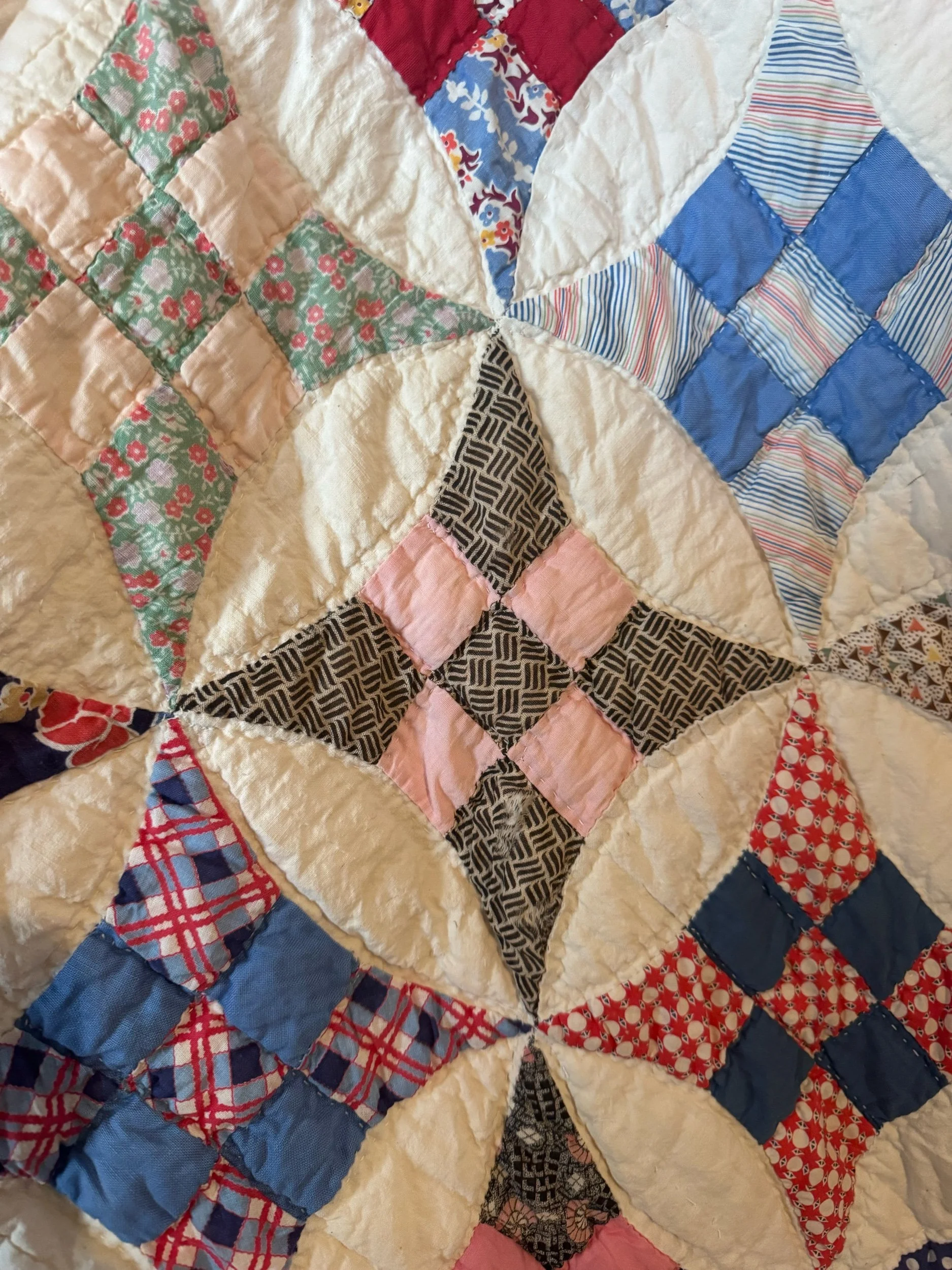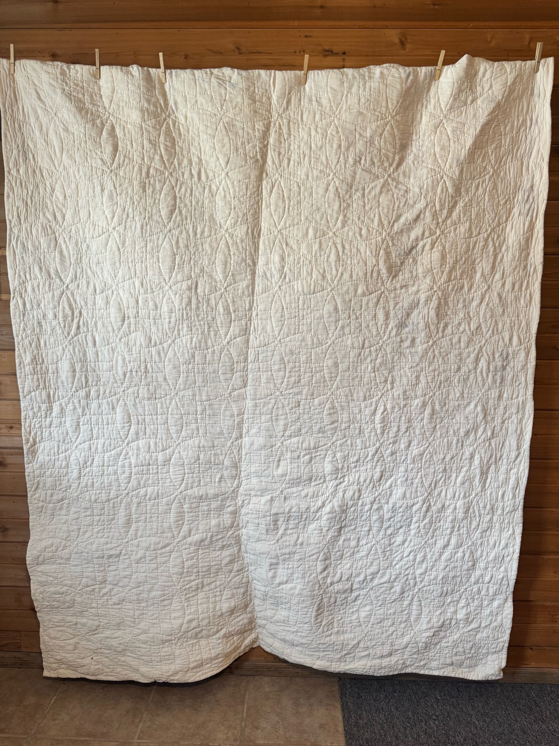 Details: This is what we would call a light to medium weight quilt. There are 120 total stretch 9 blocks. The blocks are a small-scale, the squares are 1.5” and circle diameter is only 8.5”. The background is soft-white, with matching back fabric. The binding is back to front, hand applied. The blocks are made of a wide variety of cotton solids and prints. There are no holes or seam pops. We also found no stains. There is one block with two pieces with petite-shatters. Photographed for reference. This quilt has been carefully washed and air dried. Please view all pictures before buying.