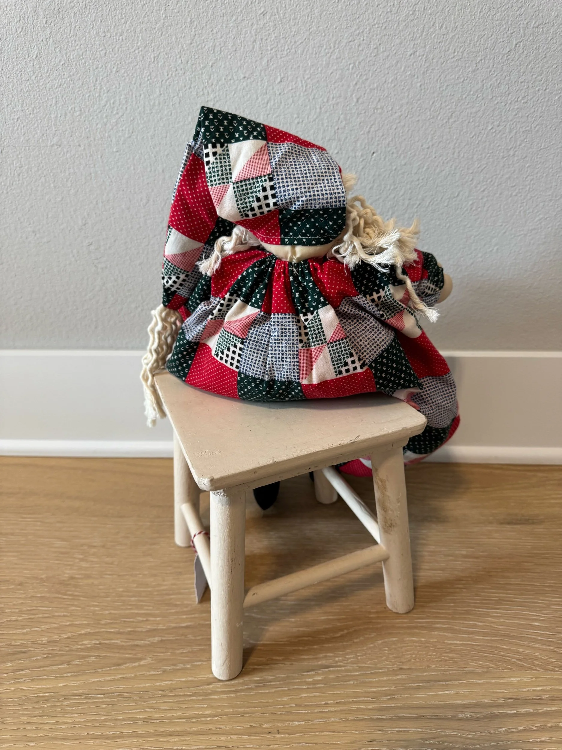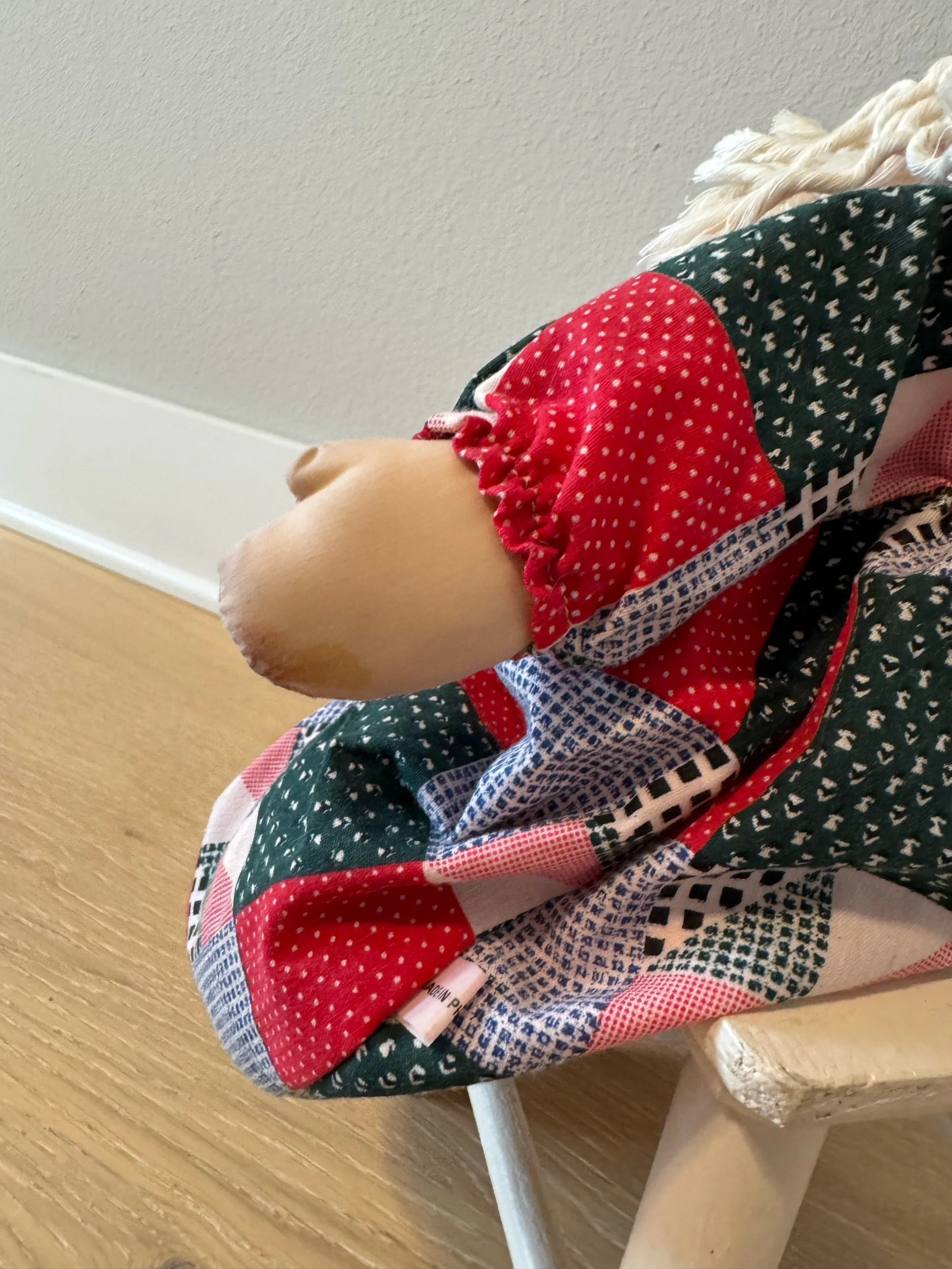 Squares measure 3”’wide. The apron has been finished using solid green binding - machine applied. The aprons squares are machine pieced. Black gingham check waist band and ties. Waist band and ties are 53” long. This vintage apron is in 5 star condition.