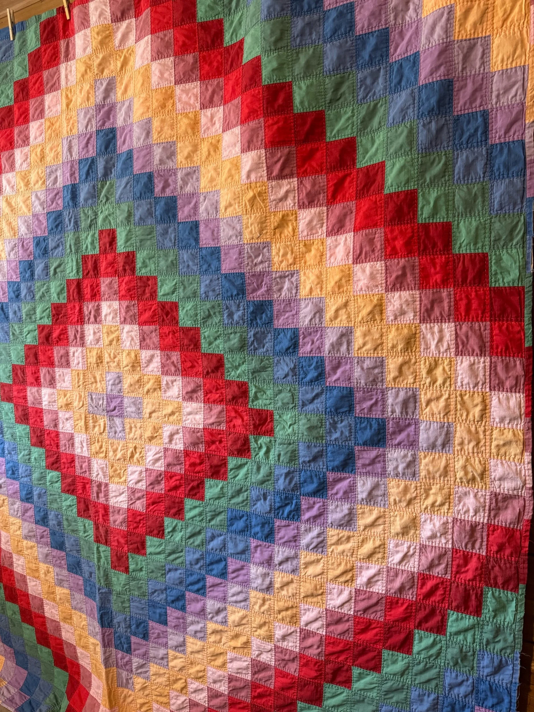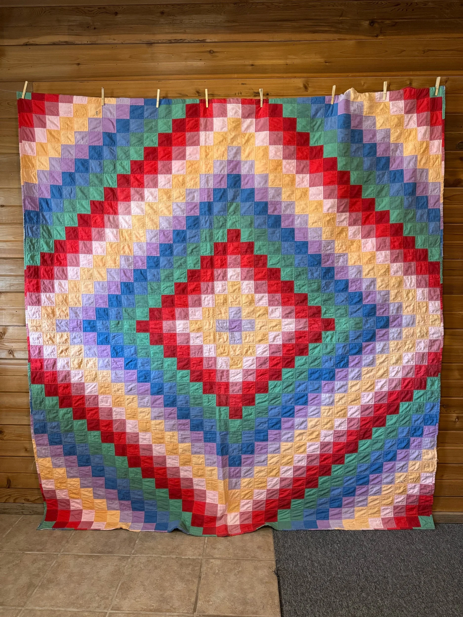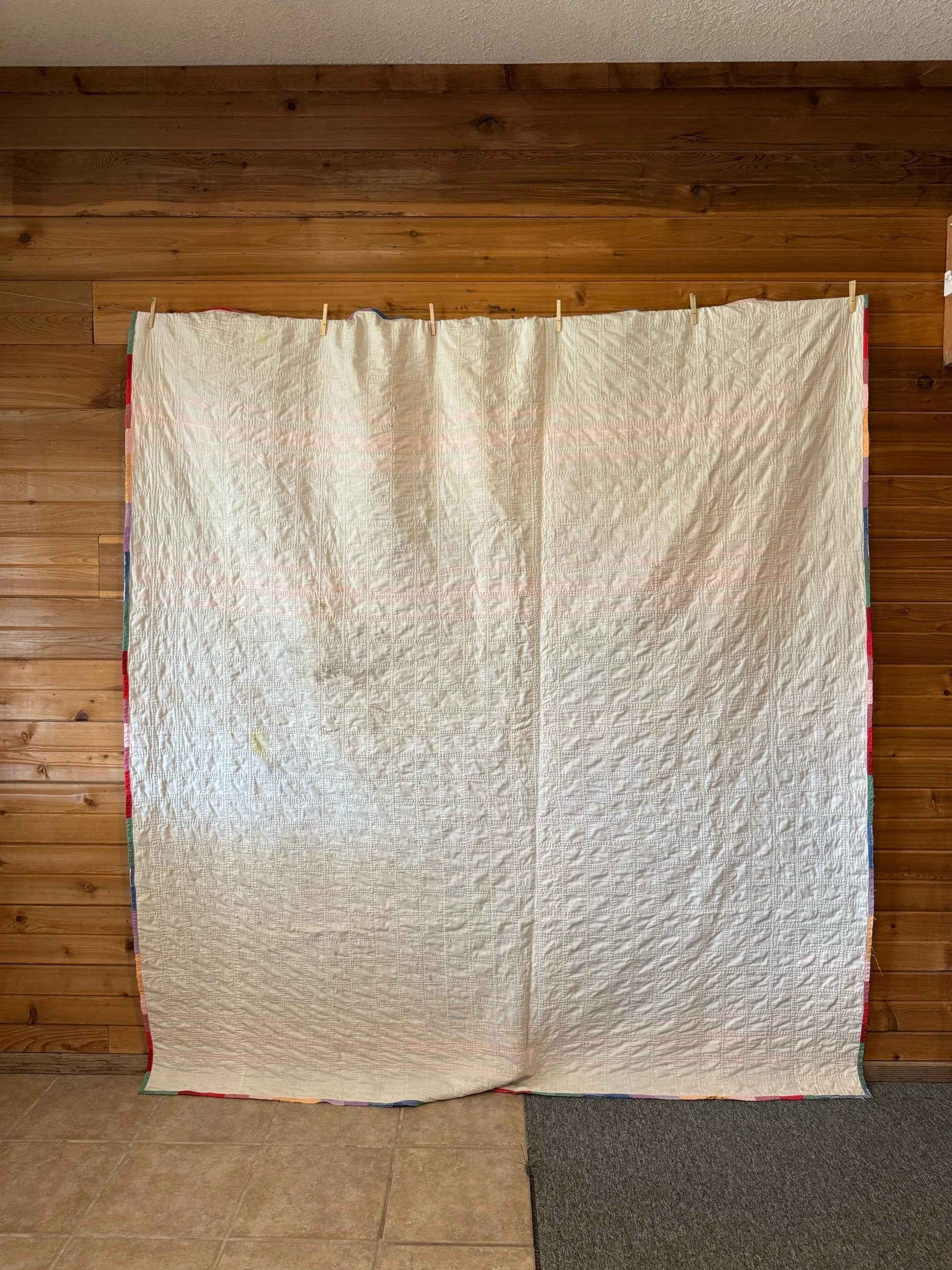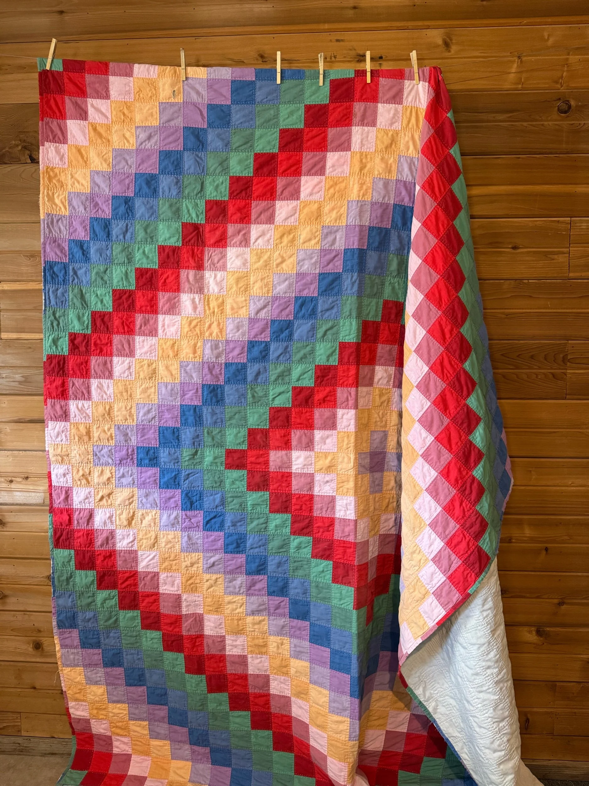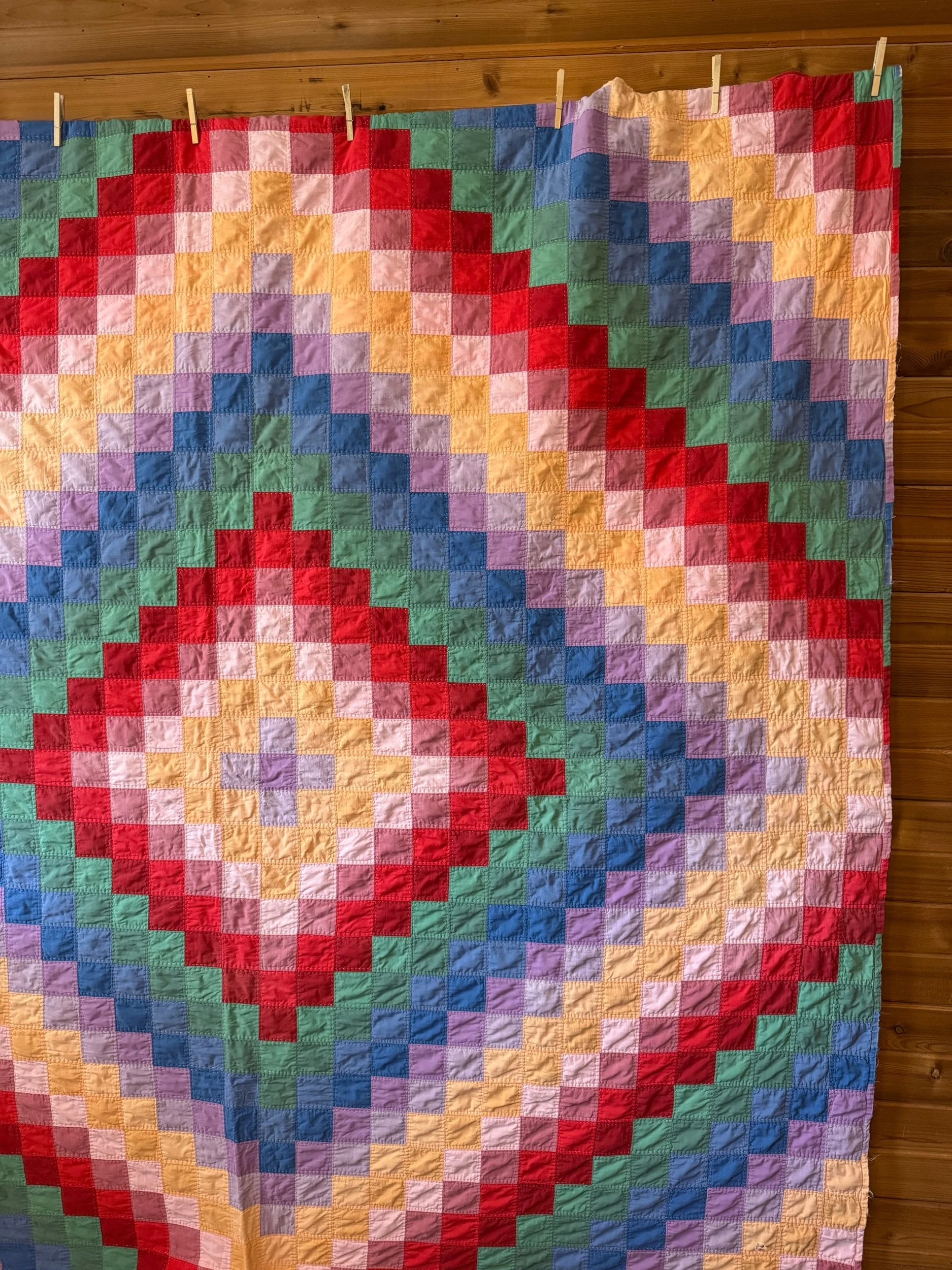 Details: This is what we would call a lightweight quilt. There is no batting shift in the quilt. This design is all muslin cotton. The squares in the design are approximately 2” wide. The squares radiate in a diamond pattern from the center of the quilt. All the fabrics are all solid-colored cotton, in a rainbow of colors. The back fabric is white cotton, and the binding is patchwork in the same rainbow pattern as the quilt. There are three small tears that could be mended, an area of speckling, and wear on the binding. This quilt has been carefully washed and air dried. Please view all pictures before buying. The back has some spotting throughout Overall, this is still a really great quilt and has awesome structure still with minor flaws.