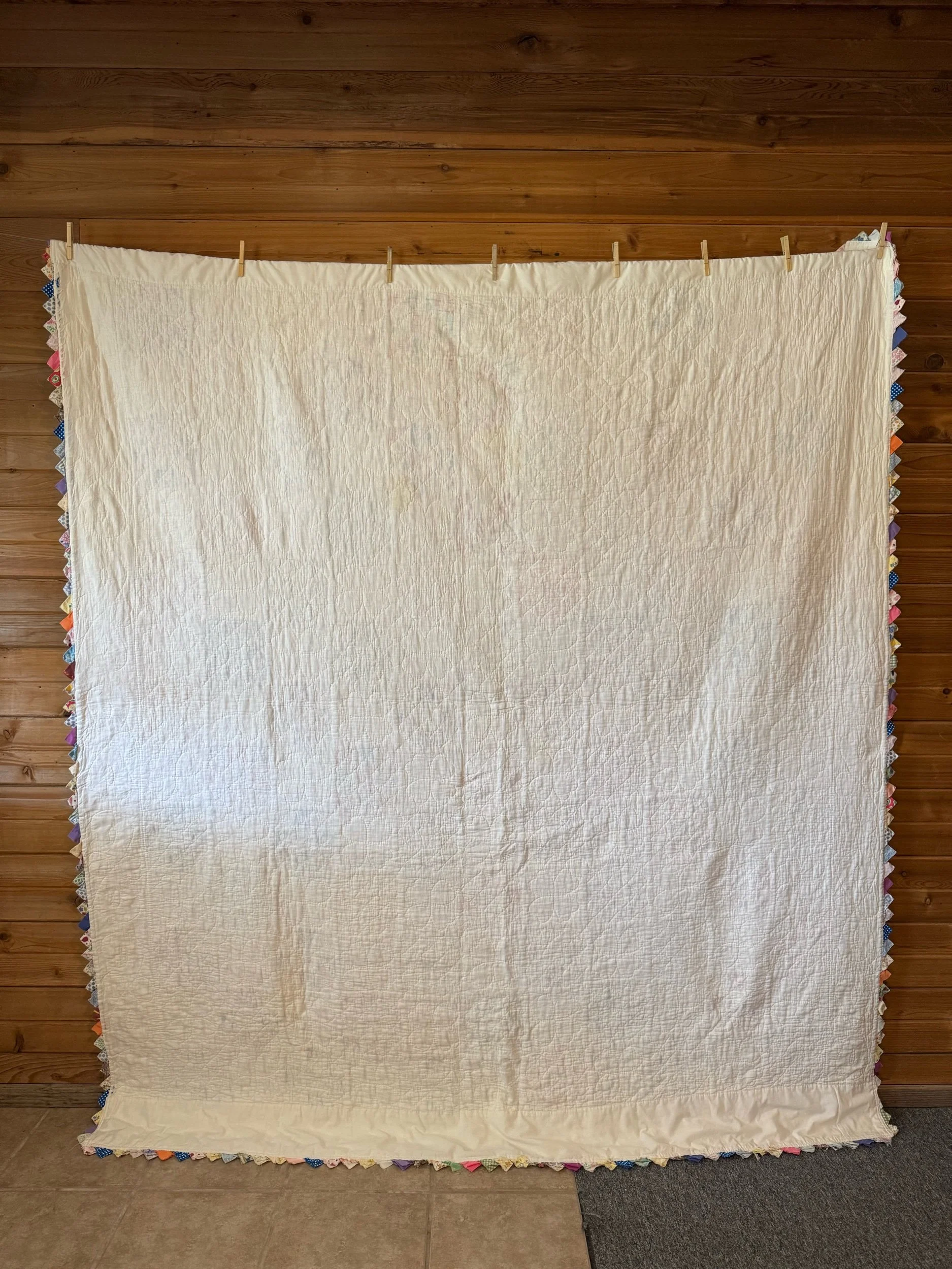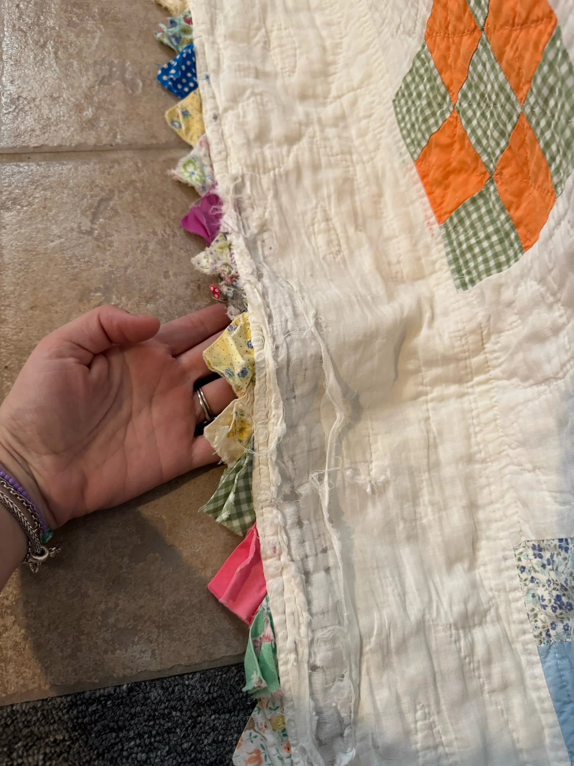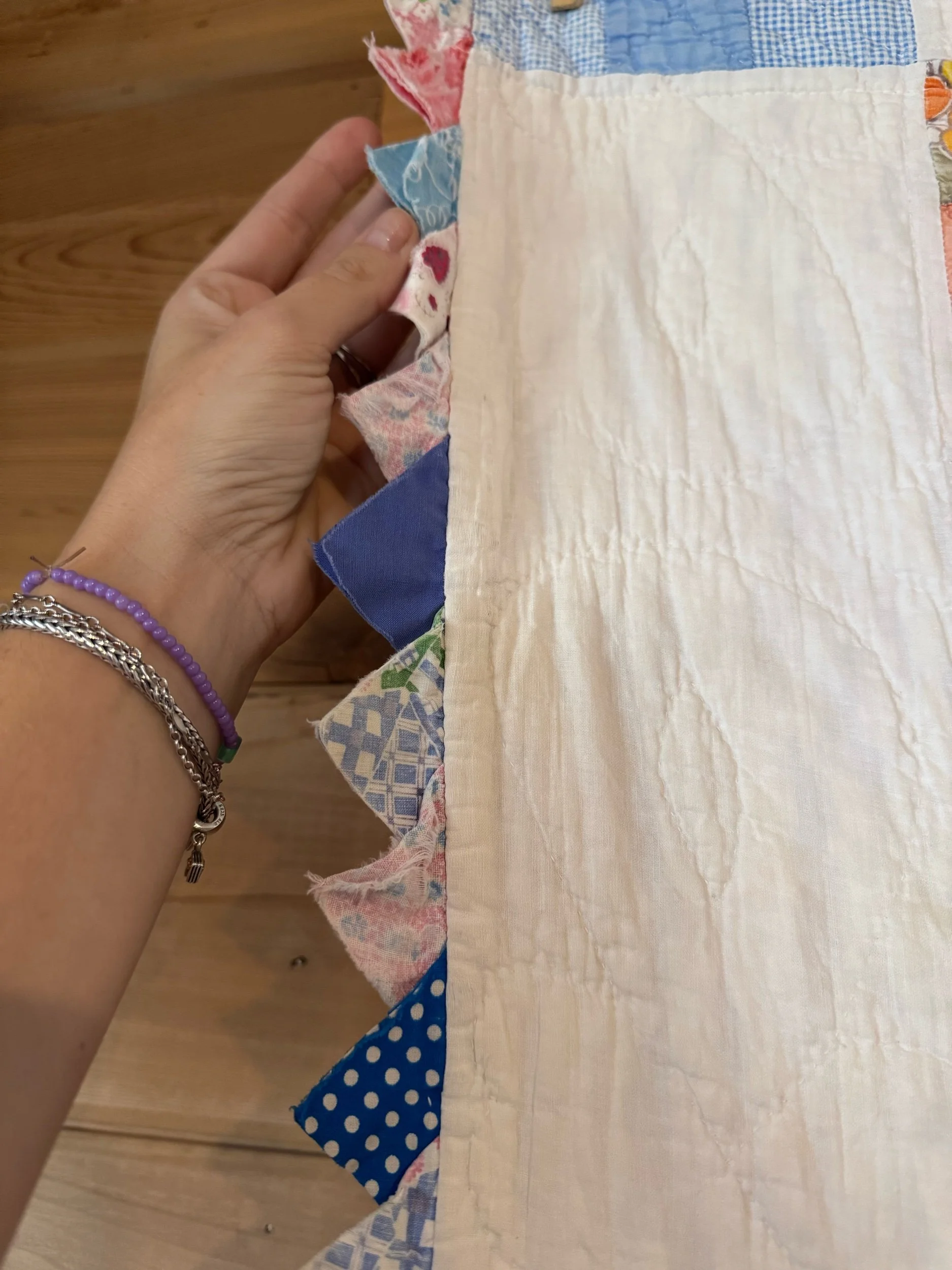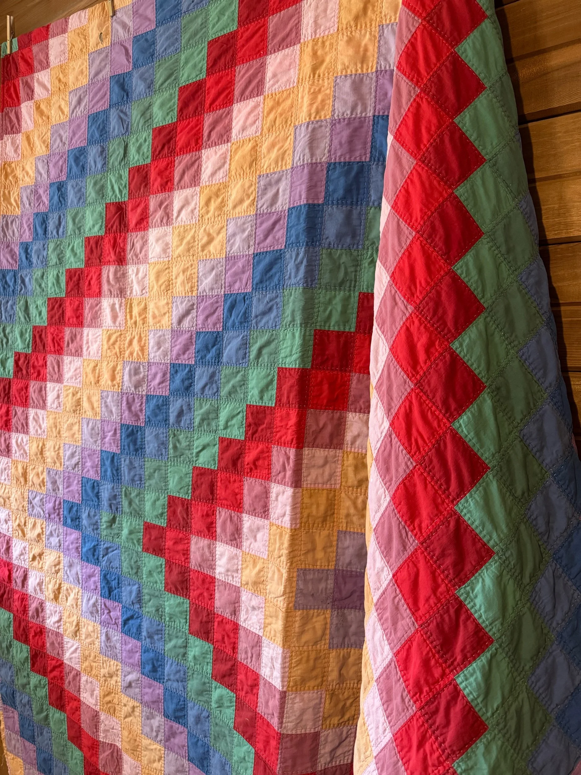 Details: This is what we would call a lightweight quilt. There is no batting shift in the quilt. This design is all muslin cotton. The squares in the design are approximately 2” wide. The squares radiate in a diamond pattern from the center of the quilt. All the fabrics are all solid-colored cotton, in a rainbow of colors. The back fabric is white cotton, and the binding is patchwork in the same rainbow pattern as the quilt. There are three small tears that could be mended, an area of speckling, and wear on the binding. This quilt has been carefully washed and air dried. Please view all pictures before buying. The back has some spotting throughout Overall, this is still a really great quilt and has awesome structure still with minor flaws.