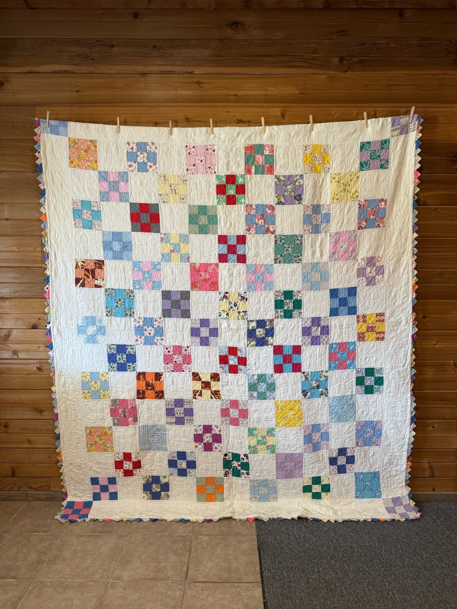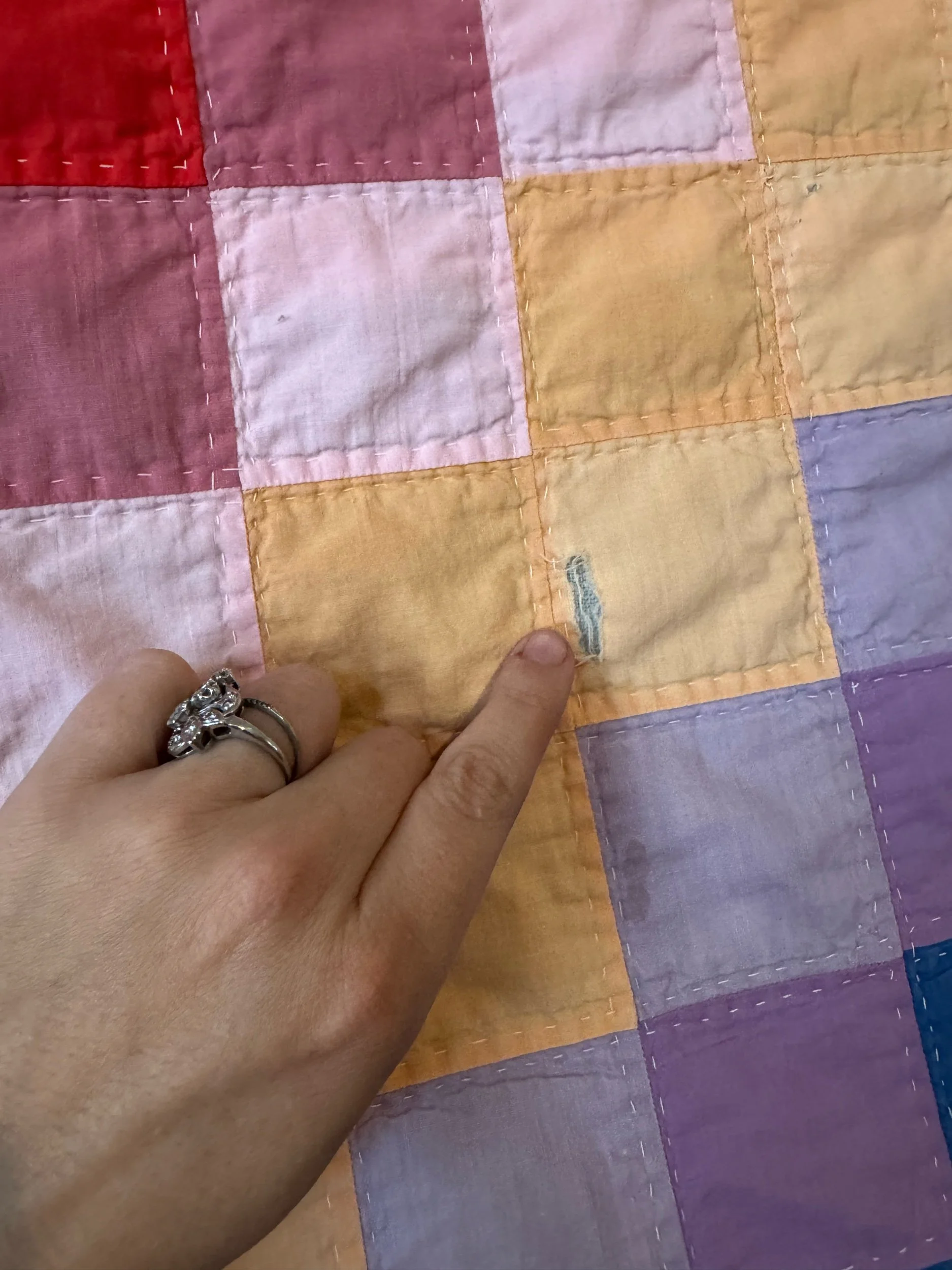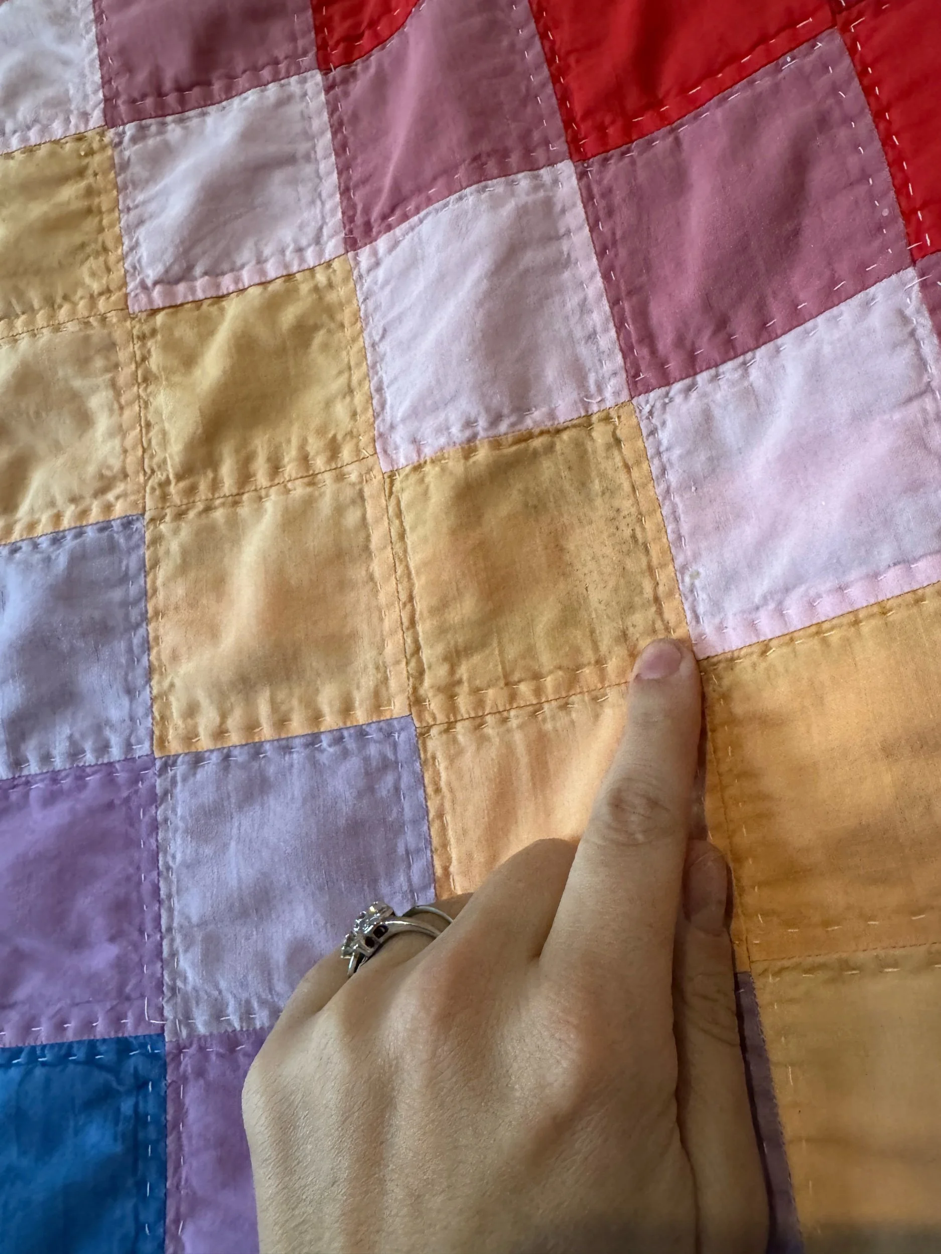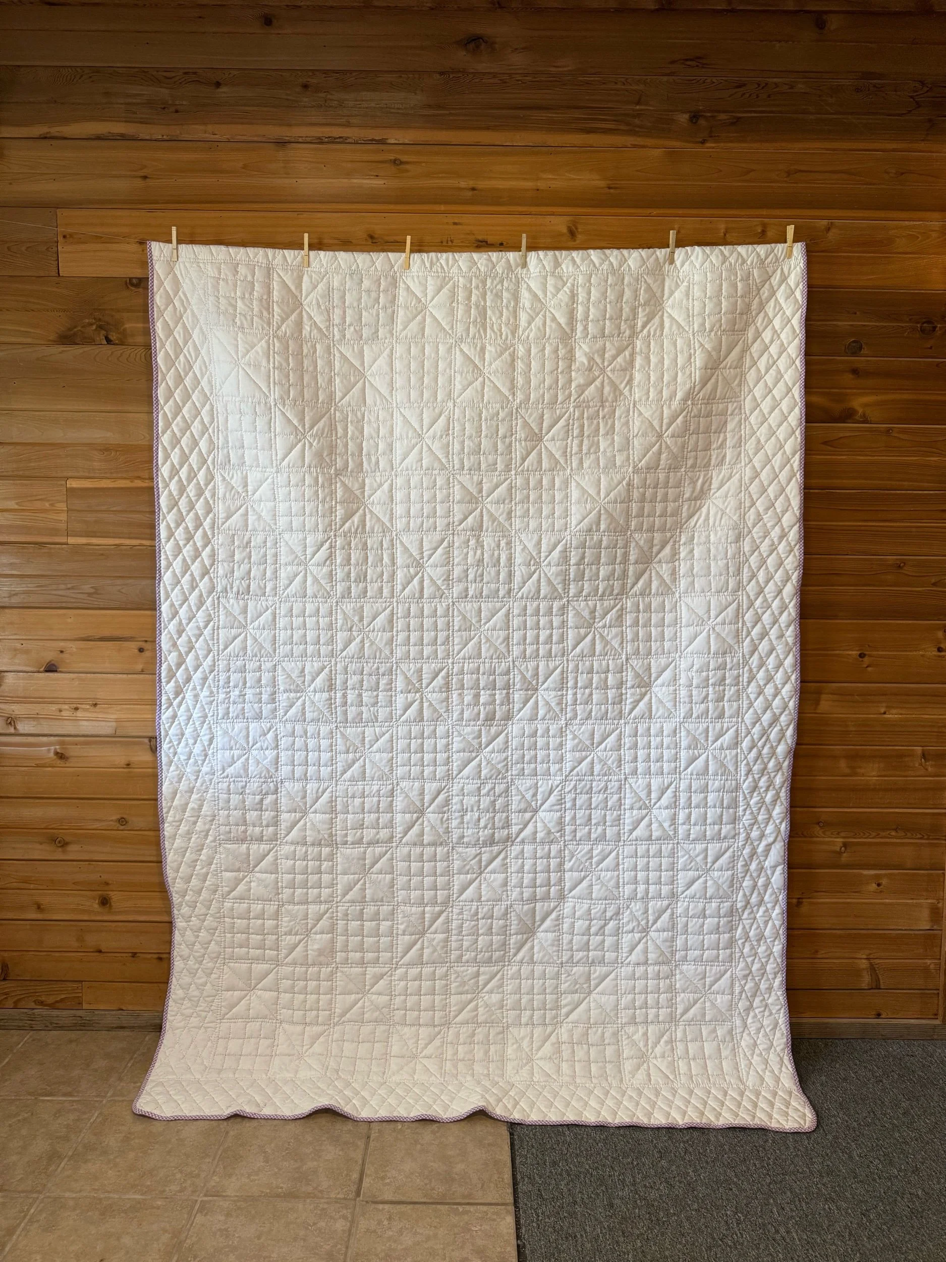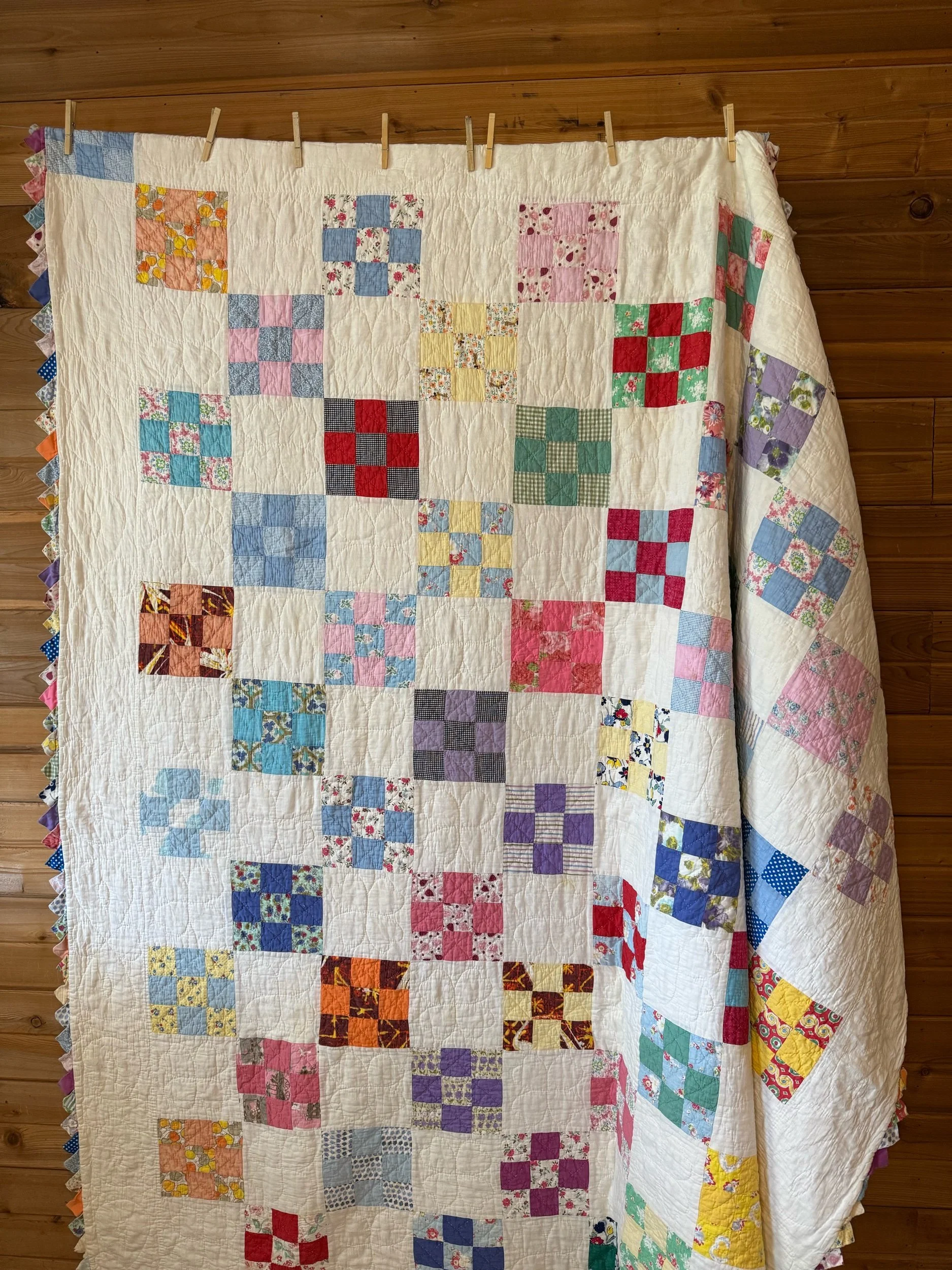 Details: This is what we would call a lightweight quilt. There is no batting shift in the quilt. This design is all muslin cotton. The squares in the design are approximately 2” wide. The squares radiate in a diamond pattern from the center of the quilt. All the fabrics are all solid-colored cotton, in a rainbow of colors. The back fabric is white cotton, and the binding is patchwork in the same rainbow pattern as the quilt. There are three small tears that could be mended, an area of speckling, and wear on the binding. This quilt has been carefully washed and air dried. Please view all pictures before buying. The back has some spotting throughout Overall, this is still a really great quilt and has awesome structure still with minor flaws.