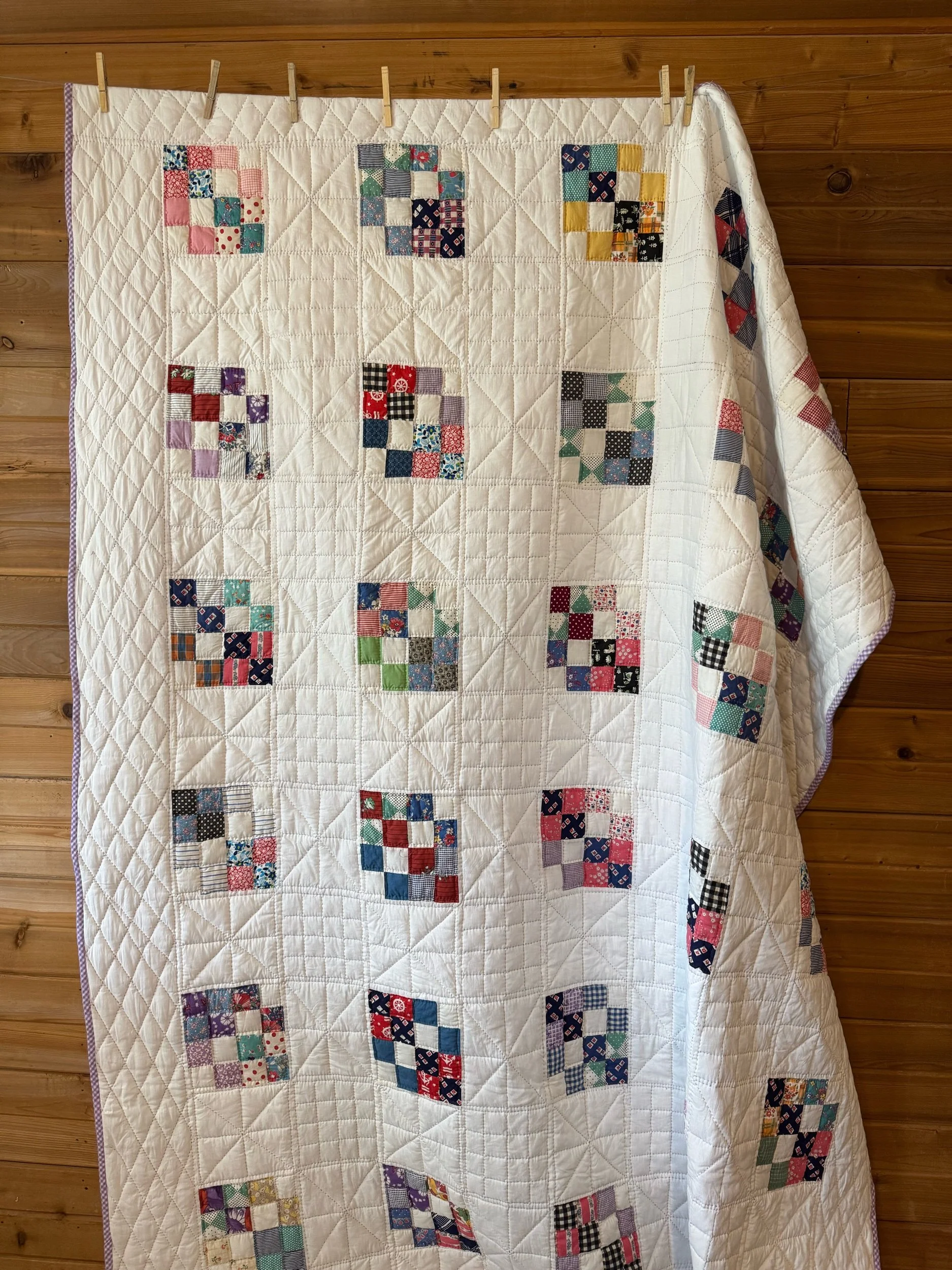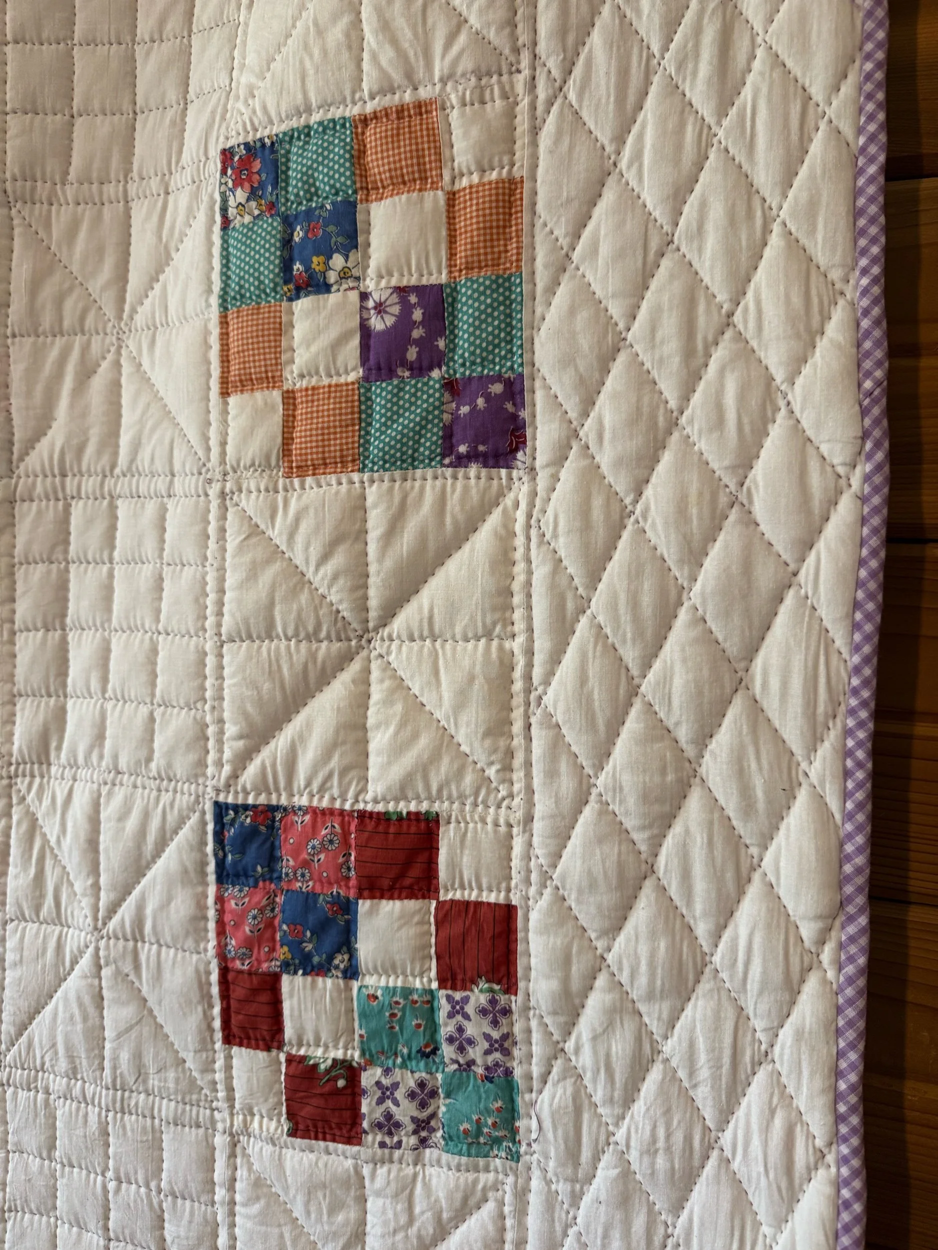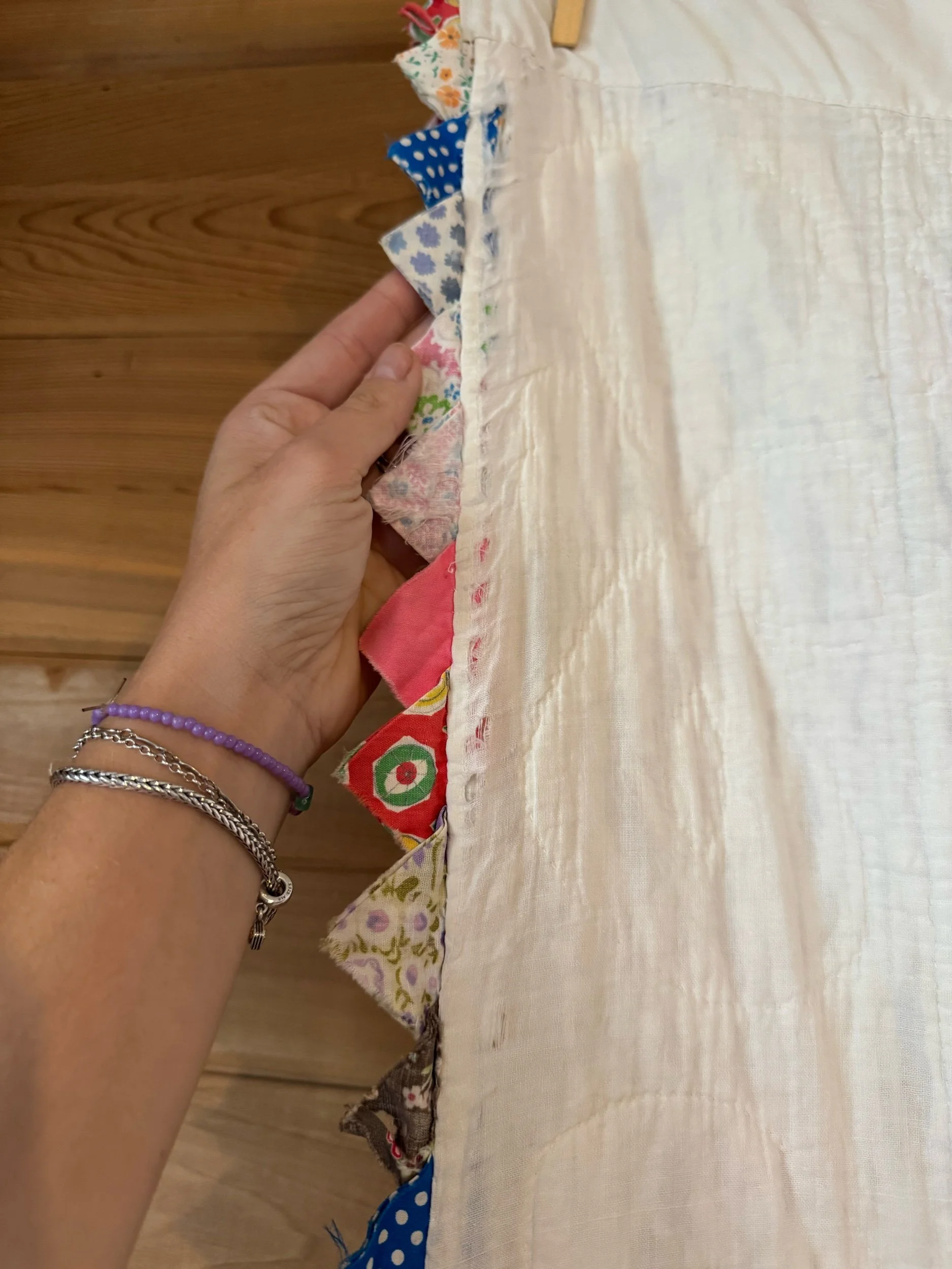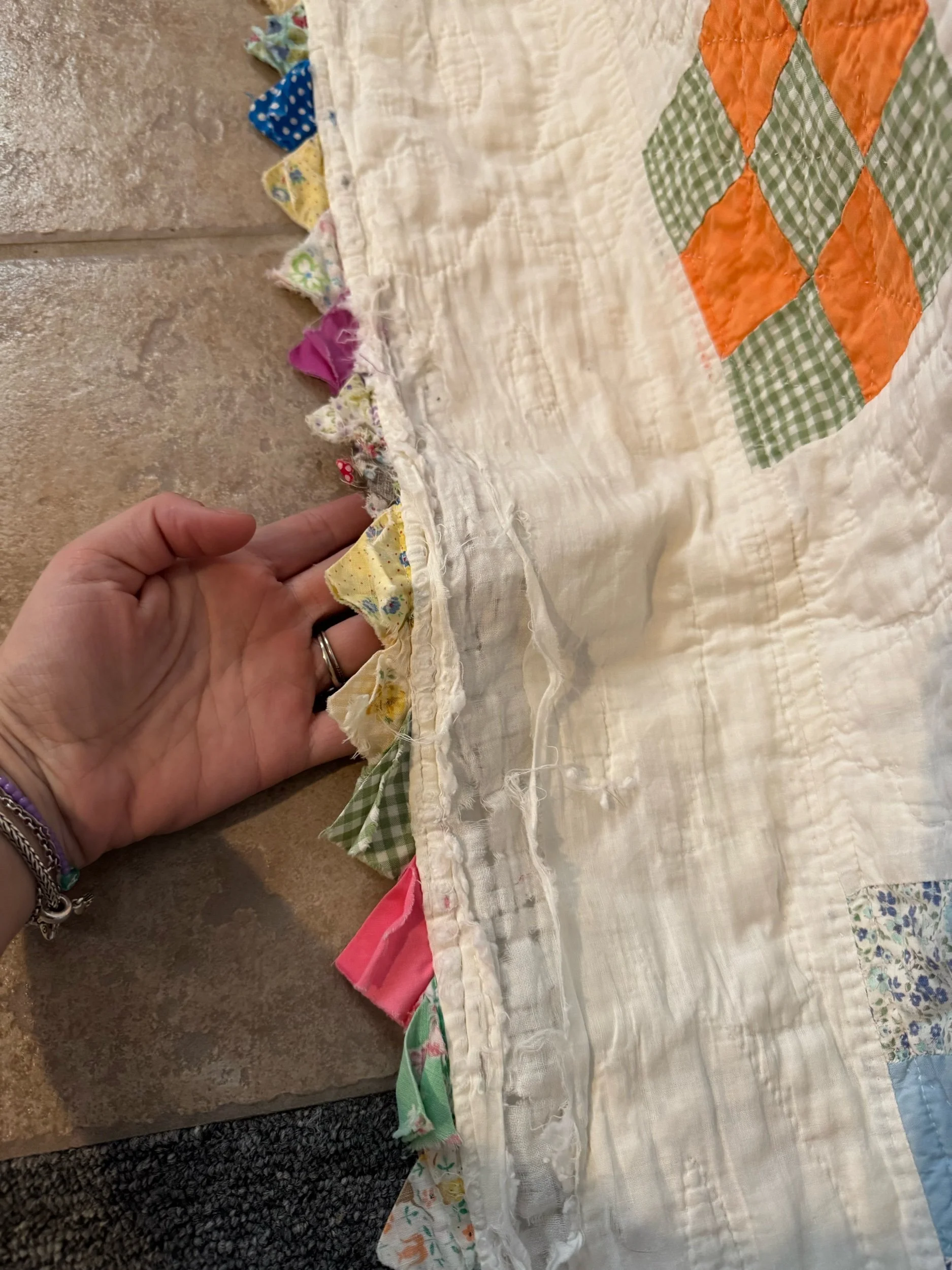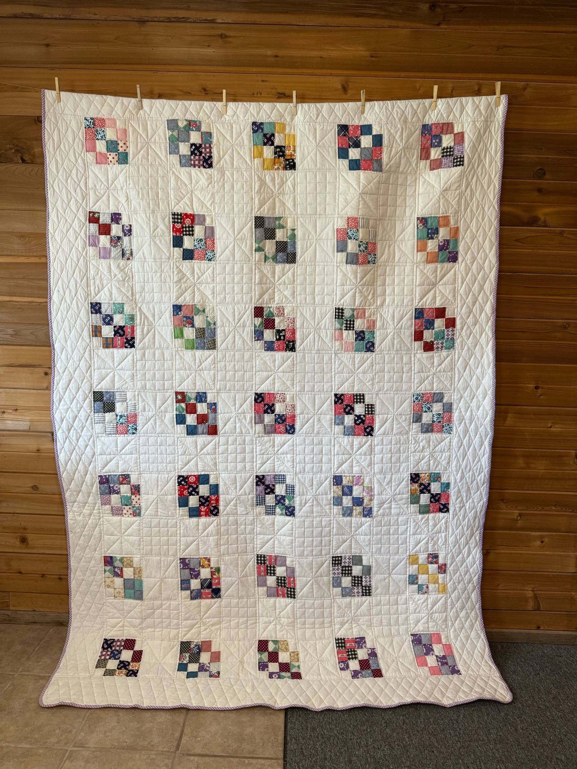 Details: This is what we would call a lightweight quilt. There is no batting shift in the quilt. This design is all muslin cotton. The squares in the design are approximately 2” wide. The squares radiate in a diamond pattern from the center of the quilt. All the fabrics are all solid-colored cotton, in a rainbow of colors. The back fabric is white cotton, and the binding is patchwork in the same rainbow pattern as the quilt. There are three small tears that could be mended, an area of speckling, and wear on the binding. This quilt has been carefully washed and air dried. Please view all pictures before buying. The back has some spotting throughout Overall, this is still a really great quilt and has awesome structure still with minor flaws.