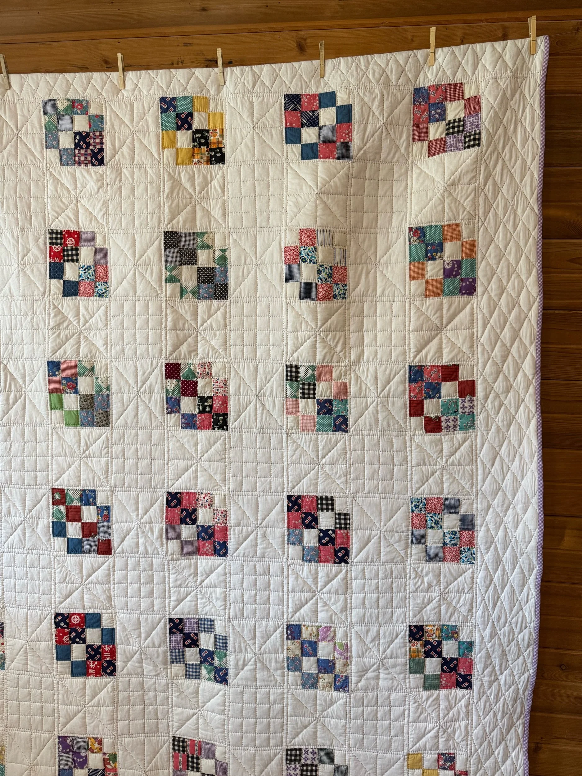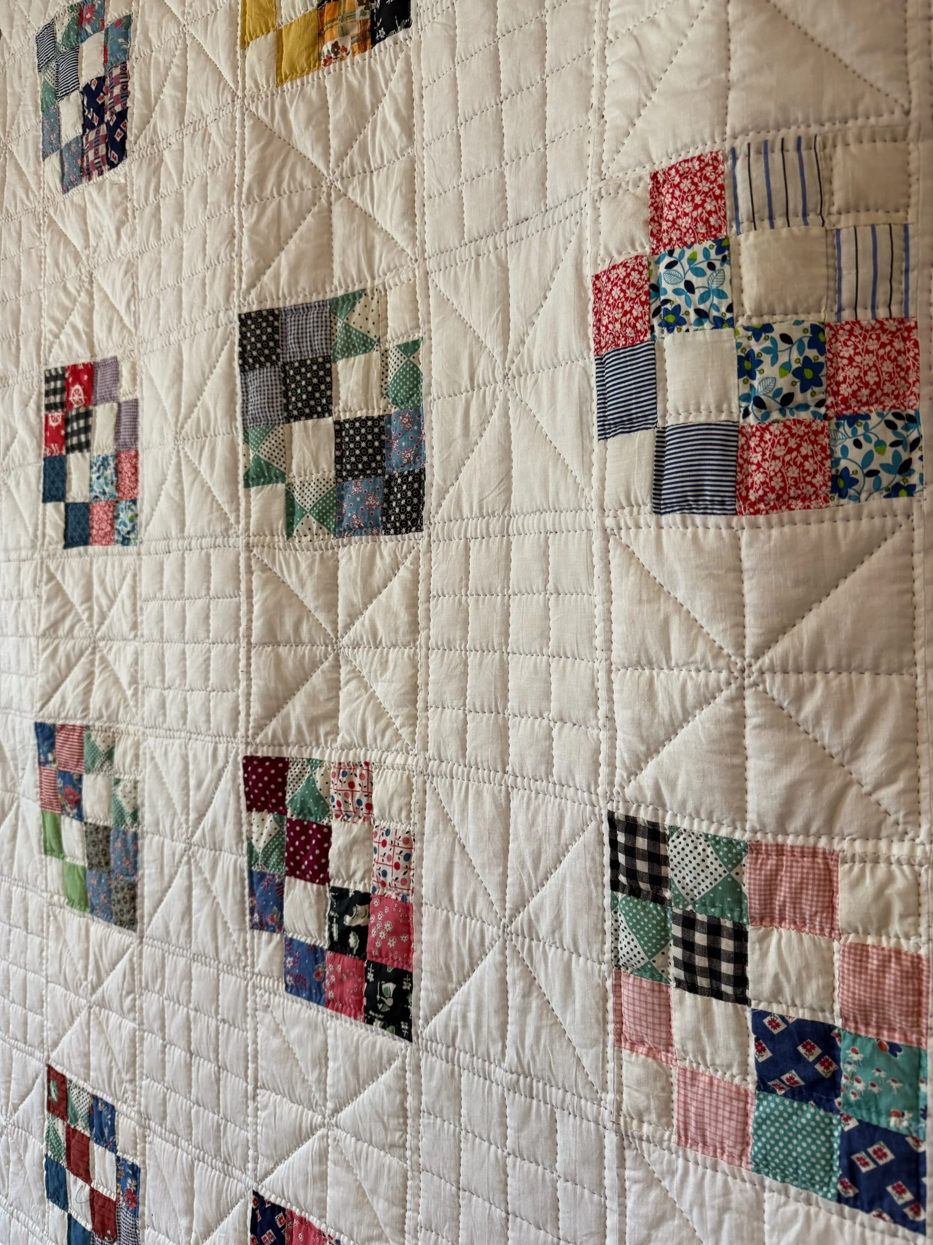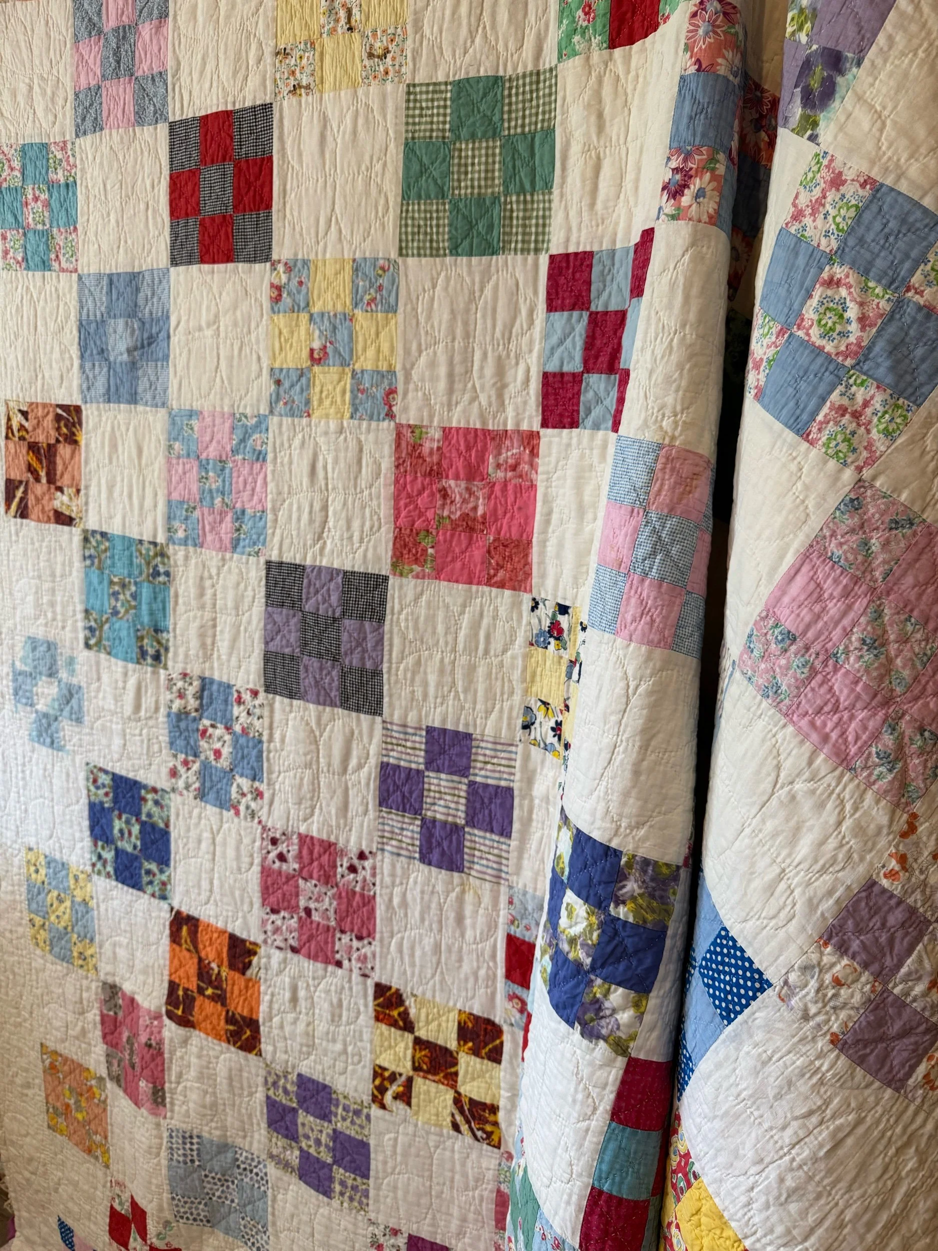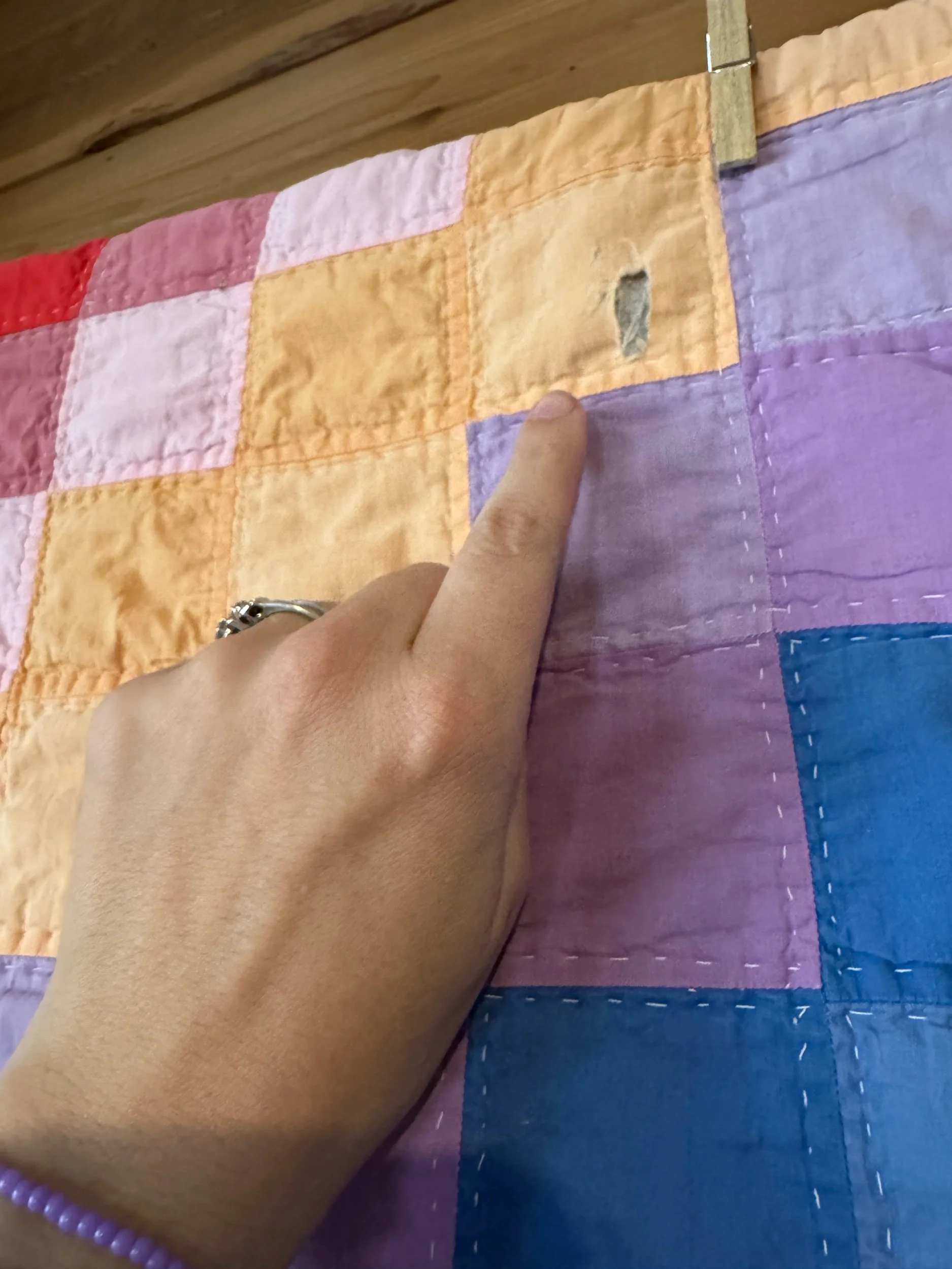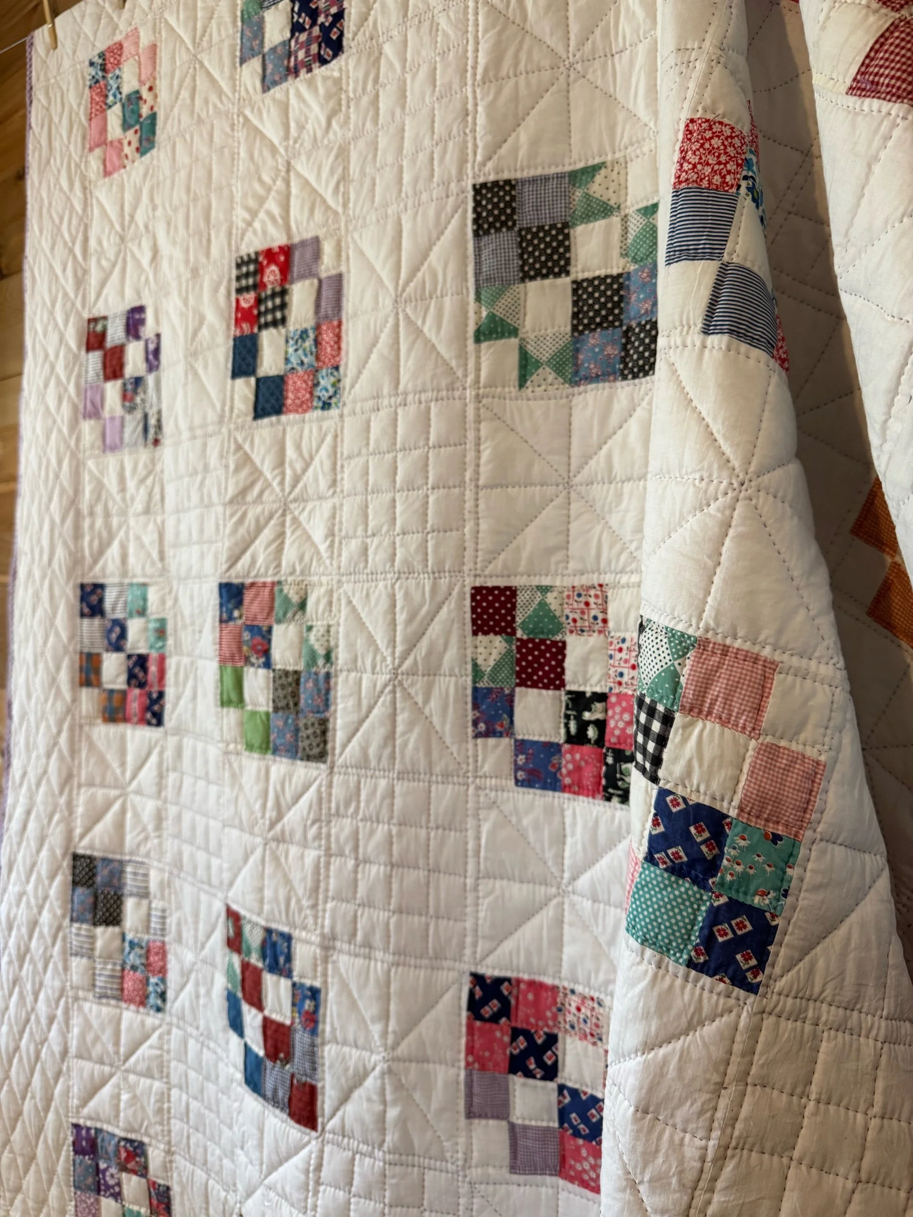 Details: This is what we would call a lightweight quilt. There is no batting shift in the quilt. This design is all muslin cotton. The squares in the design are approximately 2” wide. The squares radiate in a diamond pattern from the center of the quilt. All the fabrics are all solid-colored cotton, in a rainbow of colors. The back fabric is white cotton, and the binding is patchwork in the same rainbow pattern as the quilt. There are three small tears that could be mended, an area of speckling, and wear on the binding. This quilt has been carefully washed and air dried. Please view all pictures before buying. The back has some spotting throughout Overall, this is still a really great quilt and has awesome structure still with minor flaws.