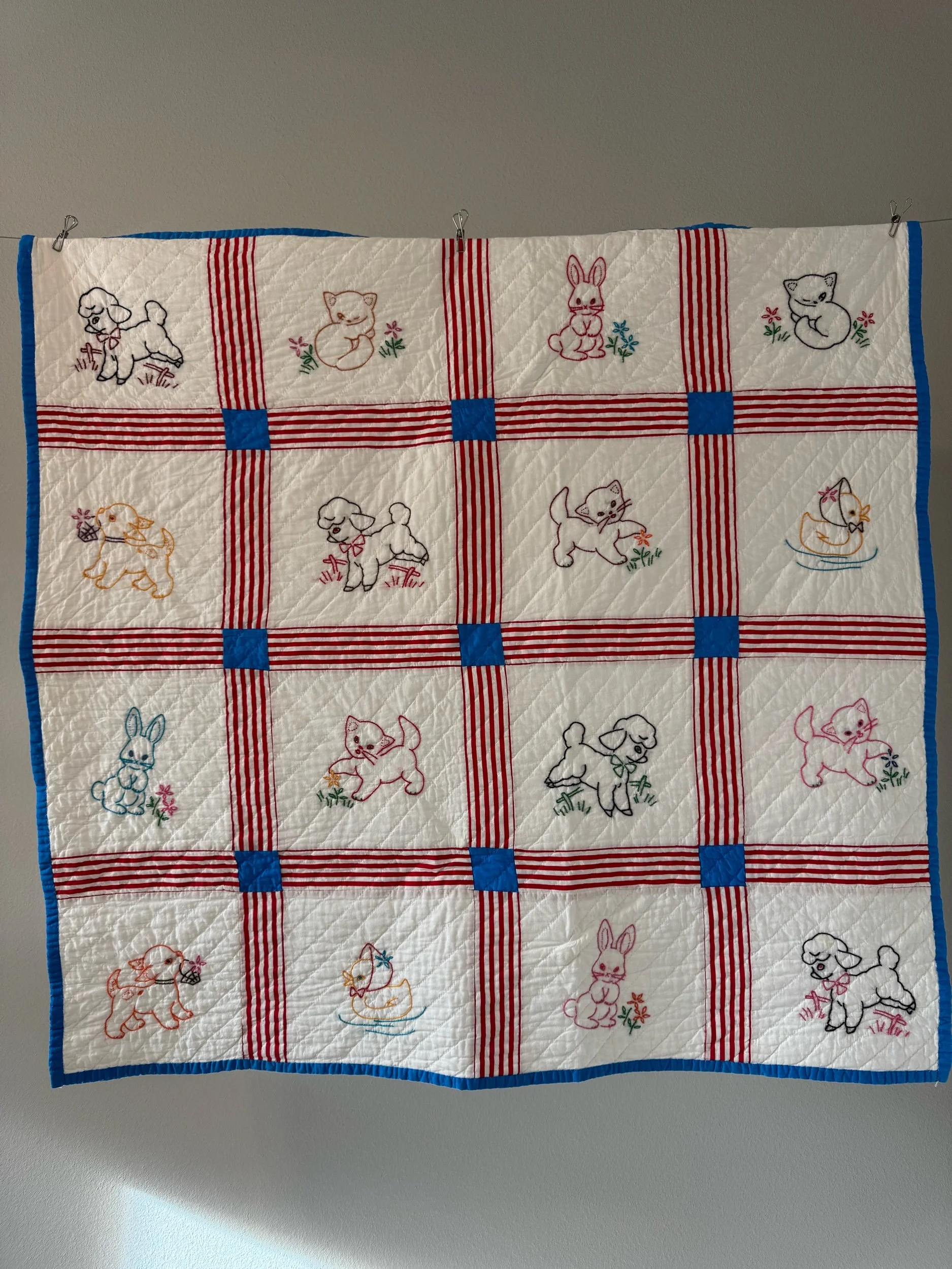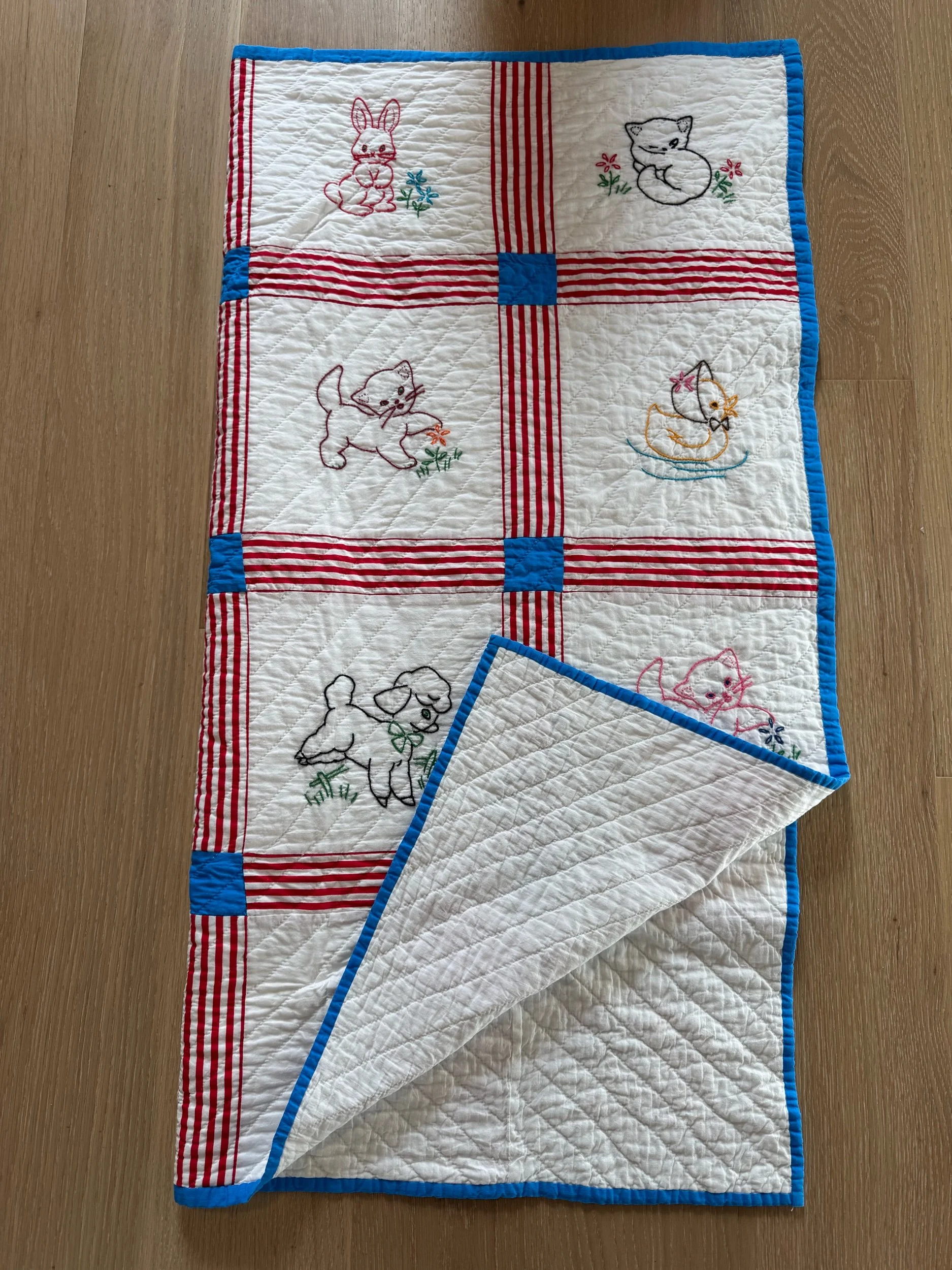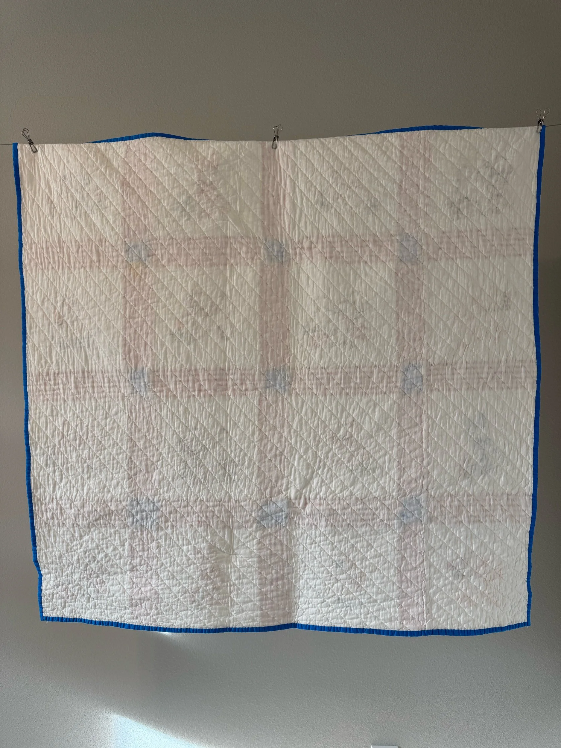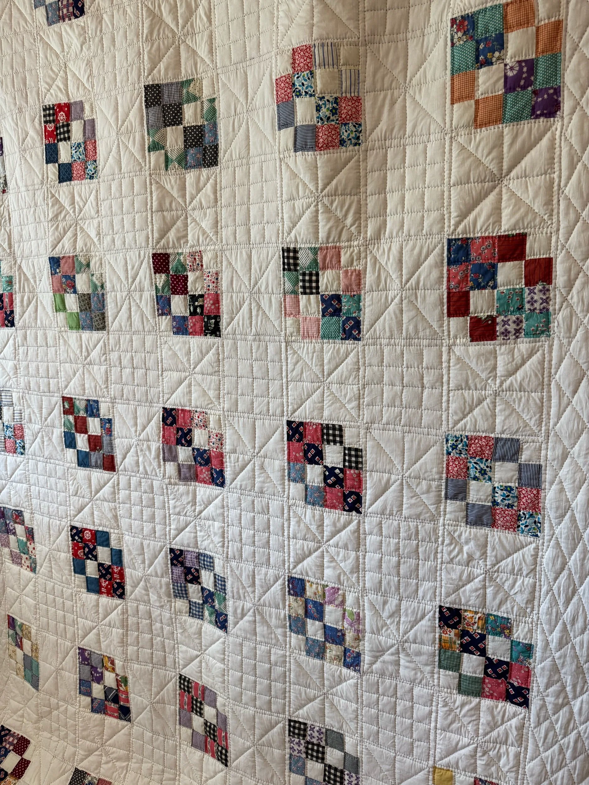 Details: This is what we would call a lightweight quilt. There is no batting shift in the quilt. This design is all muslin cotton. The squares in the design are approximately 2” wide. The squares radiate in a diamond pattern from the center of the quilt. All the fabrics are all solid-colored cotton, in a rainbow of colors. The back fabric is white cotton, and the binding is patchwork in the same rainbow pattern as the quilt. There are three small tears that could be mended, an area of speckling, and wear on the binding. This quilt has been carefully washed and air dried. Please view all pictures before buying. The back has some spotting throughout Overall, this is still a really great quilt and has awesome structure still with minor flaws.