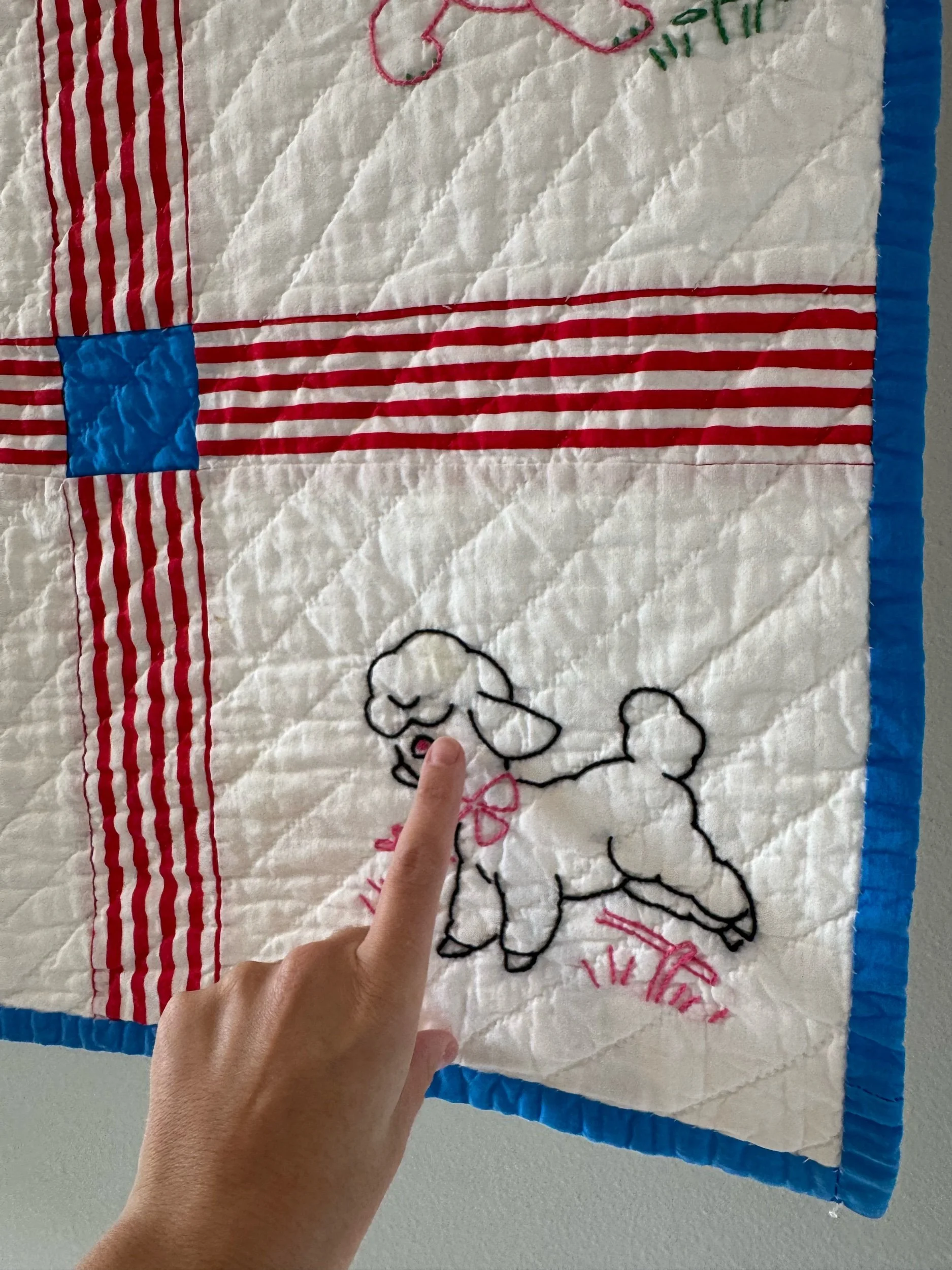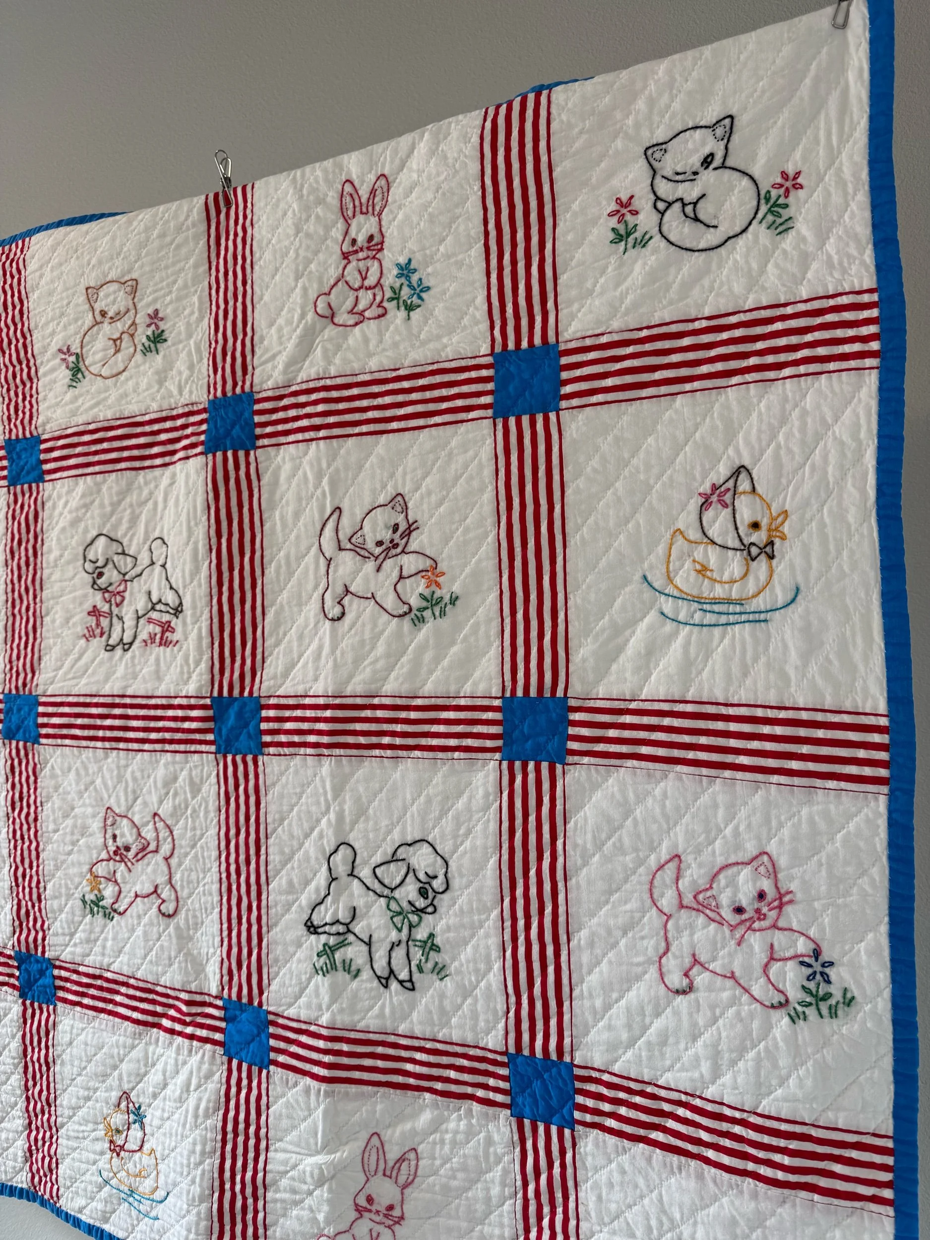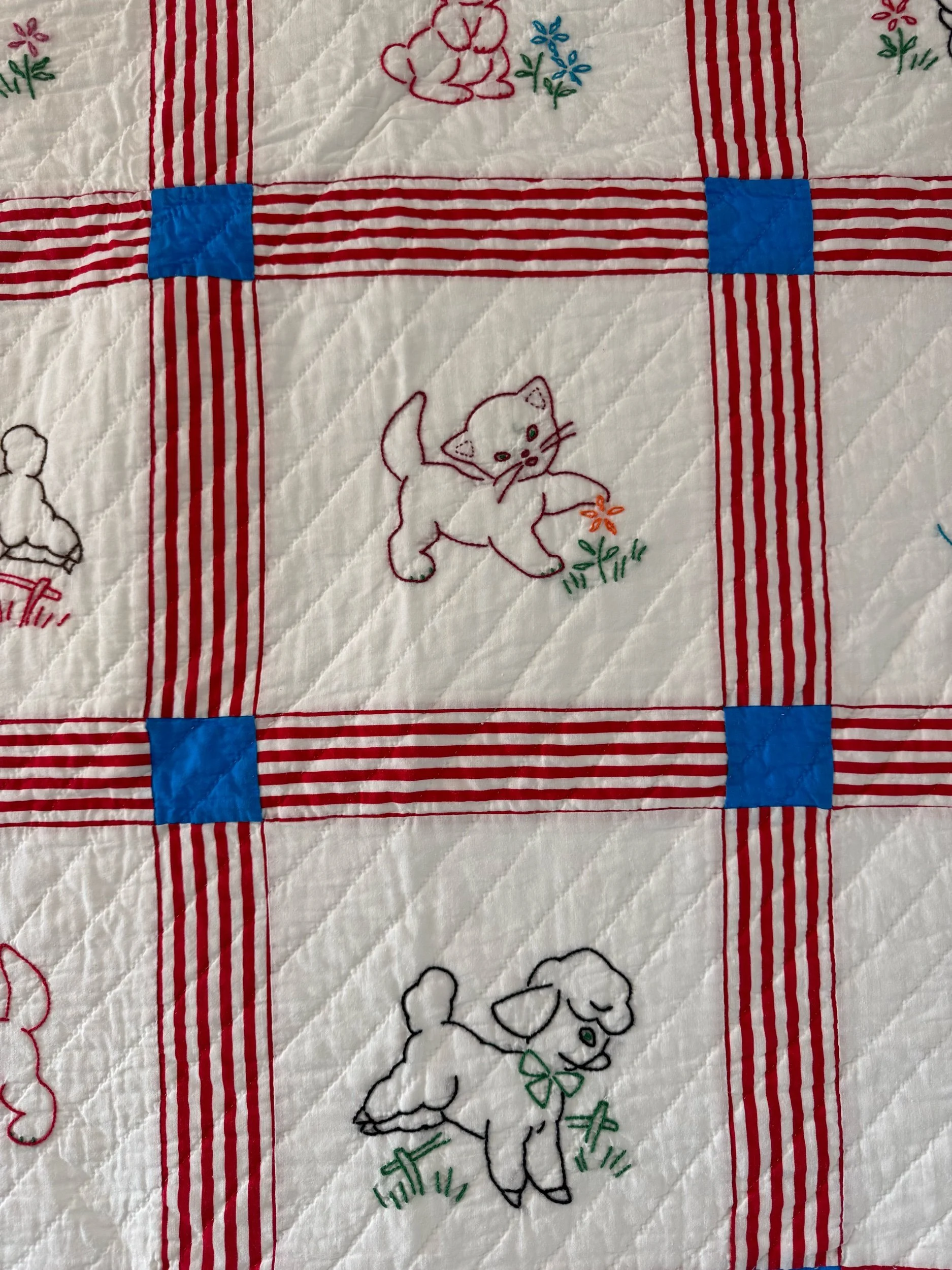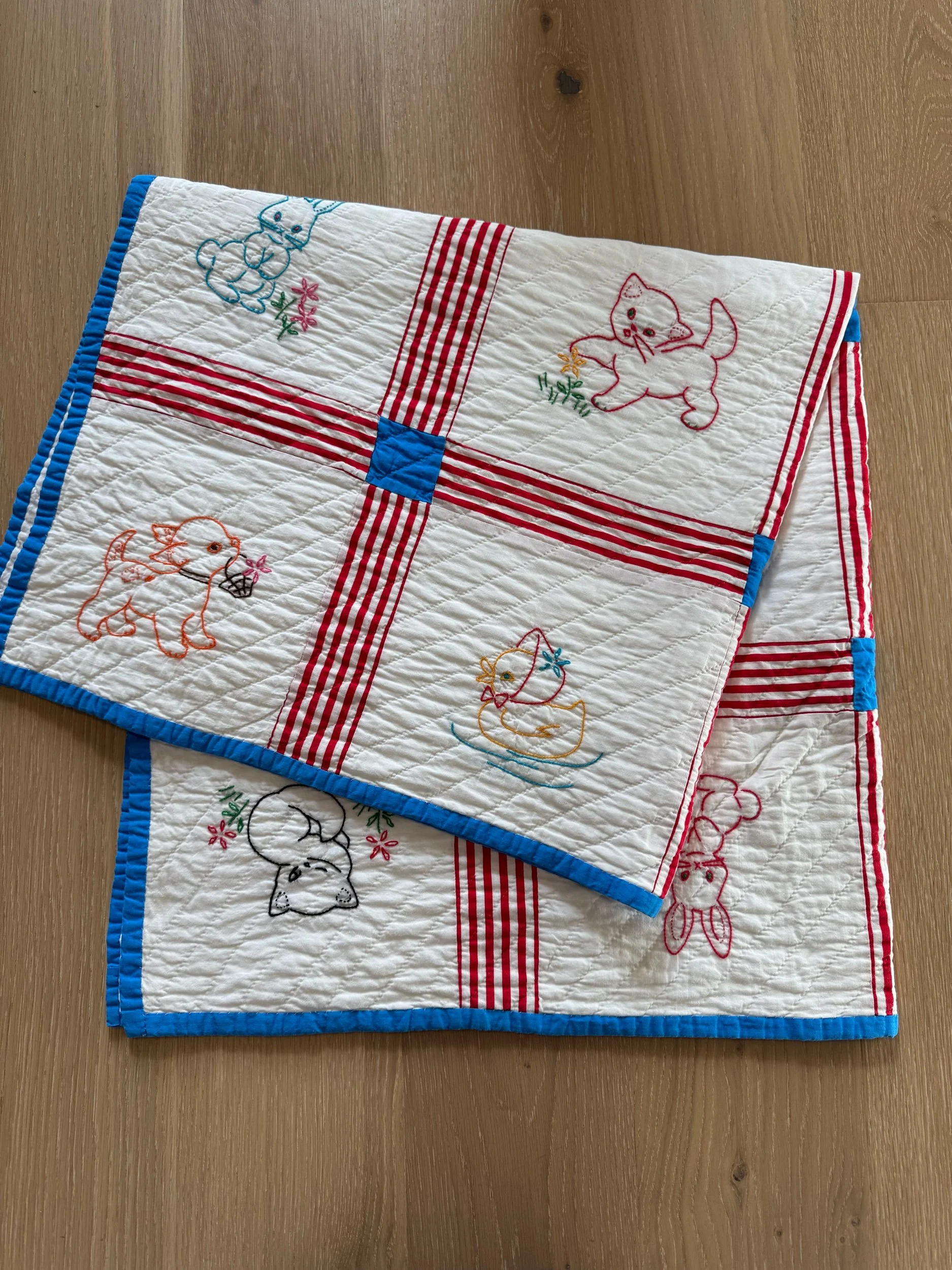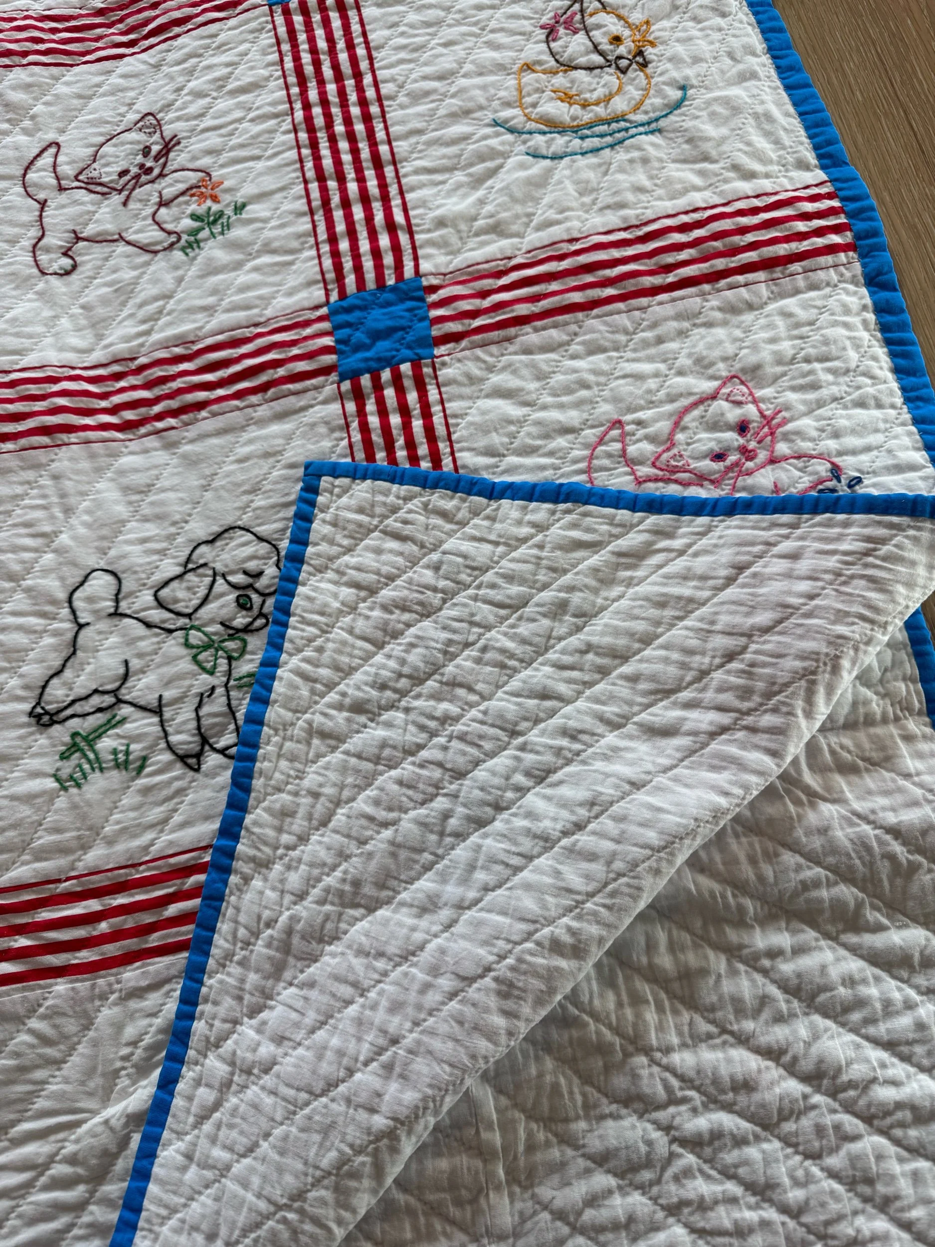 Details: This is what we would call a lightweight quilt. There is no batting shift in the quilt. This design is all muslin cotton. The squares in the design are approximately 2” wide. The squares radiate in a diamond pattern from the center of the quilt. All the fabrics are all solid-colored cotton, in a rainbow of colors. The back fabric is white cotton, and the binding is patchwork in the same rainbow pattern as the quilt. There are three small tears that could be mended, an area of speckling, and wear on the binding. This quilt has been carefully washed and air dried. Please view all pictures before buying. The back has some spotting throughout Overall, this is still a really great quilt and has awesome structure still with minor flaws.