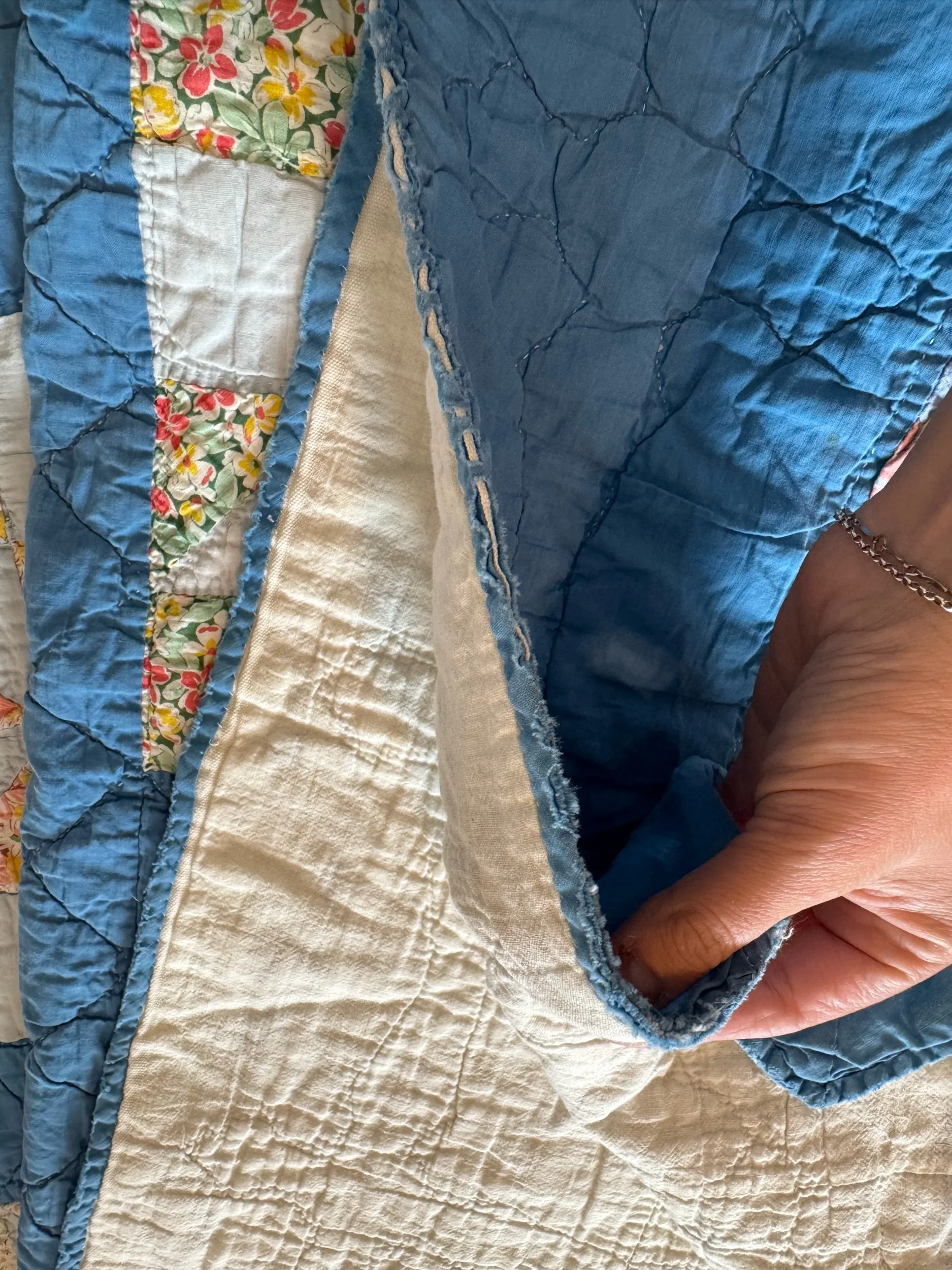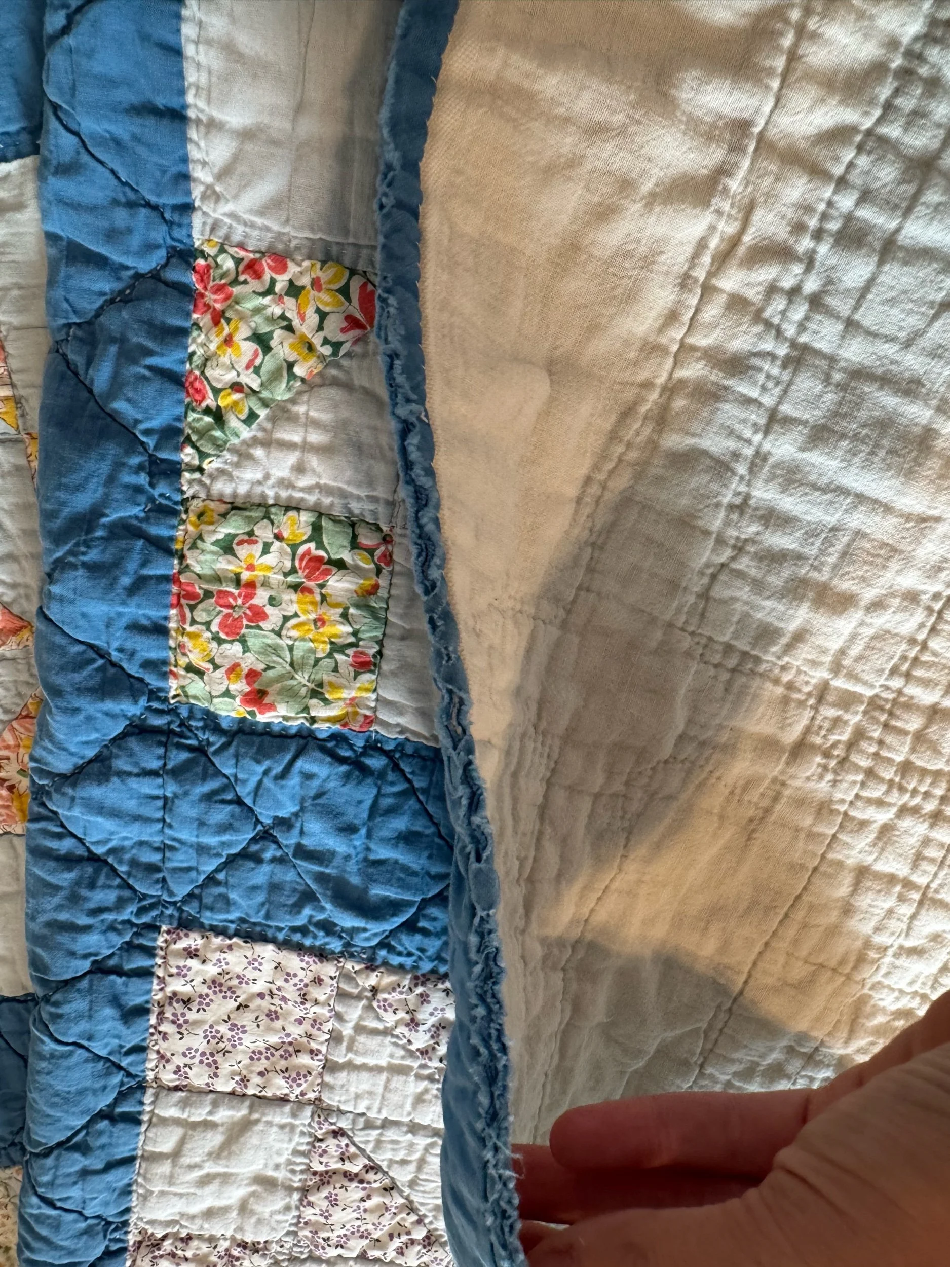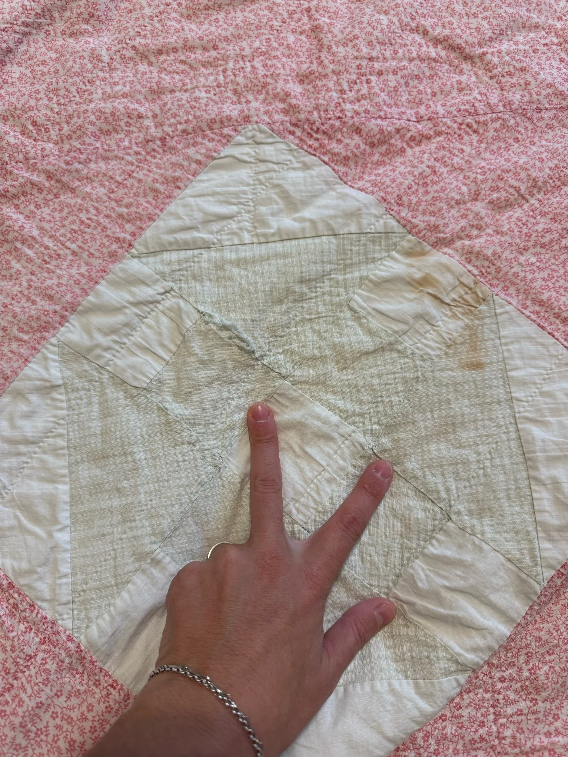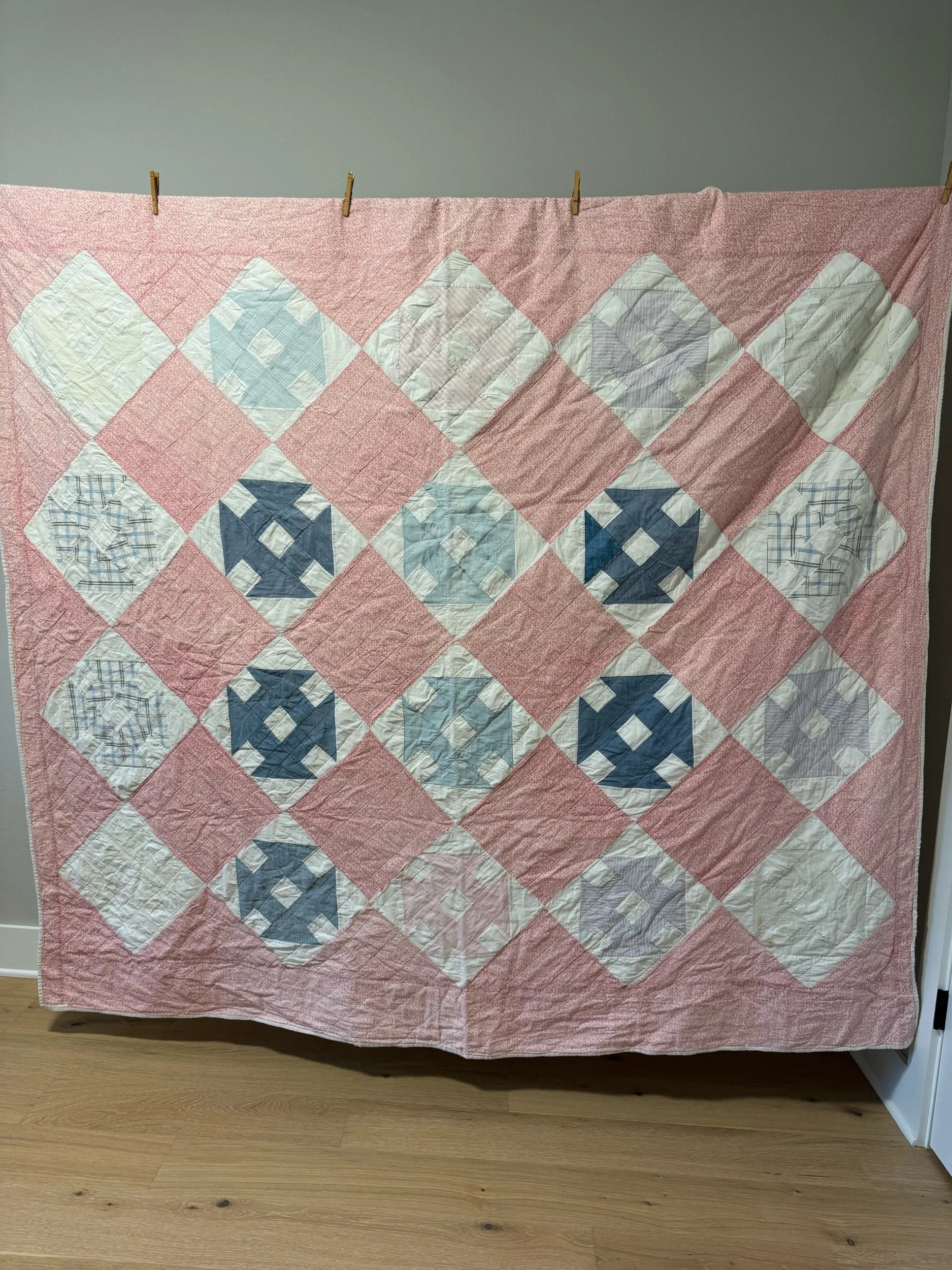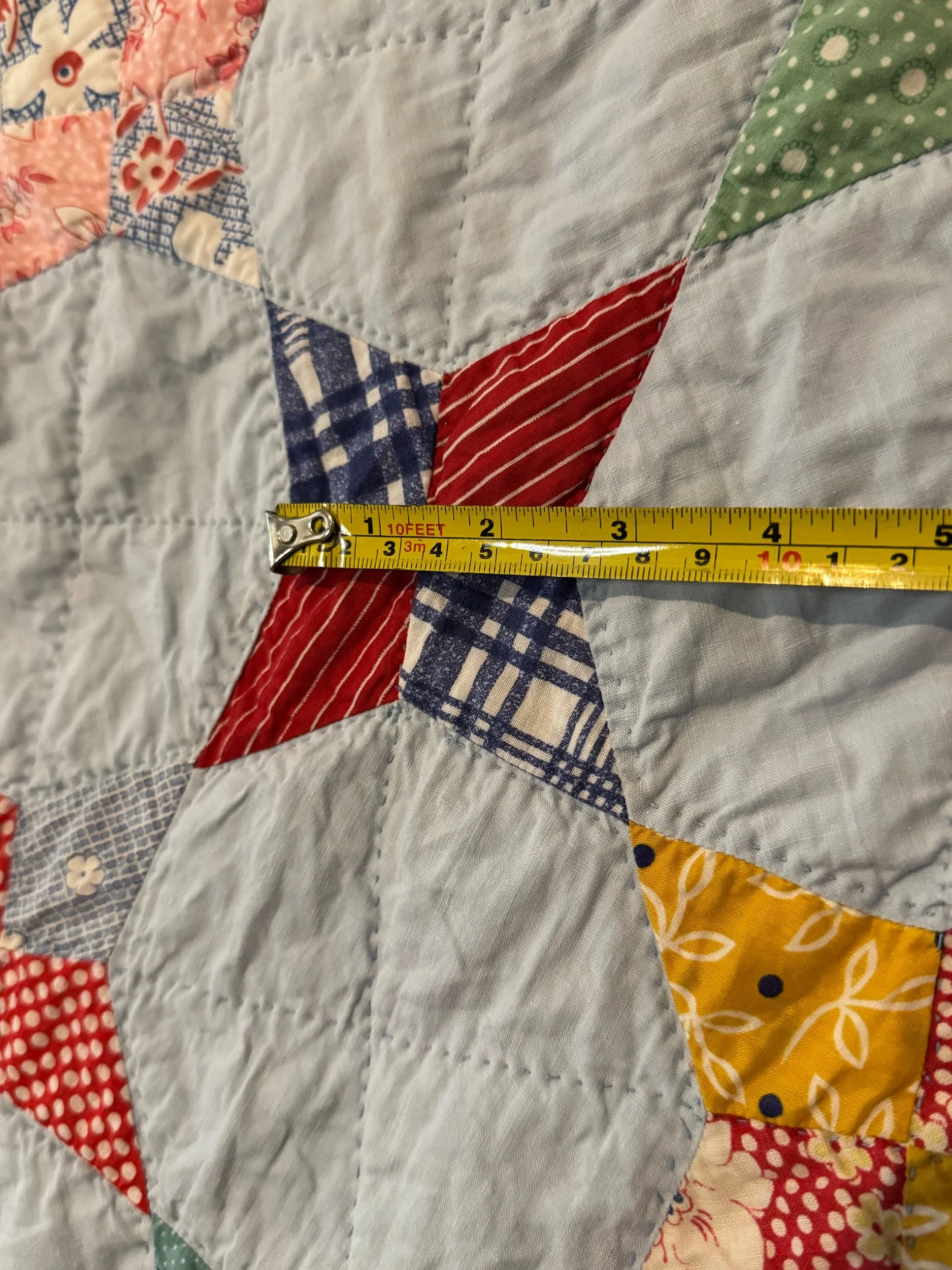 Details: Vintage Simple Diamonds Flour Sack Quilt — This quilt measures 62” X 86”. It is both hand pieced and hand quilted. The quilting stithces have been finished at 6-7 stitches per inch. This is a light weight quilt with no shift. The diamonds measure 8.5” across (point to point). There are several confirmed flour sack prints. We love the fruit prints! This quilt is super soft!!!! The backing is off white Off white — with back to front binding that has been hand applied. We found no through holes or stains. There are 2 patches with shattering, and 1 seam pop to note. Please see pictures for reference. This quilt has been carefully washed and air dried. Please view all pictures before buying.