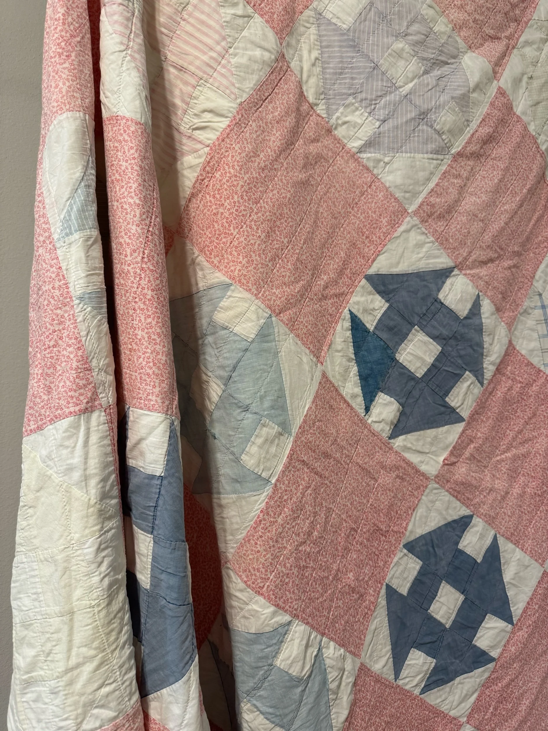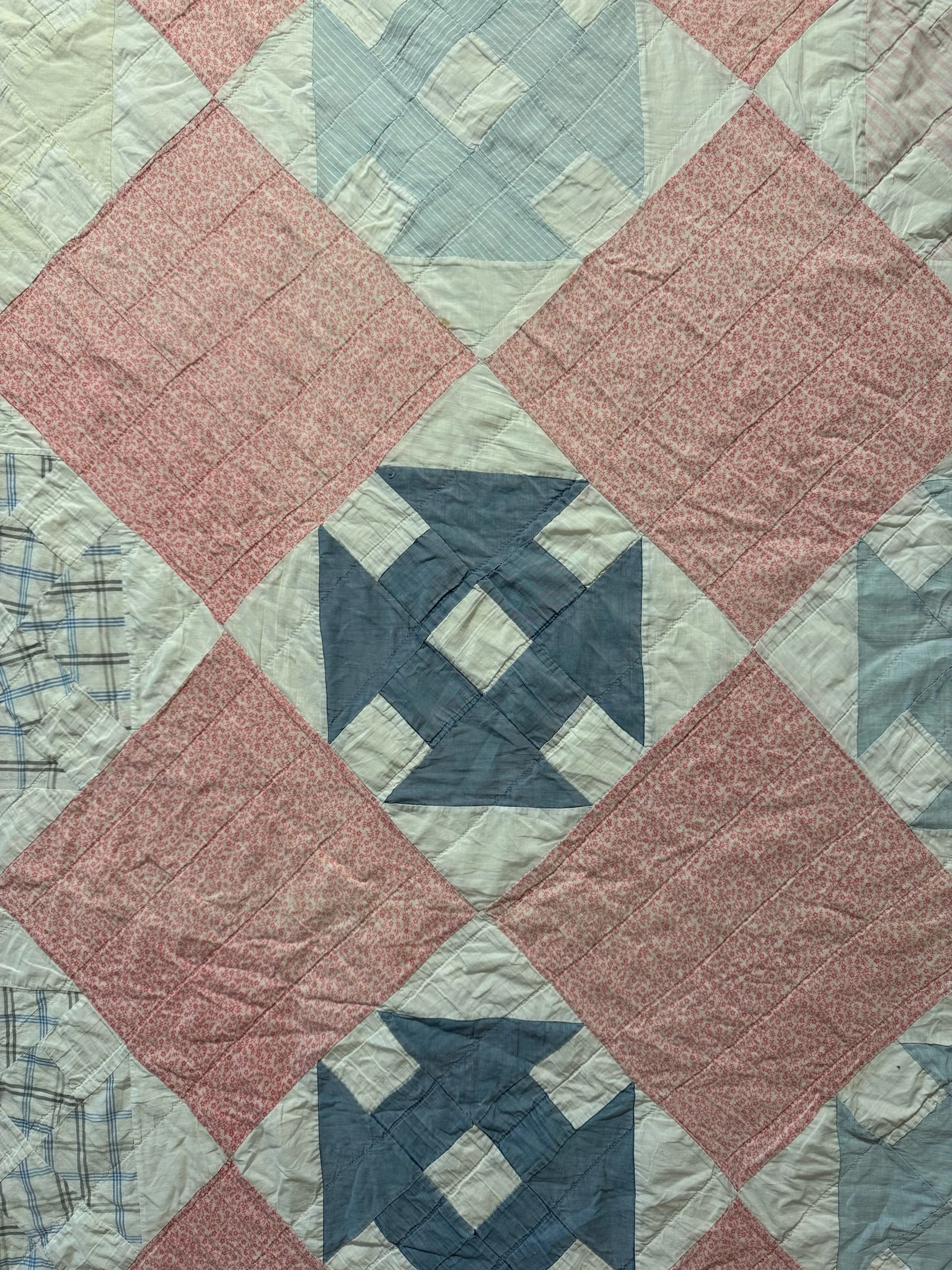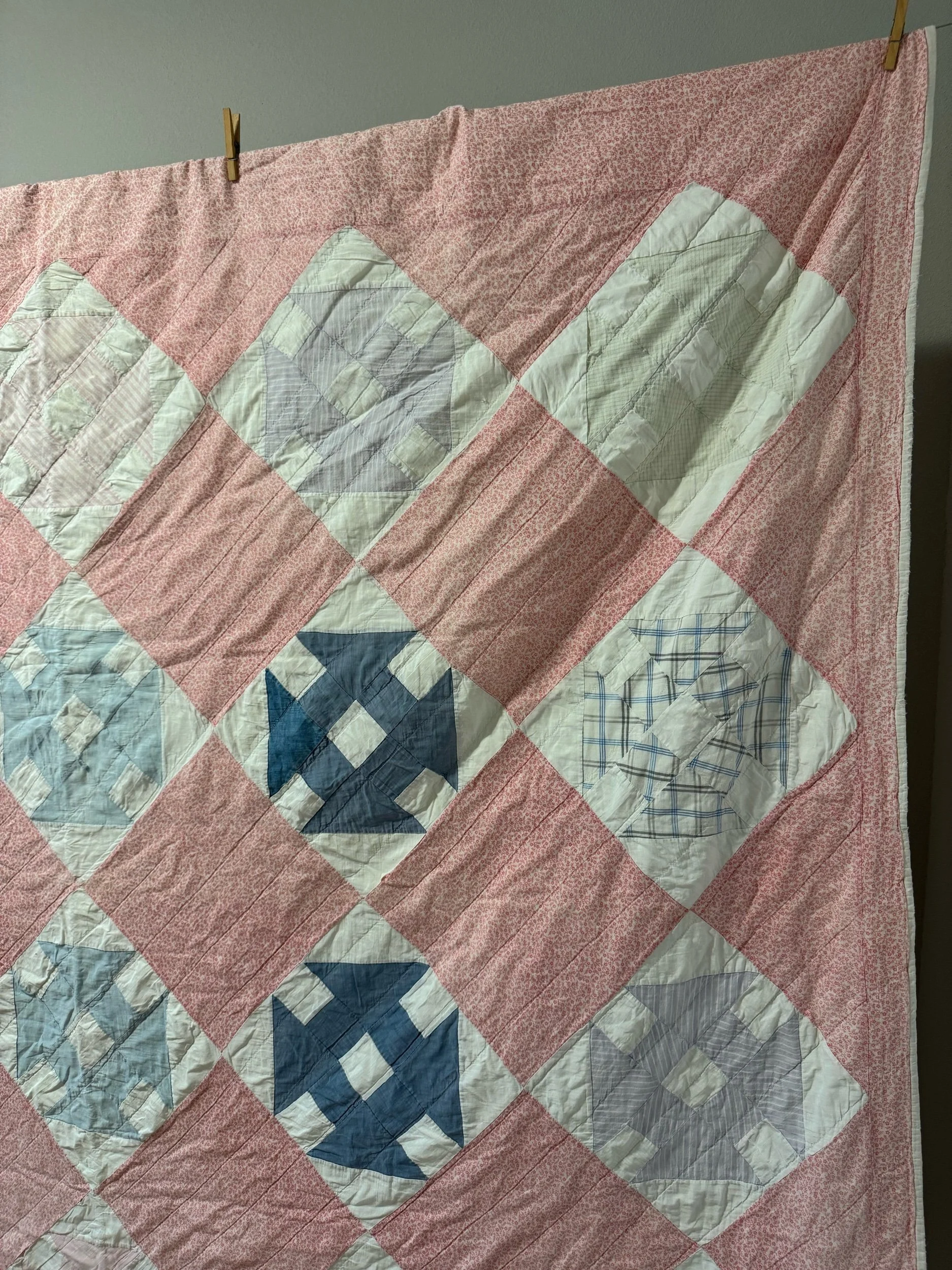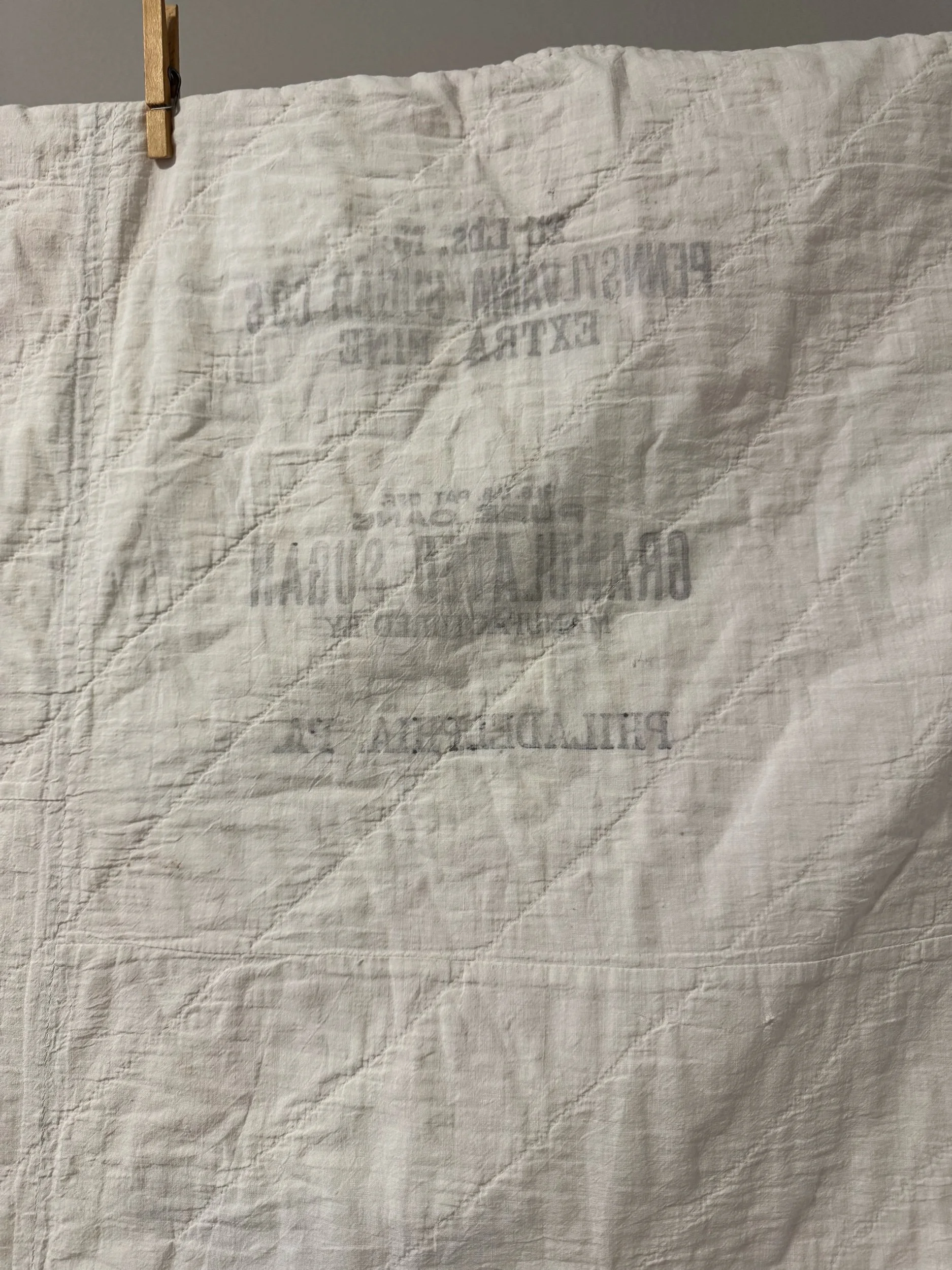 Details: Vintage Simple Diamonds Flour Sack Quilt — This quilt measures 62” X 86”. It is both hand pieced and hand quilted. The quilting stithces have been finished at 6-7 stitches per inch. This is a light weight quilt with no shift. The diamonds measure 8.5” across (point to point). There are several confirmed flour sack prints. We love the fruit prints! This quilt is super soft!!!! The backing is off white Off white — with back to front binding that has been hand applied. We found no through holes or stains. There are 2 patches with shattering, and 1 seam pop to note. Please see pictures for reference. This quilt has been carefully washed and air dried. Please view all pictures before buying.
