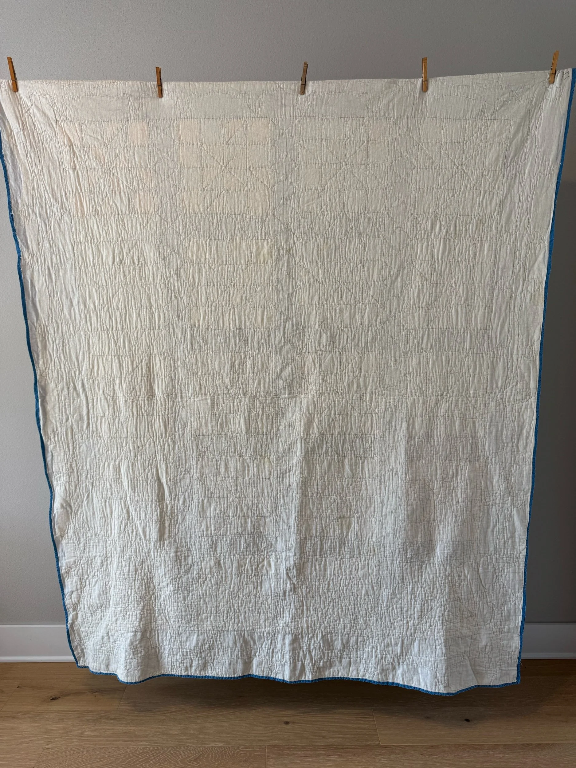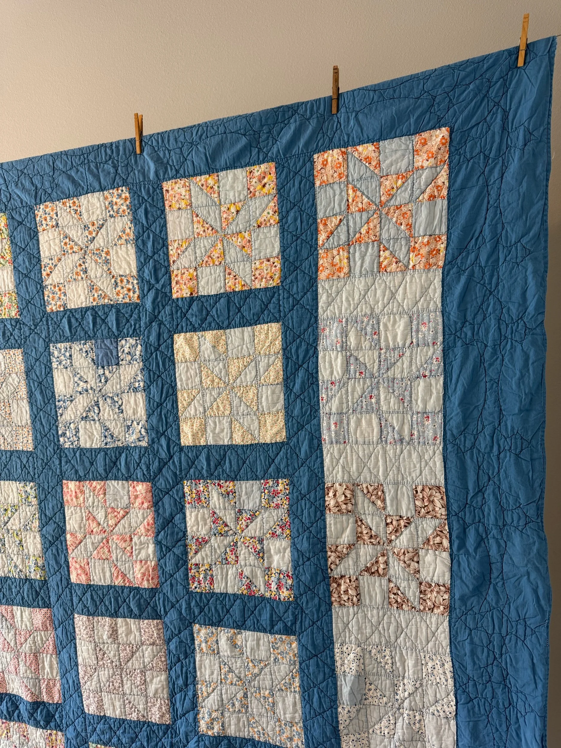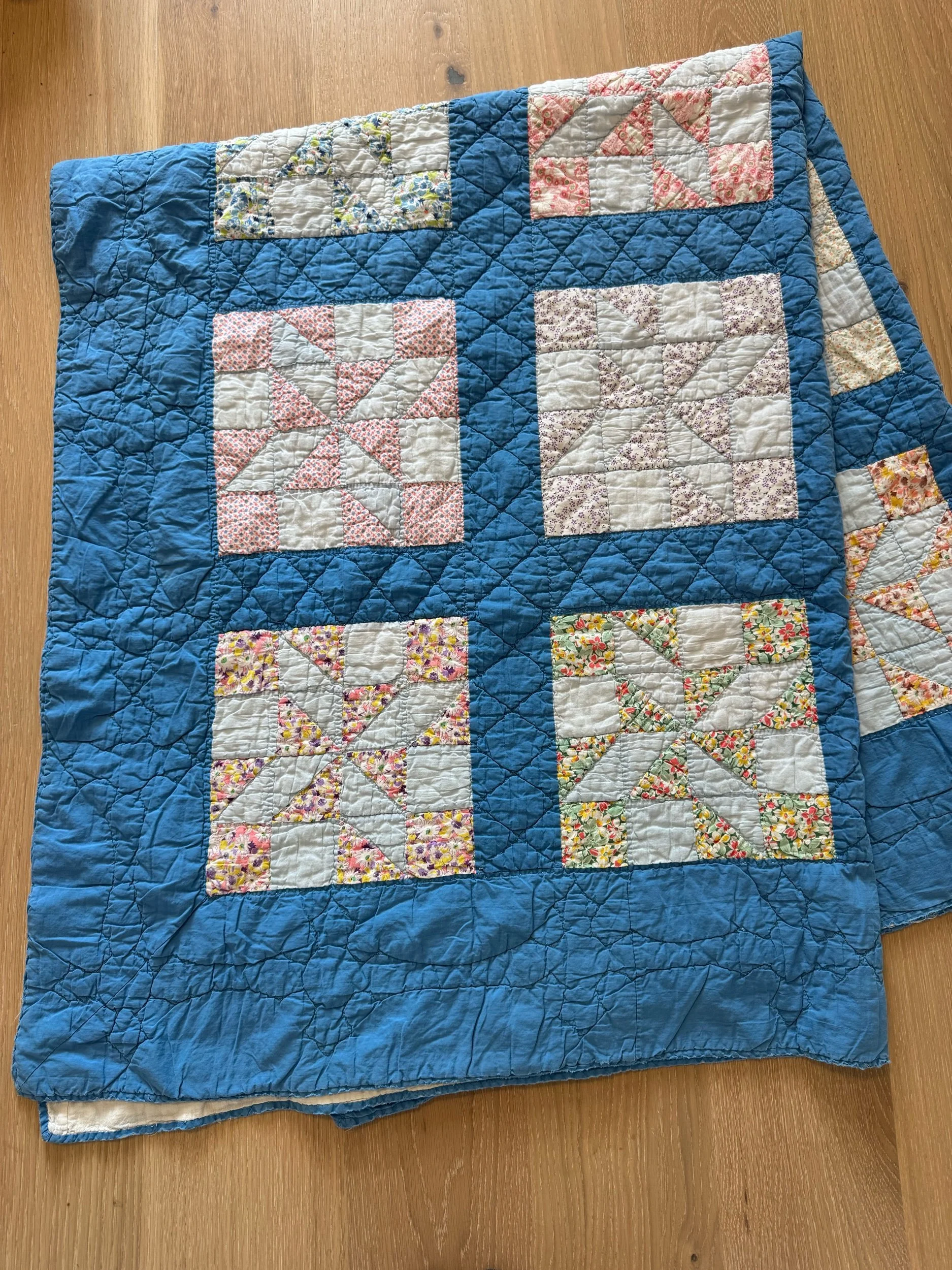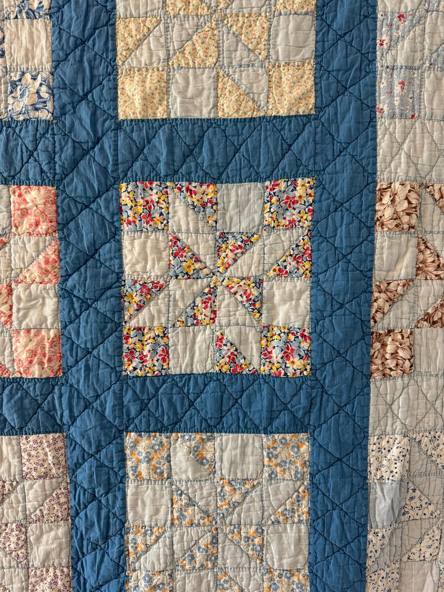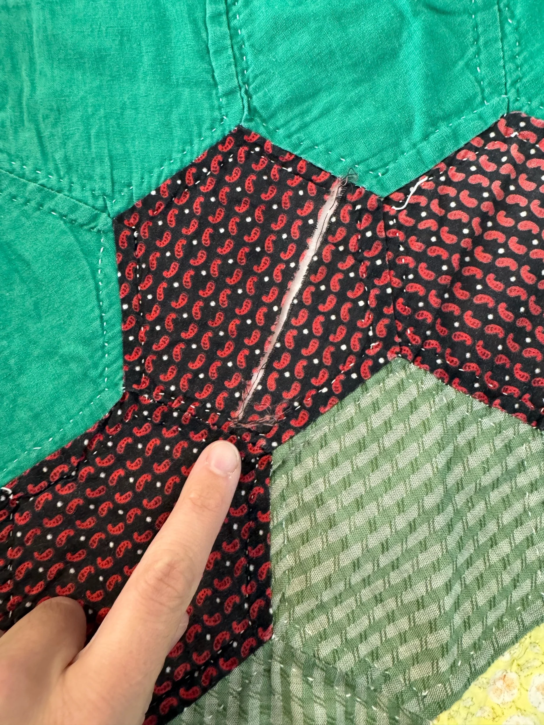 Details: Vintage Simple Diamonds Flour Sack Quilt — This quilt measures 62” X 86”. It is both hand pieced and hand quilted. The quilting stithces have been finished at 6-7 stitches per inch. This is a light weight quilt with no shift. The diamonds measure 8.5” across (point to point). There are several confirmed flour sack prints. We love the fruit prints! This quilt is super soft!!!! The backing is off white Off white — with back to front binding that has been hand applied. We found no through holes or stains. There are 2 patches with shattering, and 1 seam pop to note. Please see pictures for reference. This quilt has been carefully washed and air dried. Please view all pictures before buying.