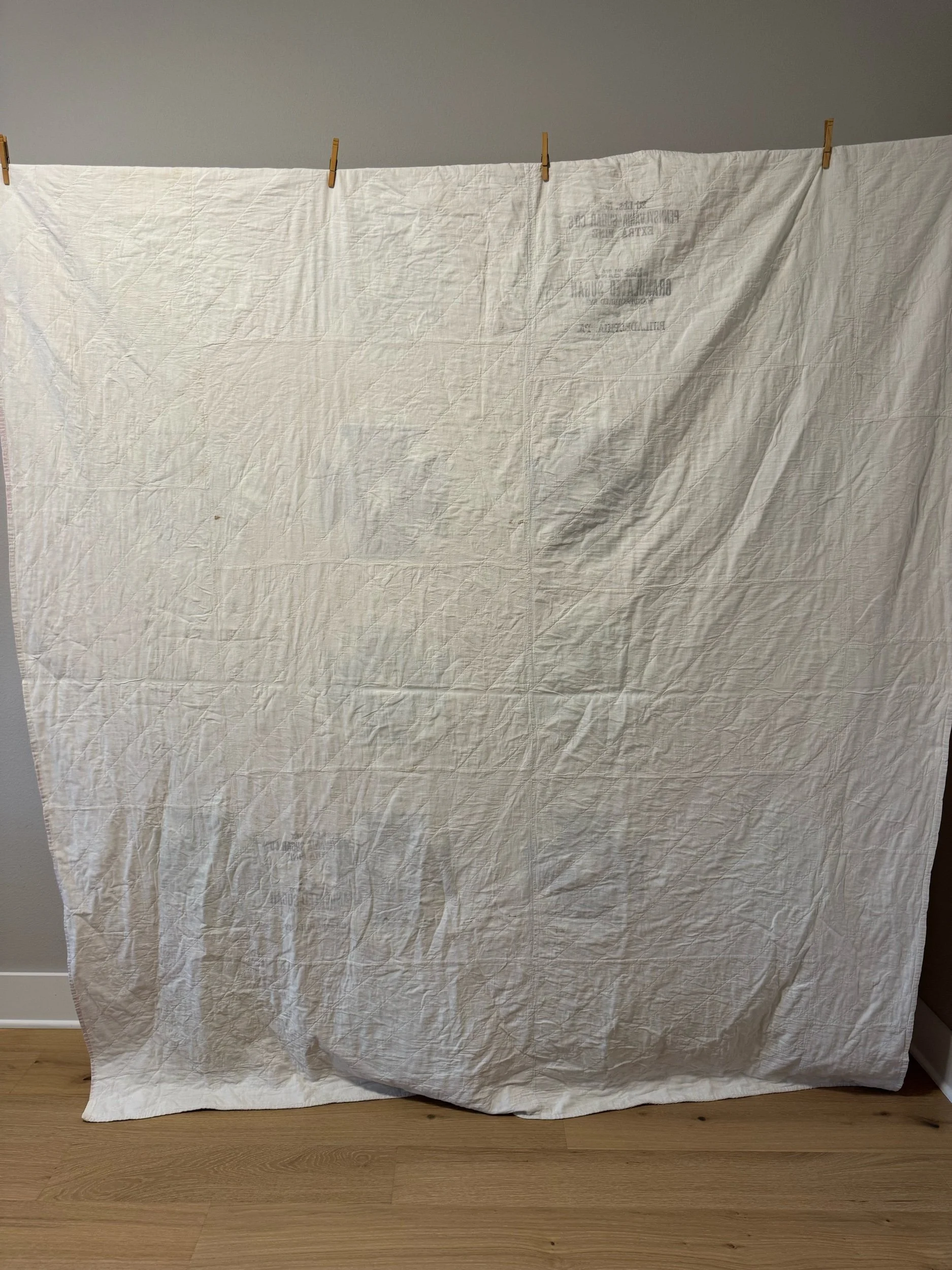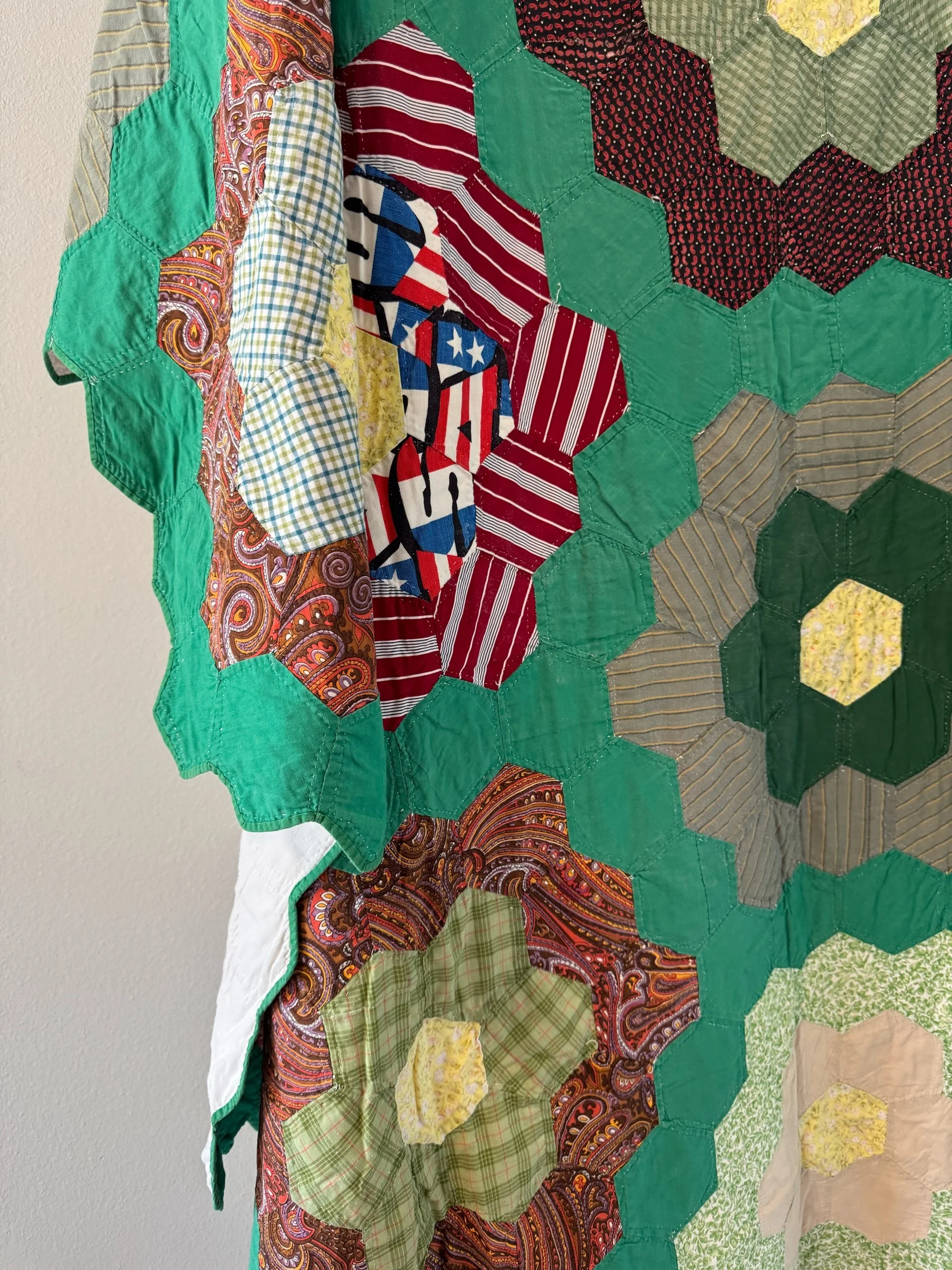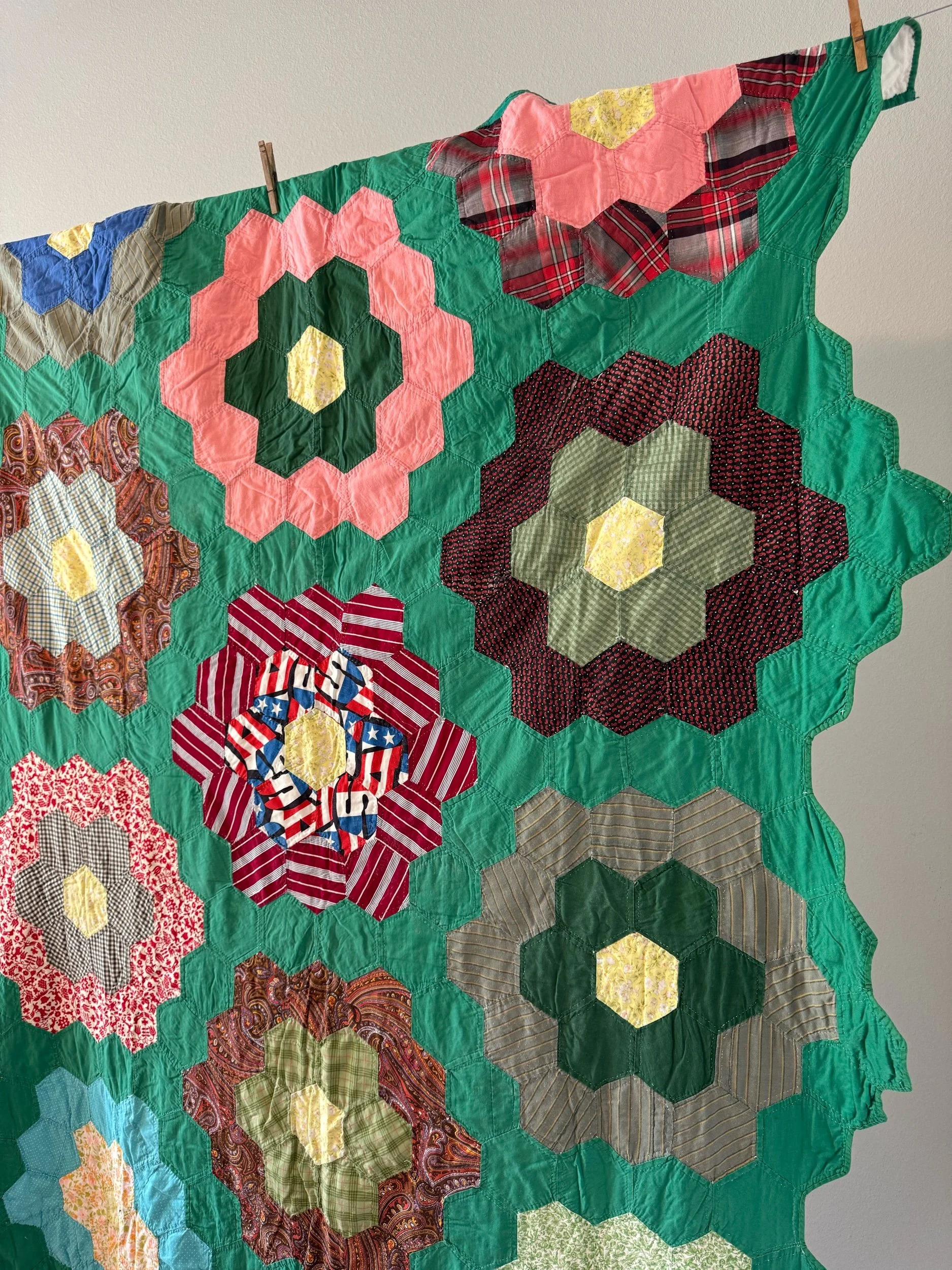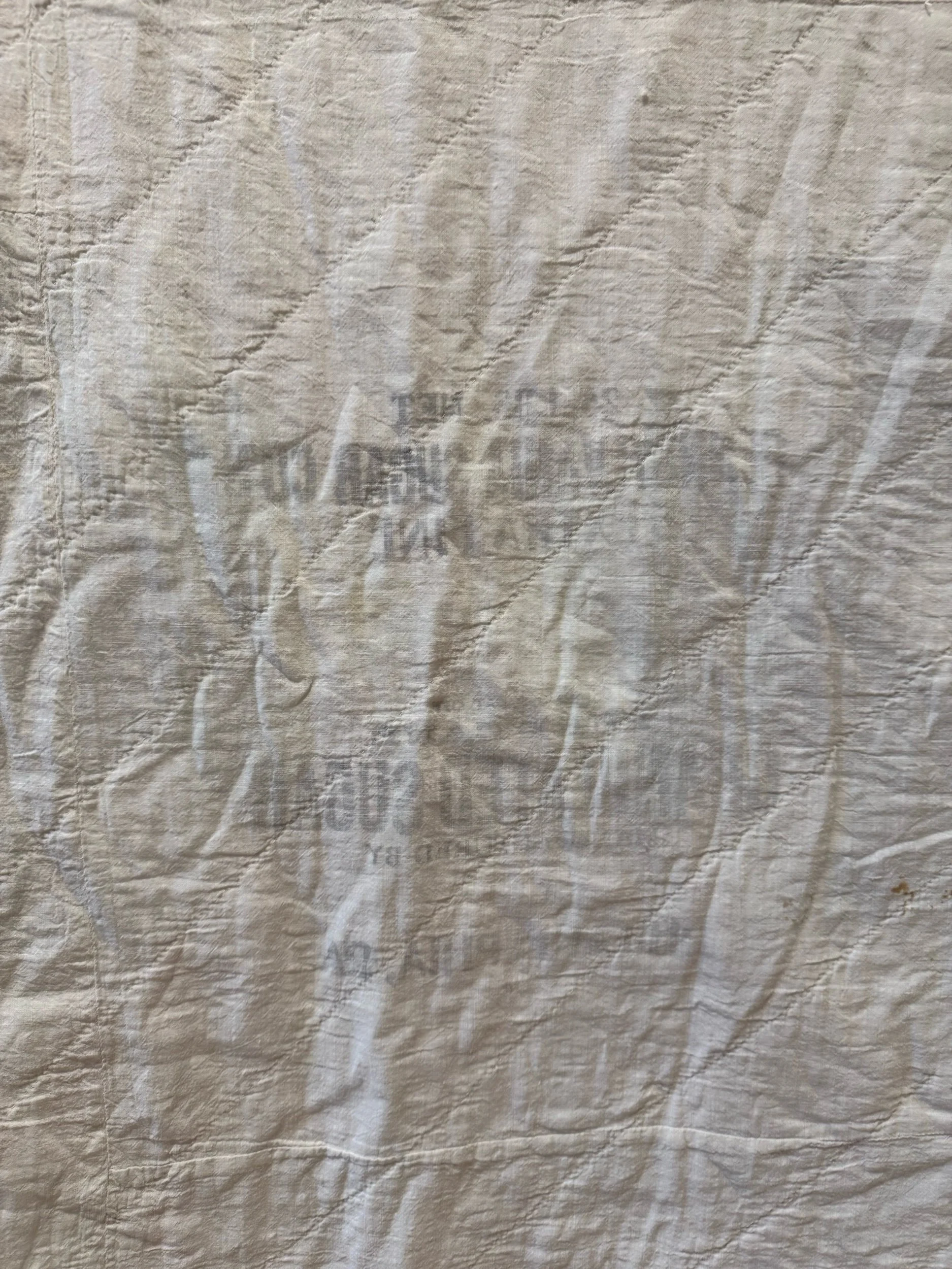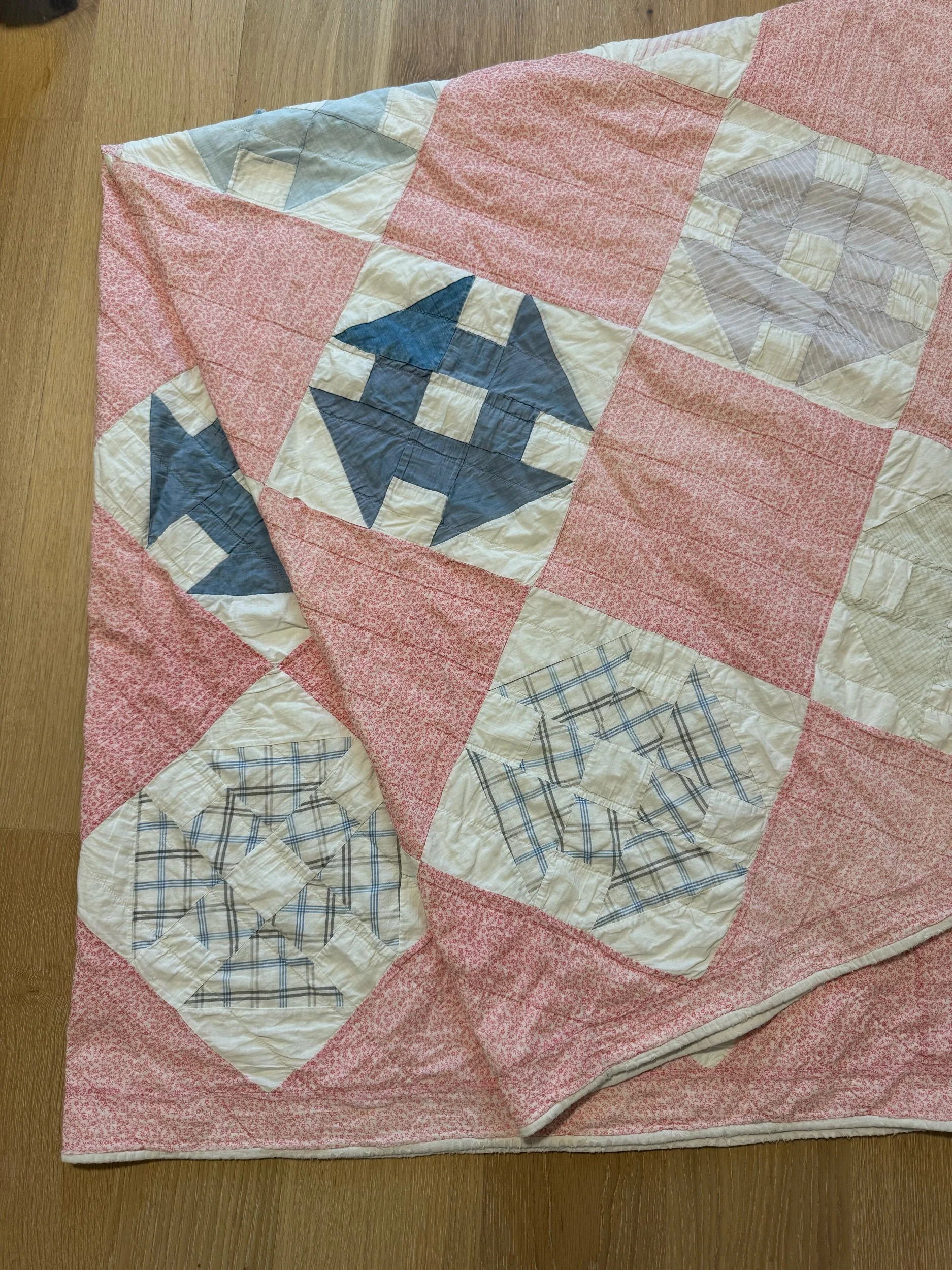 Details: Vintage Simple Diamonds Flour Sack Quilt — This quilt measures 62” X 86”. It is both hand pieced and hand quilted. The quilting stithces have been finished at 6-7 stitches per inch. This is a light weight quilt with no shift. The diamonds measure 8.5” across (point to point). There are several confirmed flour sack prints. We love the fruit prints! This quilt is super soft!!!! The backing is off white Off white — with back to front binding that has been hand applied. We found no through holes or stains. There are 2 patches with shattering, and 1 seam pop to note. Please see pictures for reference. This quilt has been carefully washed and air dried. Please view all pictures before buying.