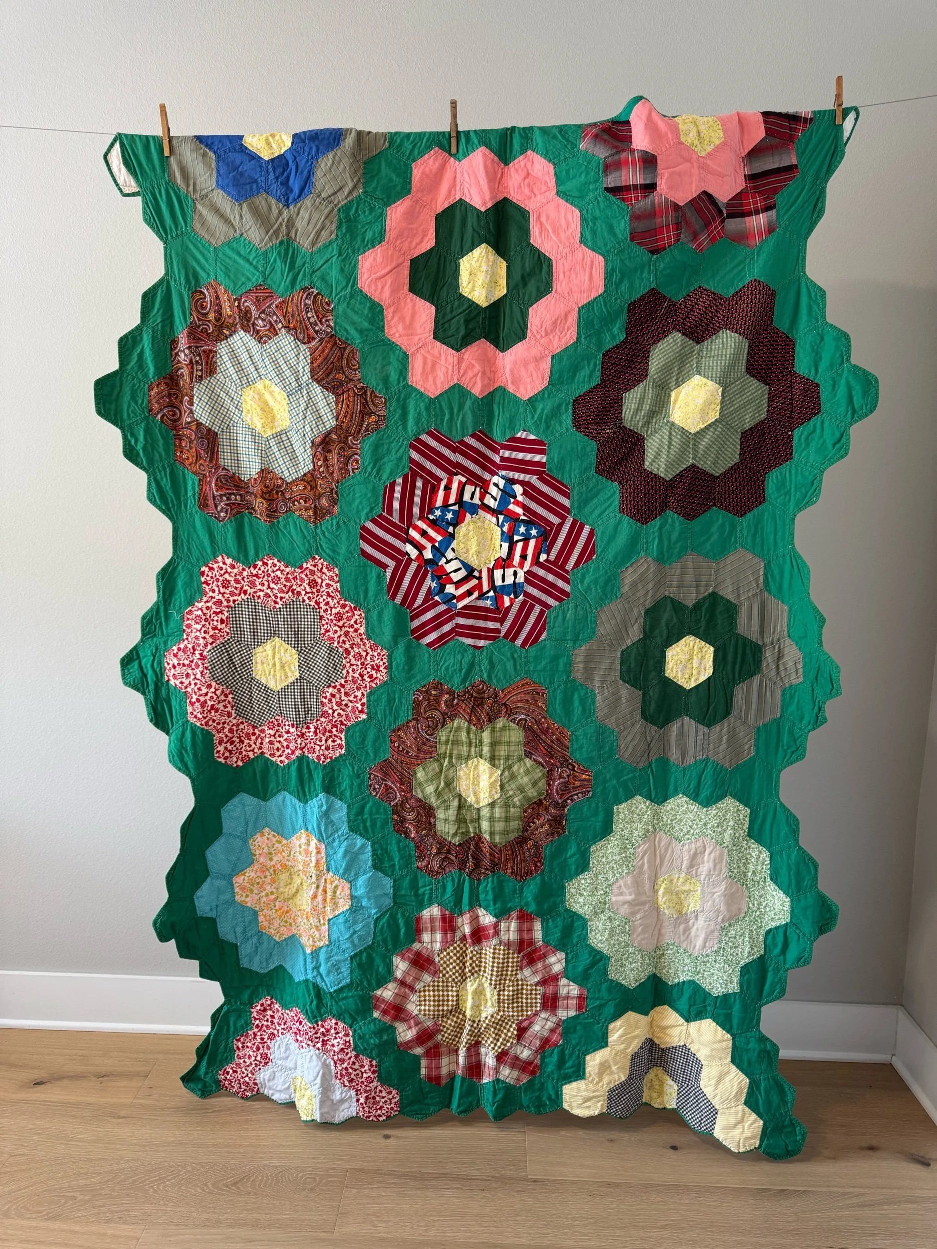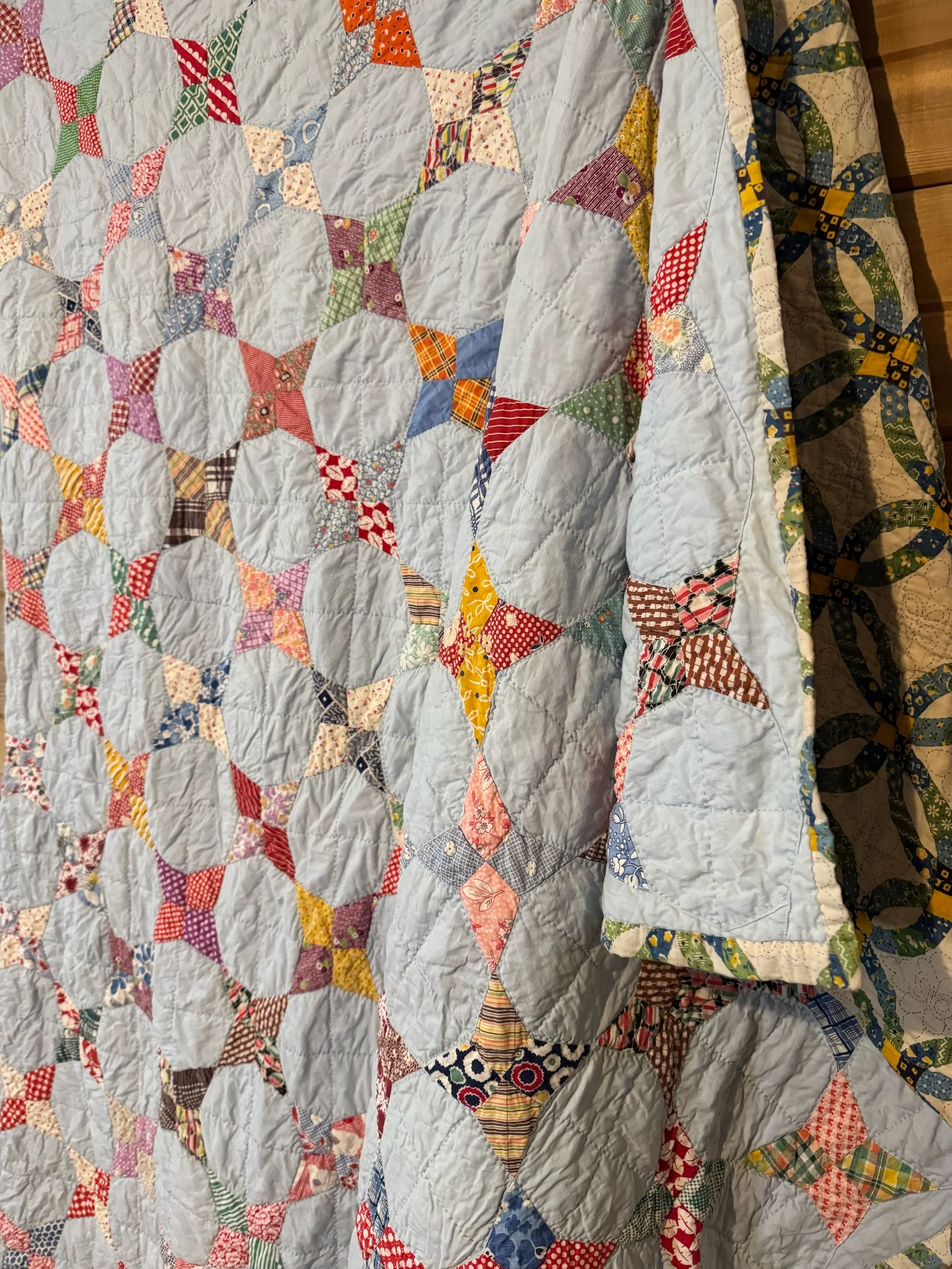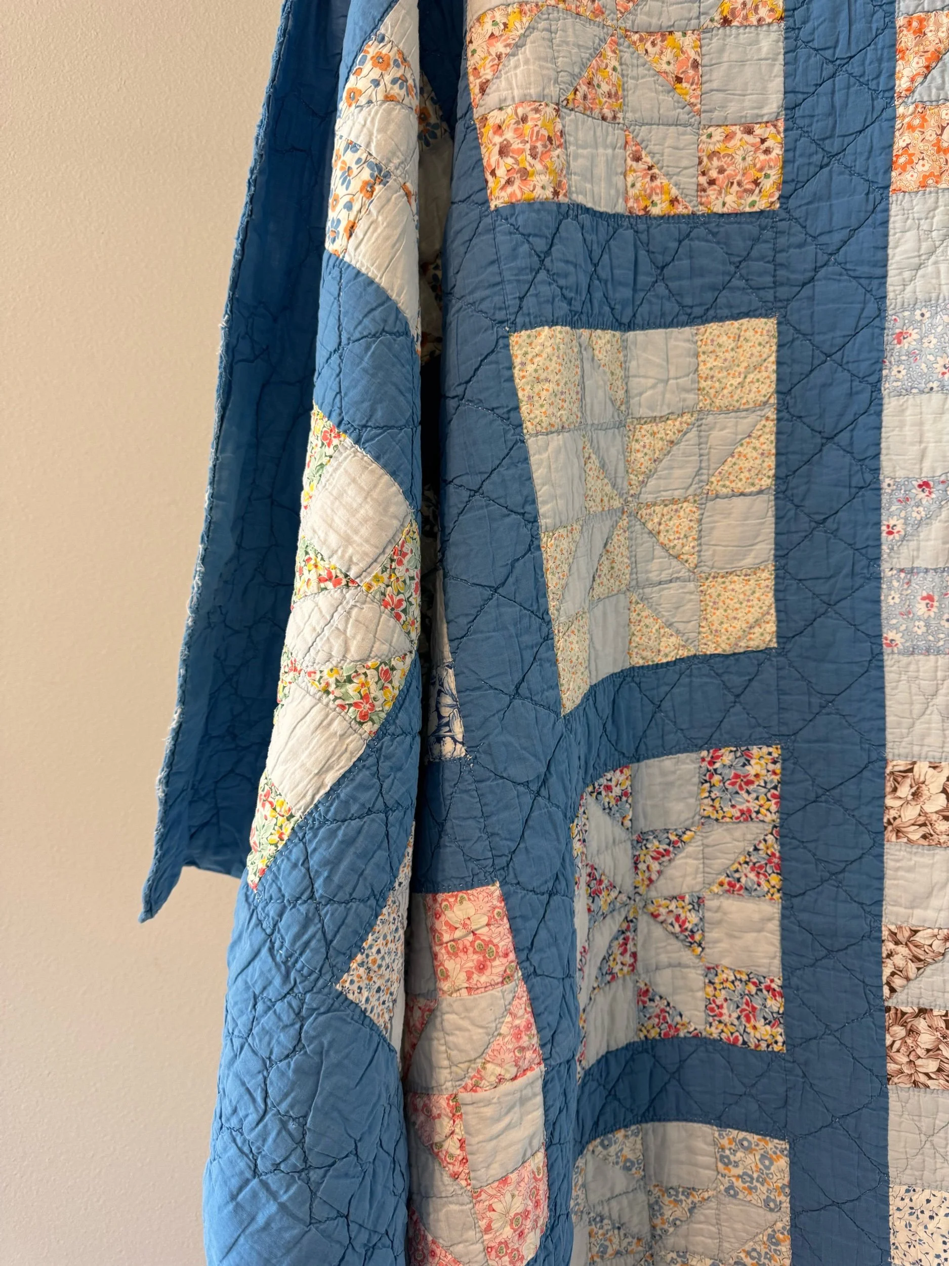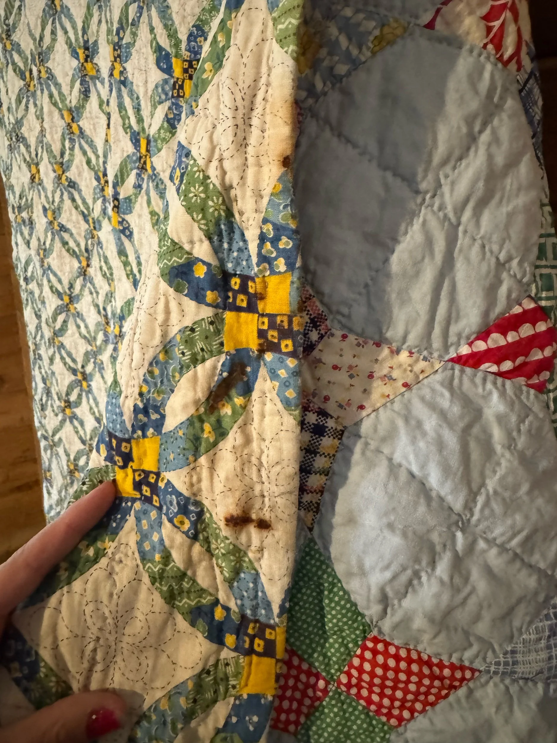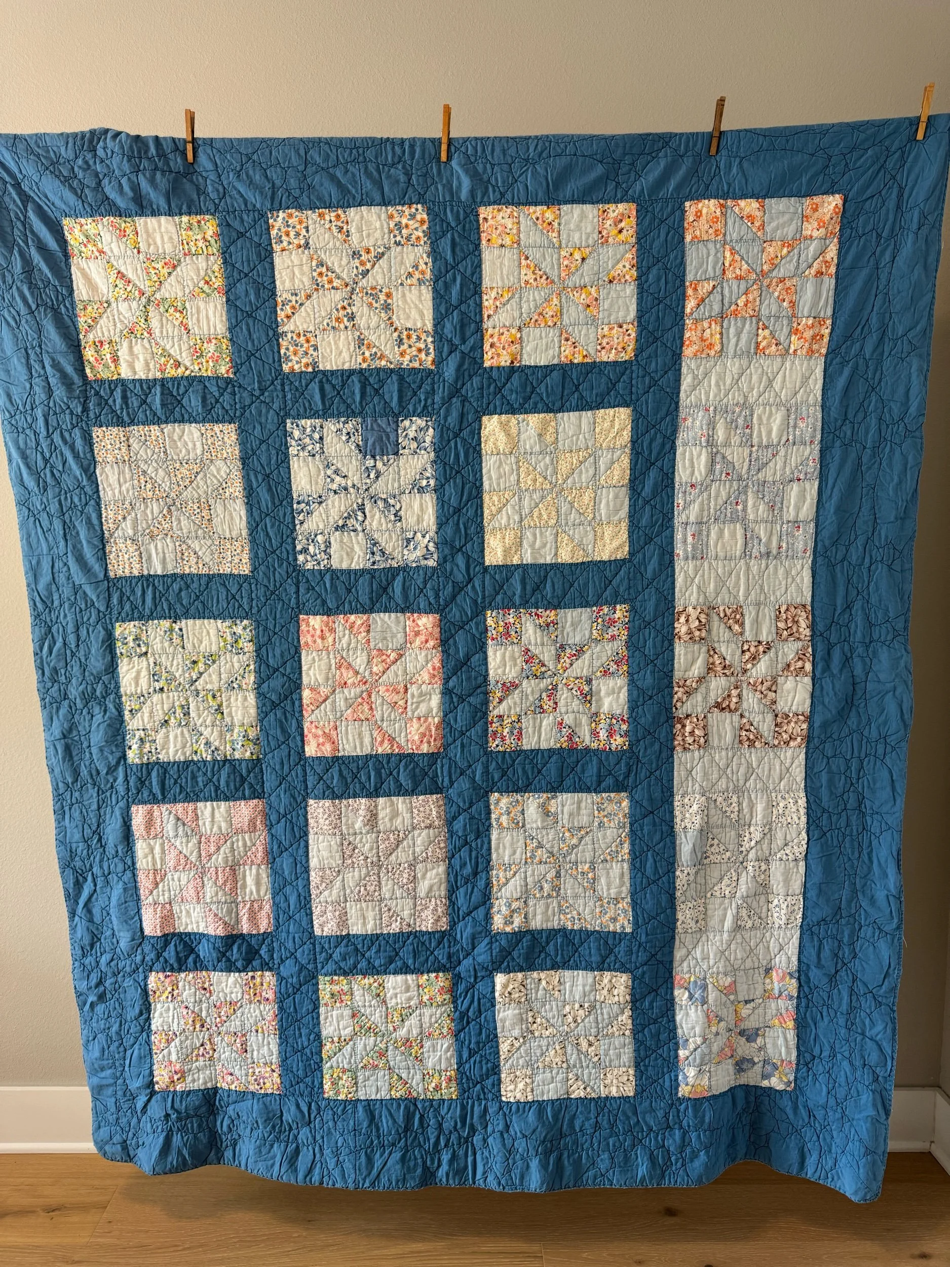 Details: Vintage Simple Diamonds Flour Sack Quilt — This quilt measures 62” X 86”. It is both hand pieced and hand quilted. The quilting stithces have been finished at 6-7 stitches per inch. This is a light weight quilt with no shift. The diamonds measure 8.5” across (point to point). There are several confirmed flour sack prints. We love the fruit prints! This quilt is super soft!!!! The backing is off white Off white — with back to front binding that has been hand applied. We found no through holes or stains. There are 2 patches with shattering, and 1 seam pop to note. Please see pictures for reference. This quilt has been carefully washed and air dried. Please view all pictures before buying.