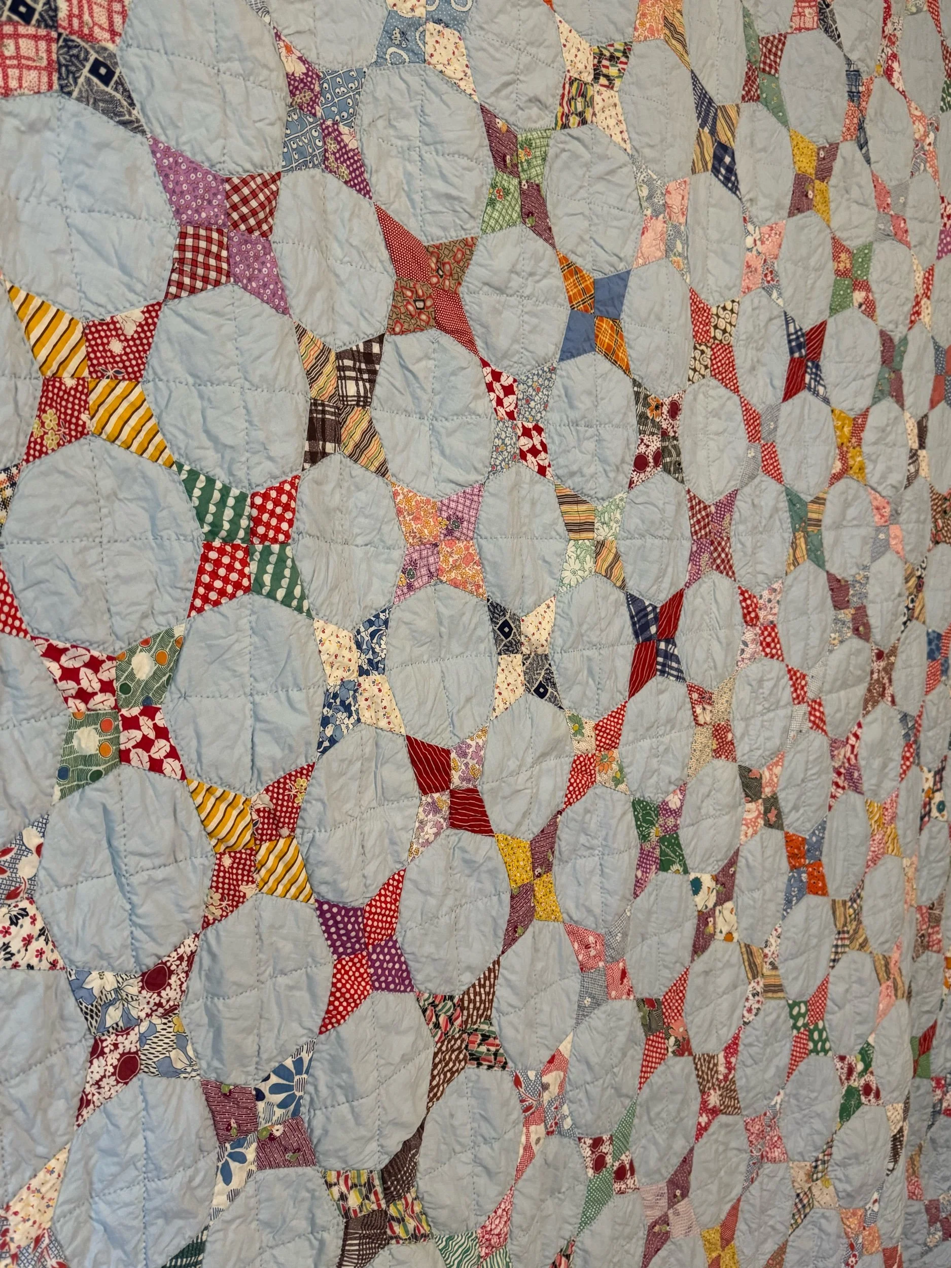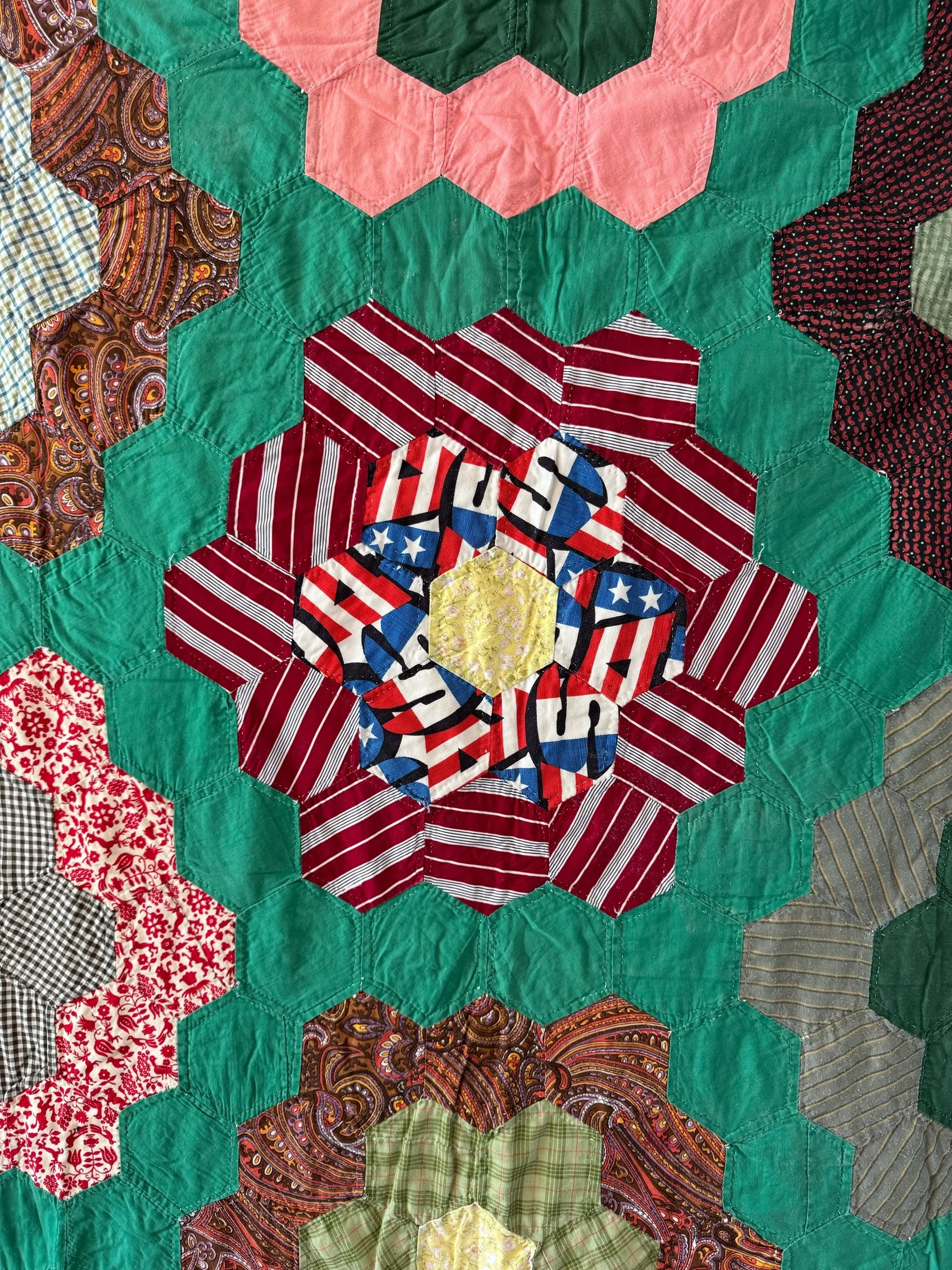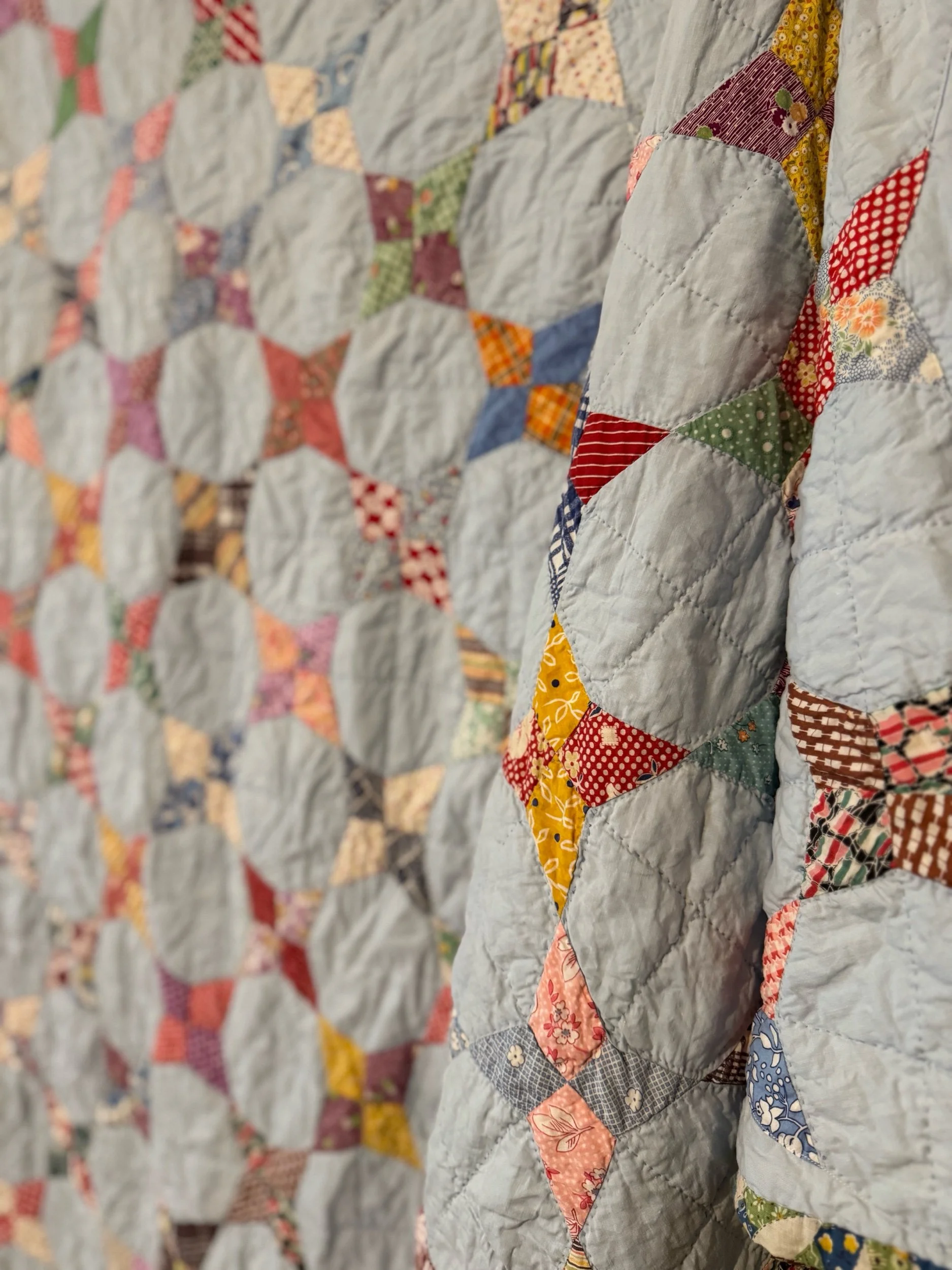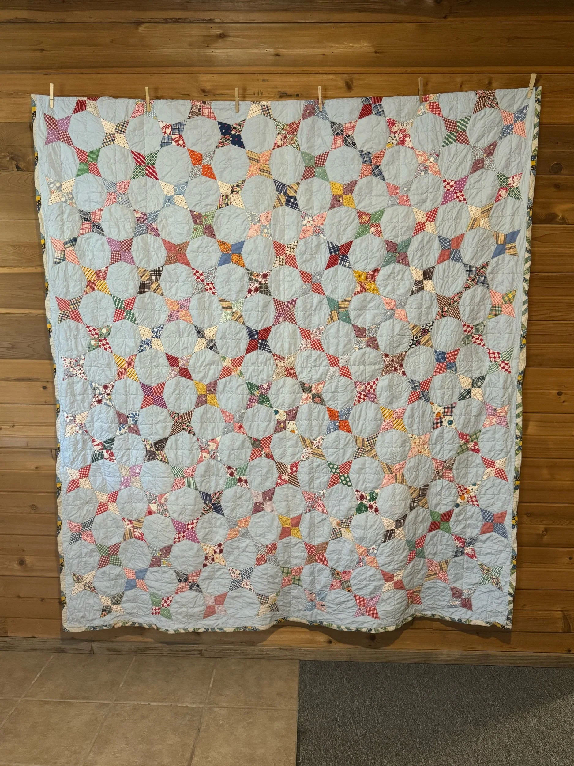Details: Vintage Simple Diamonds Flour Sack Quilt — This quilt measures 62” X 86”. It is both hand pieced and hand quilted. The quilting stithces have been finished at 6-7 stitches per inch. This is a light weight quilt with no shift. The diamonds measure 8.5” across (point to point). There are several confirmed flour sack prints. We love the fruit prints! This quilt is super soft!!!! The backing is off white Off white — with back to front binding that has been hand applied. We found no through holes or stains. There are 2 patches with shattering, and 1 seam pop to note. Please see pictures for reference. This quilt has been carefully washed and air dried. Please view all pictures before buying.