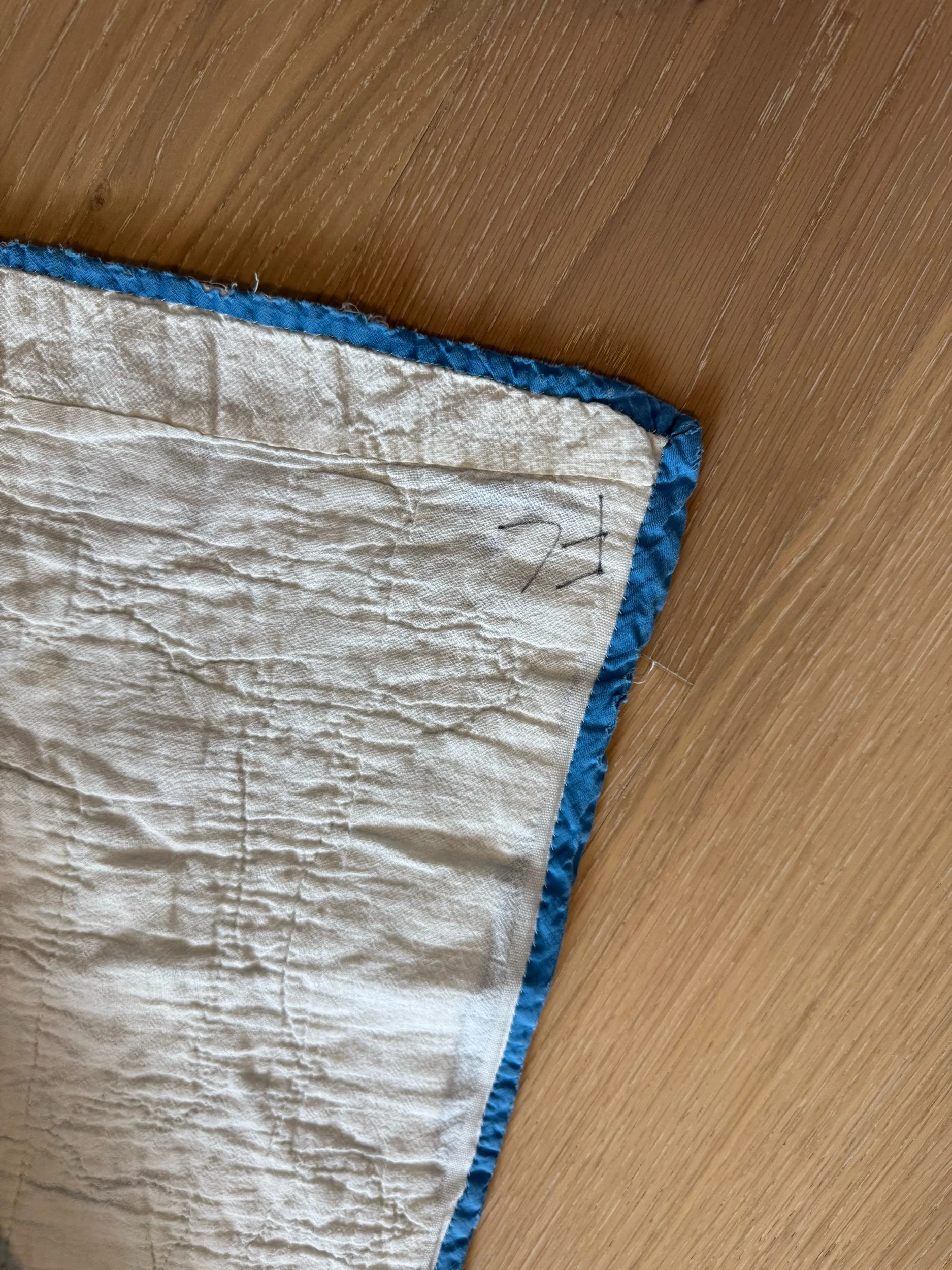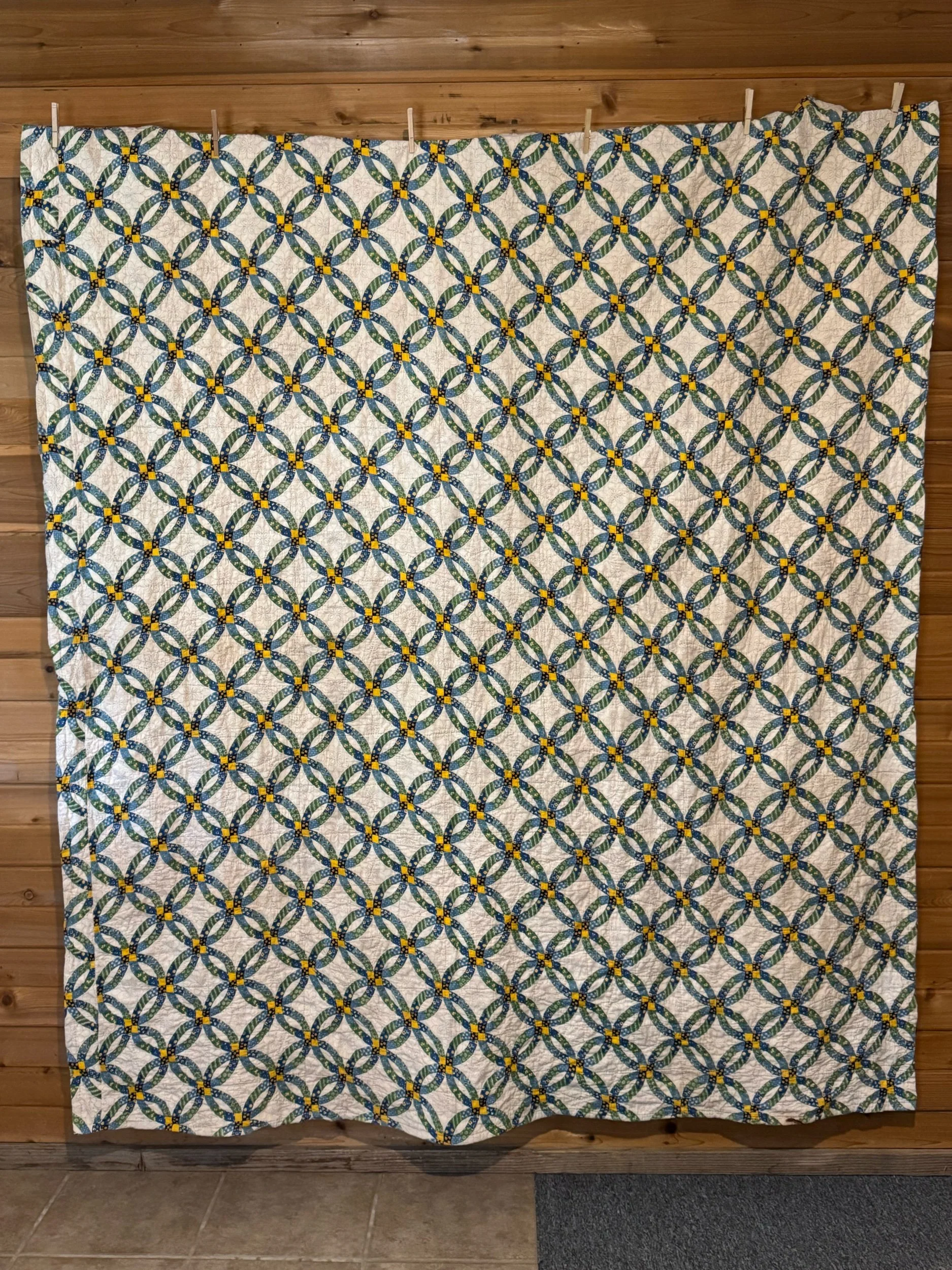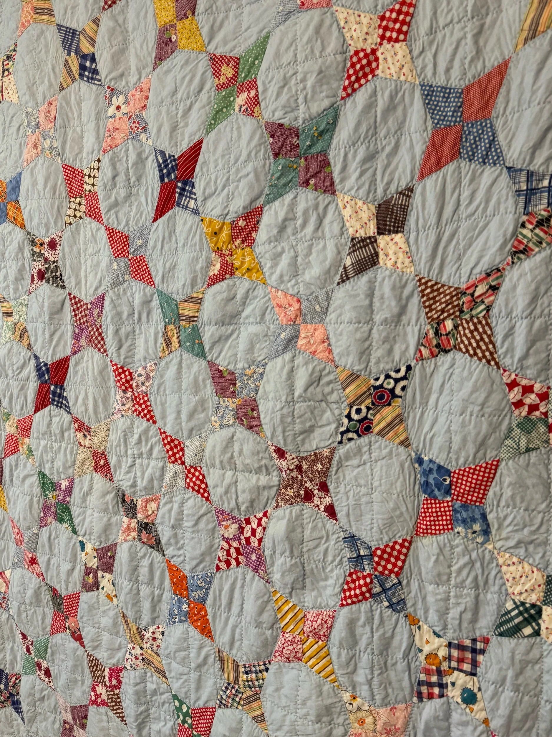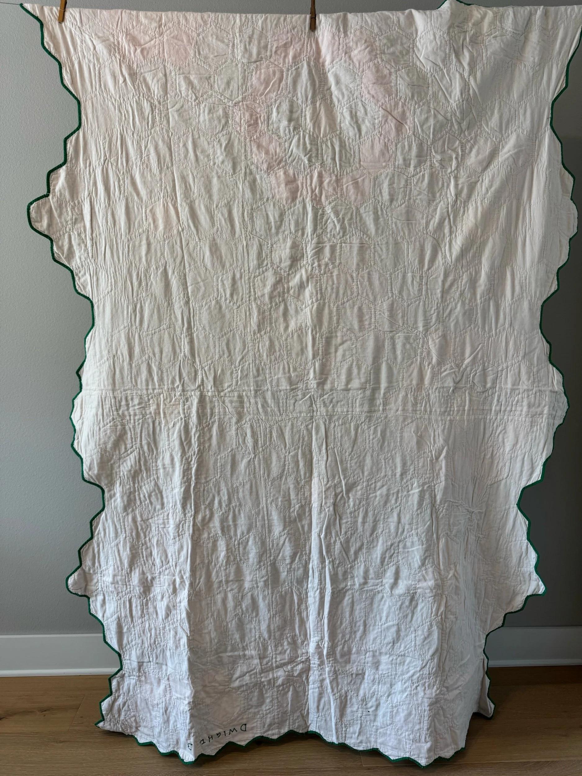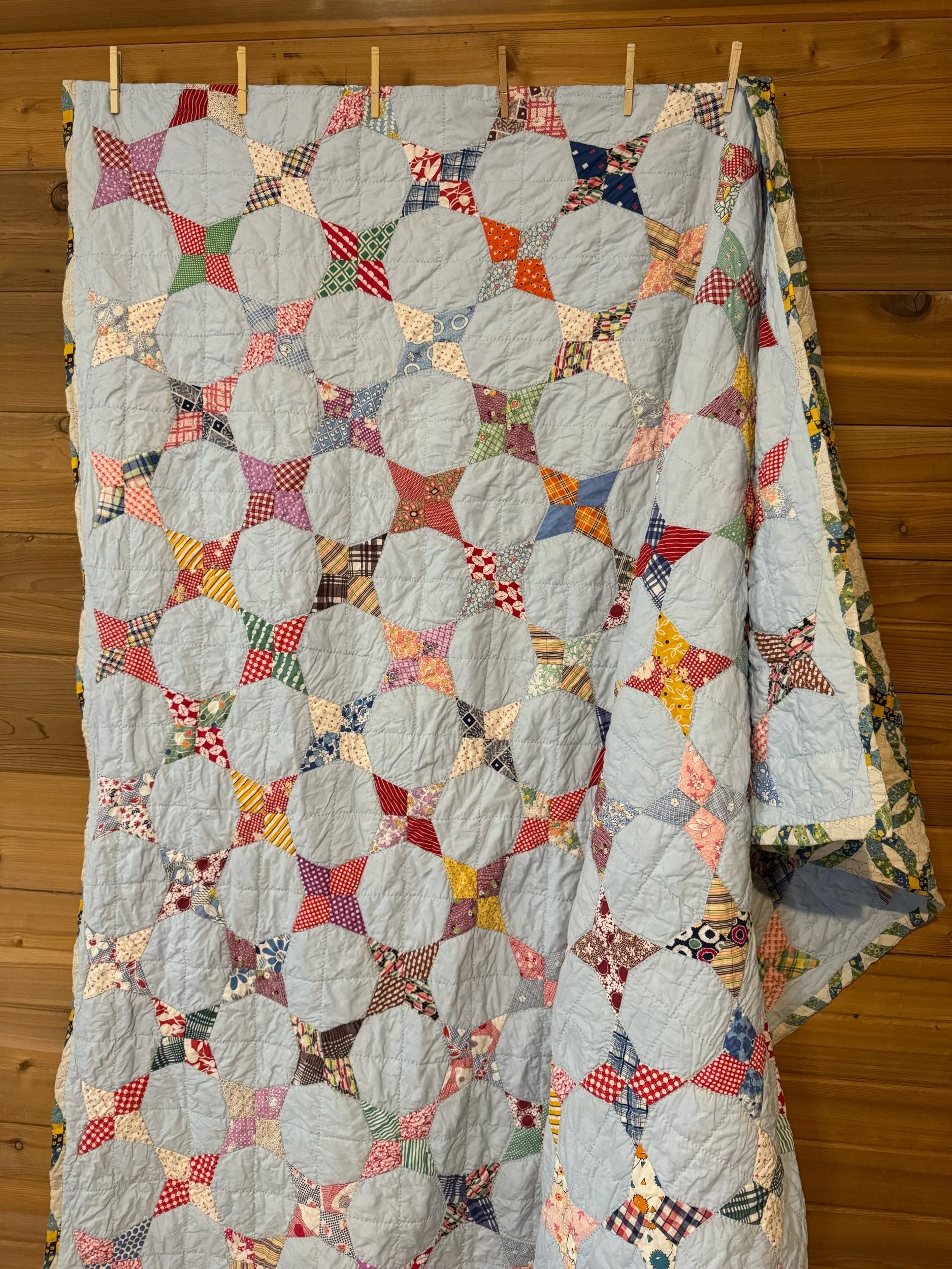 Details: Vintage Simple Diamonds Flour Sack Quilt — This quilt measures 62” X 86”. It is both hand pieced and hand quilted. The quilting stithces have been finished at 6-7 stitches per inch. This is a light weight quilt with no shift. The diamonds measure 8.5” across (point to point). There are several confirmed flour sack prints. We love the fruit prints! This quilt is super soft!!!! The backing is off white Off white — with back to front binding that has been hand applied. We found no through holes or stains. There are 2 patches with shattering, and 1 seam pop to note. Please see pictures for reference. This quilt has been carefully washed and air dried. Please view all pictures before buying.