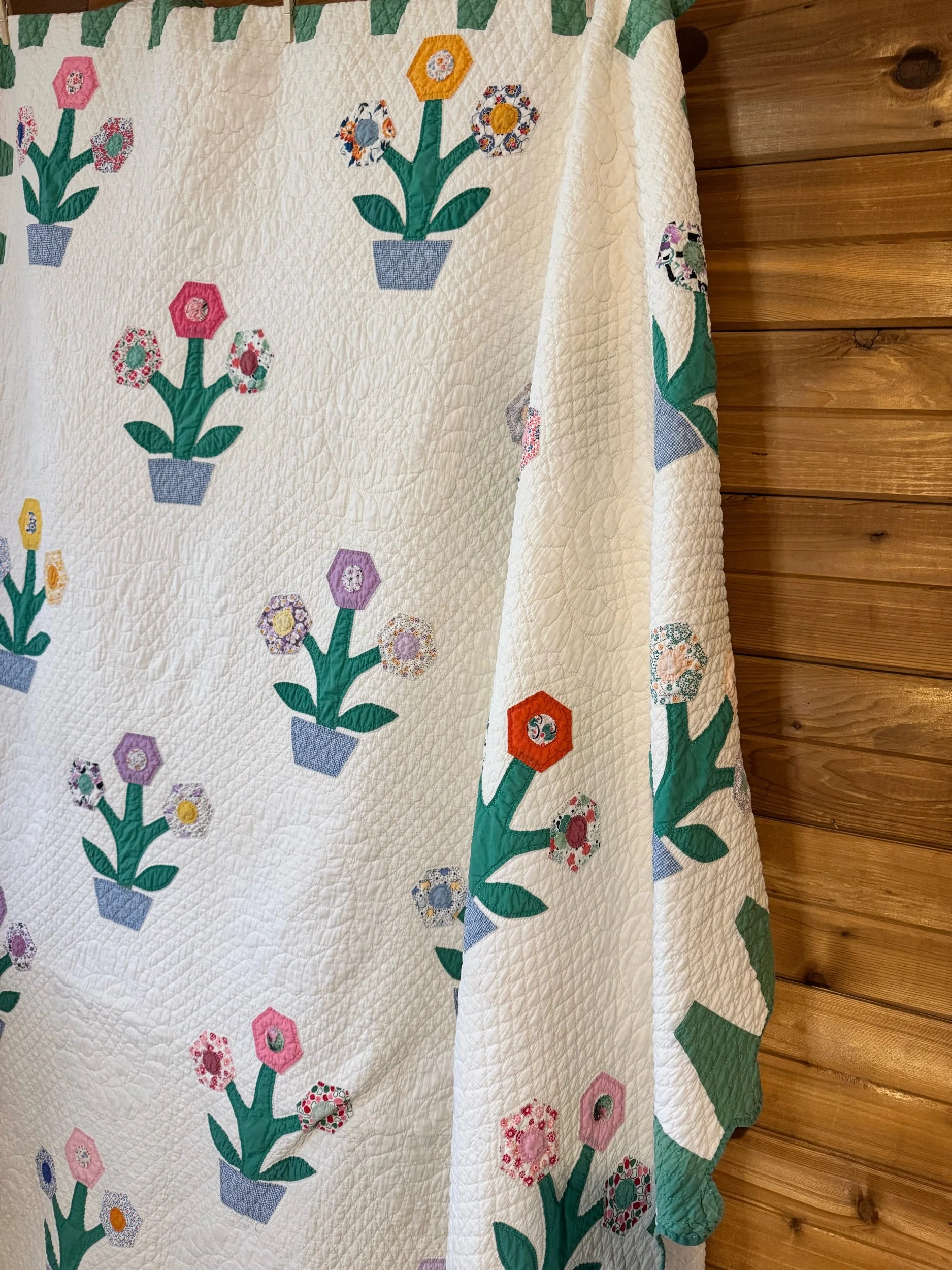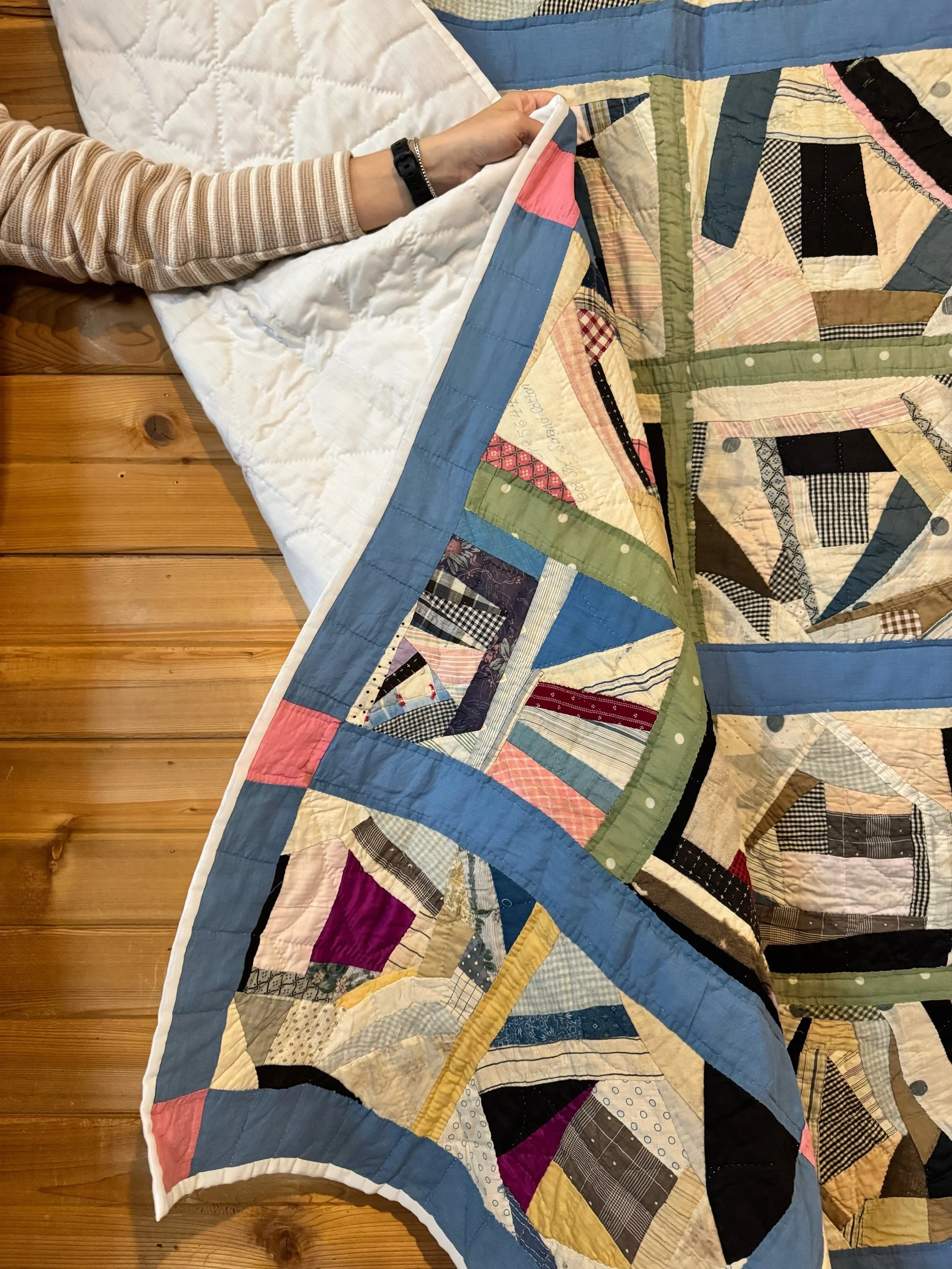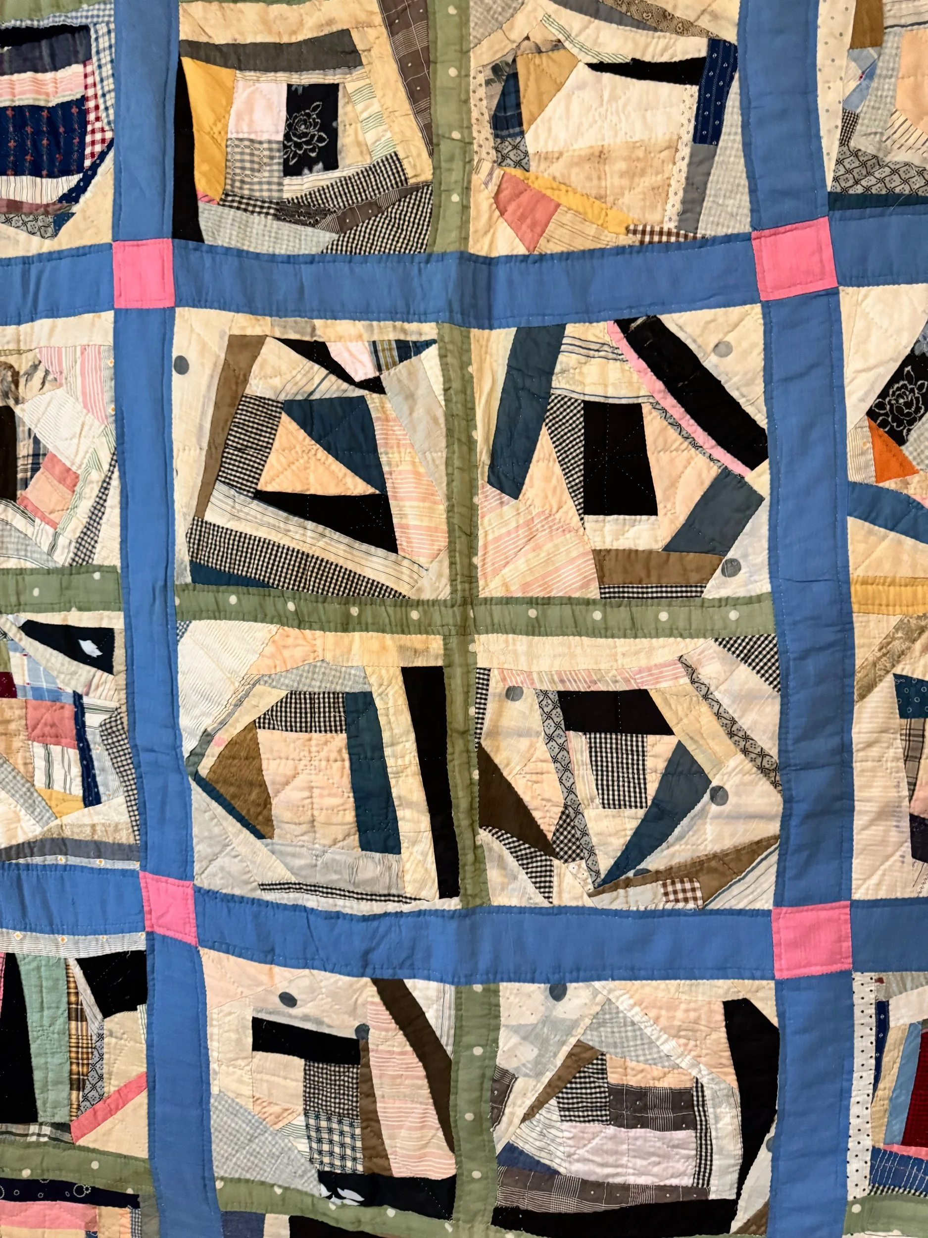 Details: It appears to us that this quilt was made over generations. The blocks and set of 4’s are very old fabrics, definitely antique. The sashing and back fabric are vintage and completed the blocks after their original time. This is what we would call a lightweight quilt. There is no batting shift or lumps in the quilt. The string blocks are made of awesome green, blue and black fabrics — with a few other colors scattered throughout. The sashing is blue cotton, and sashing squares are pink cotton. The back fabric is white cotton blend. It is taken around to the front to create the binding, hand applied. There are no holes or seam pops. Within the string blocks there are several shatters — not falling apart but need to be mentioned. This quilt has been carefully washed and air dried. Please view all pictures before buying.