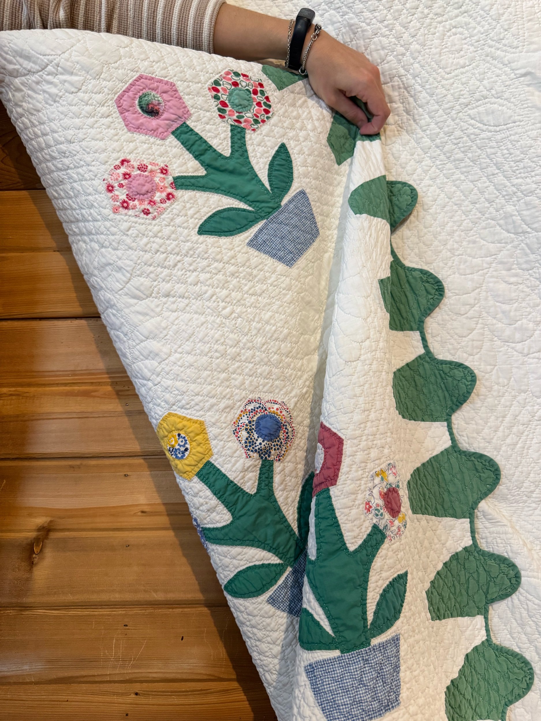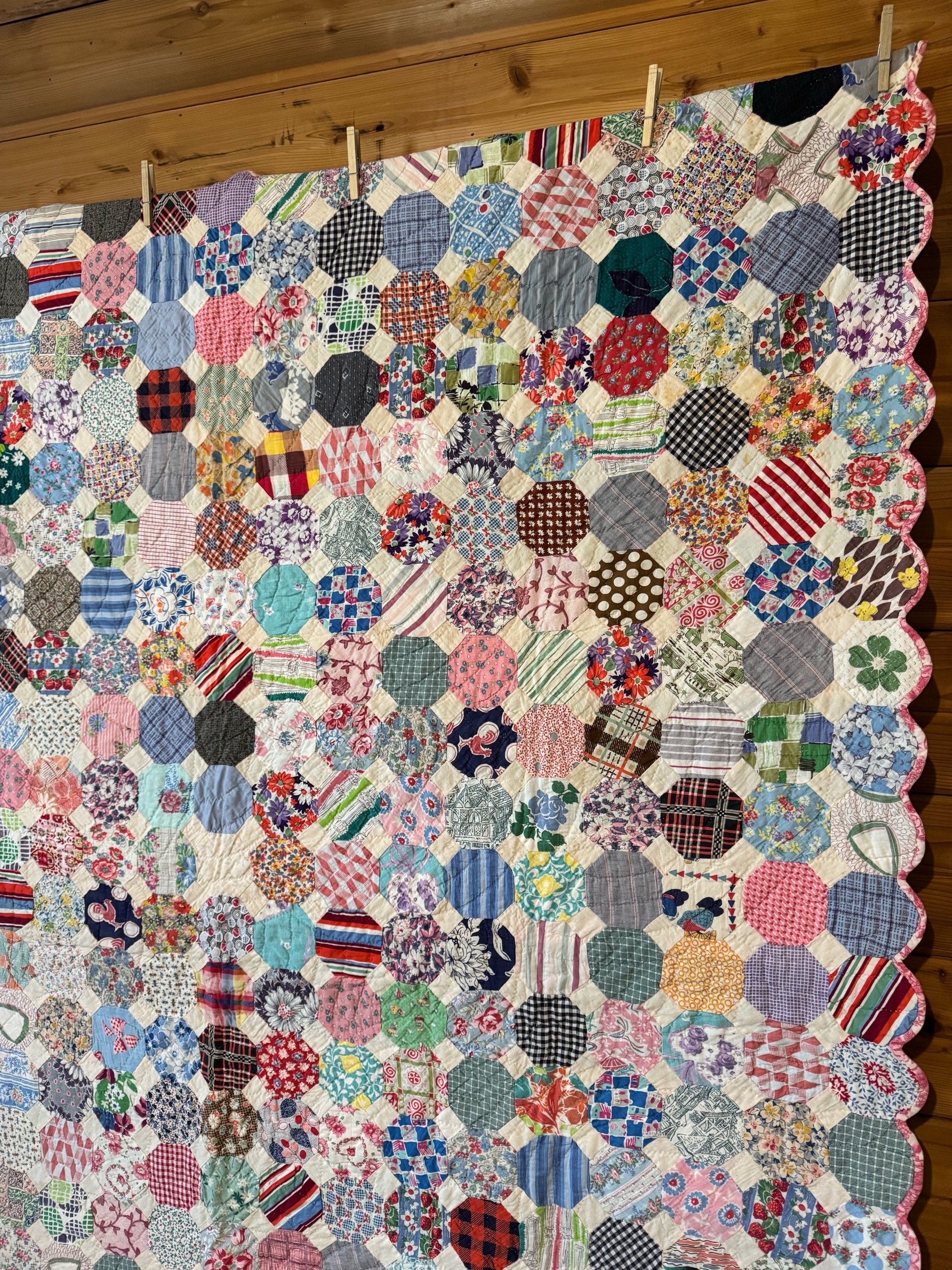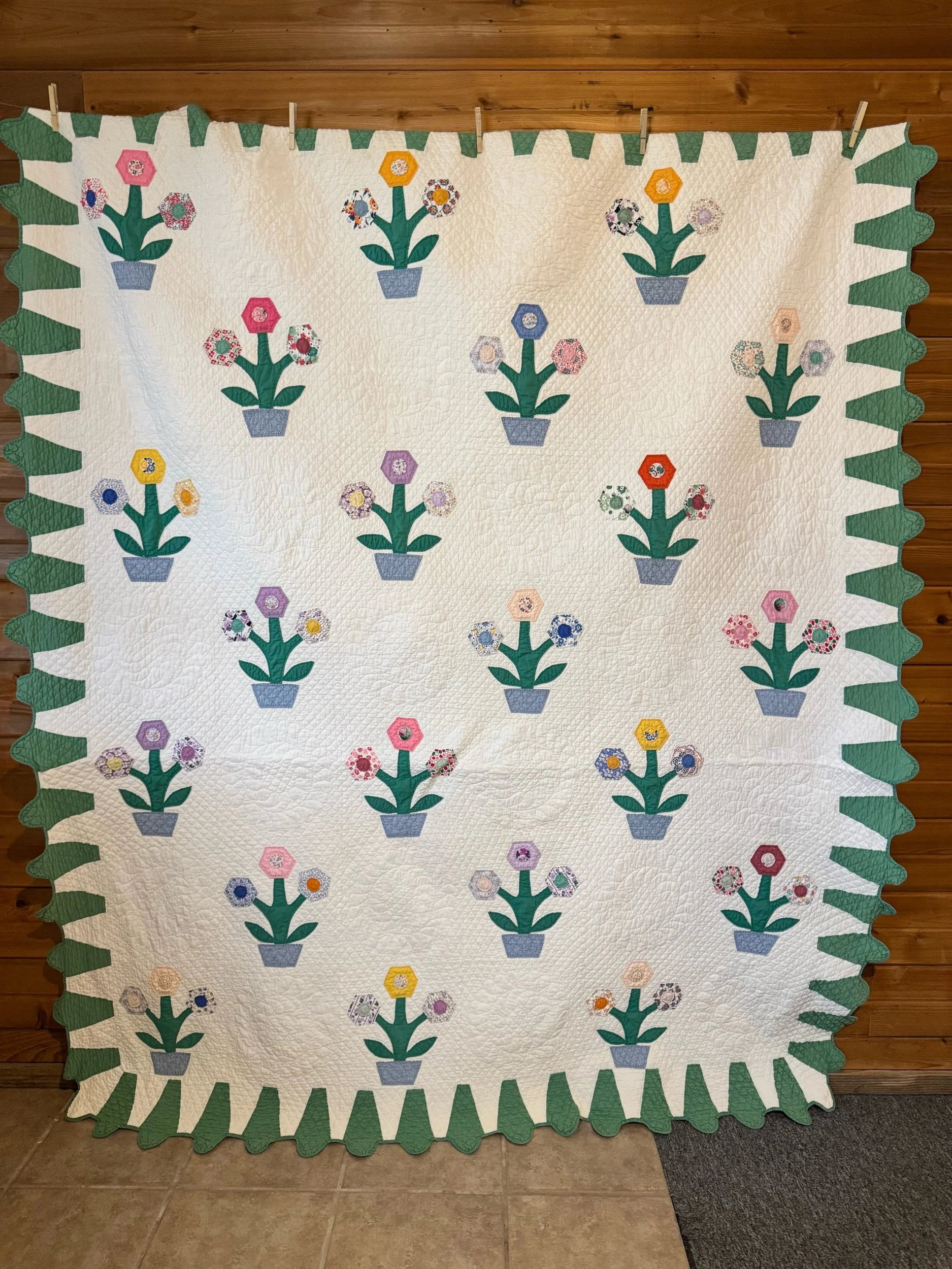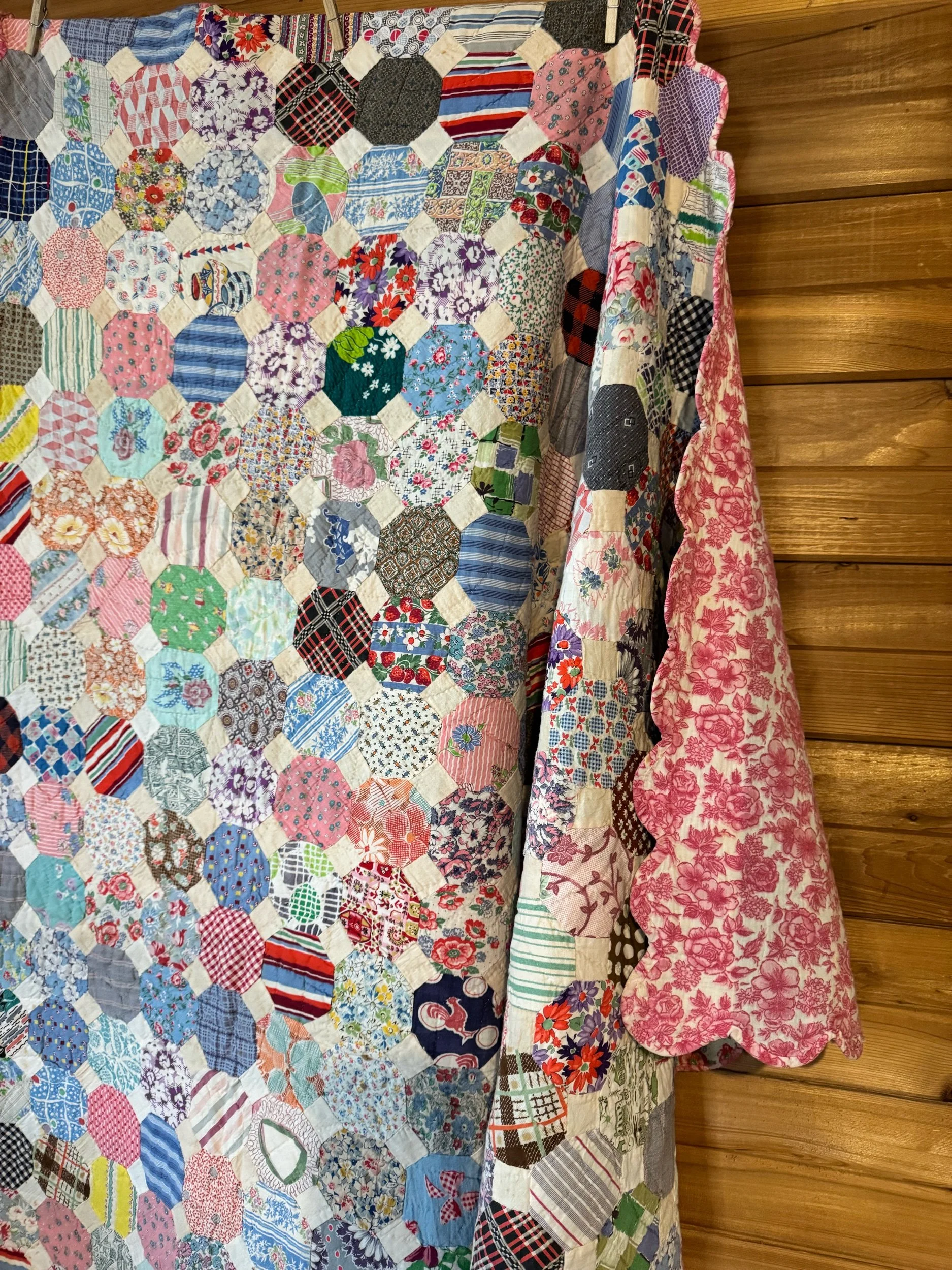 Details: It appears to us that this quilt was made over generations. The blocks and set of 4’s are very old fabrics, definitely antique. The sashing and back fabric are vintage and completed the blocks after their original time. This is what we would call a lightweight quilt. There is no batting shift or lumps in the quilt. The string blocks are made of awesome green, blue and black fabrics — with a few other colors scattered throughout. The sashing is blue cotton, and sashing squares are pink cotton. The back fabric is white cotton blend. It is taken around to the front to create the binding, hand applied. There are no holes or seam pops. Within the string blocks there are several shatters — not falling apart but need to be mentioned. This quilt has been carefully washed and air dried. Please view all pictures before buying.